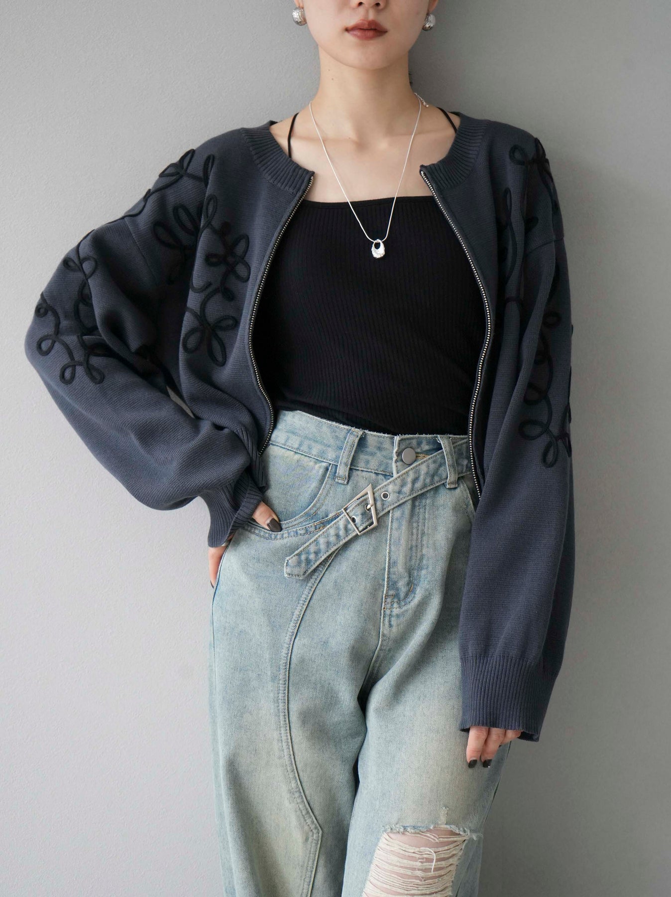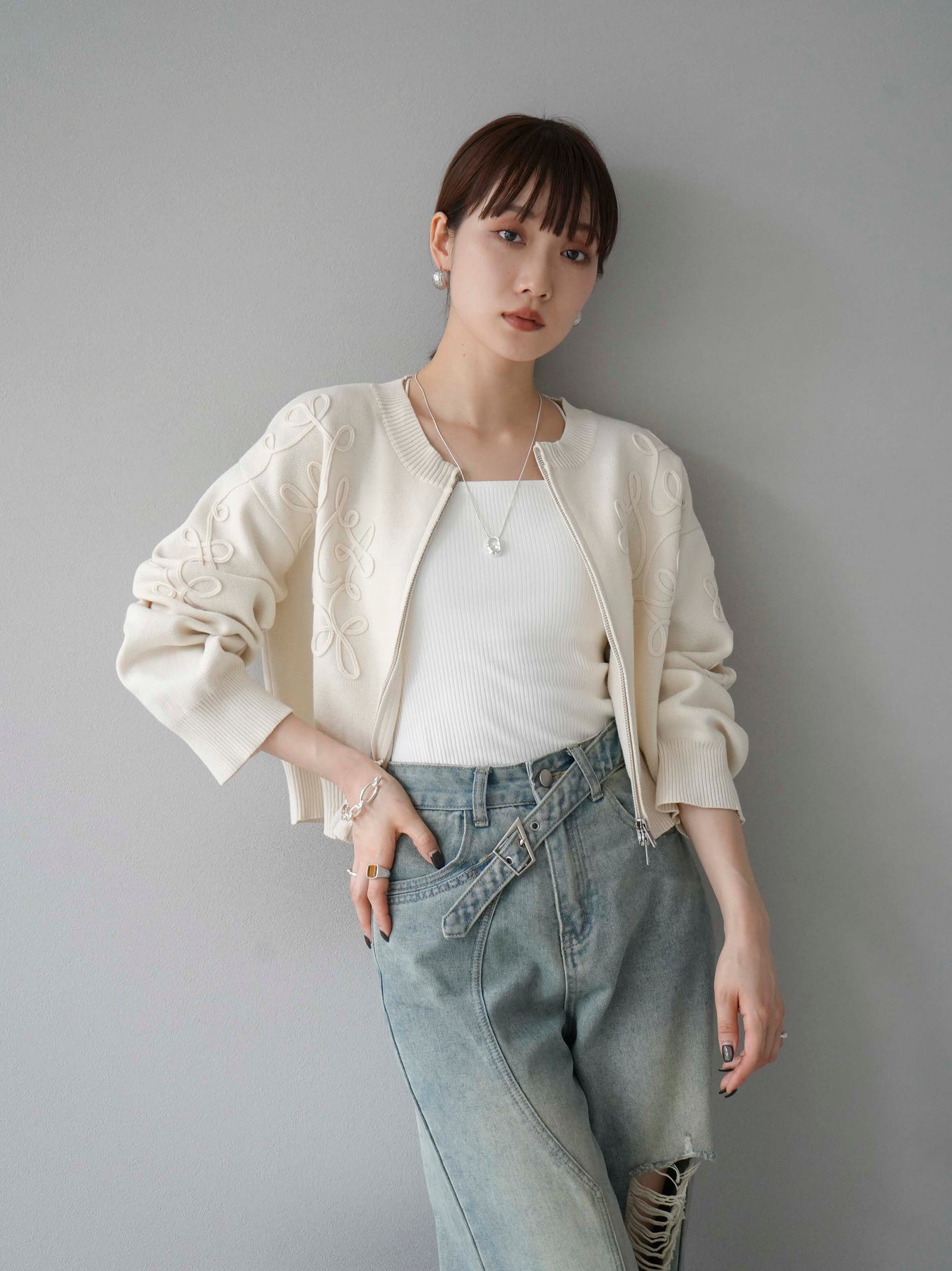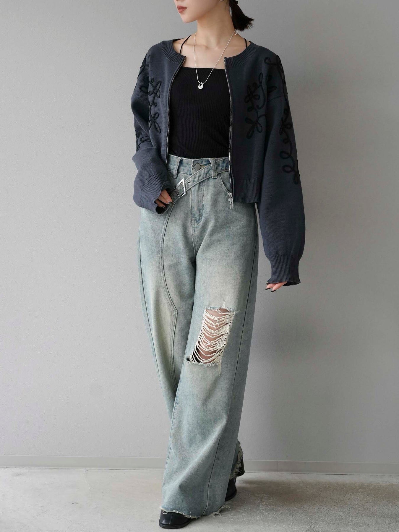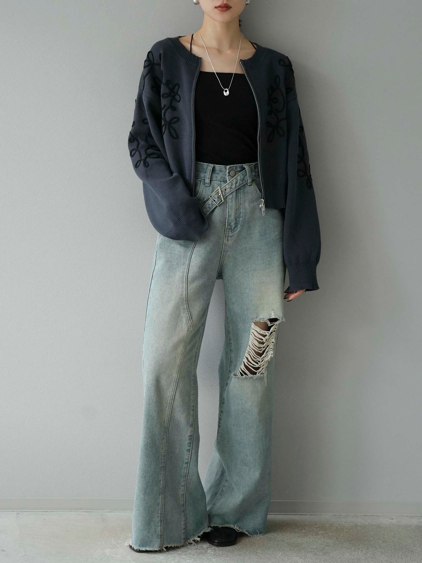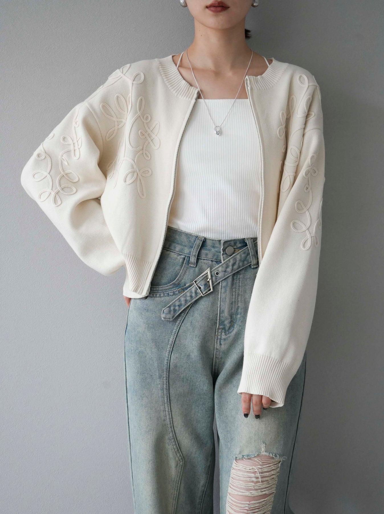 [SET]コード刺繍コットンニットジップカーディガン+ダブルストラップカットリブブラキャミソール+ベルトアシンメトリーダメージデニム(3set)