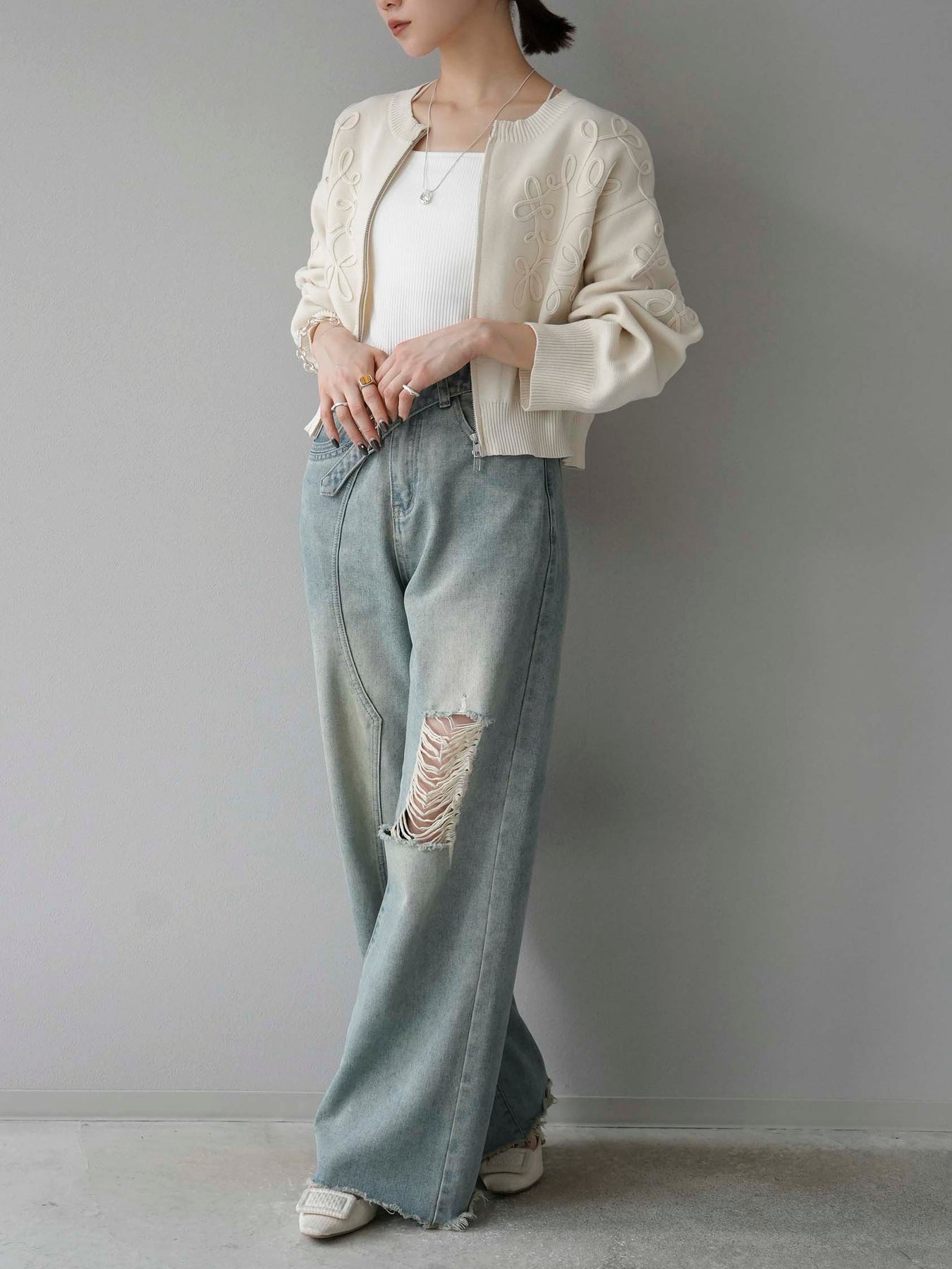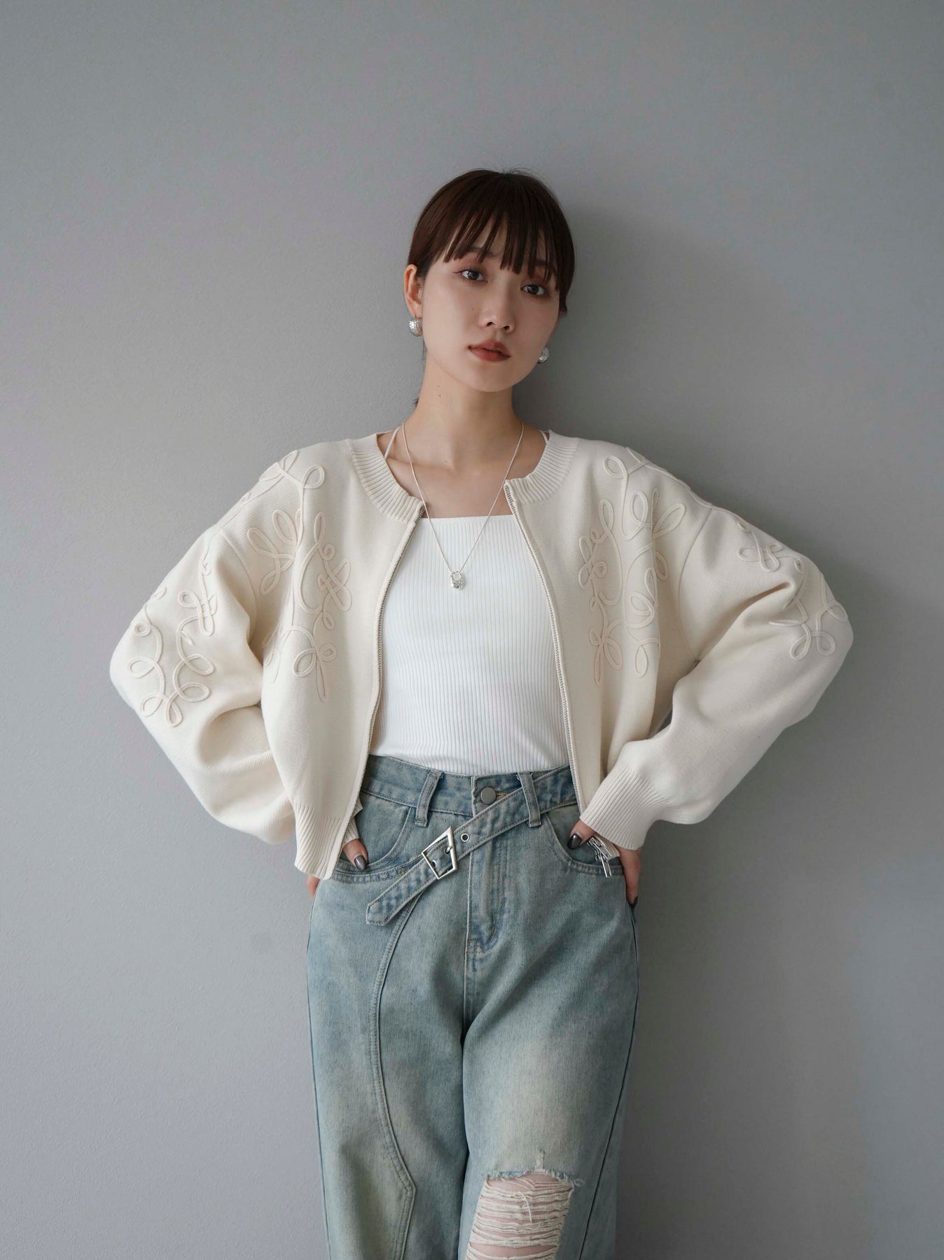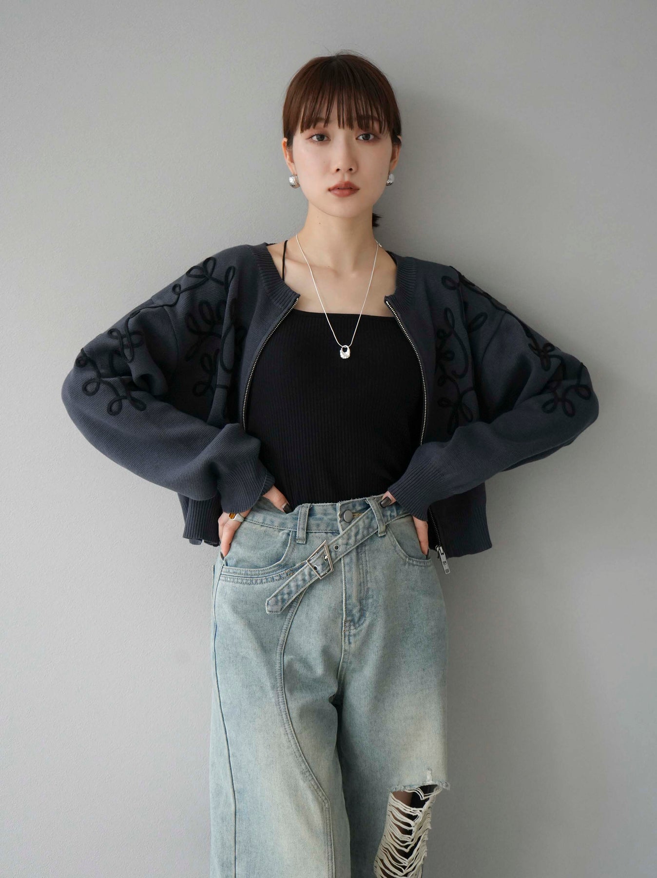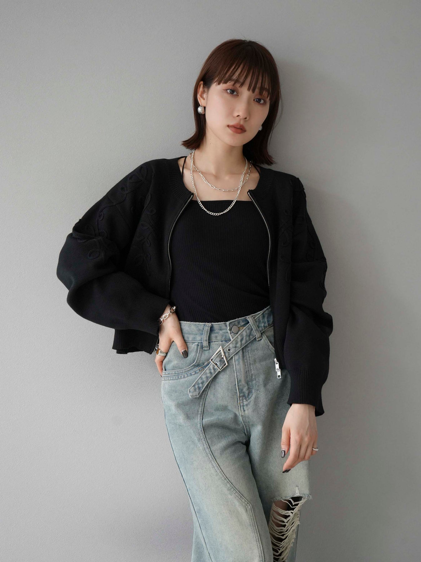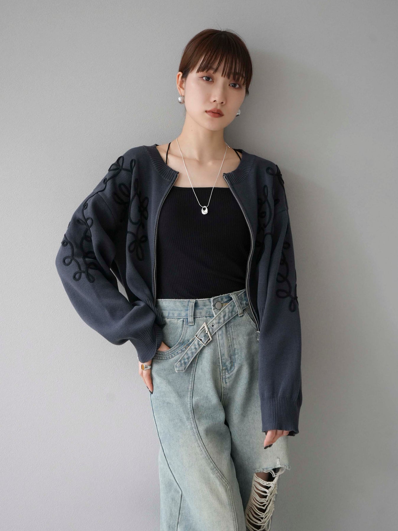 [SET]コード刺繍コットンニットジップカーディガン+ダブルストラップカットリブブラキャミソール+ベルトアシンメトリーダメージデニム(3set)