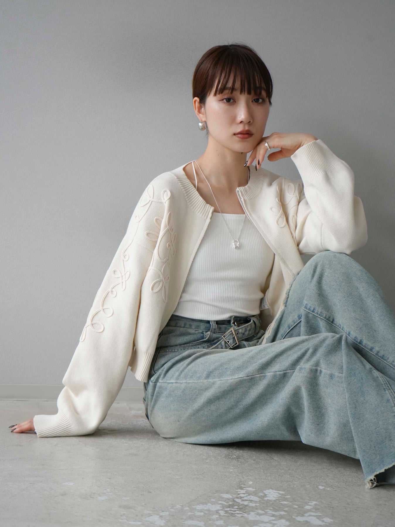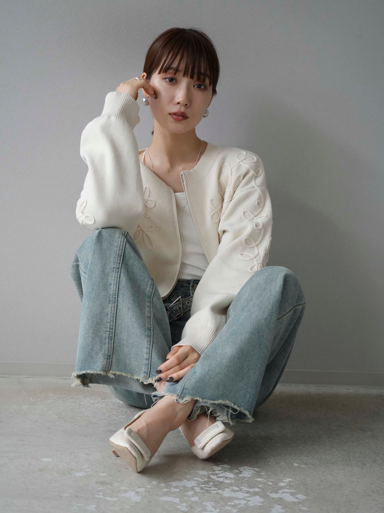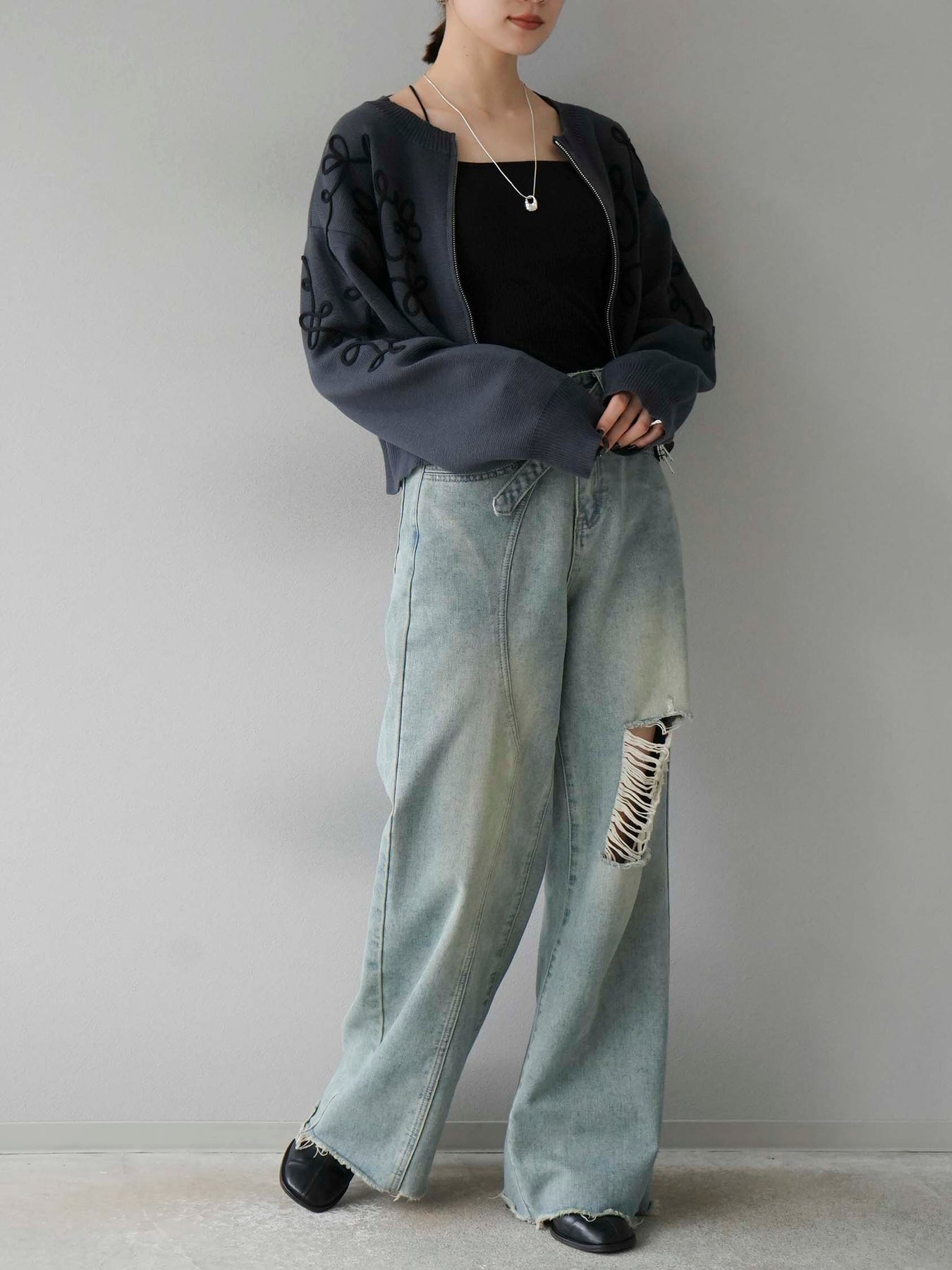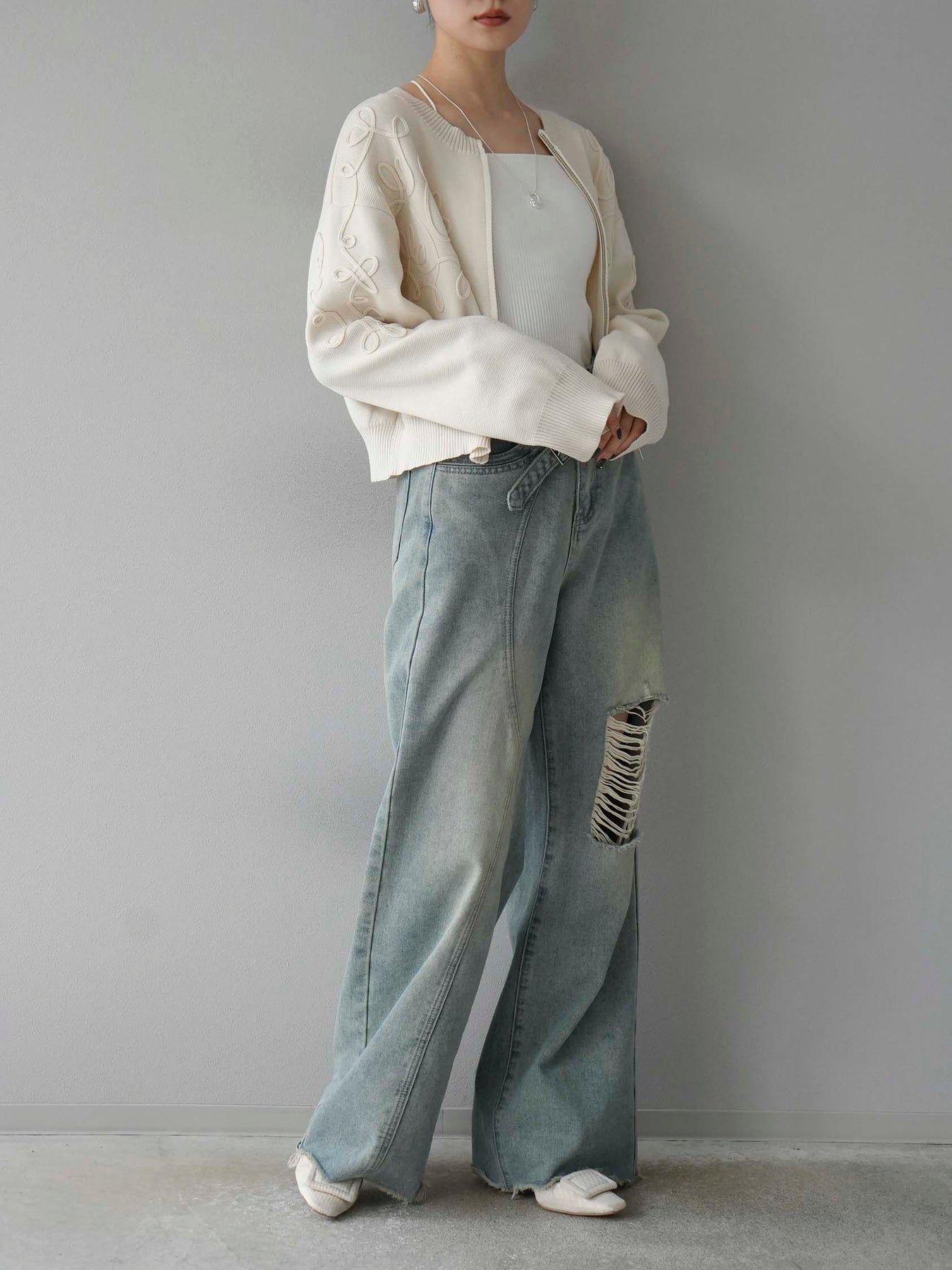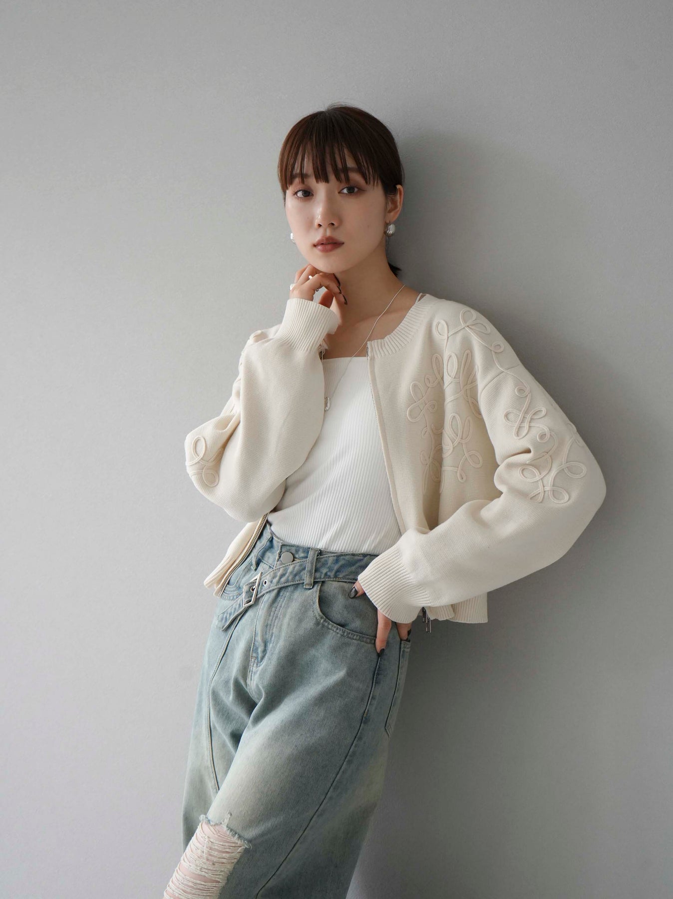 [SET]コード刺繍コットンニットジップカーディガン+ダブルストラップカットリブブラキャミソール+ベルトアシンメトリーダメージデニム(3set)