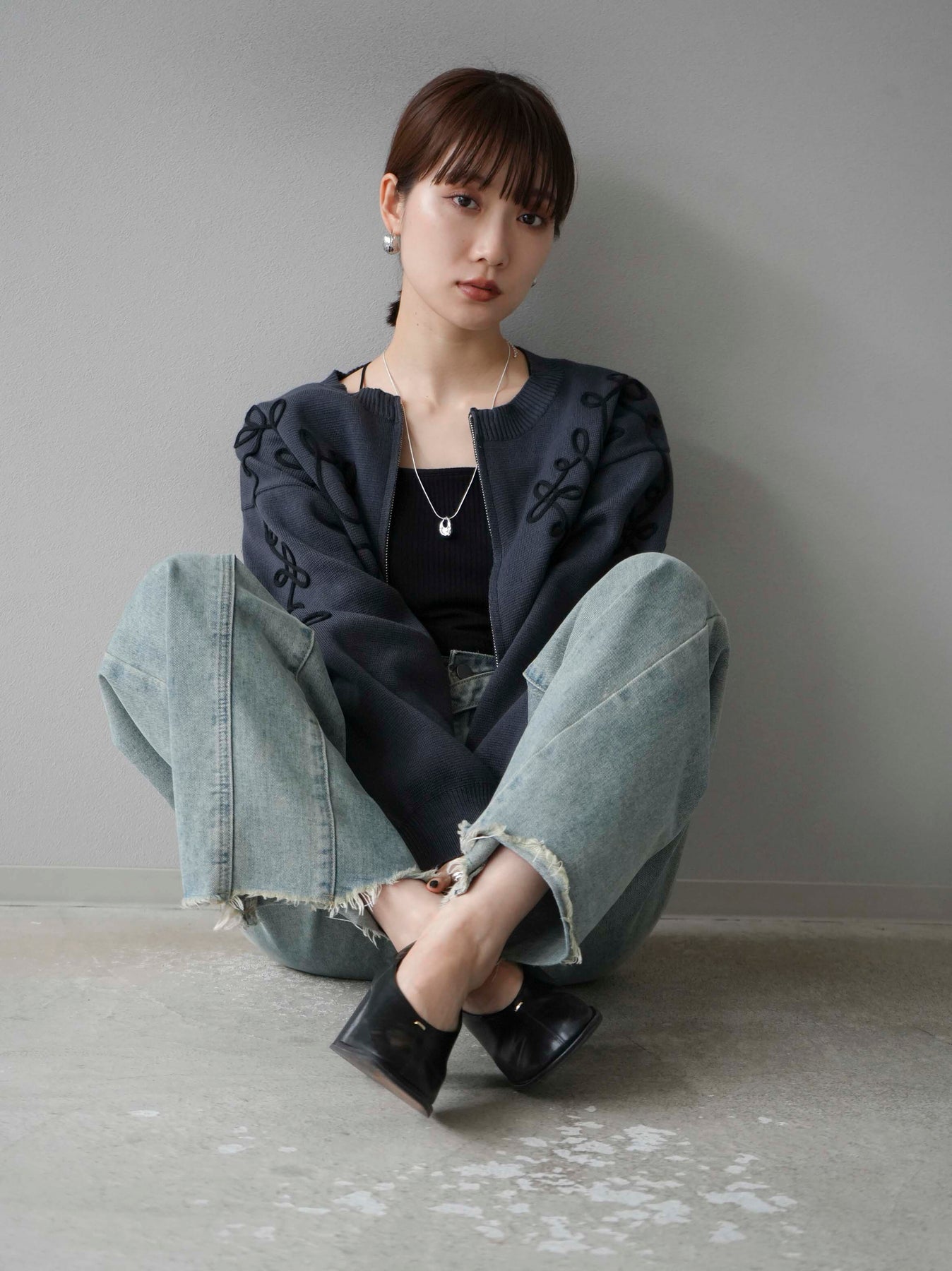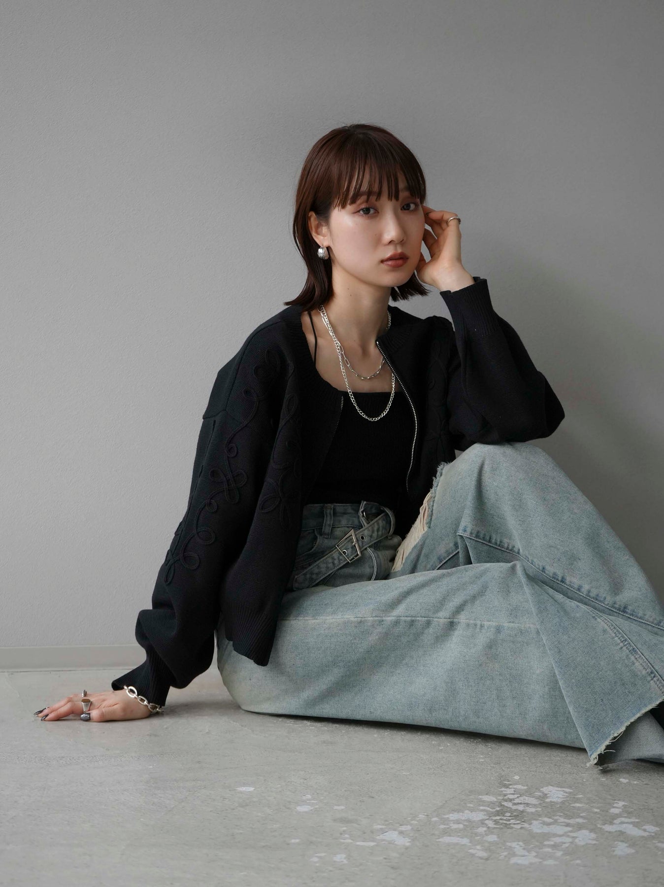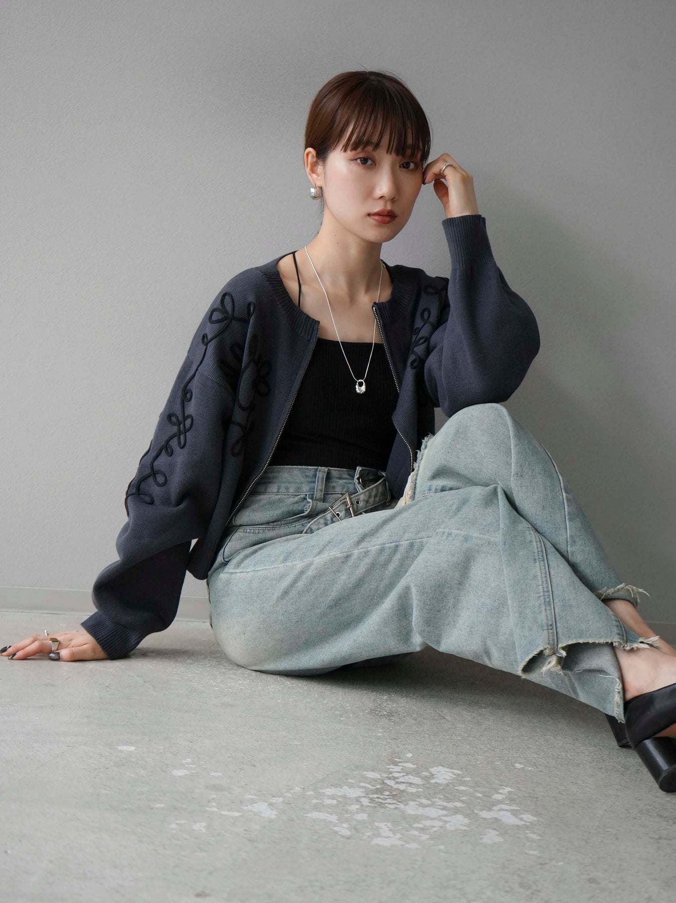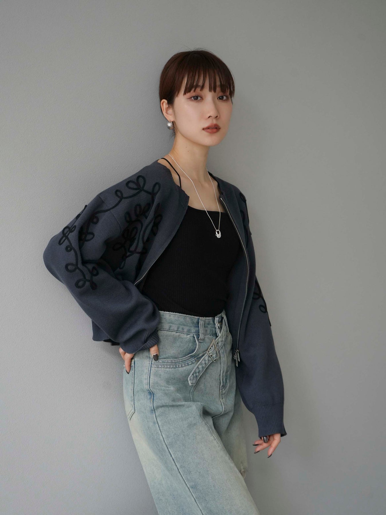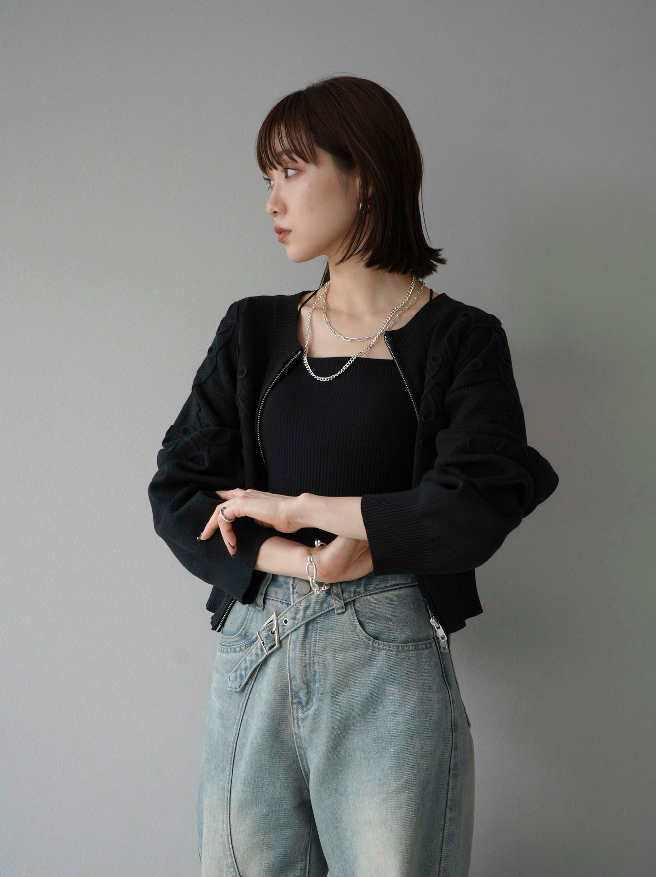 [SET]コード刺繍コットンニットジップカーディガン+ダブルストラップカットリブブラキャミソール+ベルトアシンメトリーダメージデニム(3set)
