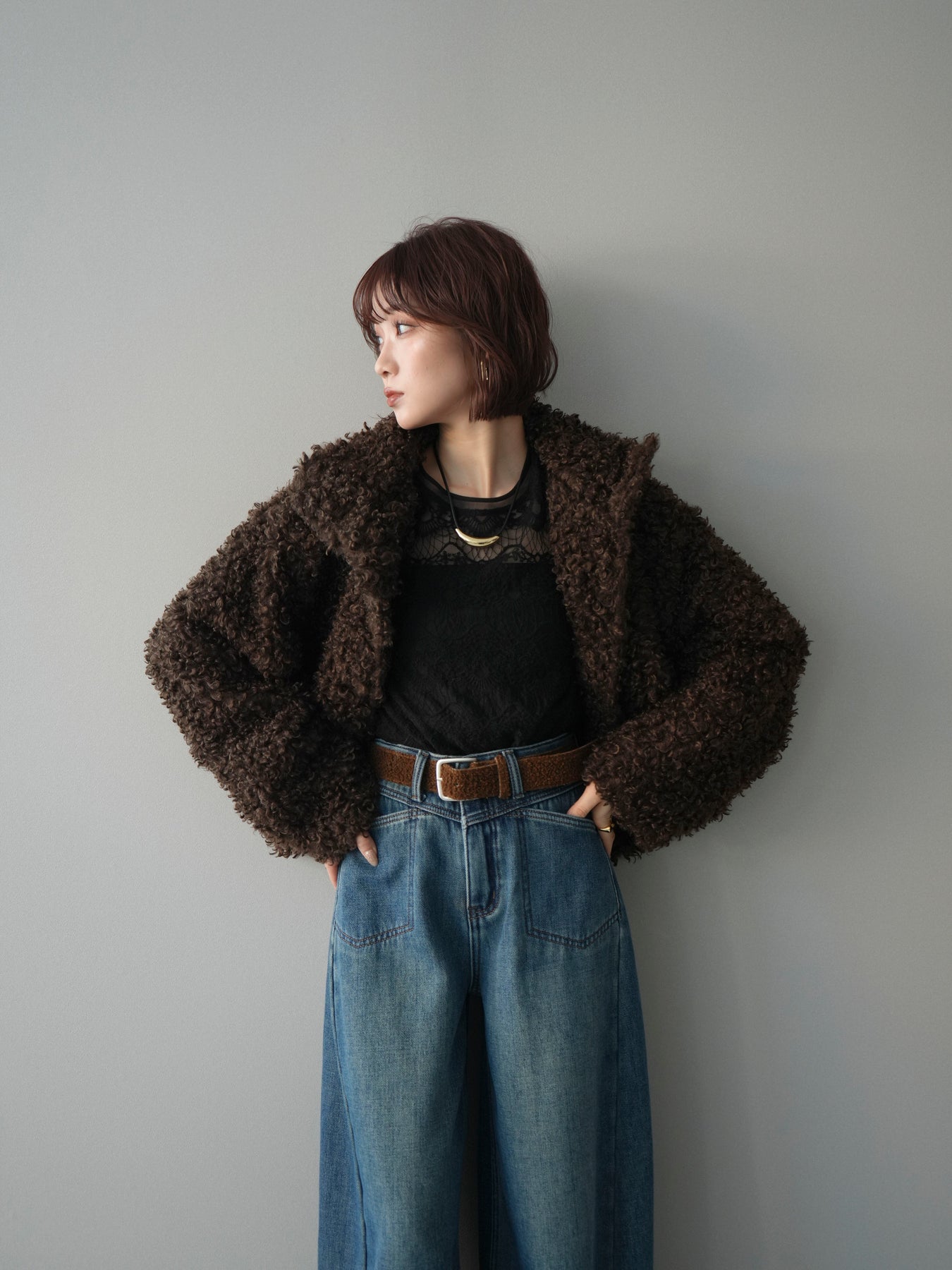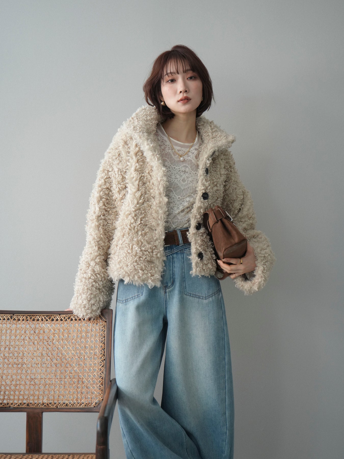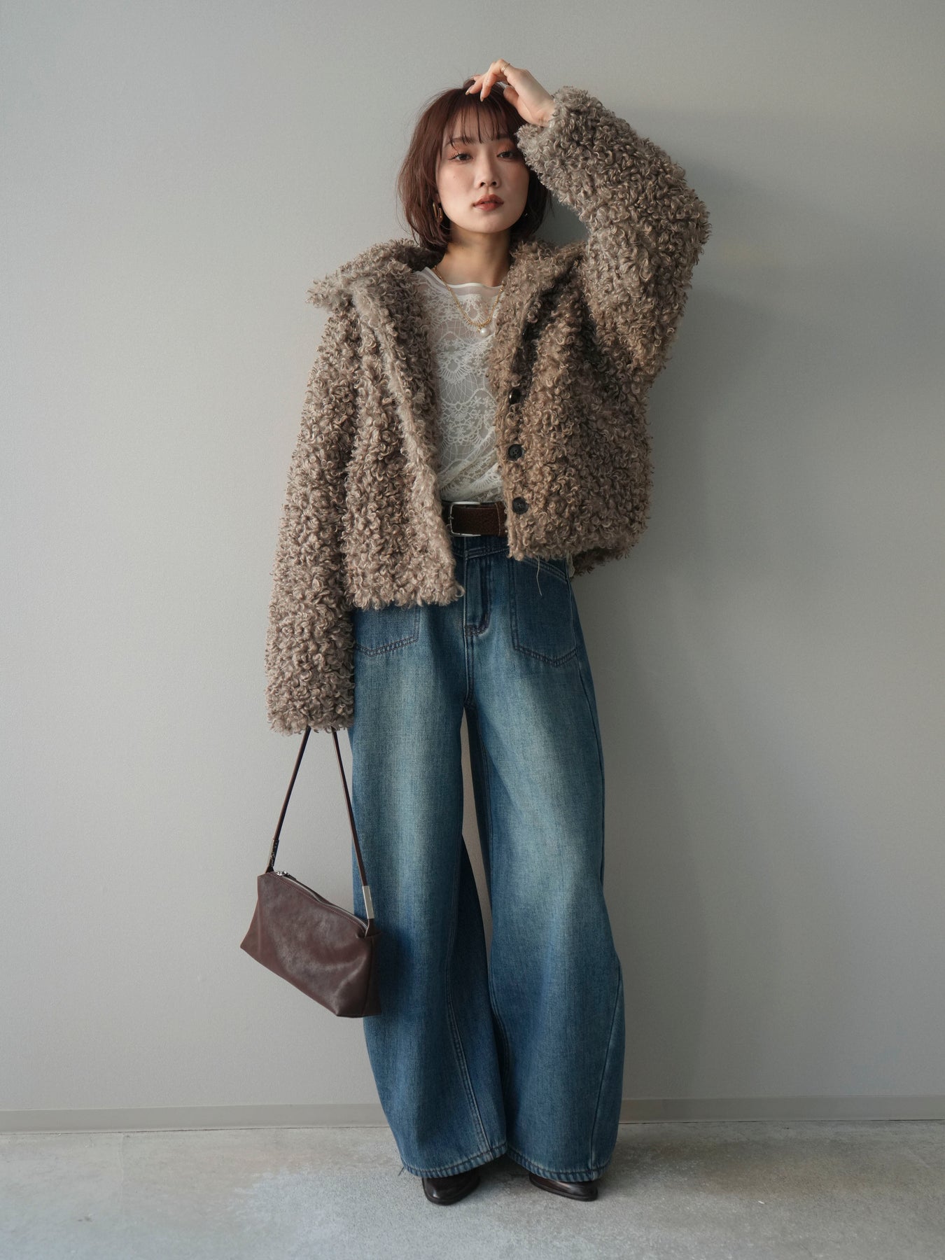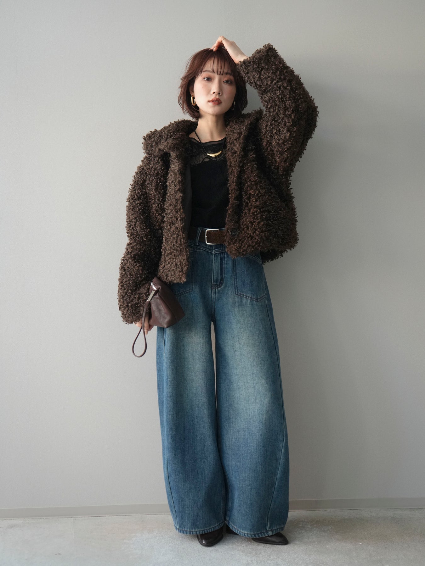 [SET]プードルファーミドルスタンドブルゾン+ベルト付裏起毛カーブデニムパンツ(2set)