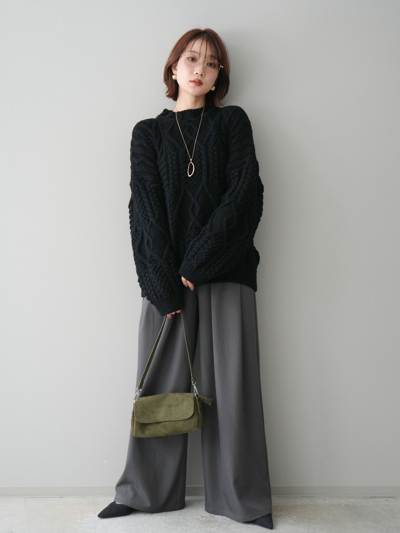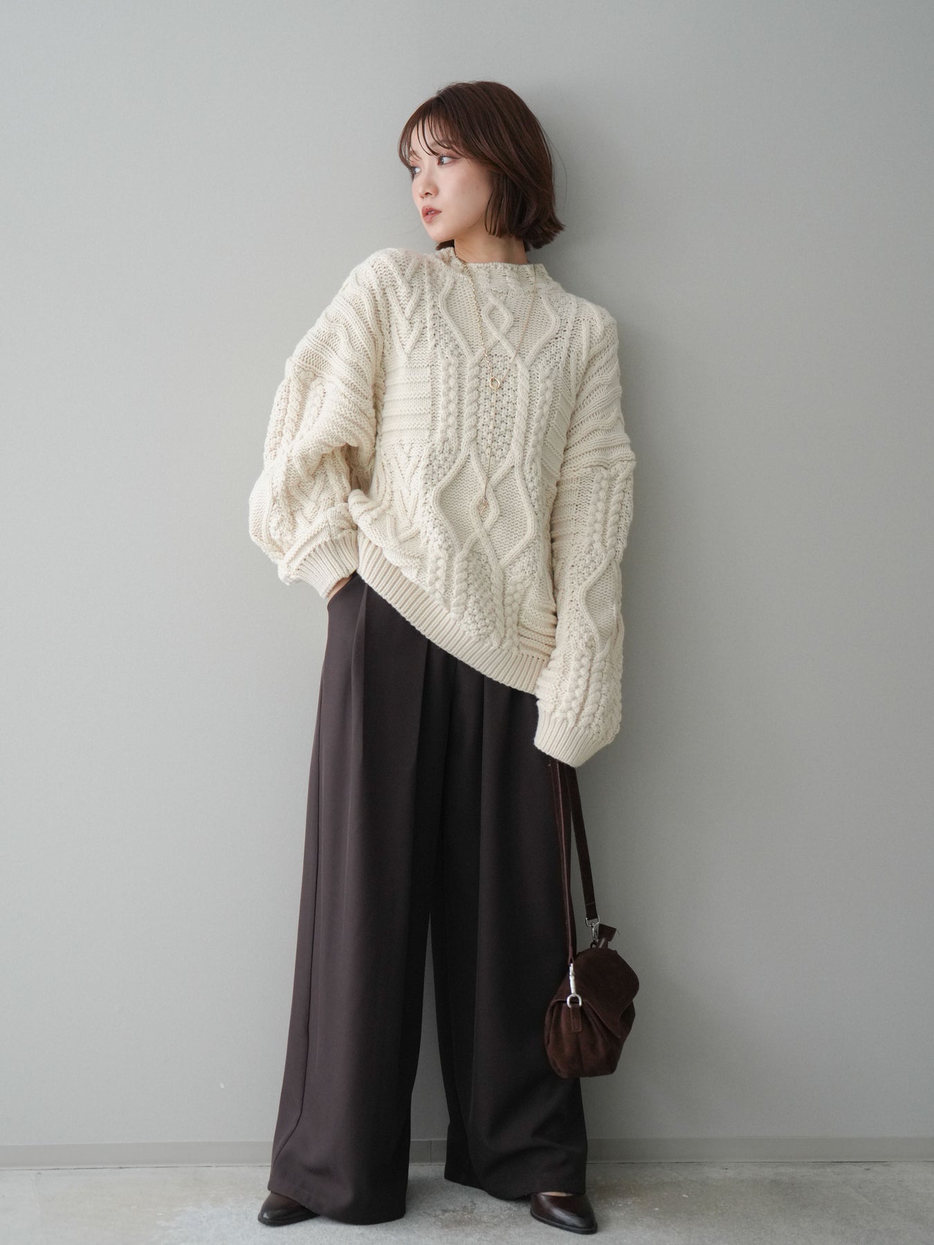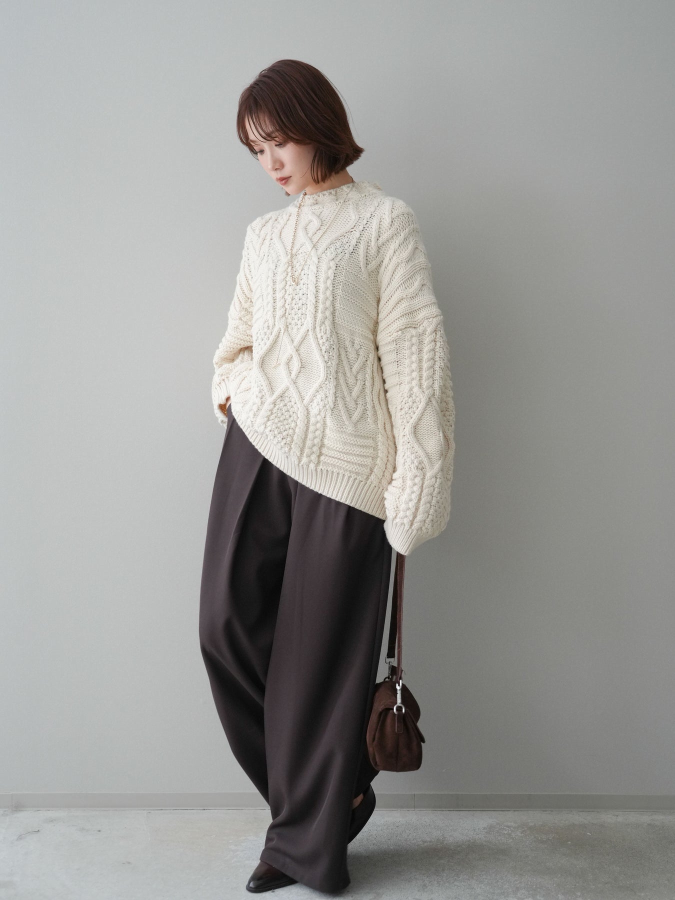 [SET]ケーブル編みモックネックニットプルオーバー+ベルトループデザインワイドパンツ(2set)
