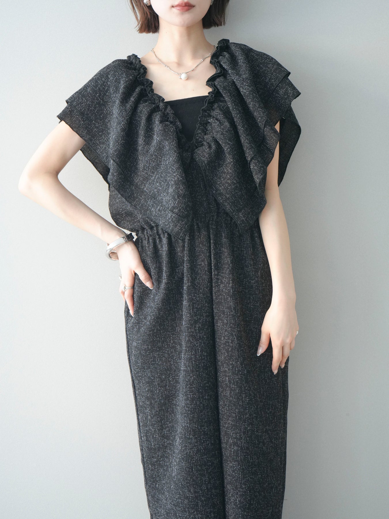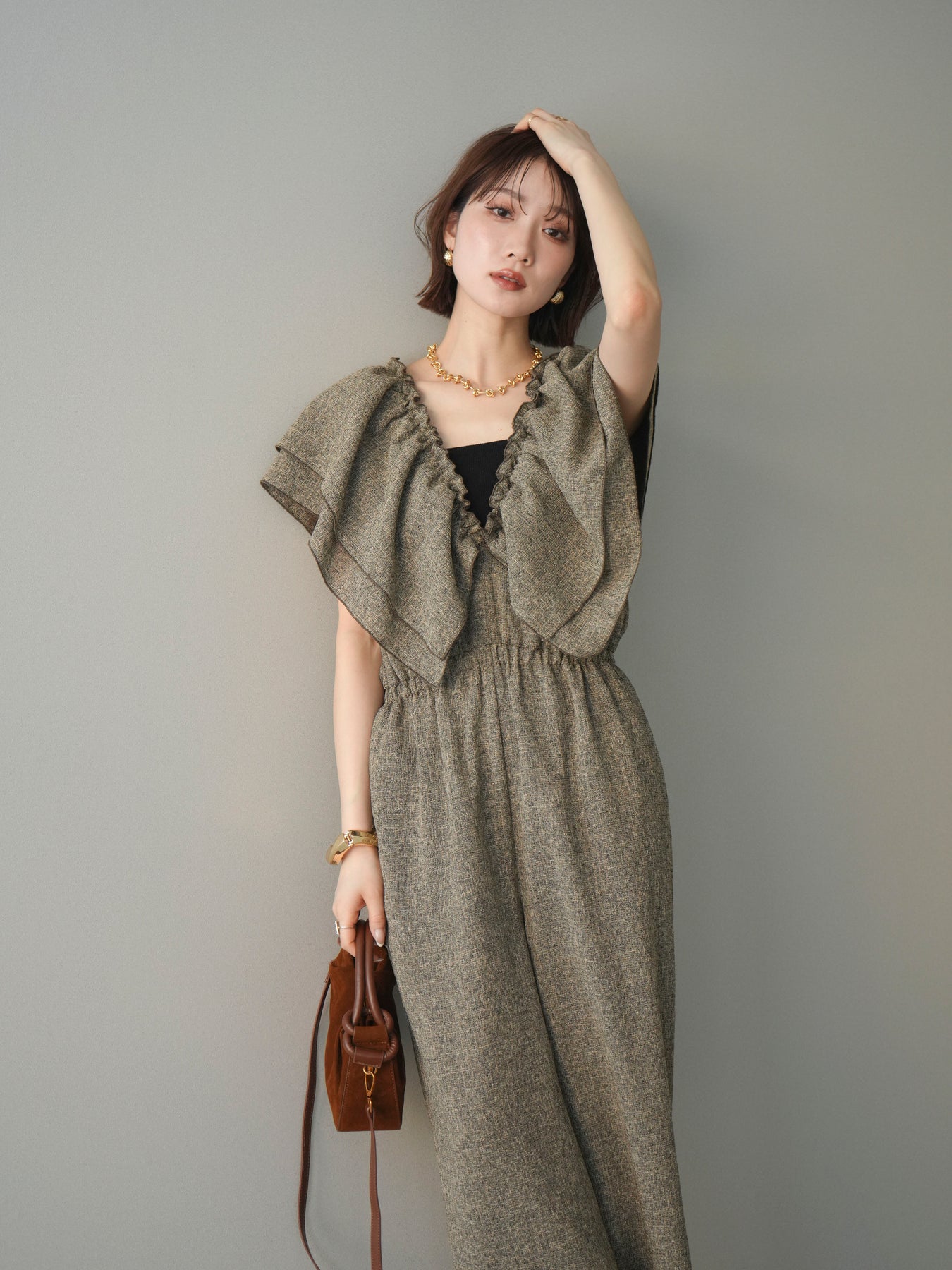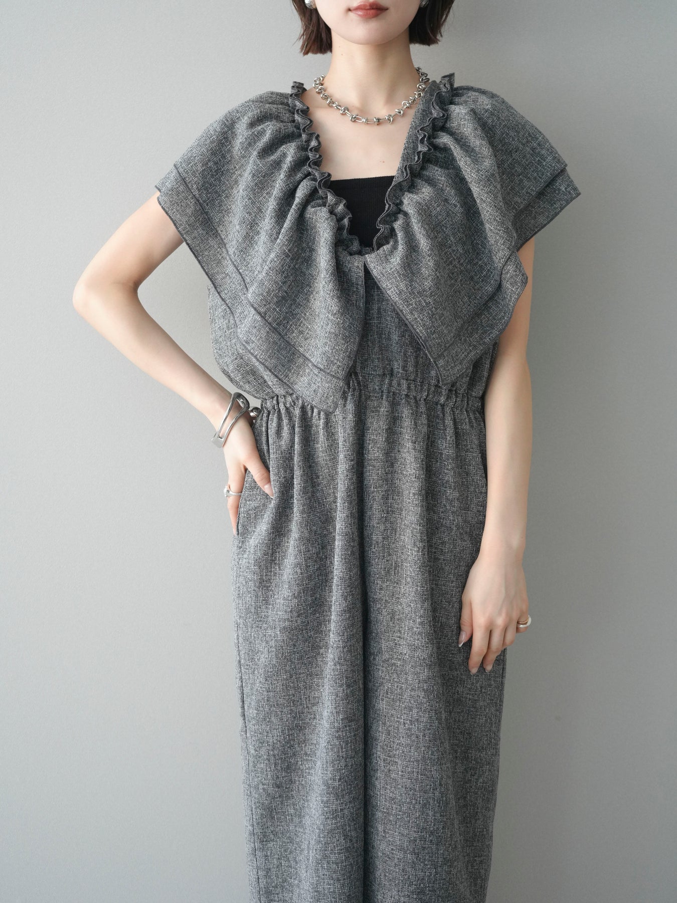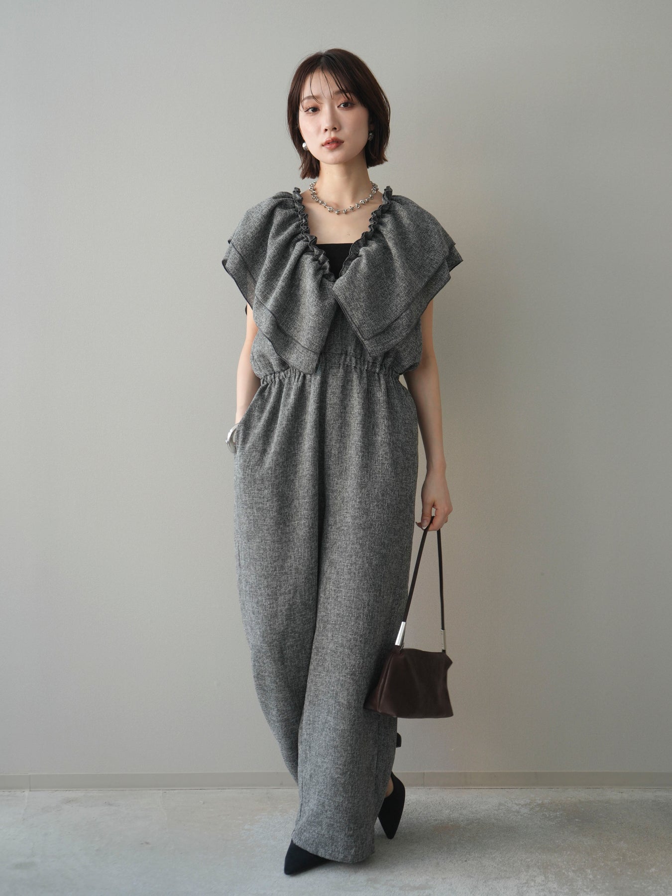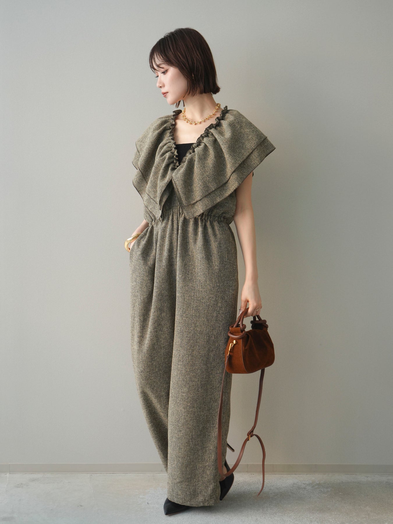 [SET]3WAYミックスツイードギャザーオールインワン+選べるアクセセット(2set)