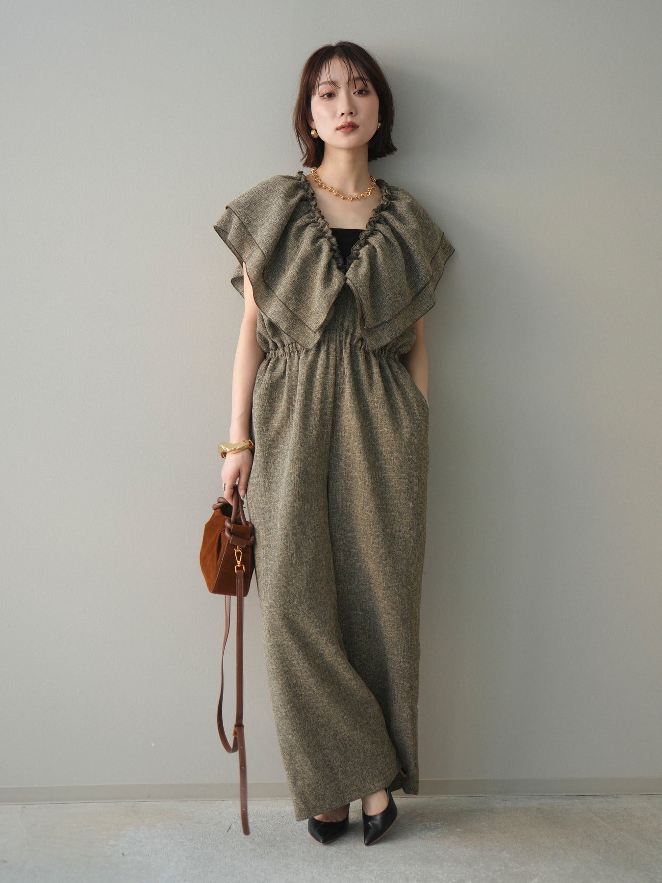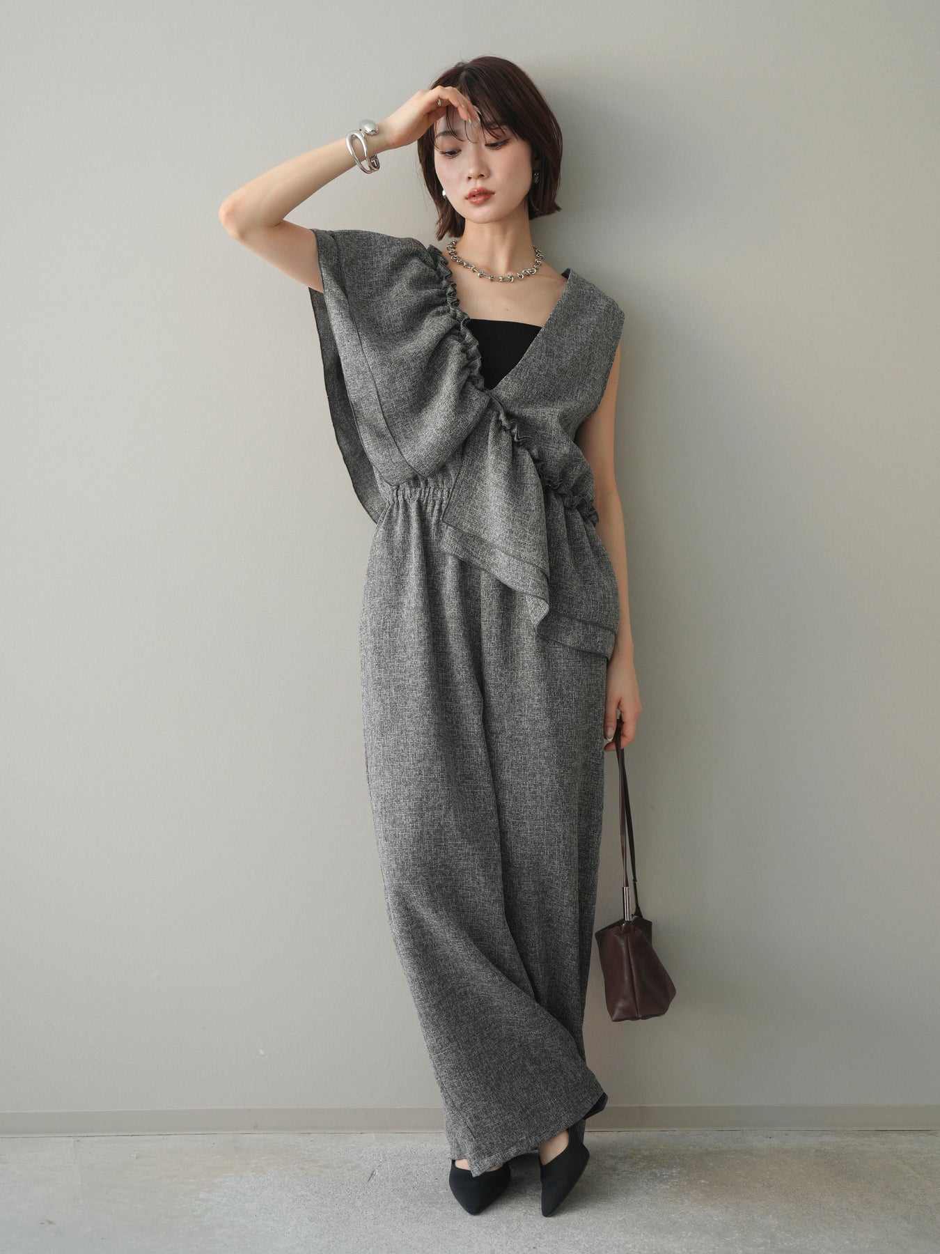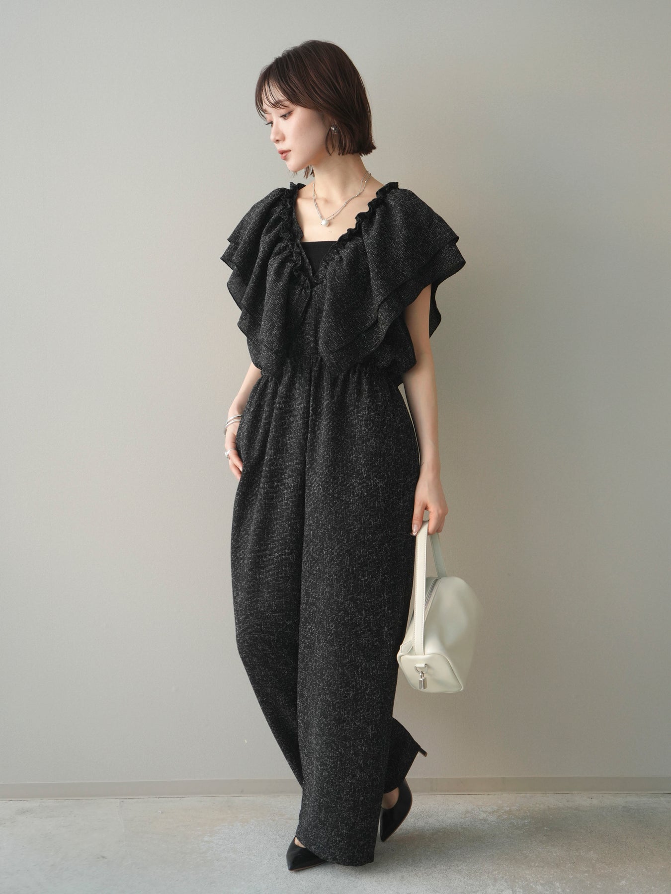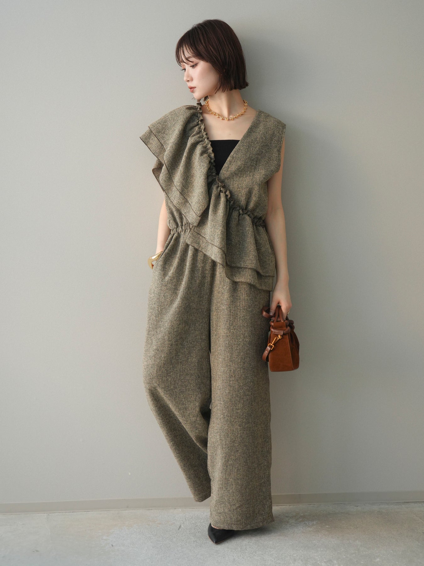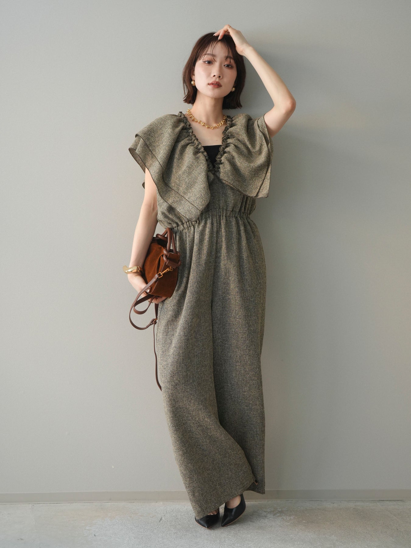 [SET]3WAYミックスツイードギャザーオールインワン+選べるアクセセット(2set)