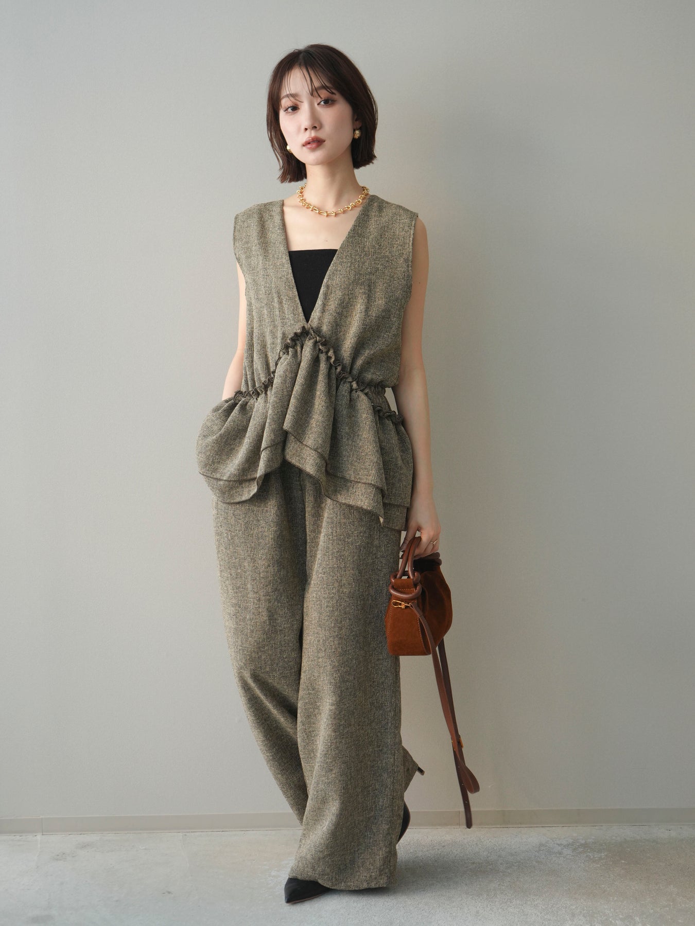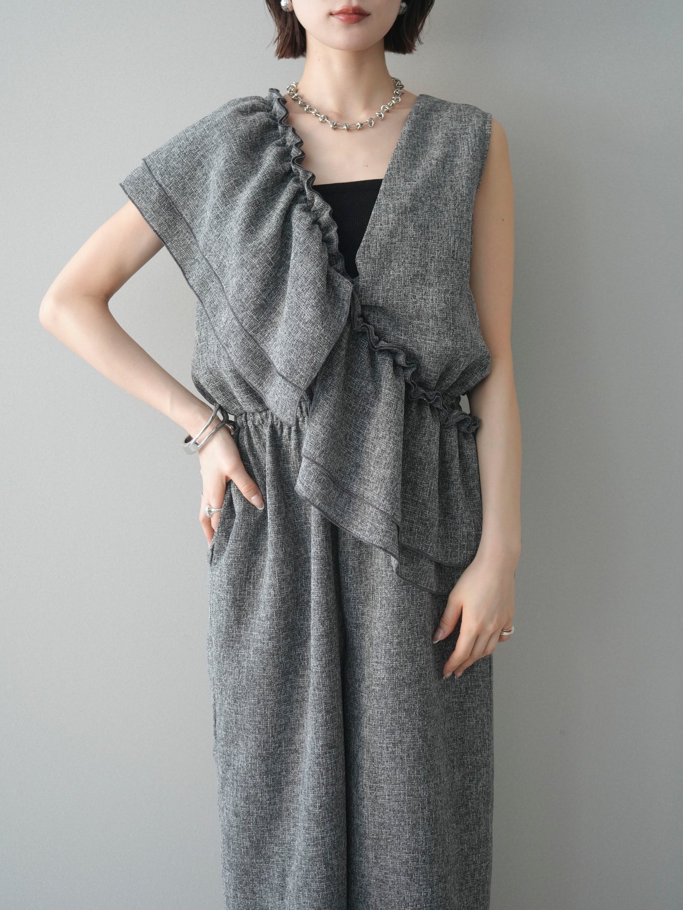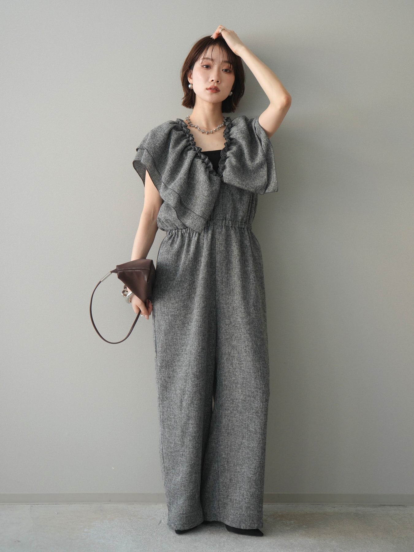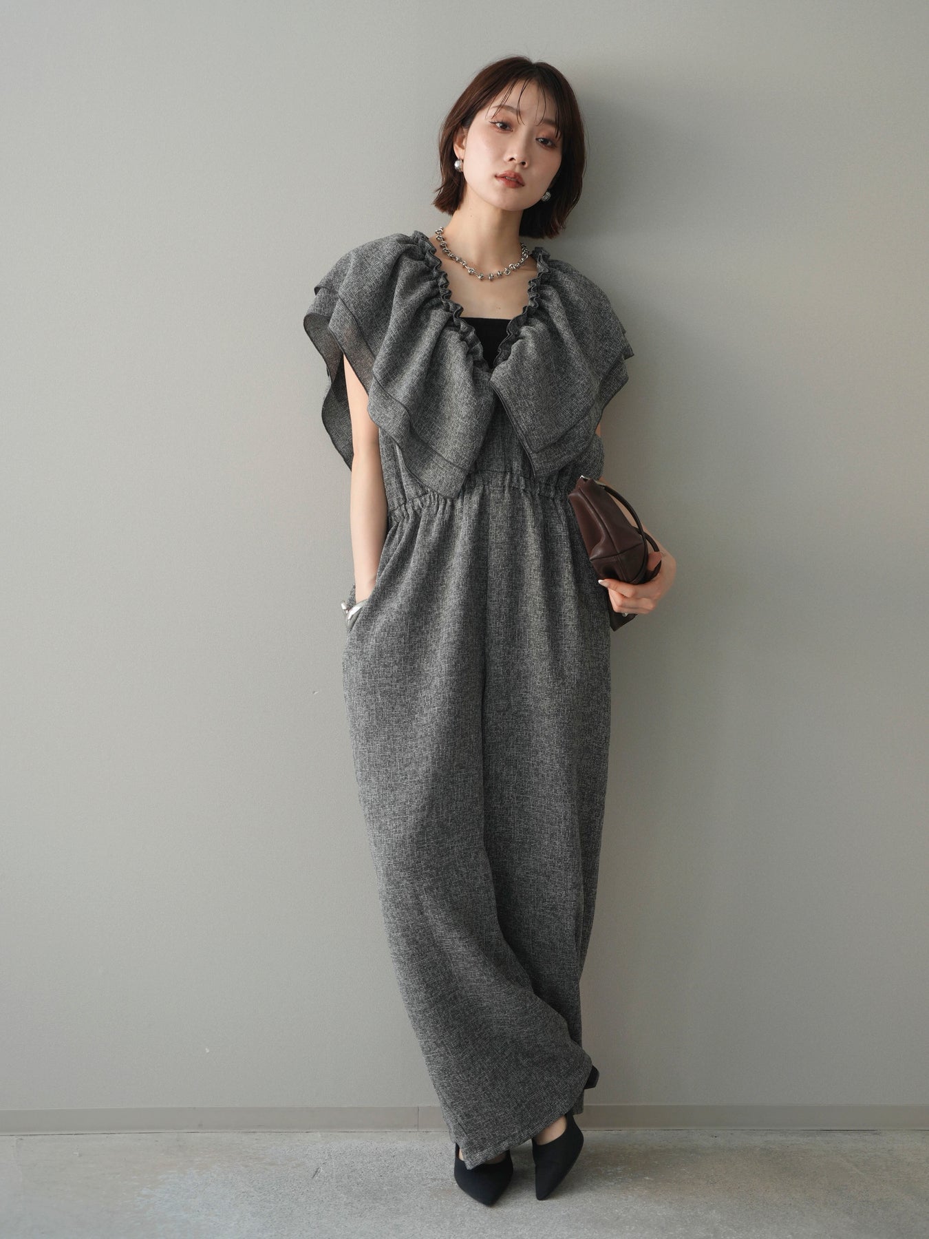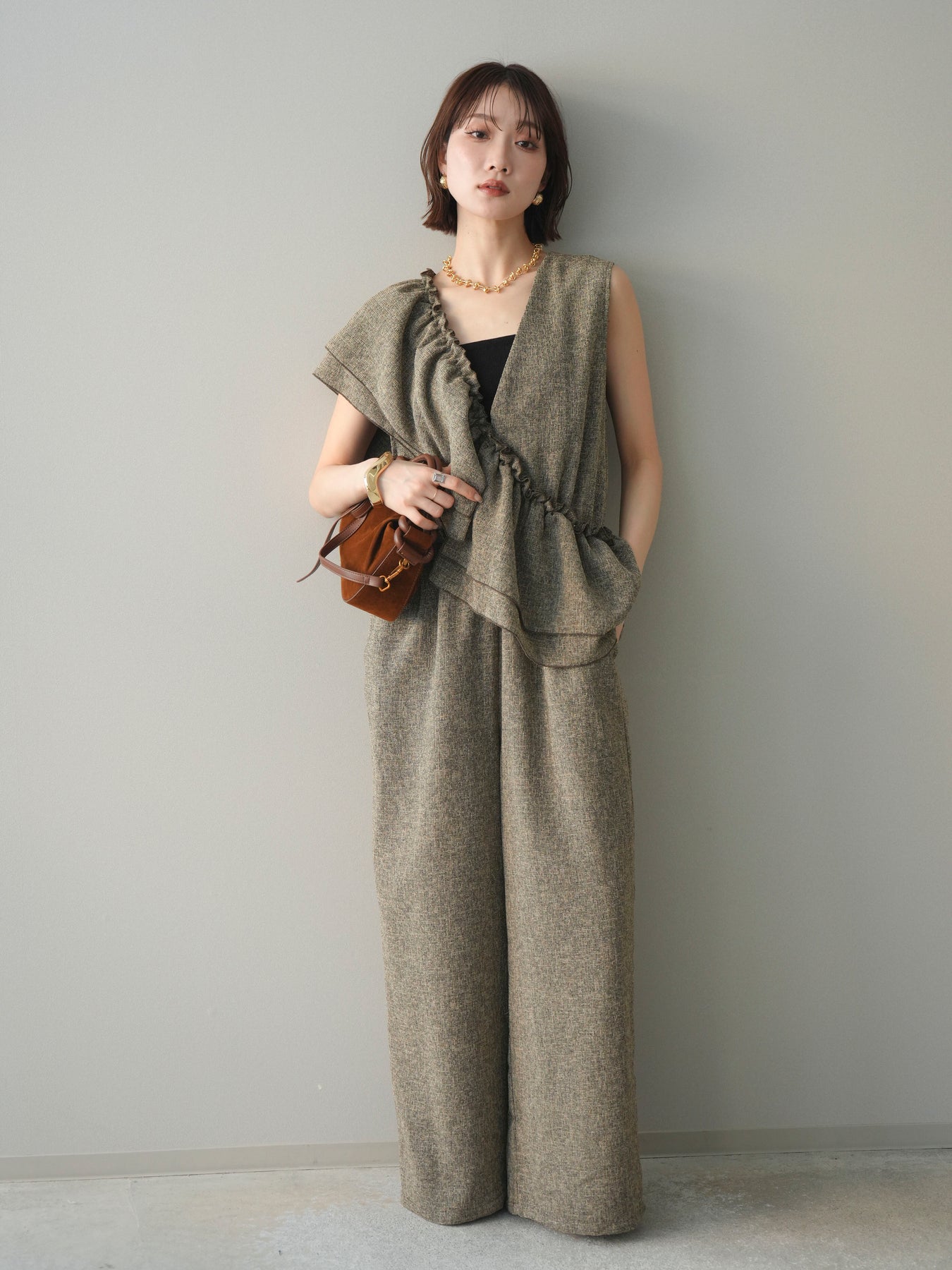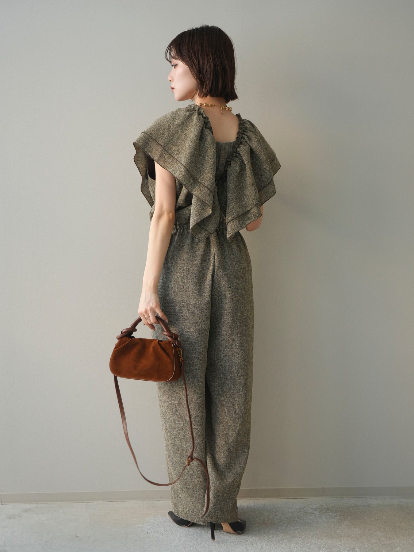 [SET]3WAYミックスツイードギャザーオールインワン+選べるアクセセット(2set)