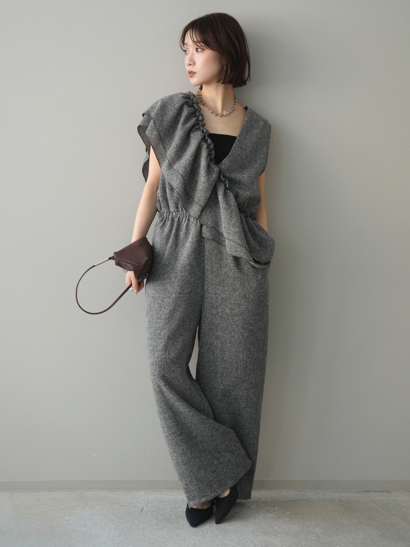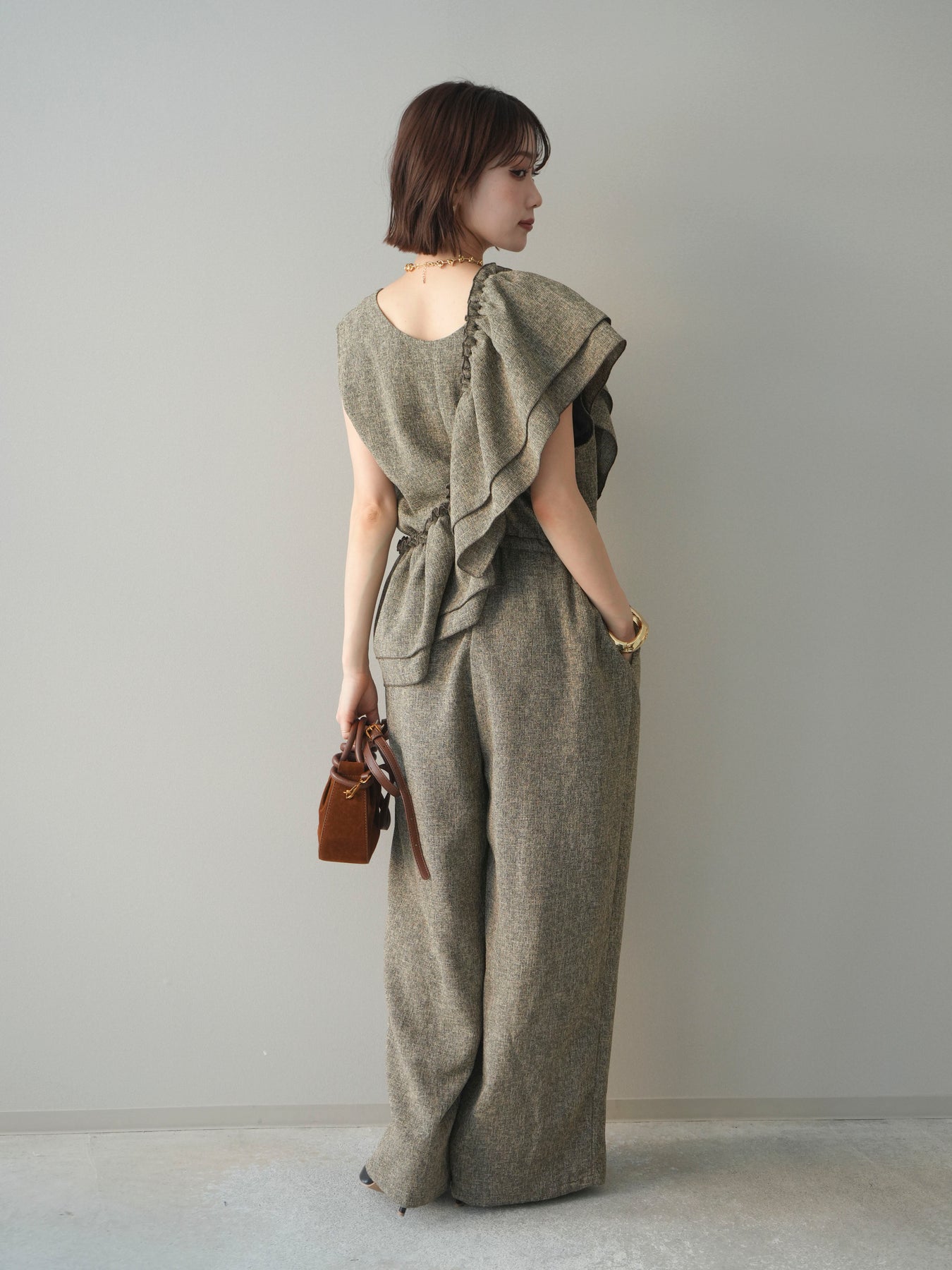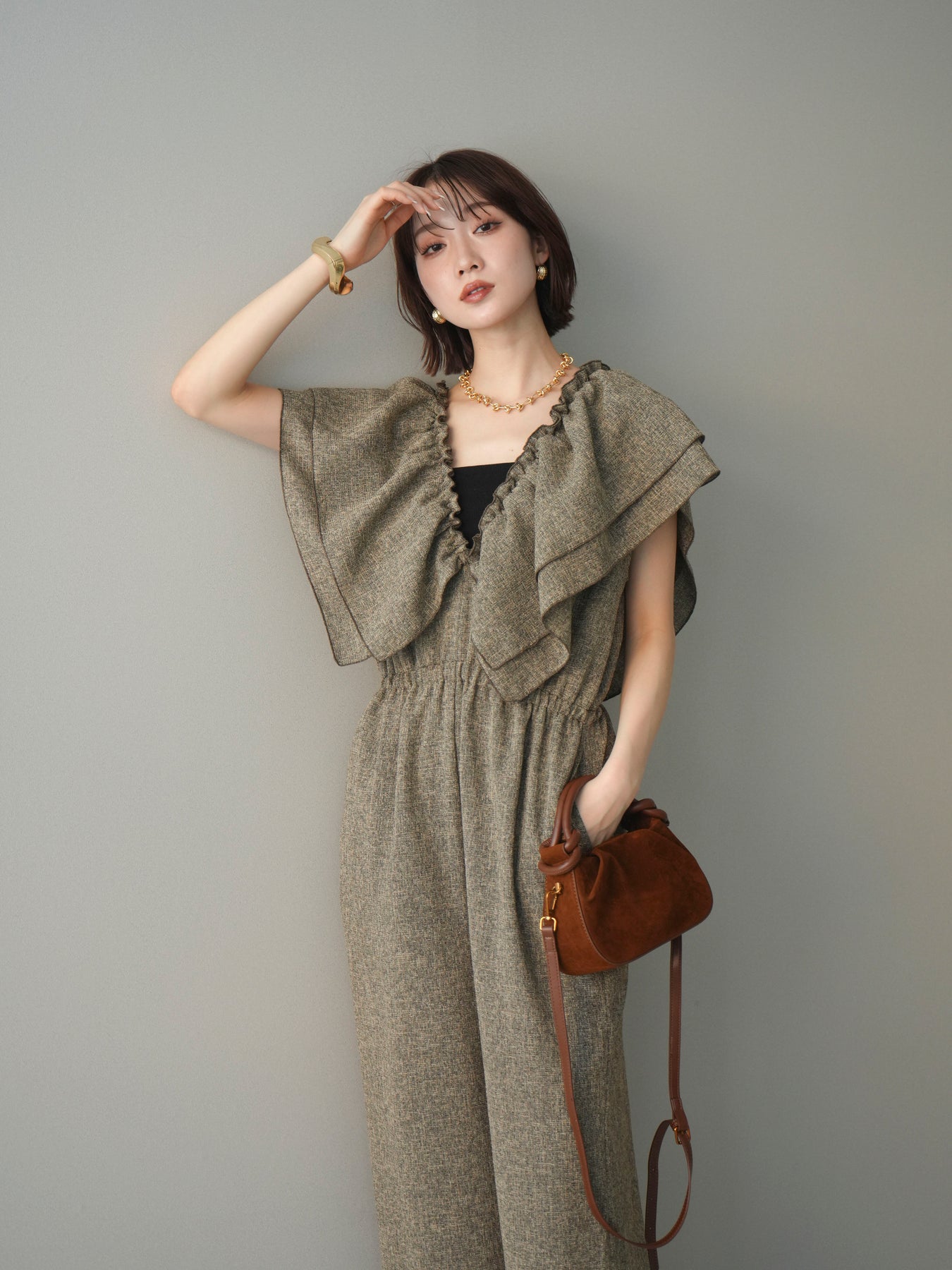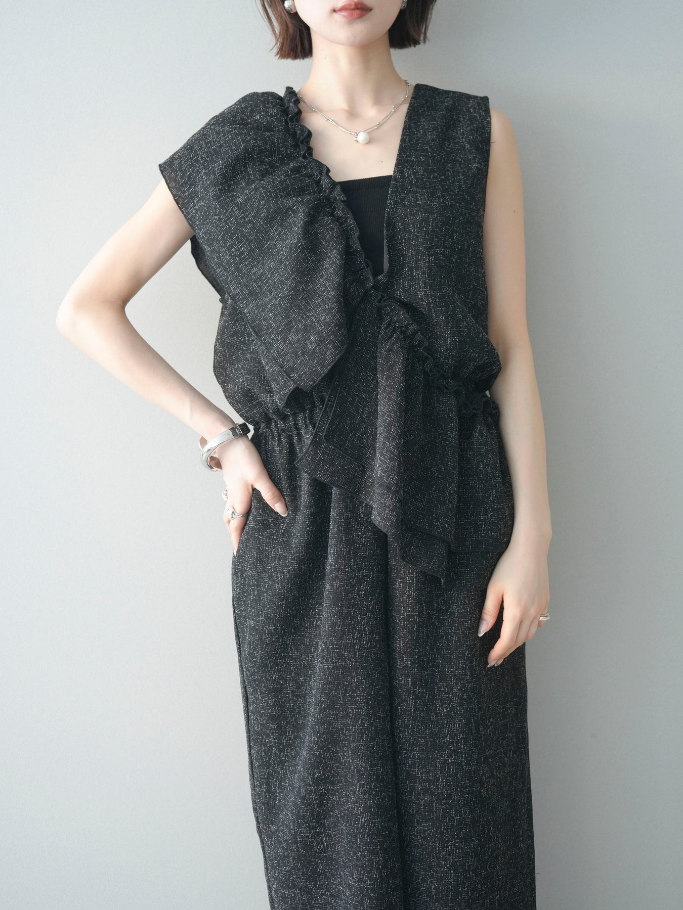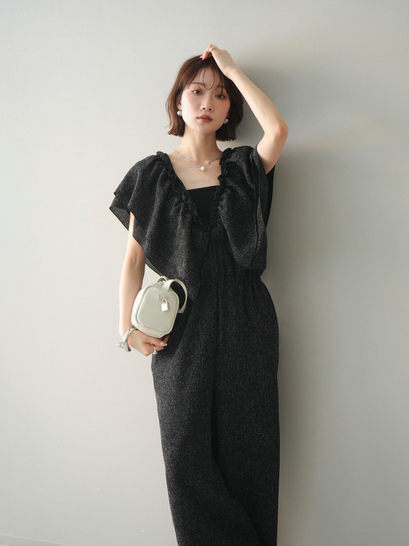 [SET]3WAYミックスツイードギャザーオールインワン+選べるアクセセット(2set)