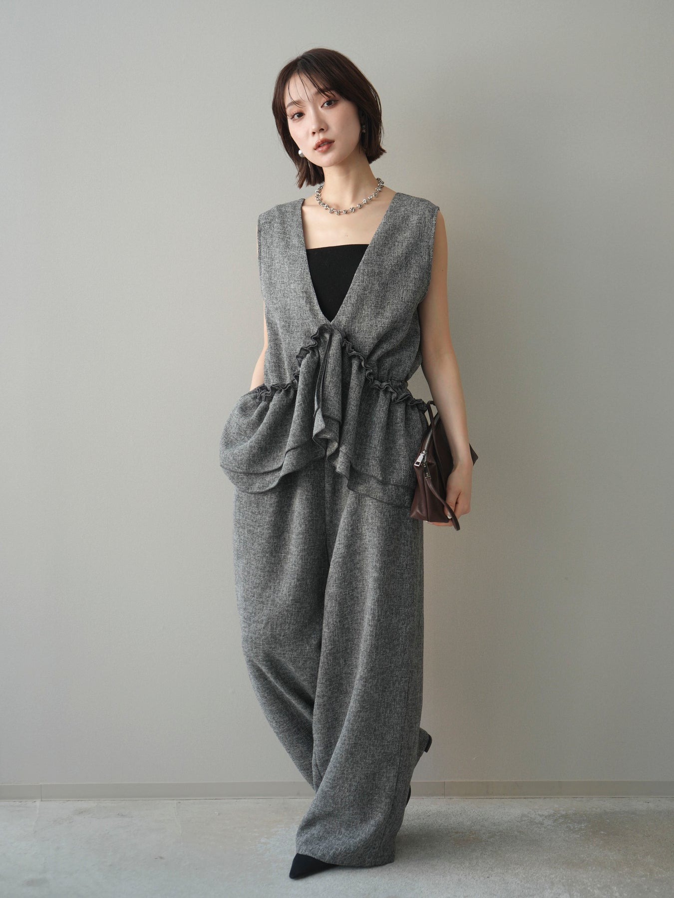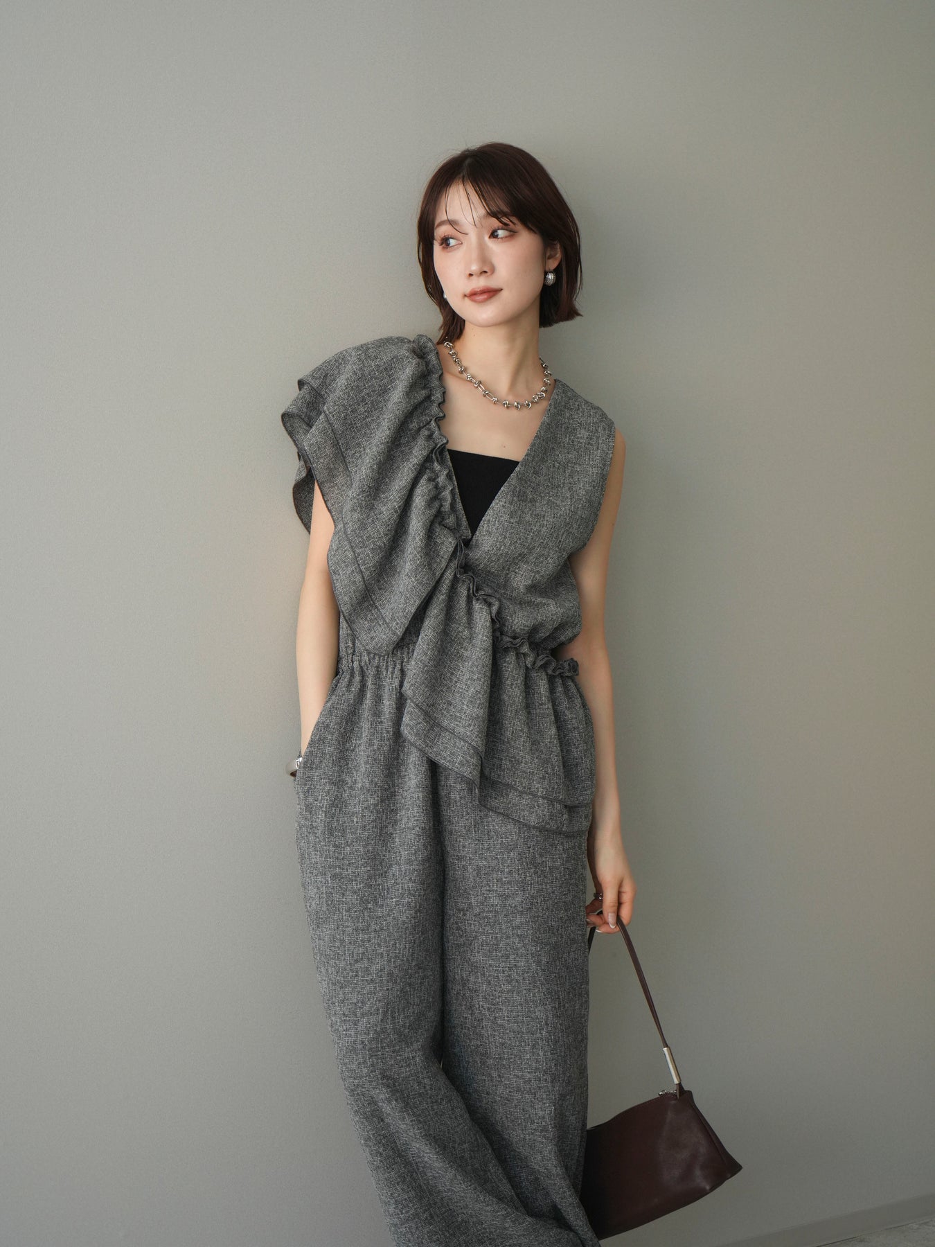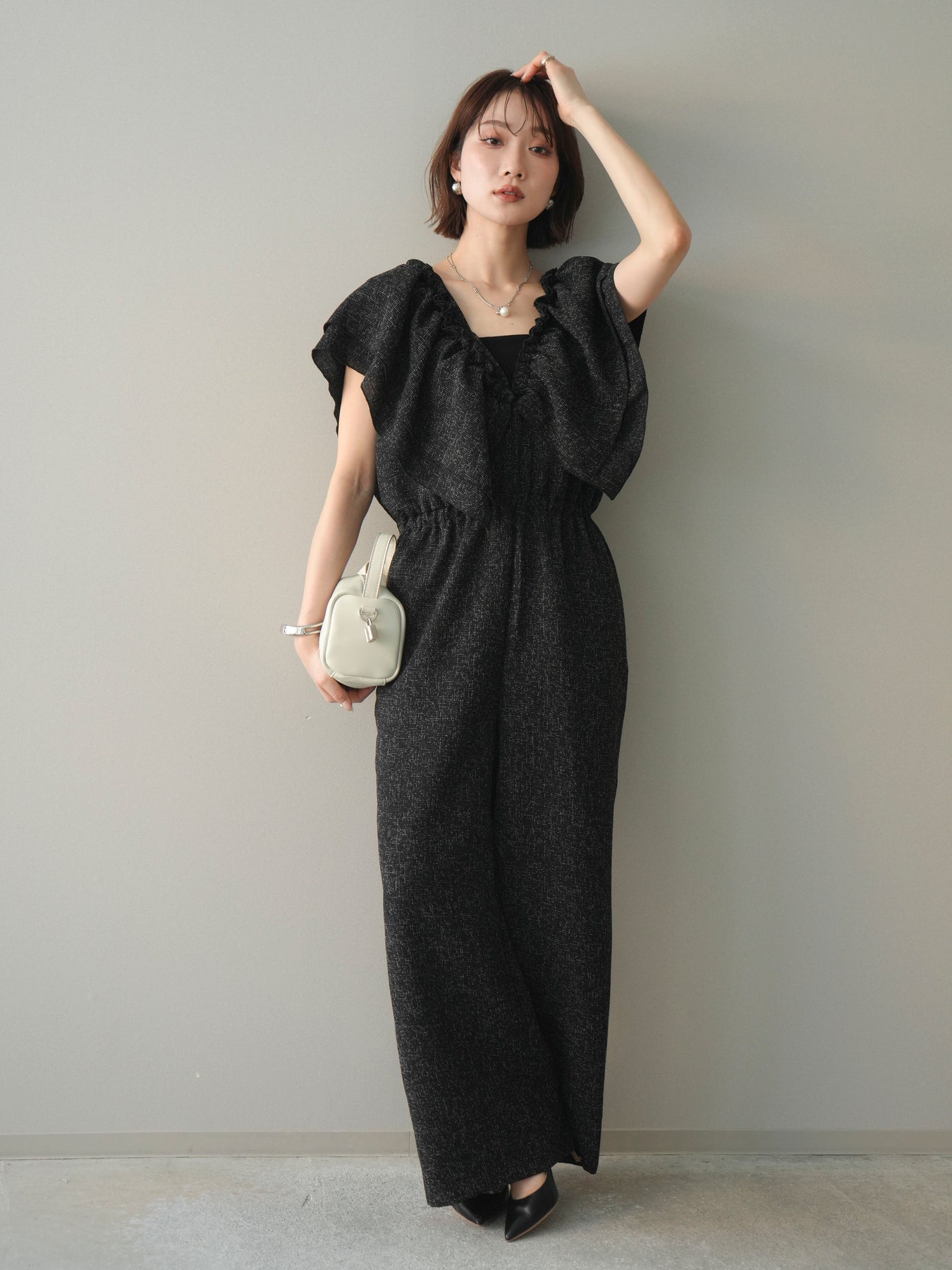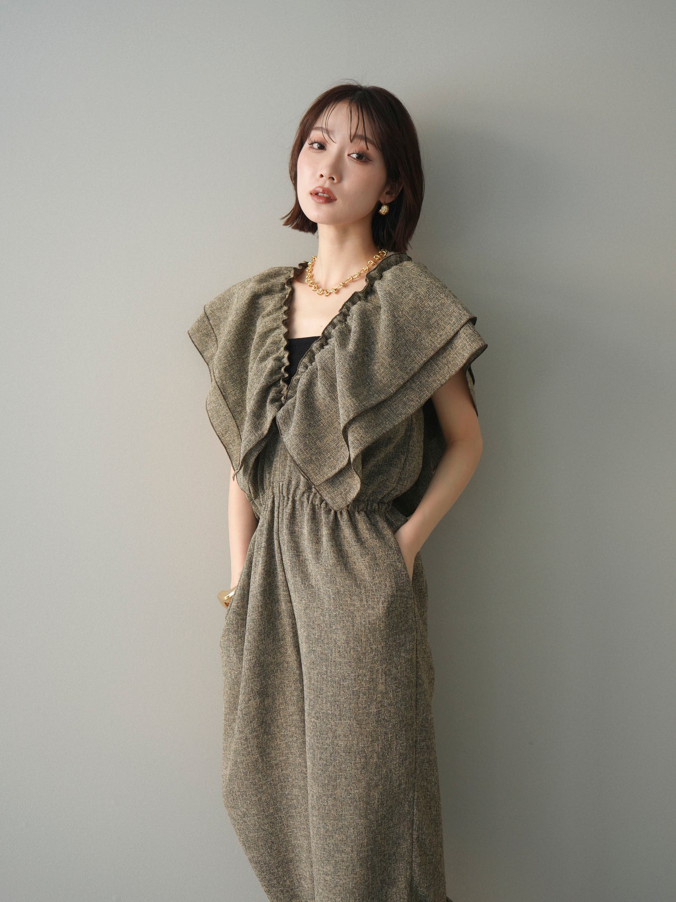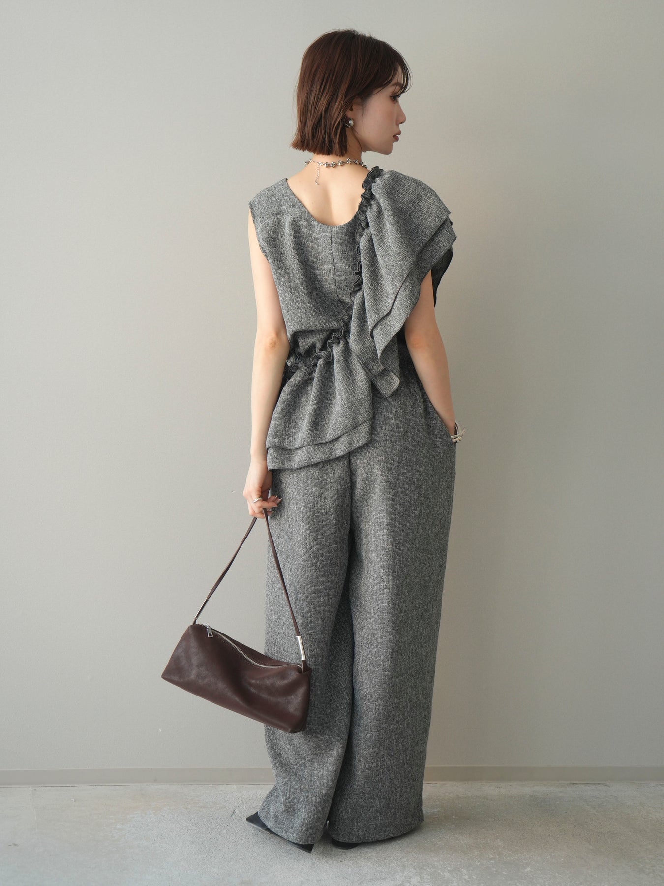[SET]3WAYミックスツイードギャザーオールインワン+選べるアクセセット(2set)