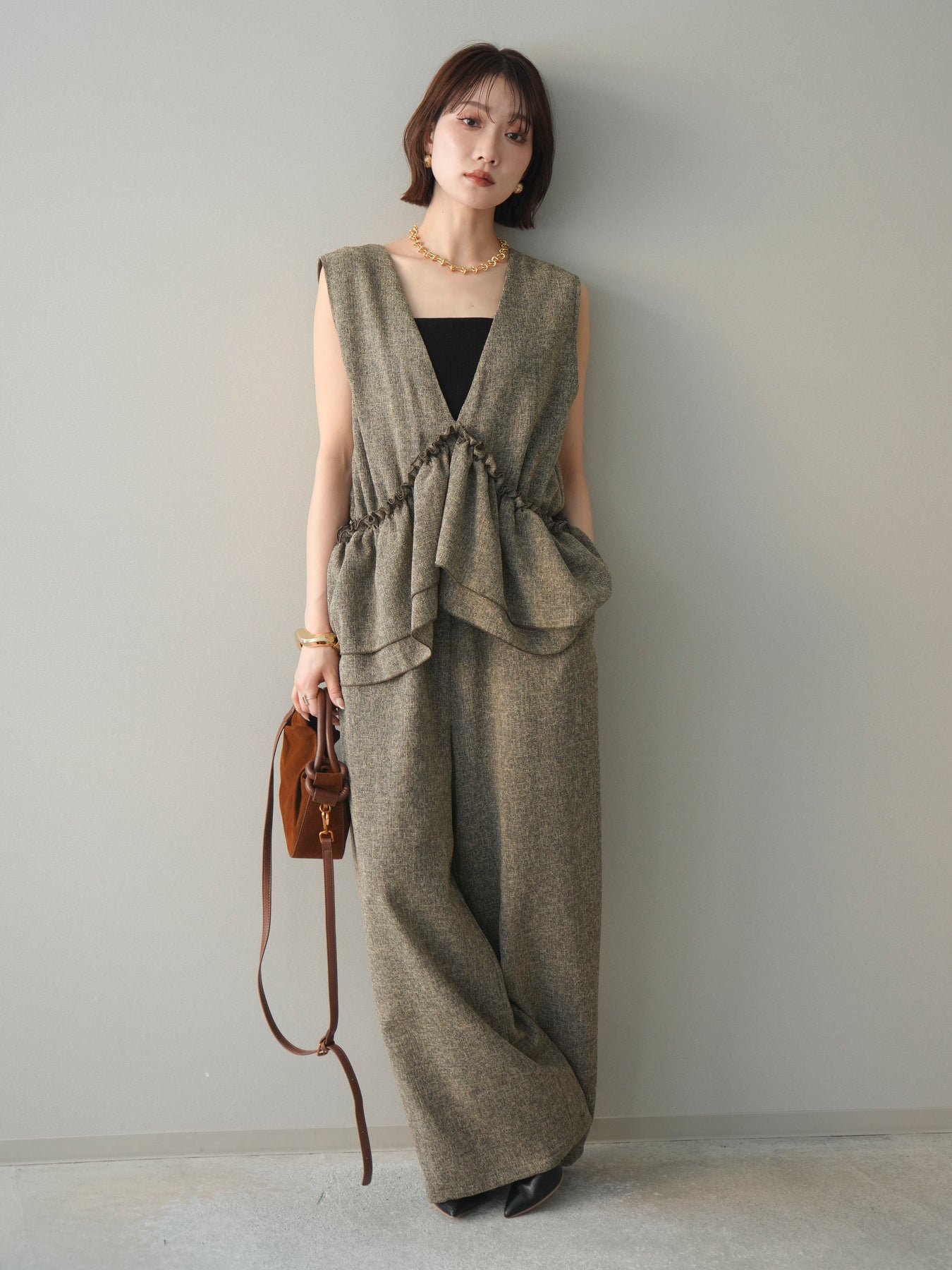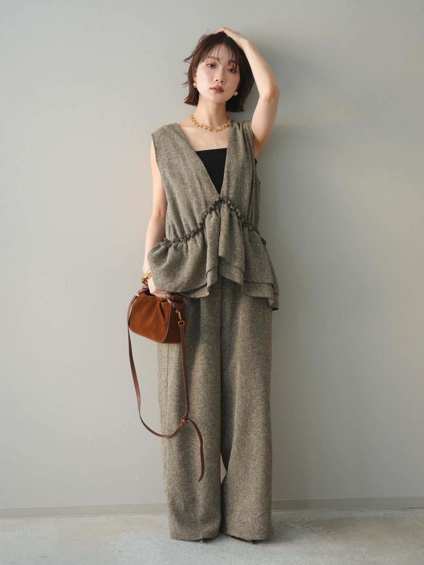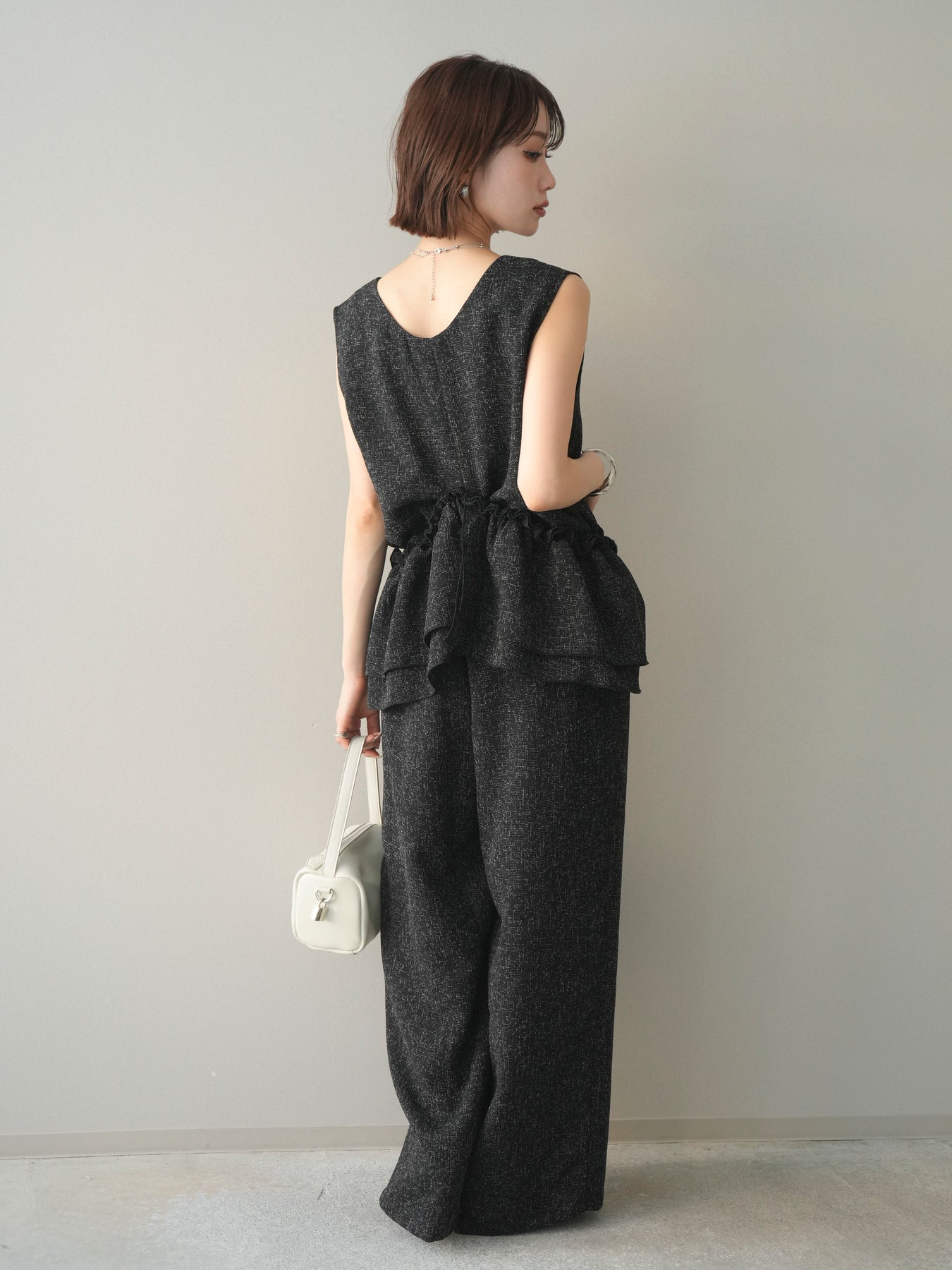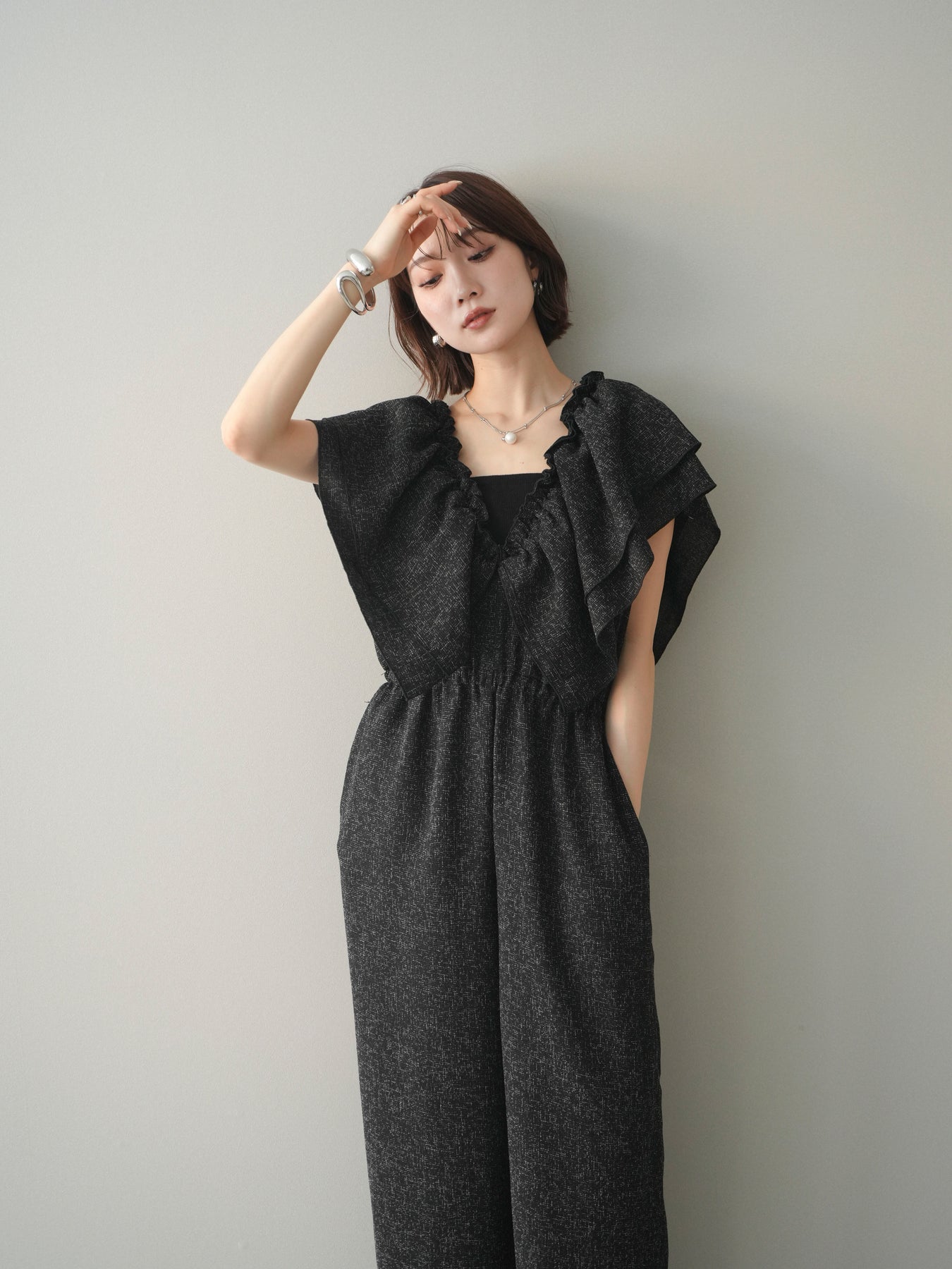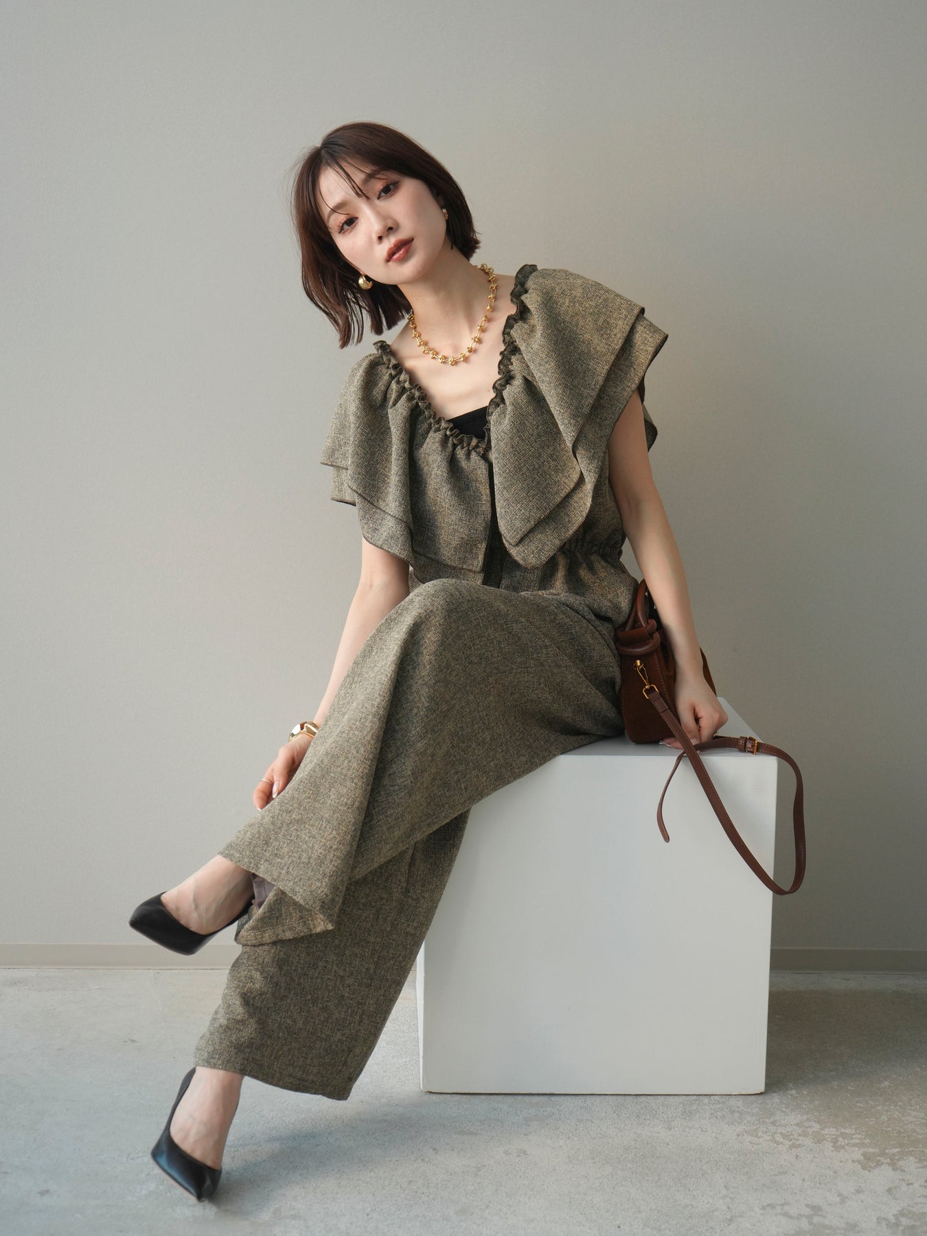 [SET]3WAYミックスツイードギャザーオールインワン+選べるアクセセット(2set)