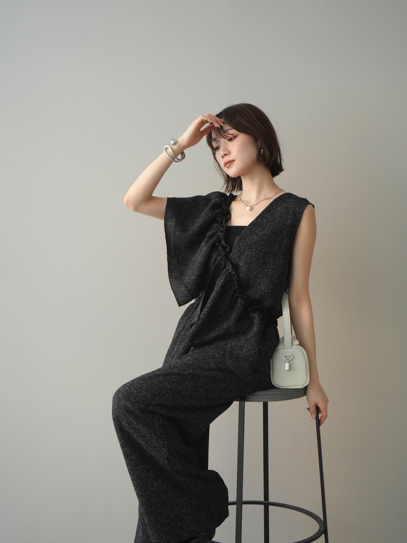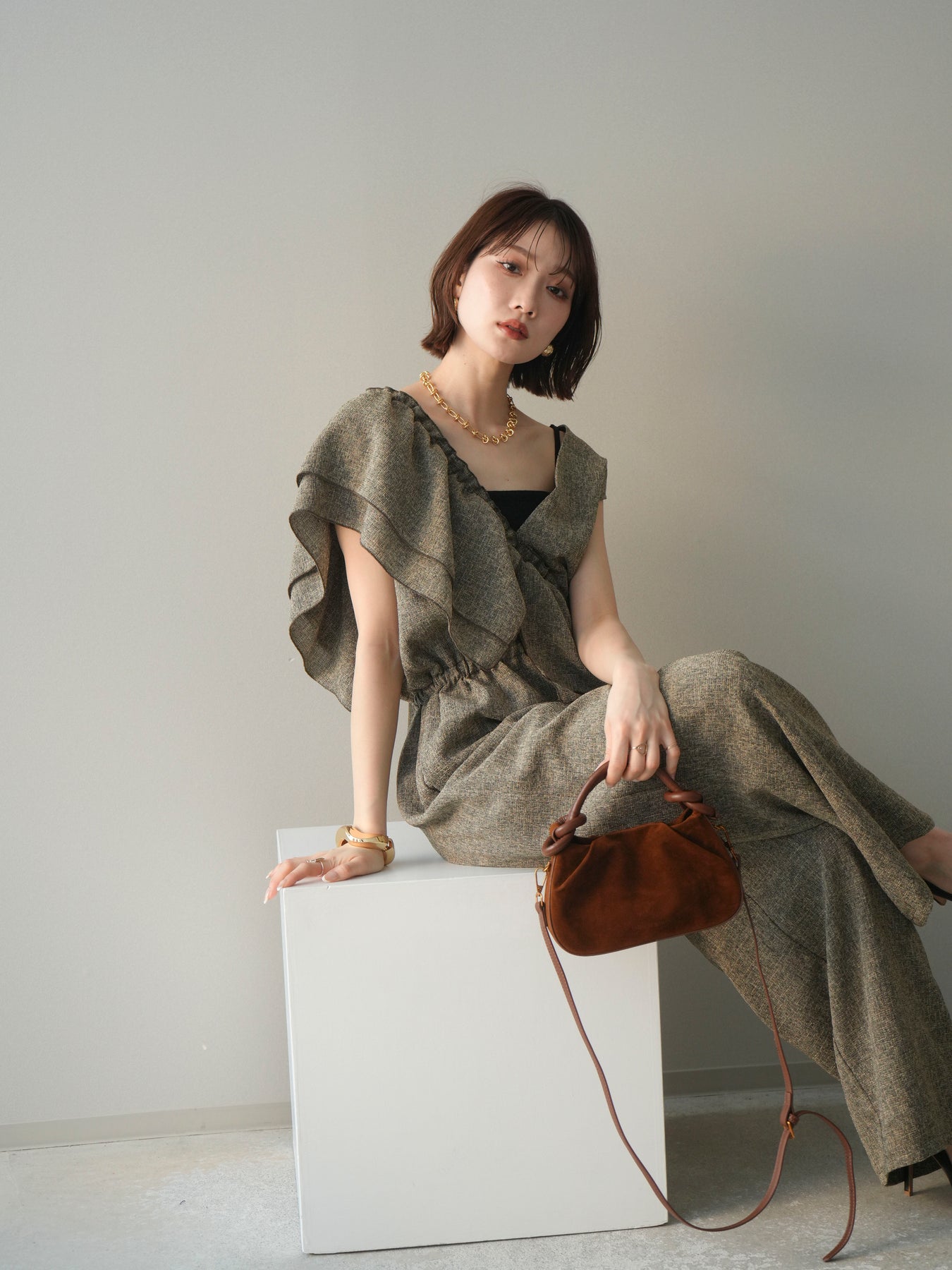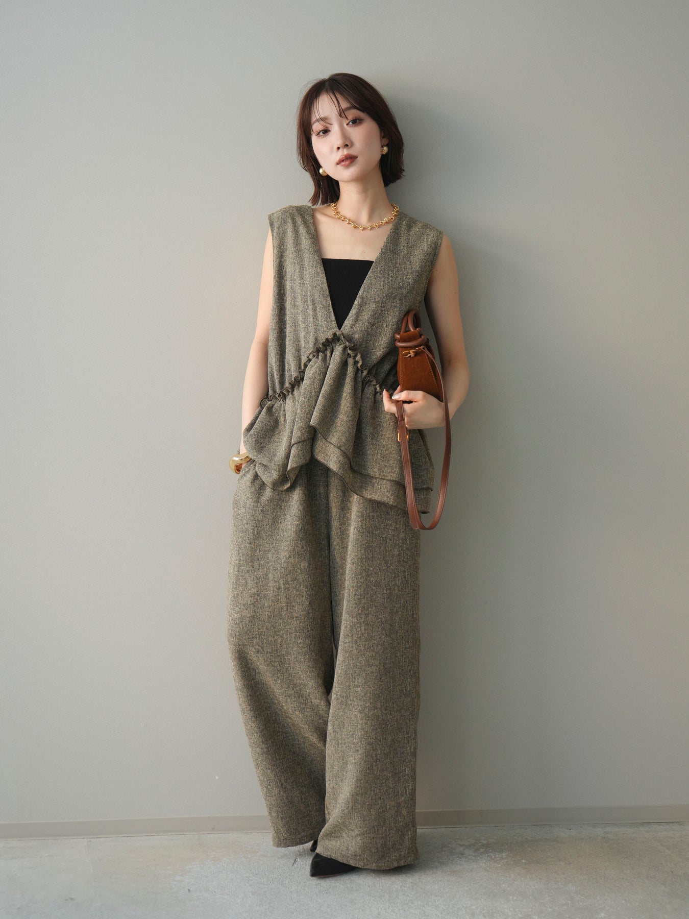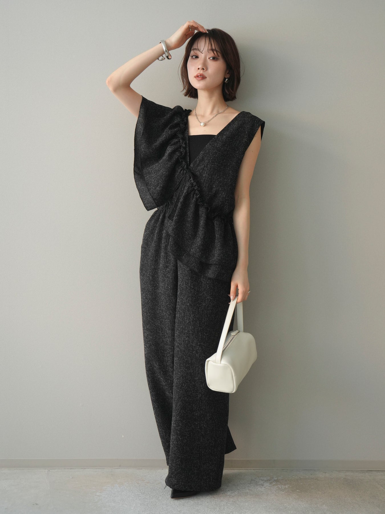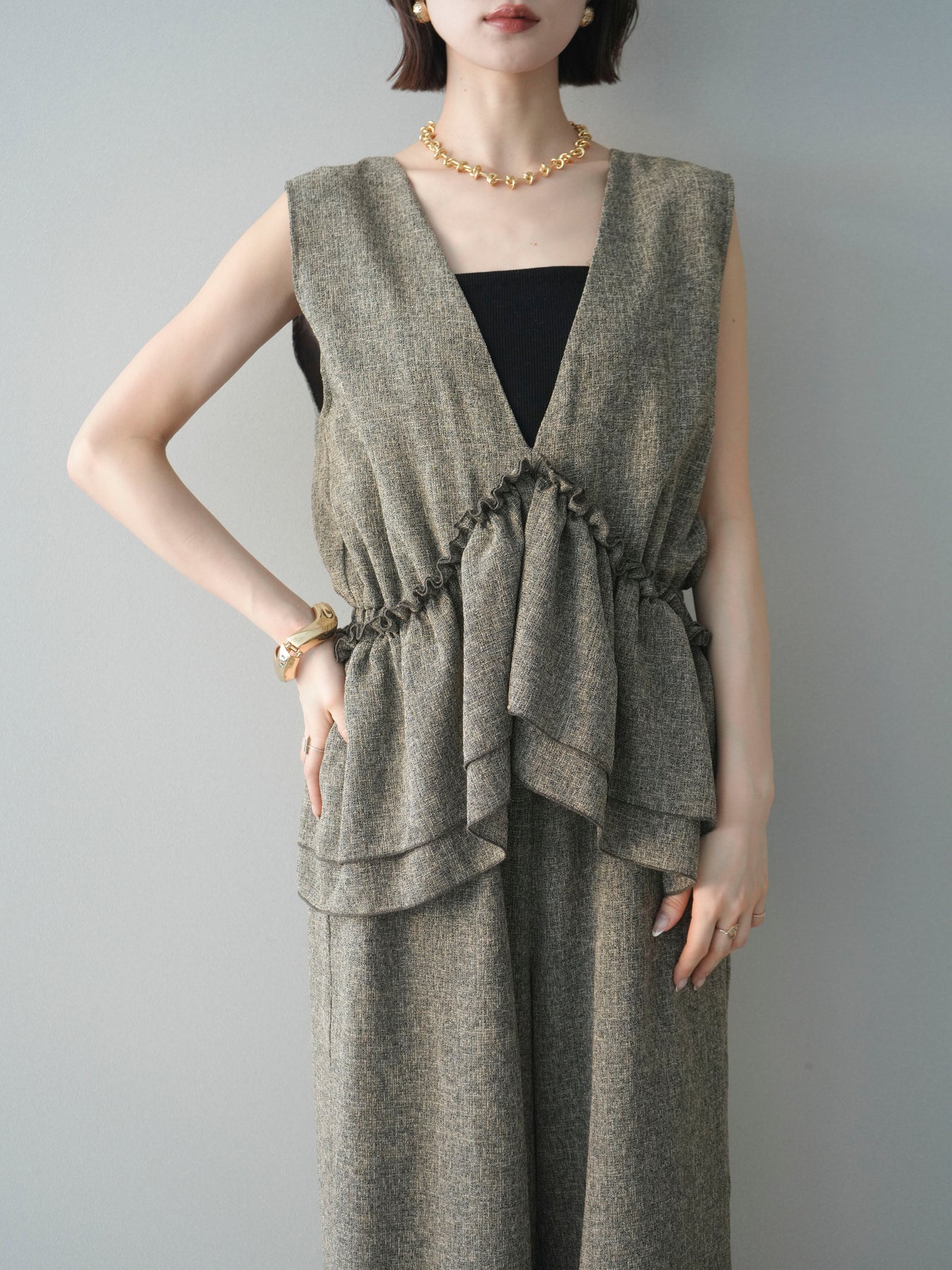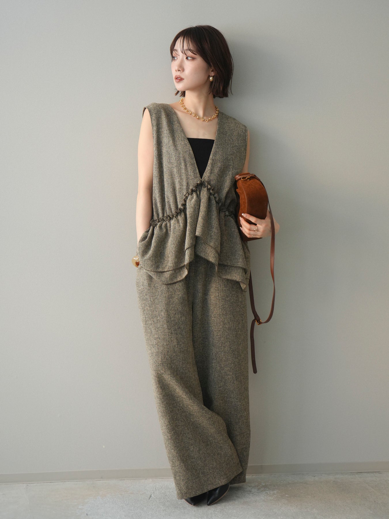[SET]3WAYミックスツイードギャザーオールインワン+選べるアクセセット(2set)