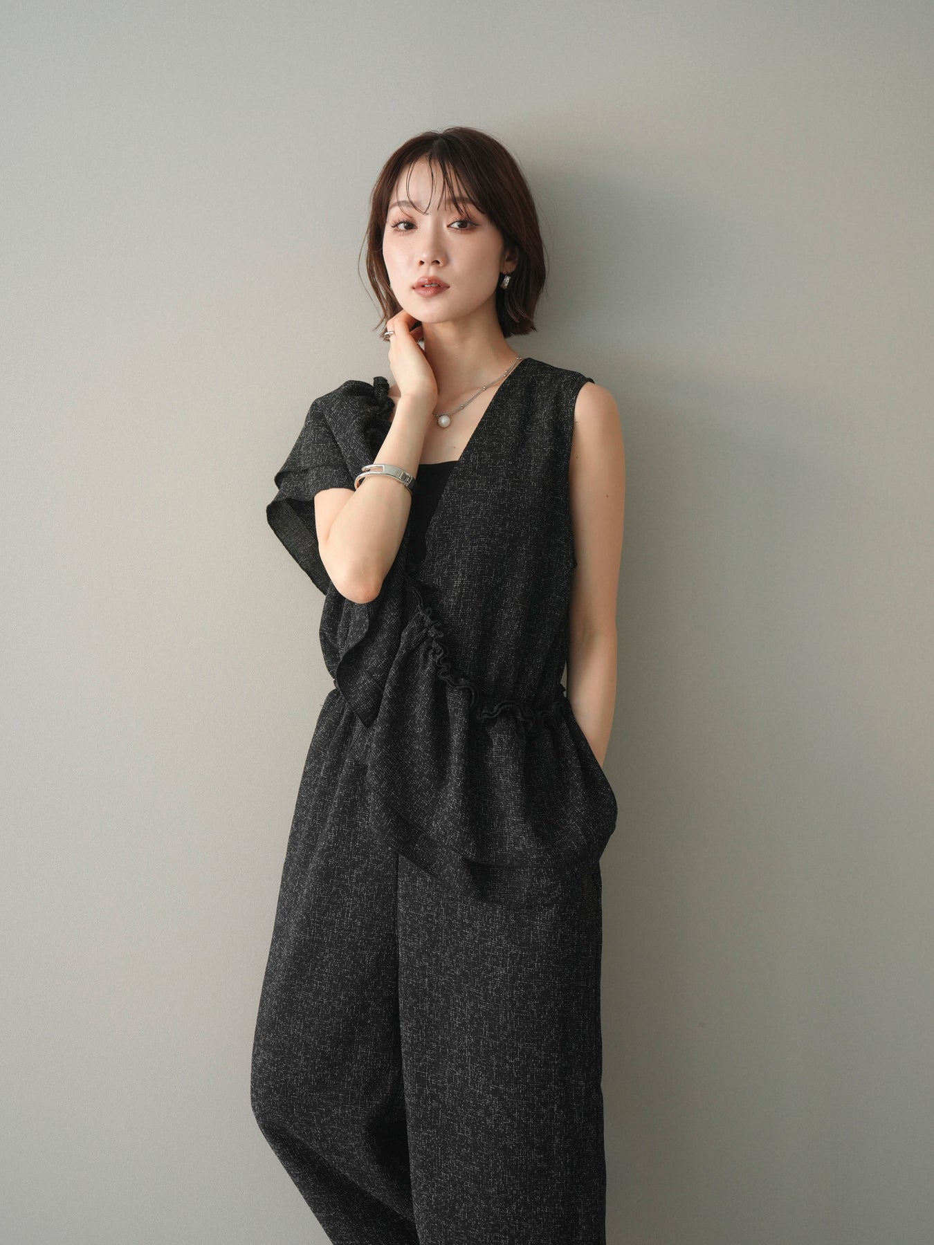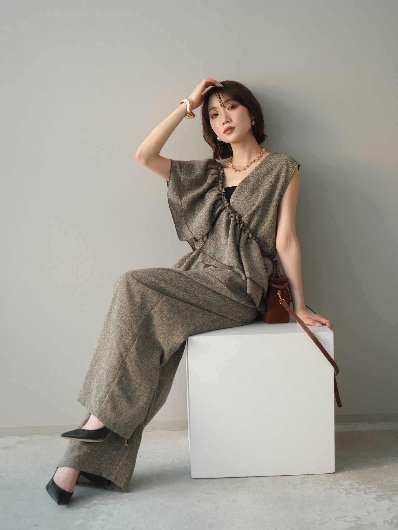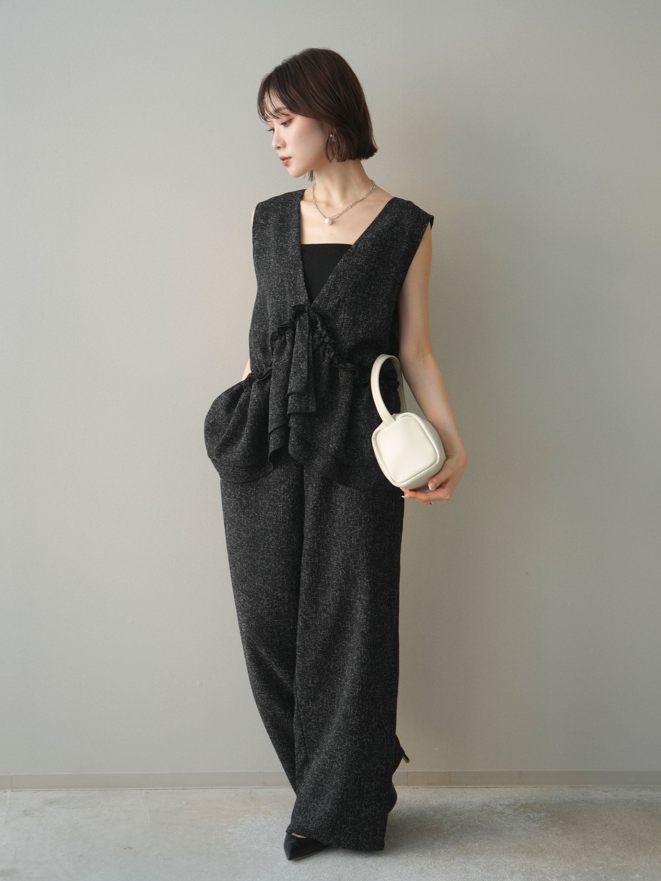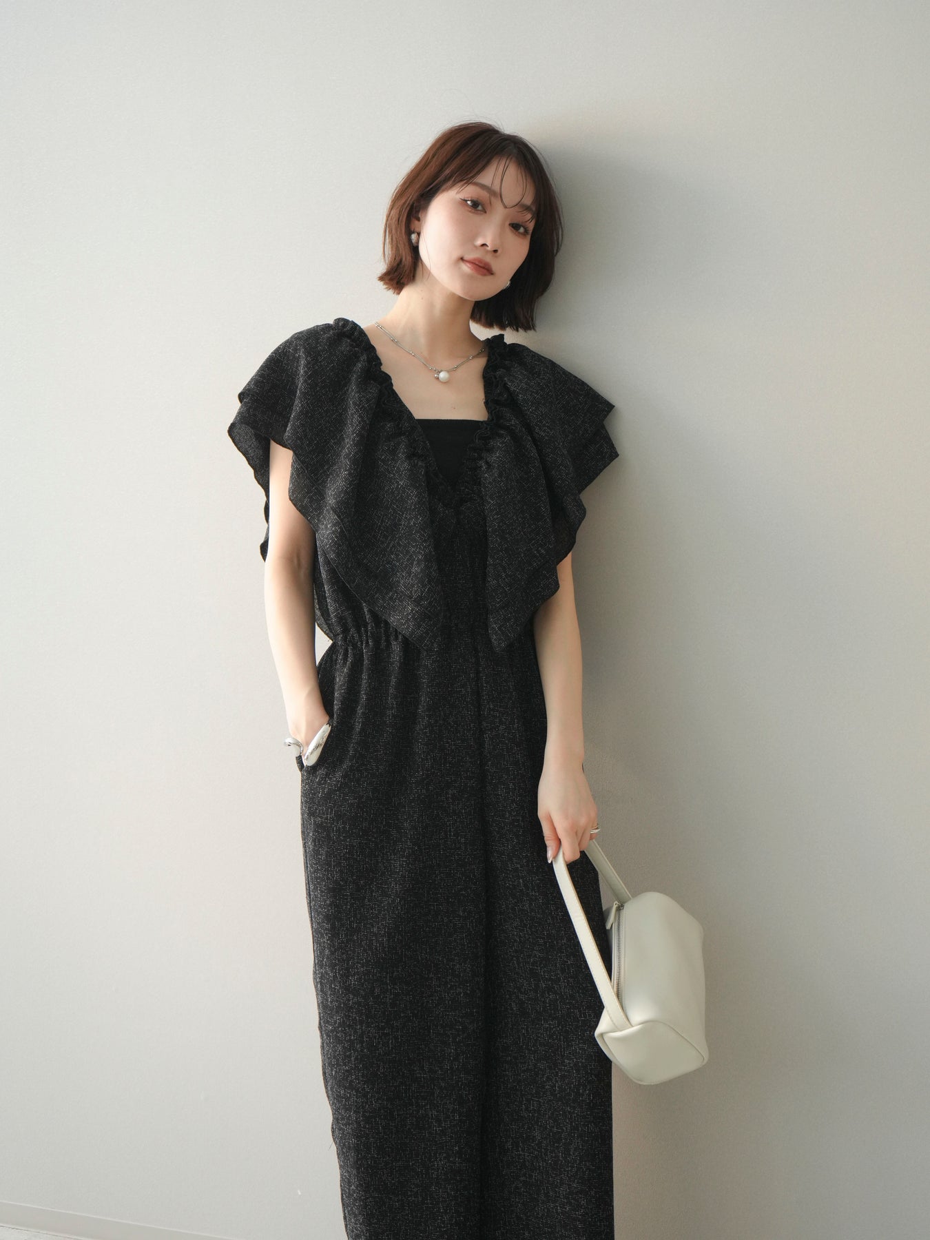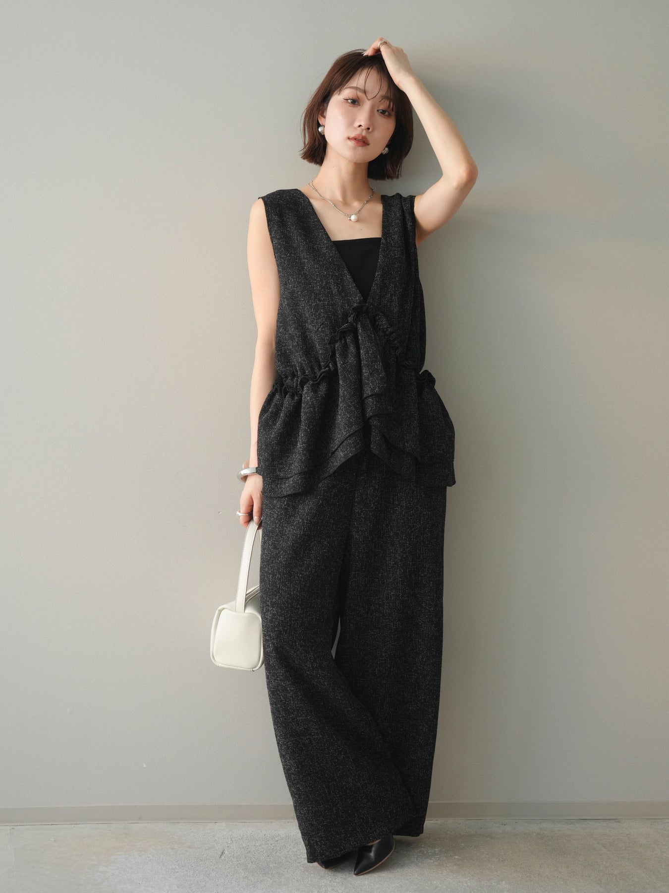 [SET]3WAYミックスツイードギャザーオールインワン+選べるアクセセット(2set)