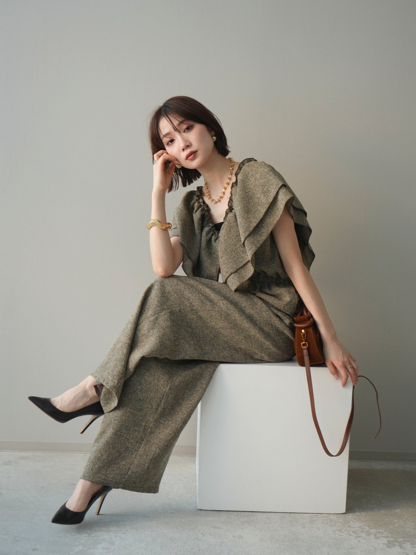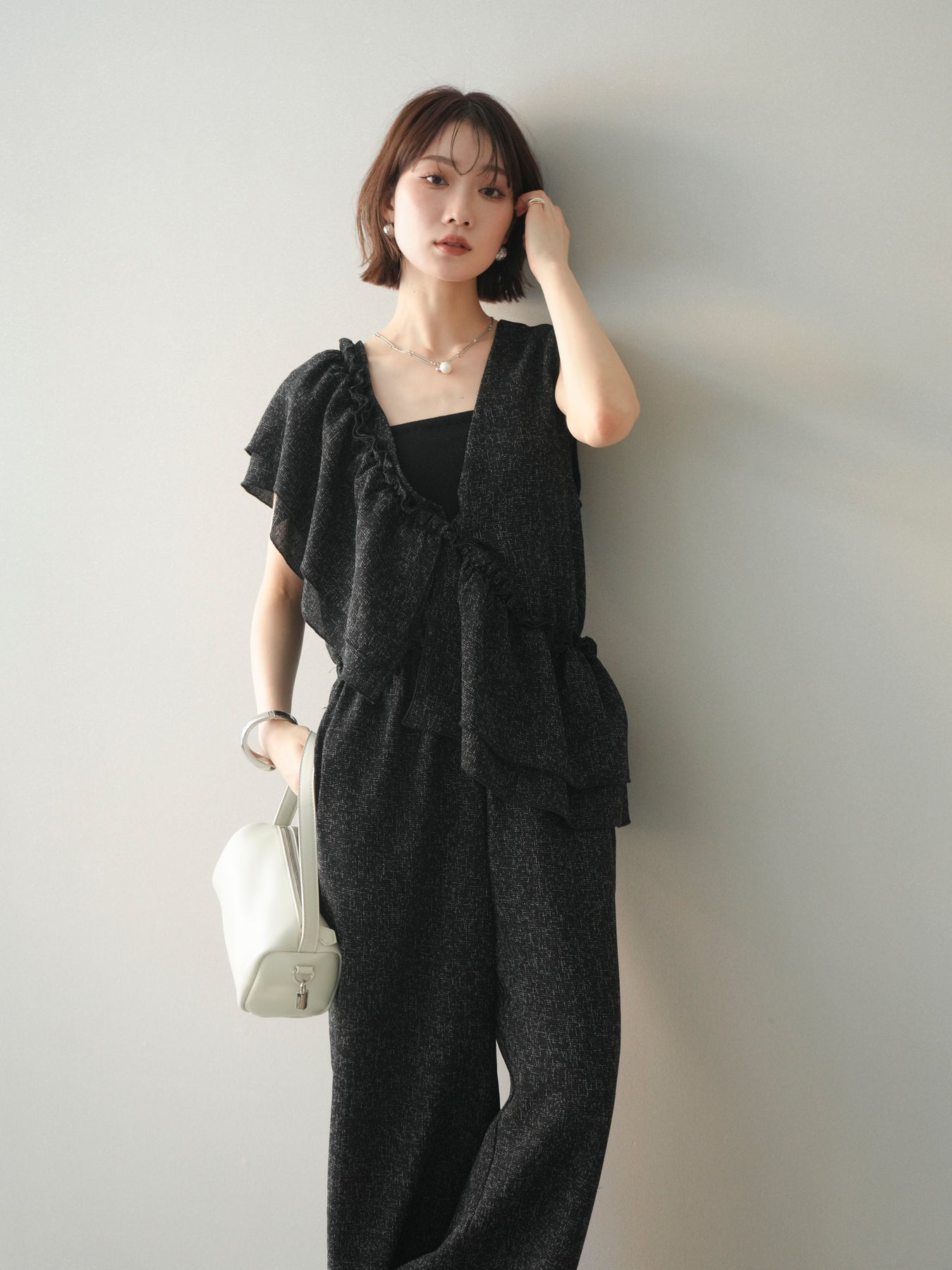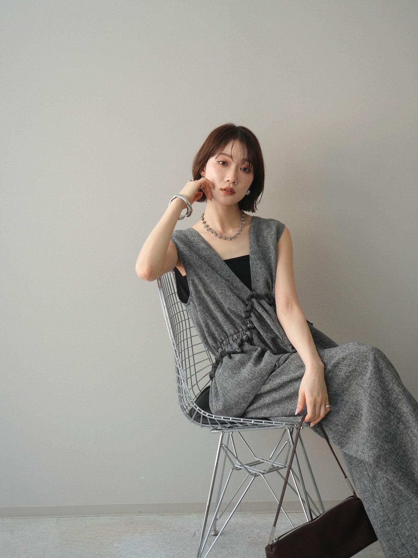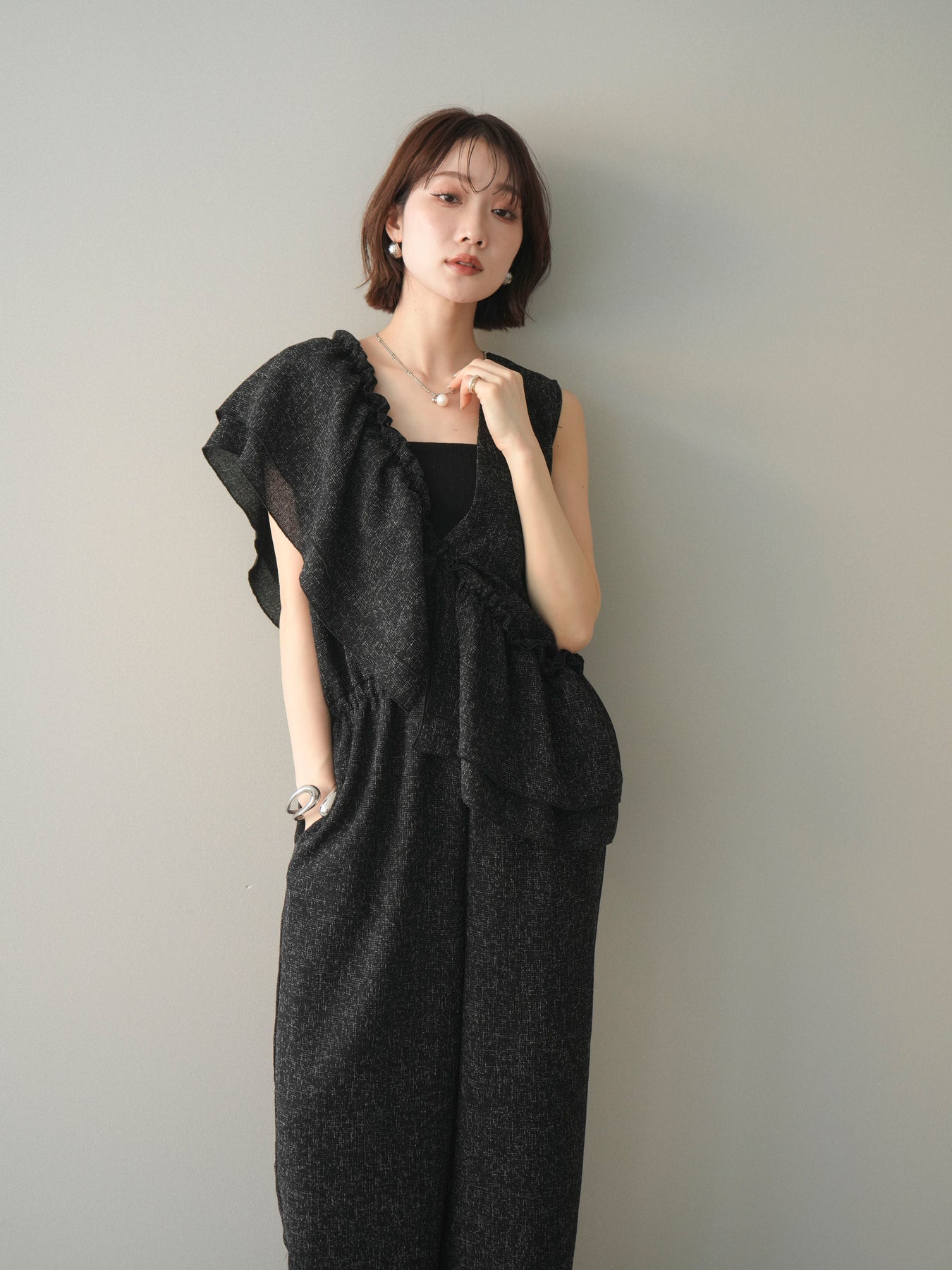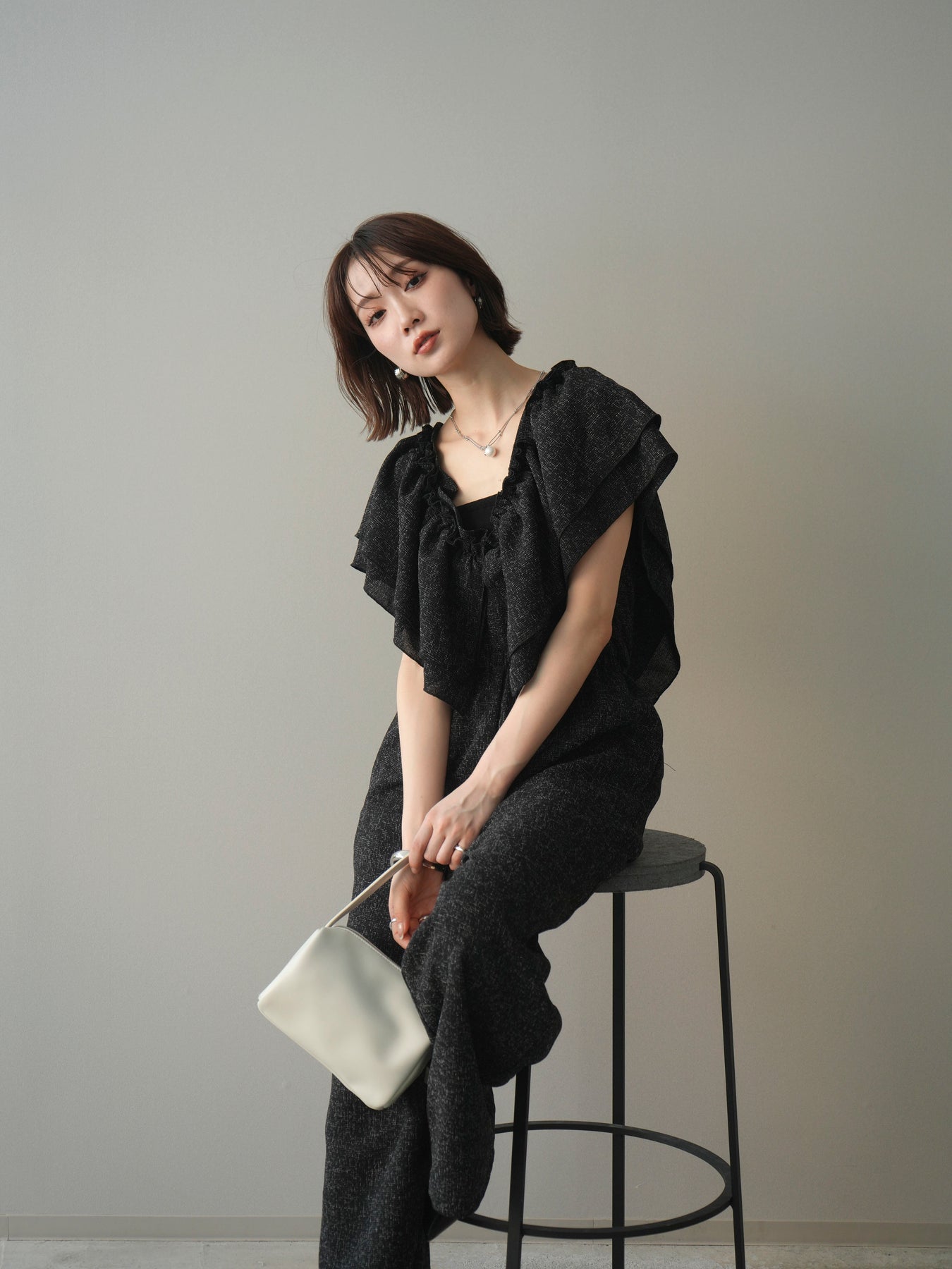[SET]3WAYミックスツイードギャザーオールインワン+選べるアクセセット(2set)