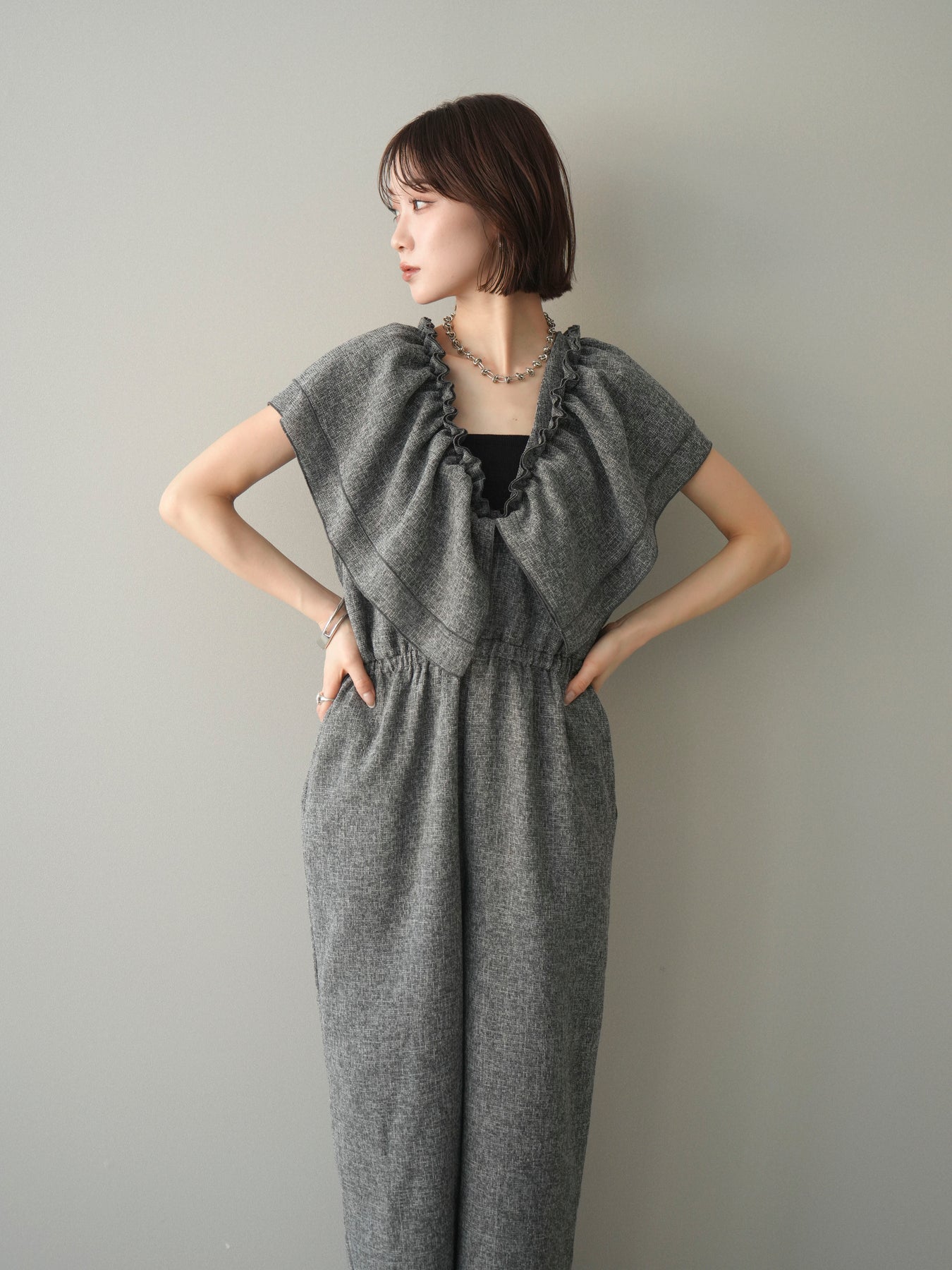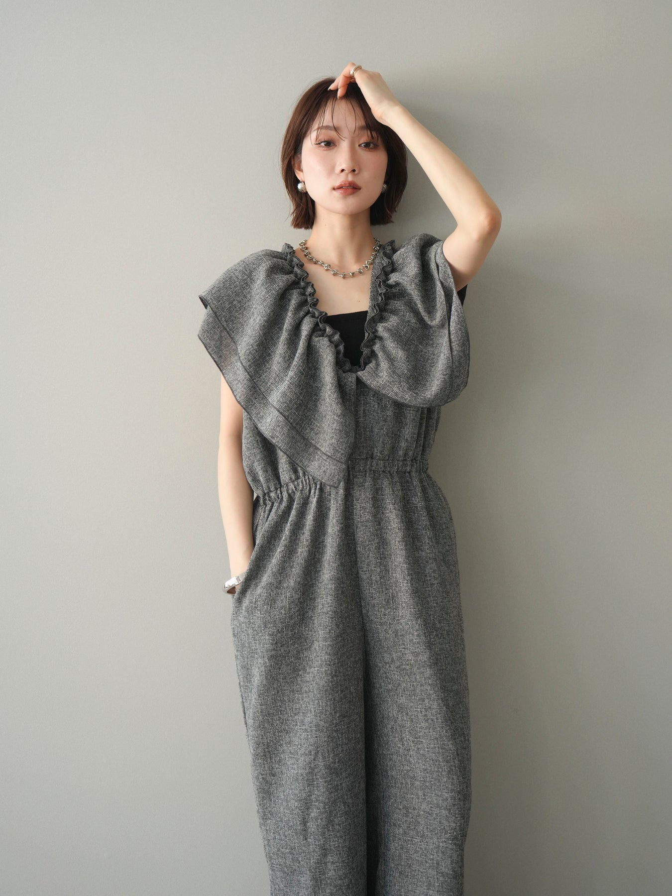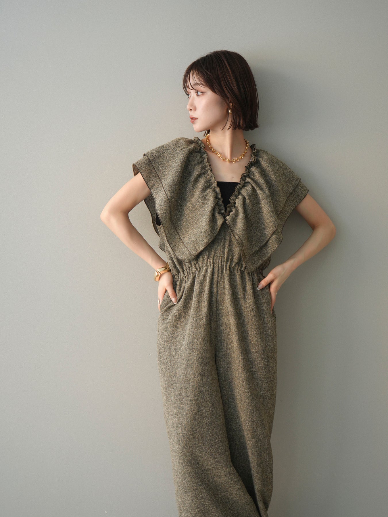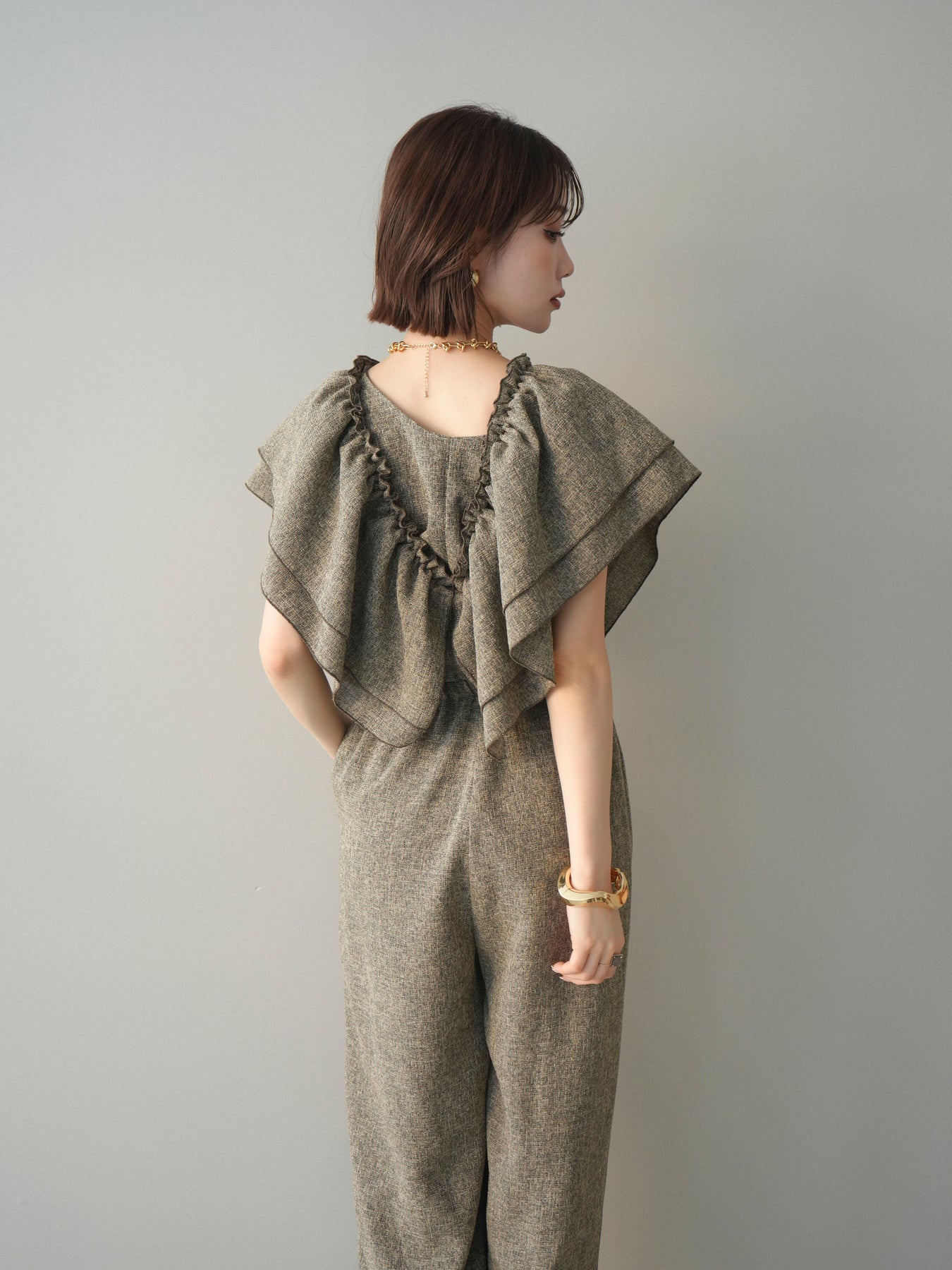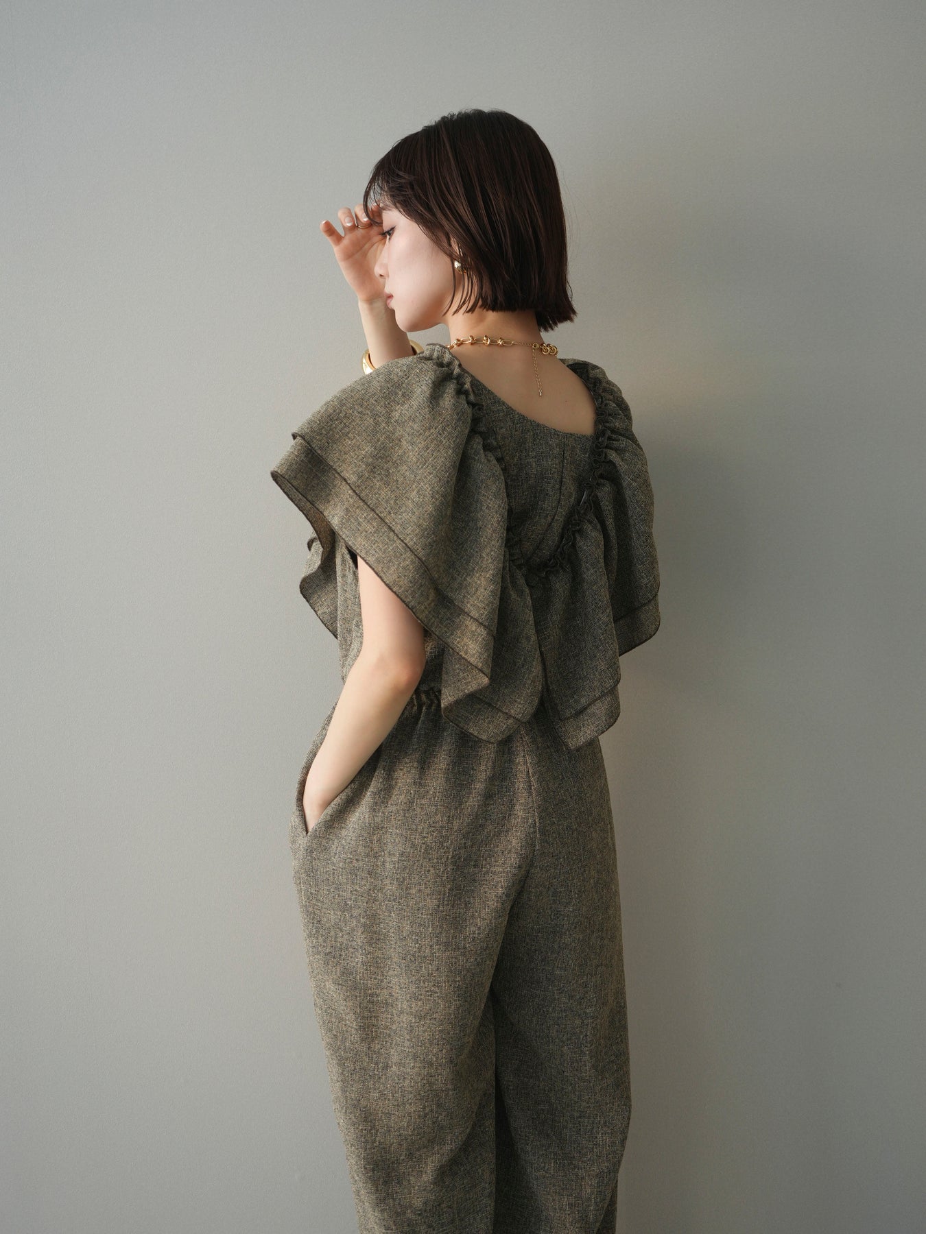 ミックス感のあるツイード素材を使用し、奥行きのある表情と上品さを兼ね備えたオールインワン。ウエスト部分に施したギャザーデザインが自然なメリハリを生み、スタイルアップを叶えながらもリラックスした着心地を実現します。前後で印象を変えられる3WAY仕様で、着こなし次第で雰囲気を自在にアレンジできるのも魅力。インナー合わせでシーズンレスに活躍し、きれいめからカジュアルまで幅広いスタイリングに対応する、存在感のある一着です。