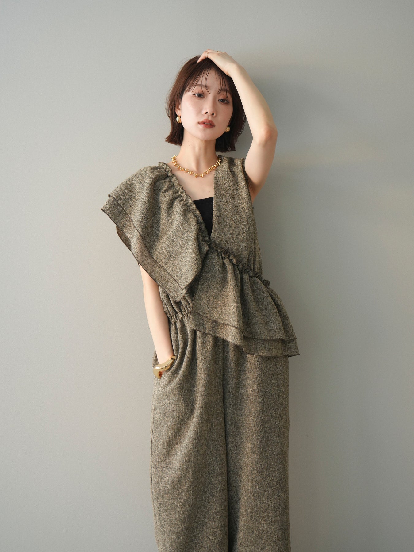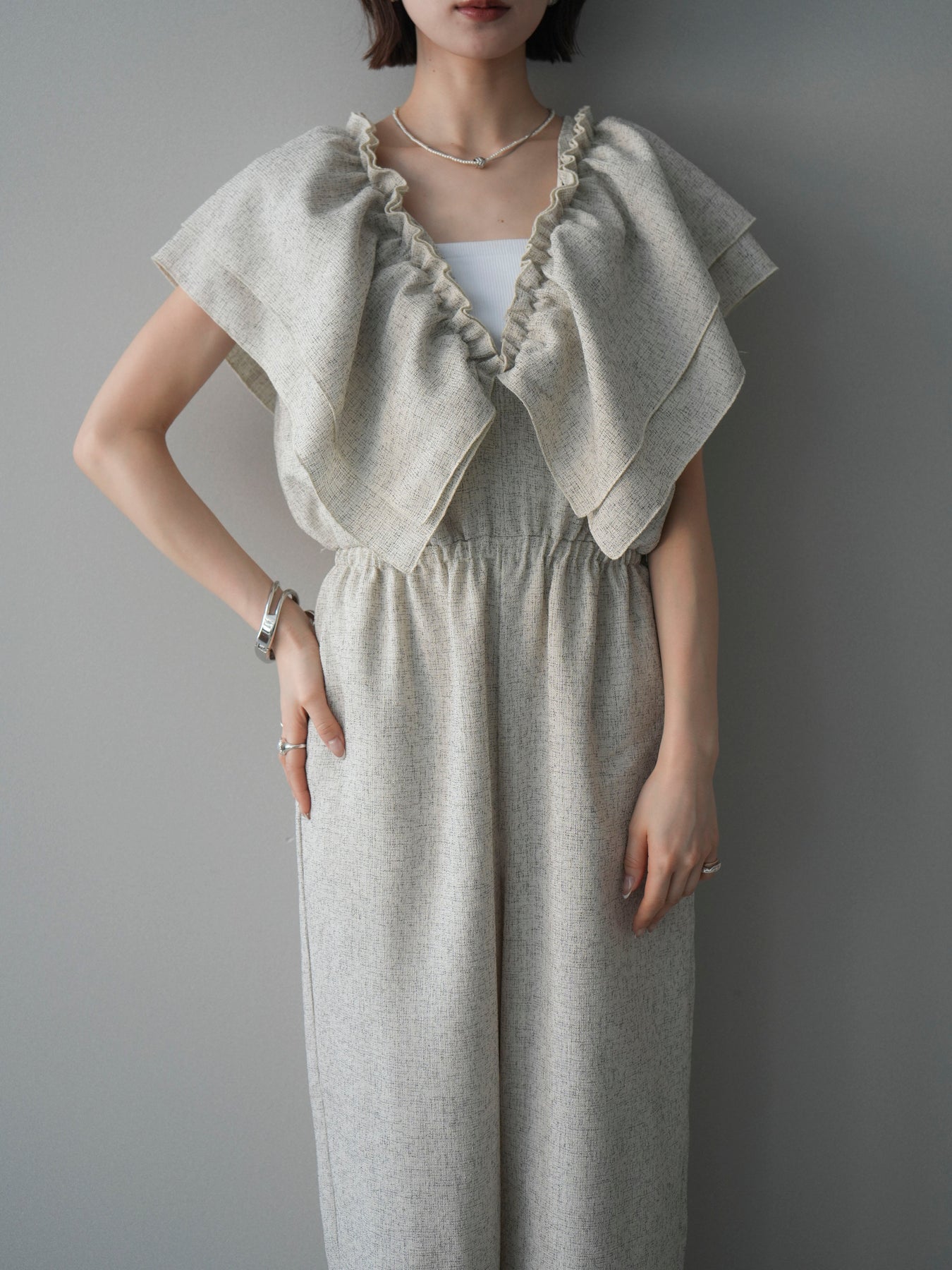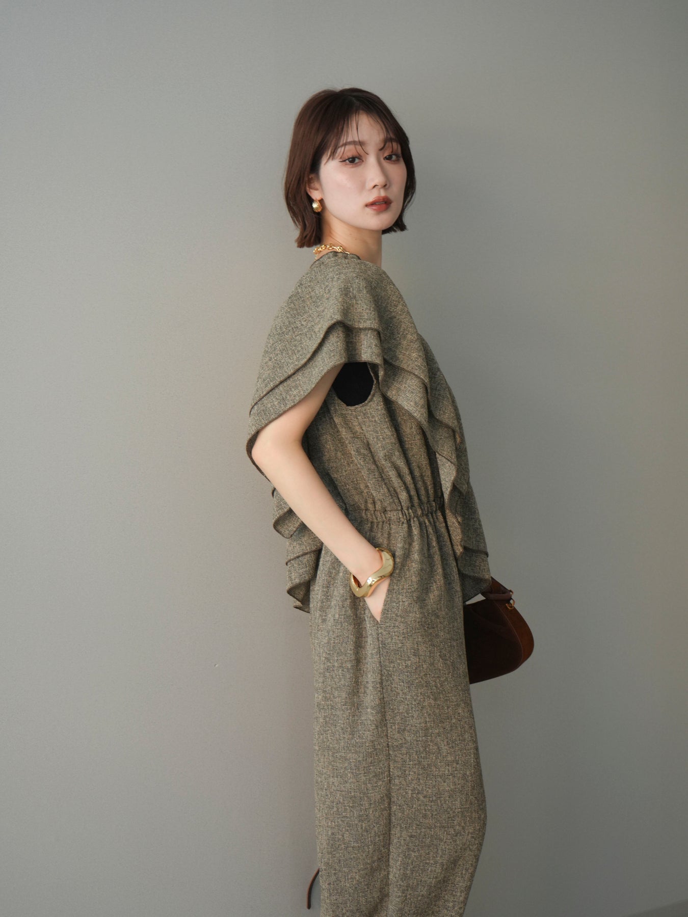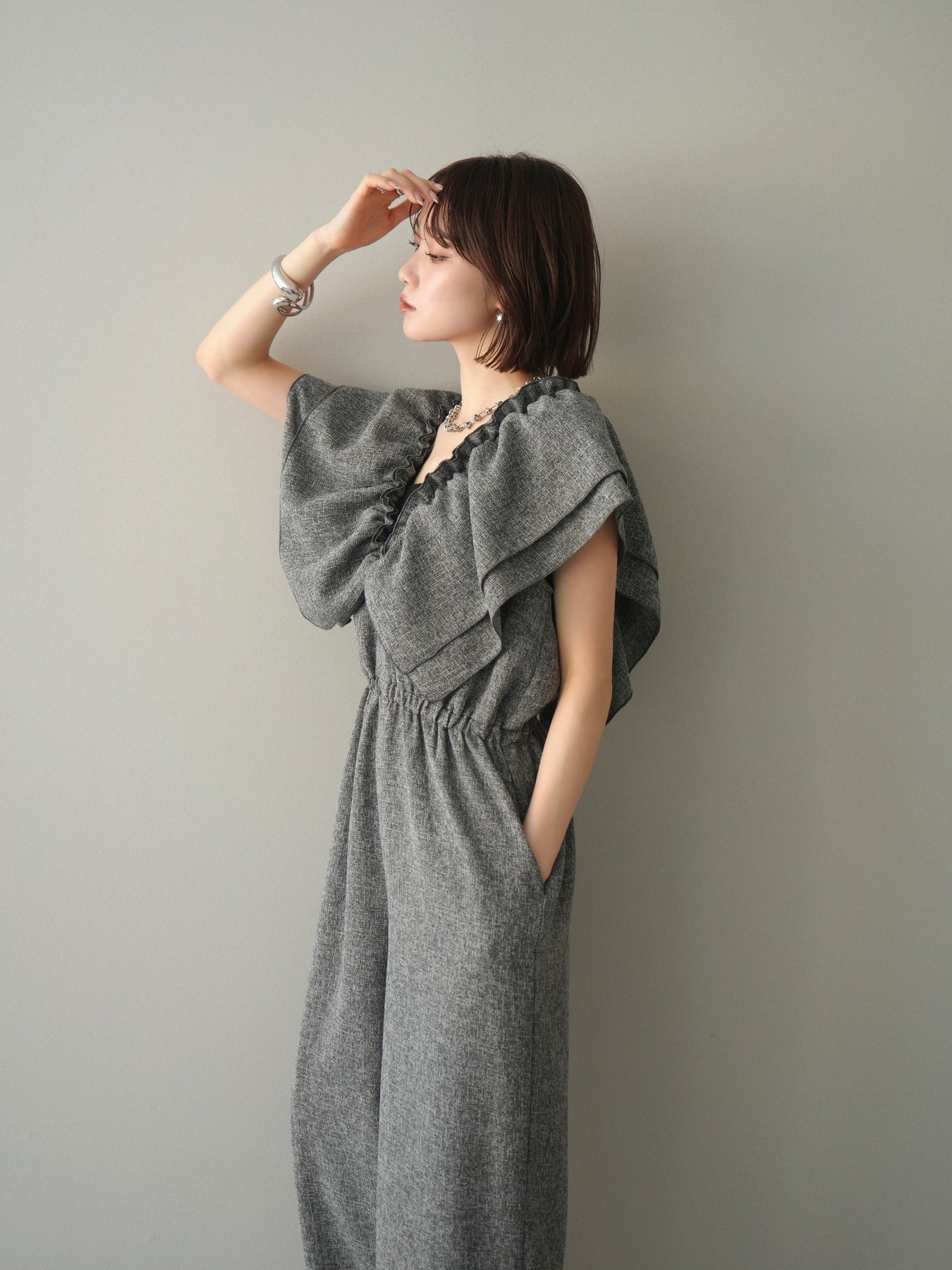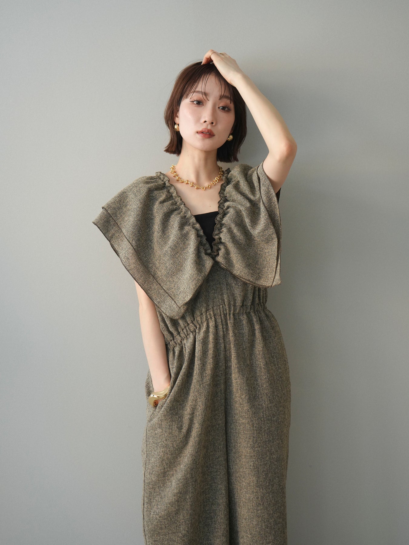 ミックス感のあるツイード素材を使用し、奥行きのある表情と上品さを兼ね備えたオールインワン。ウエスト部分に施したギャザーデザインが自然なメリハリを生み、スタイルアップを叶えながらもリラックスした着心地を実現します。前後で印象を変えられる3WAY仕様で、着こなし次第で雰囲気を自在にアレンジできるのも魅力。インナー合わせでシーズンレスに活躍し、きれいめからカジュアルまで幅広いスタイリングに対応する、存在感のある一着です。