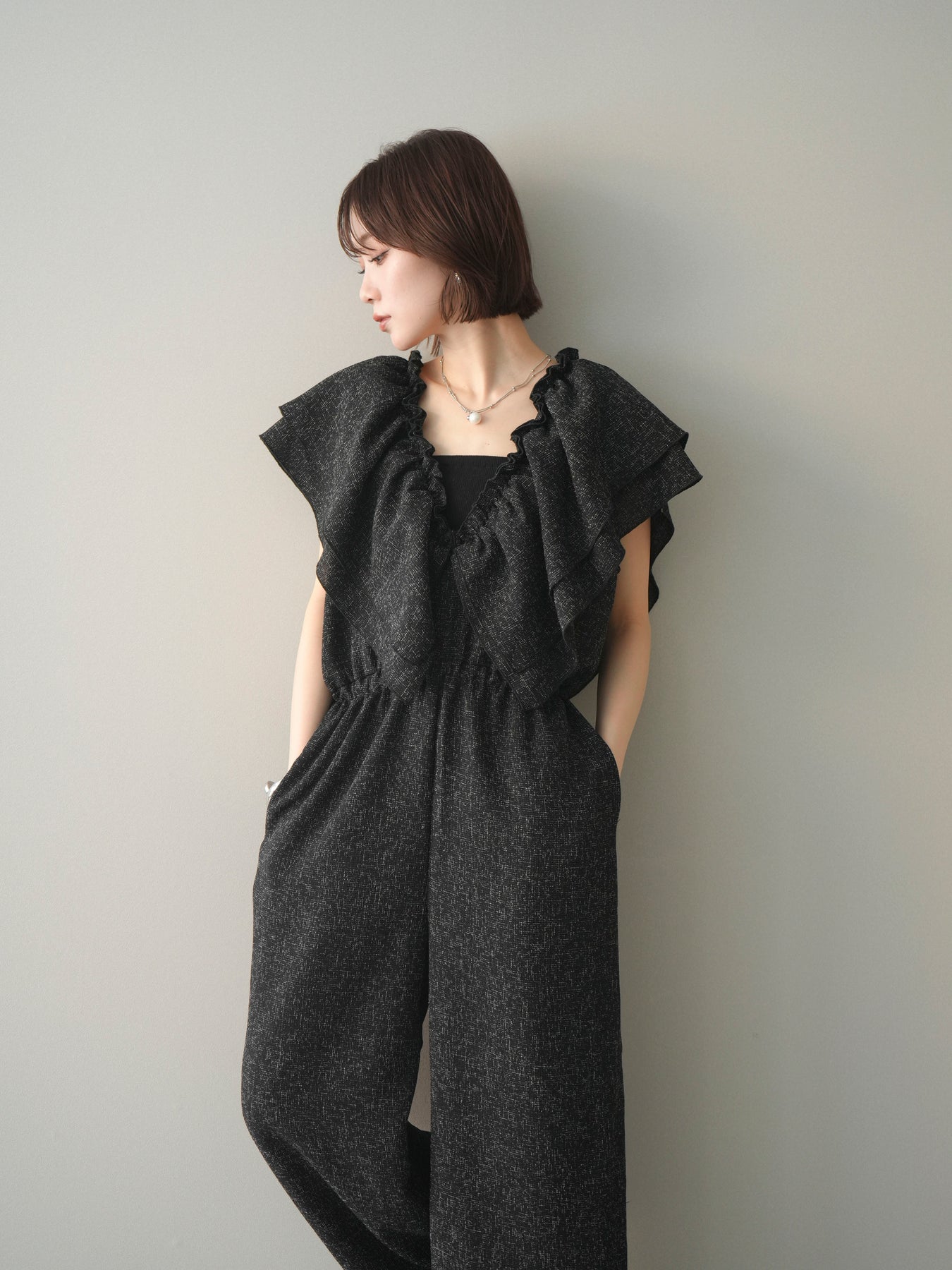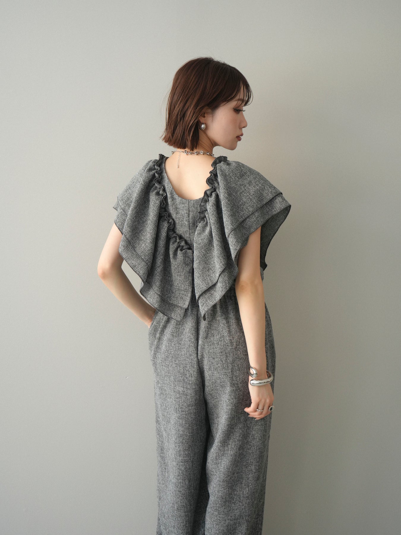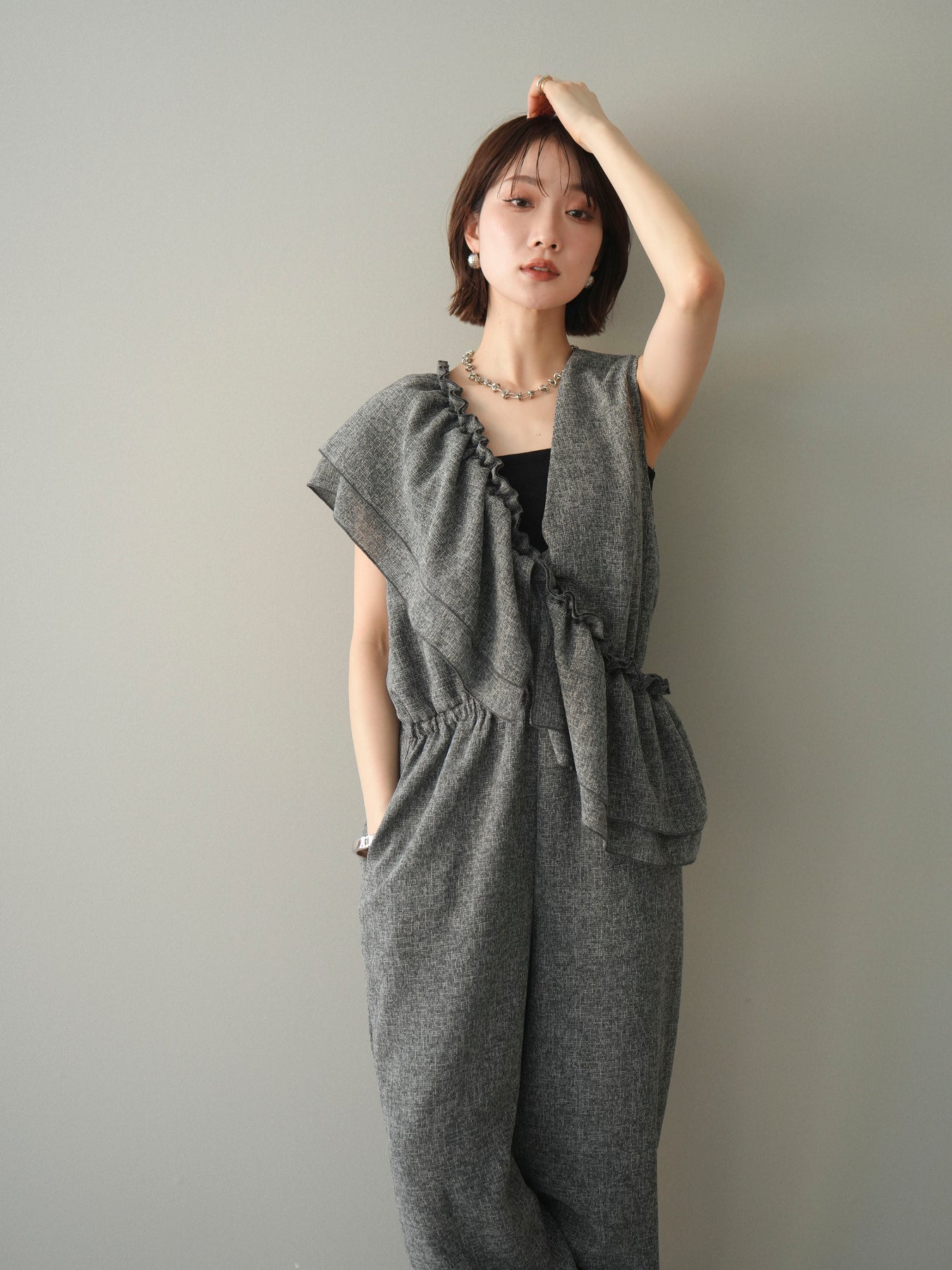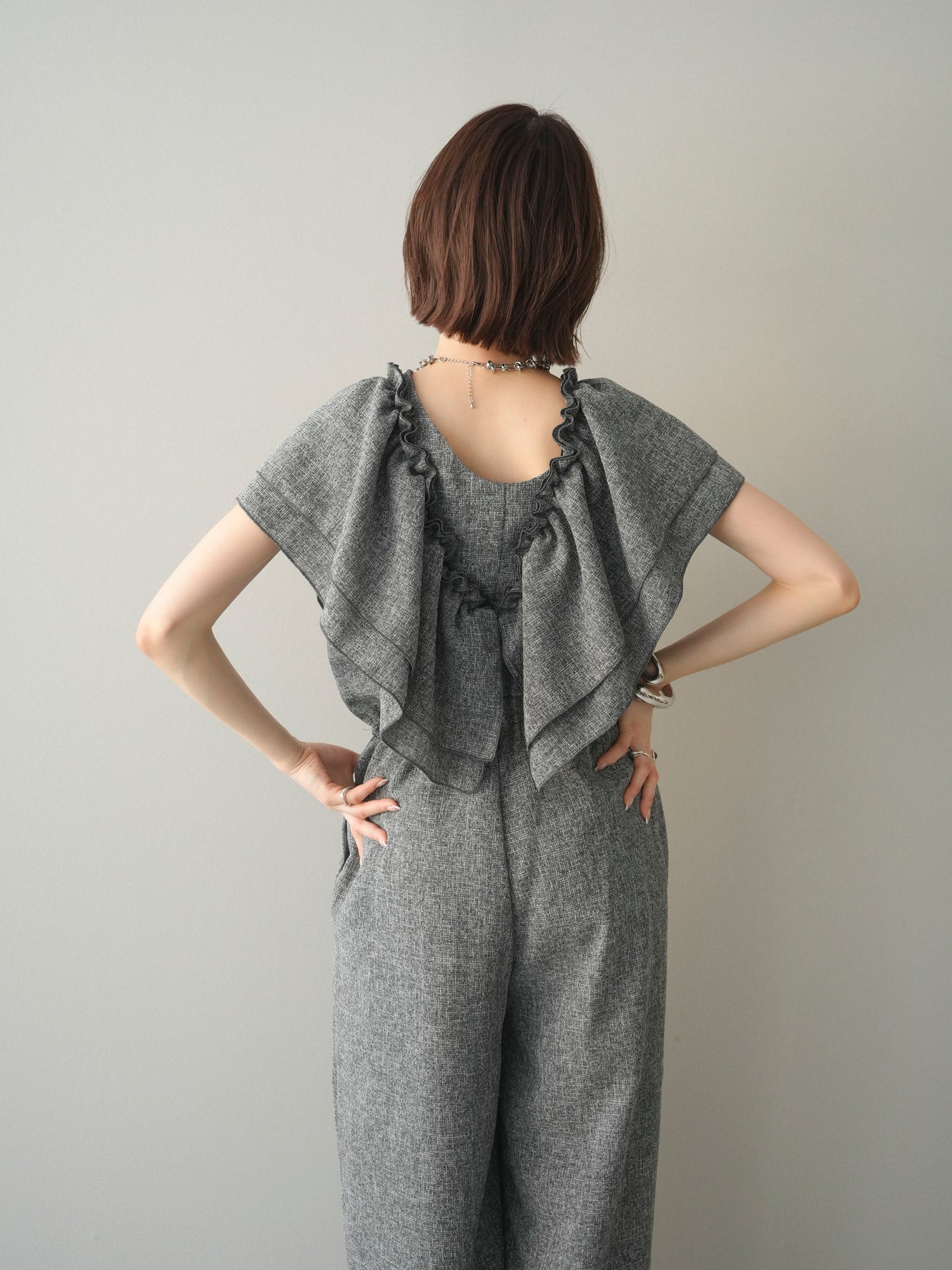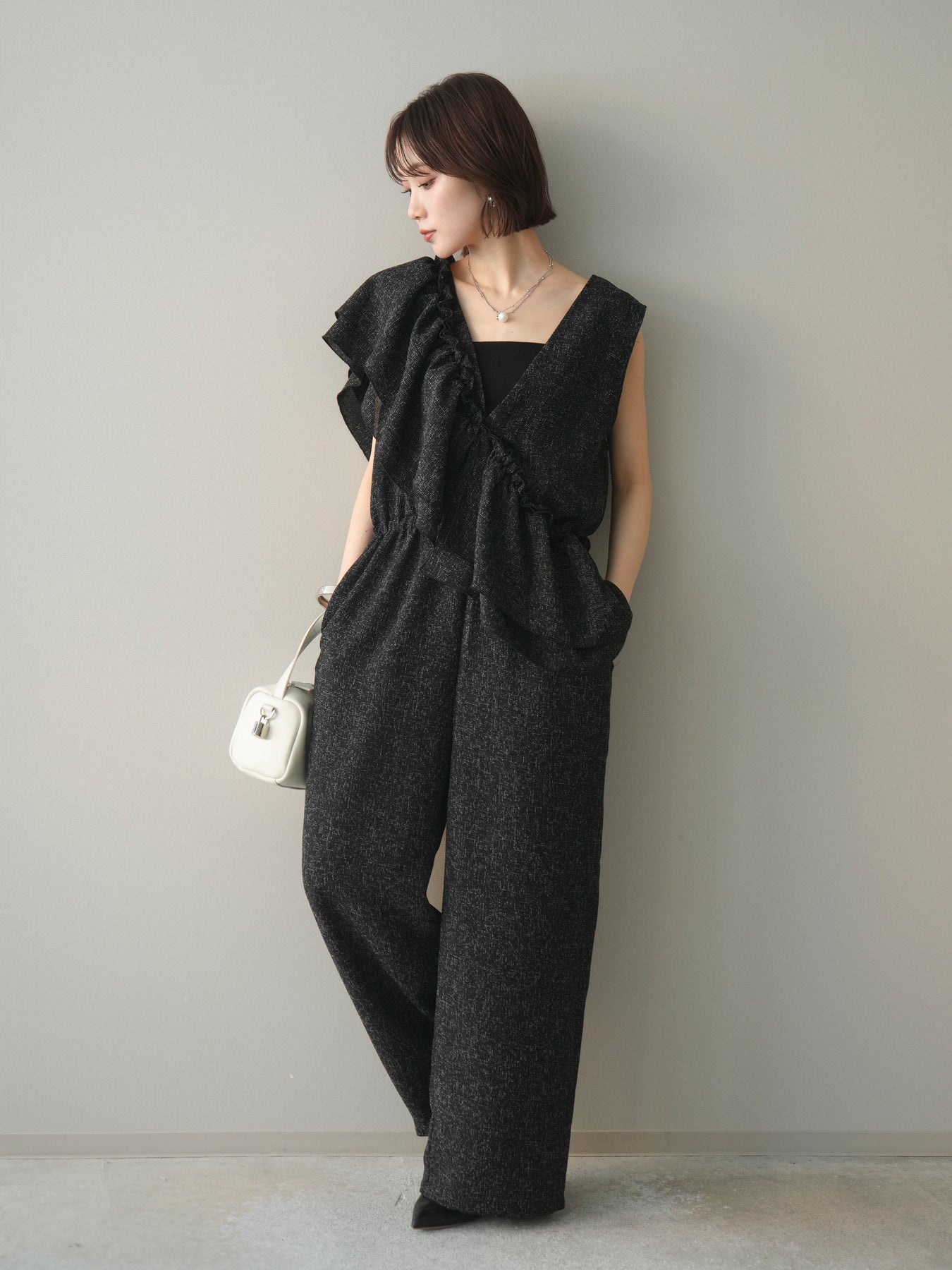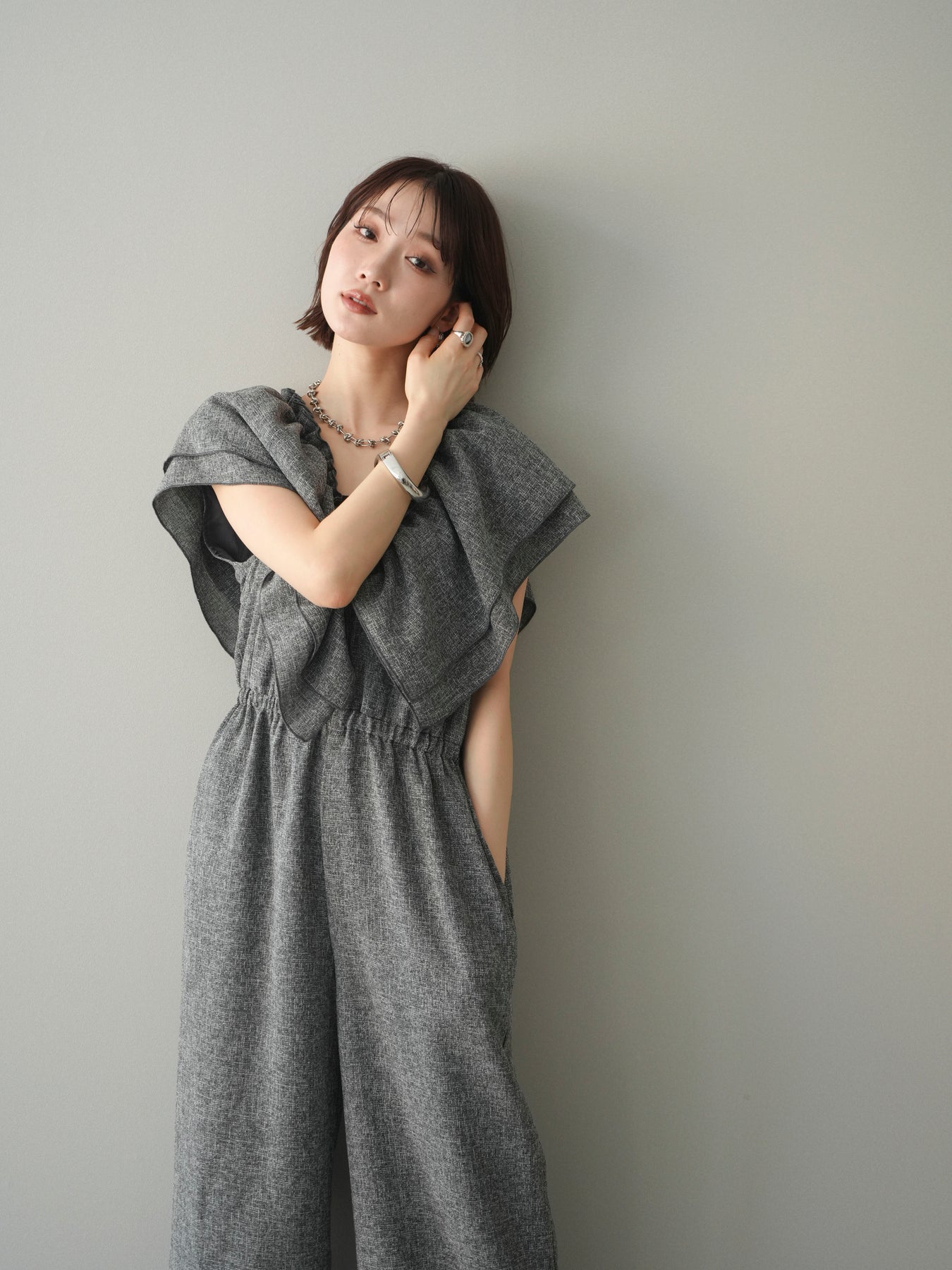 ミックス感のあるツイード素材を使用し、奥行きのある表情と上品さを兼ね備えたオールインワン。ウエスト部分に施したギャザーデザインが自然なメリハリを生み、スタイルアップを叶えながらもリラックスした着心地を実現します。前後で印象を変えられる3WAY仕様で、着こなし次第で雰囲気を自在にアレンジできるのも魅力。インナー合わせでシーズンレスに活躍し、きれいめからカジュアルまで幅広いスタイリングに対応する、存在感のある一着です。