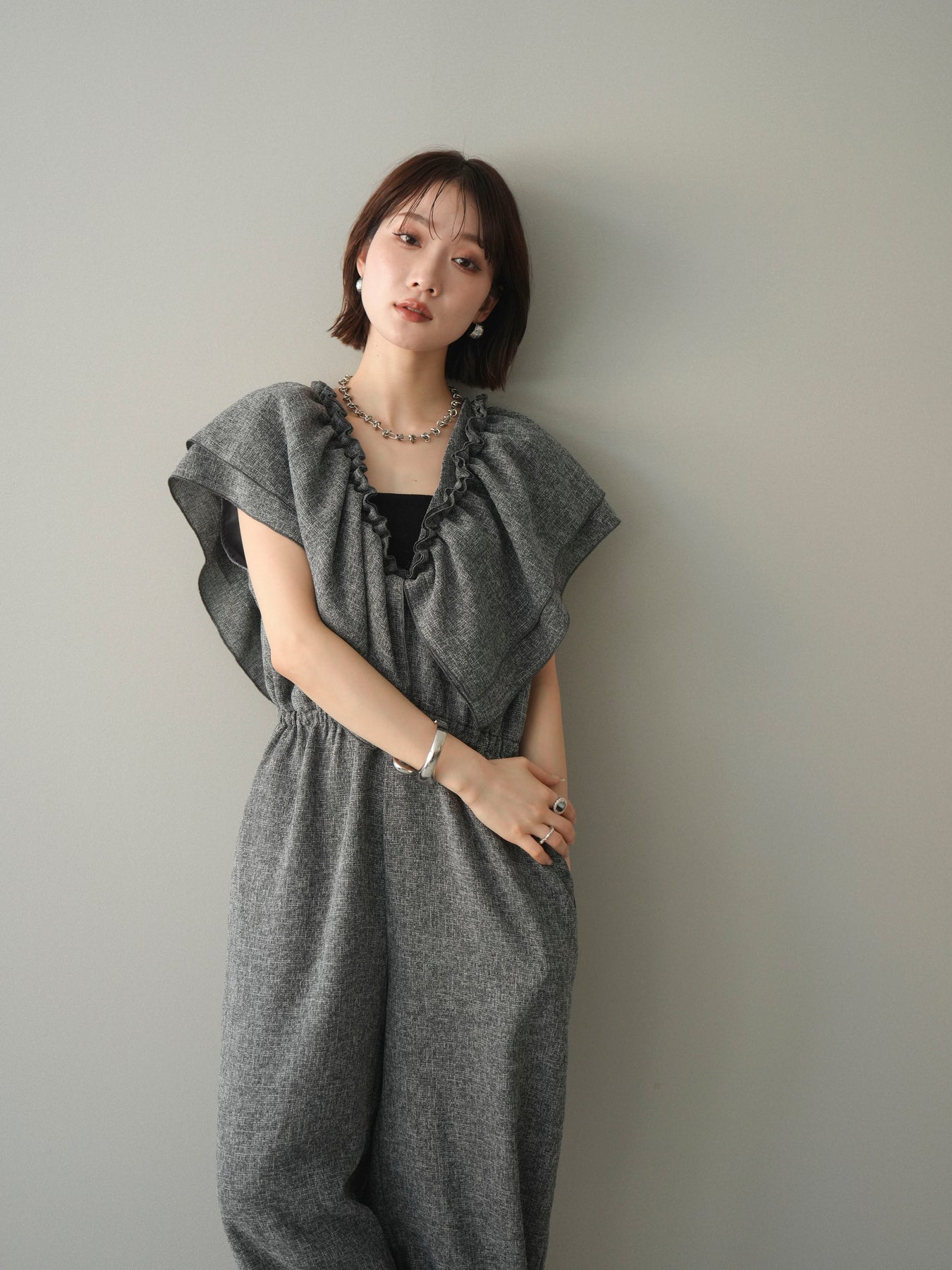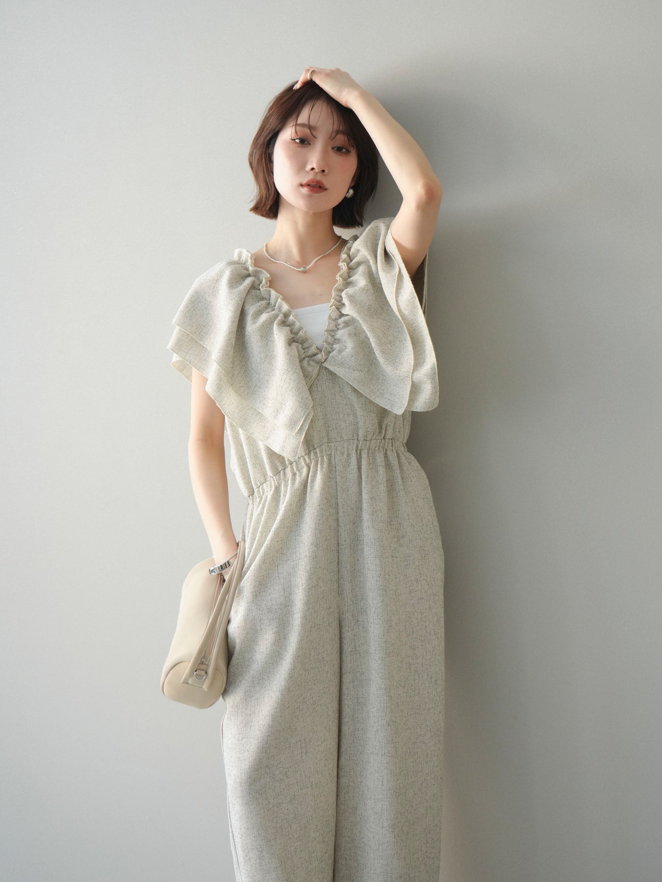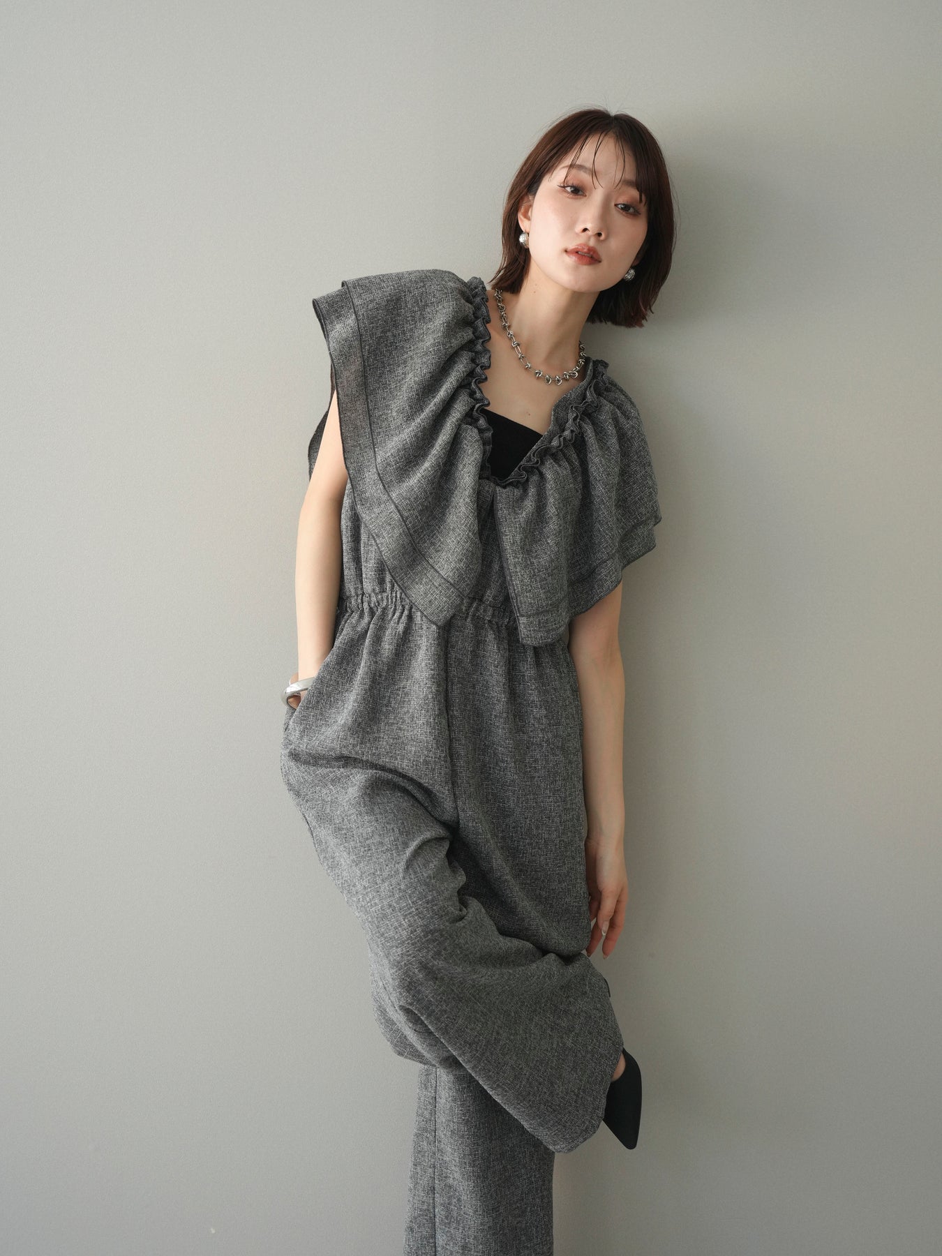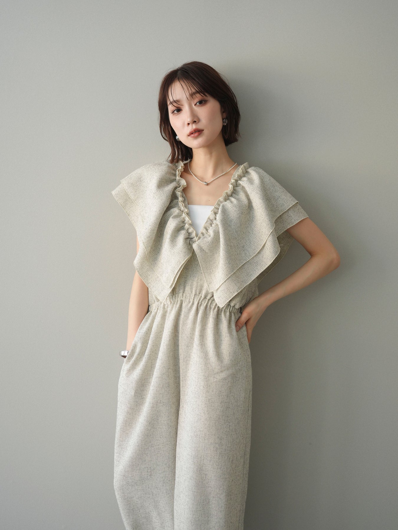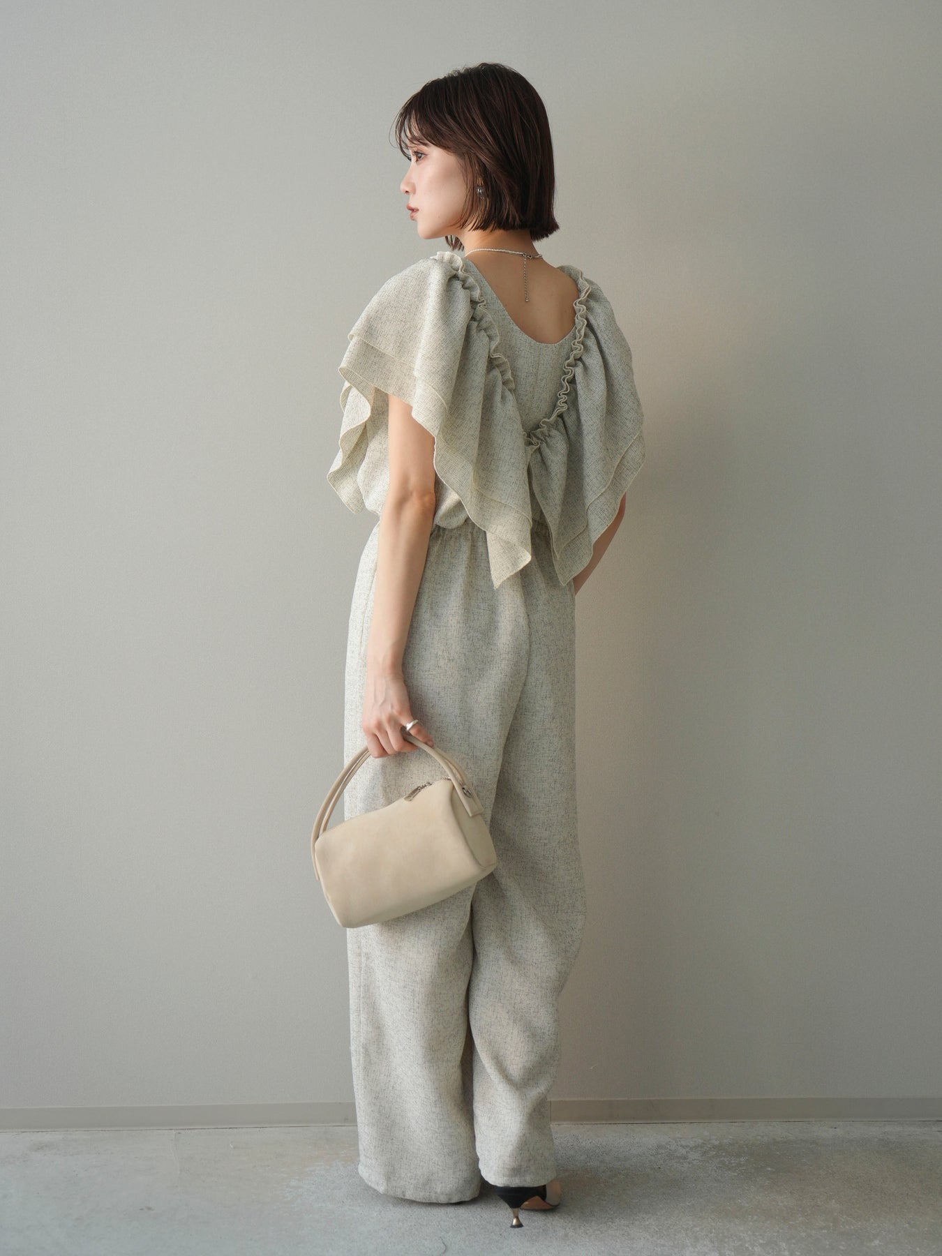 ミックス感のあるツイード素材を使用し、奥行きのある表情と上品さを兼ね備えたオールインワン。ウエスト部分に施したギャザーデザインが自然なメリハリを生み、スタイルアップを叶えながらもリラックスした着心地を実現します。前後で印象を変えられる3WAY仕様で、着こなし次第で雰囲気を自在にアレンジできるのも魅力。インナー合わせでシーズンレスに活躍し、きれいめからカジュアルまで幅広いスタイリングに対応する、存在感のある一着です。