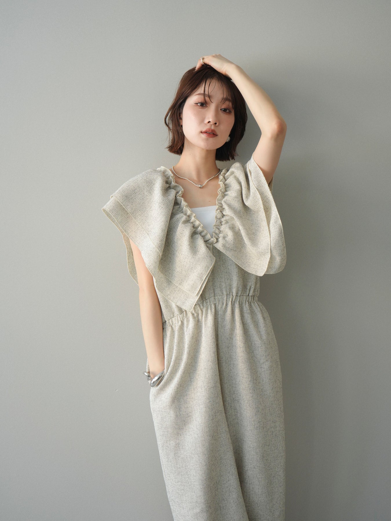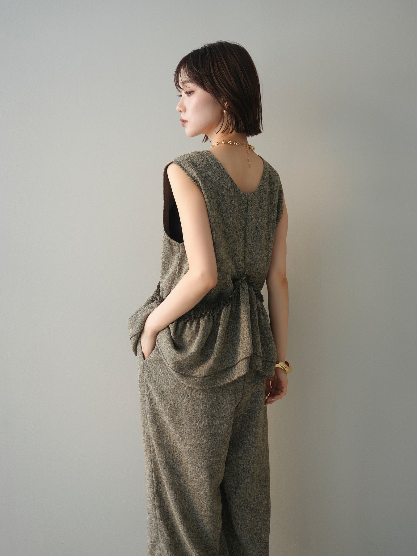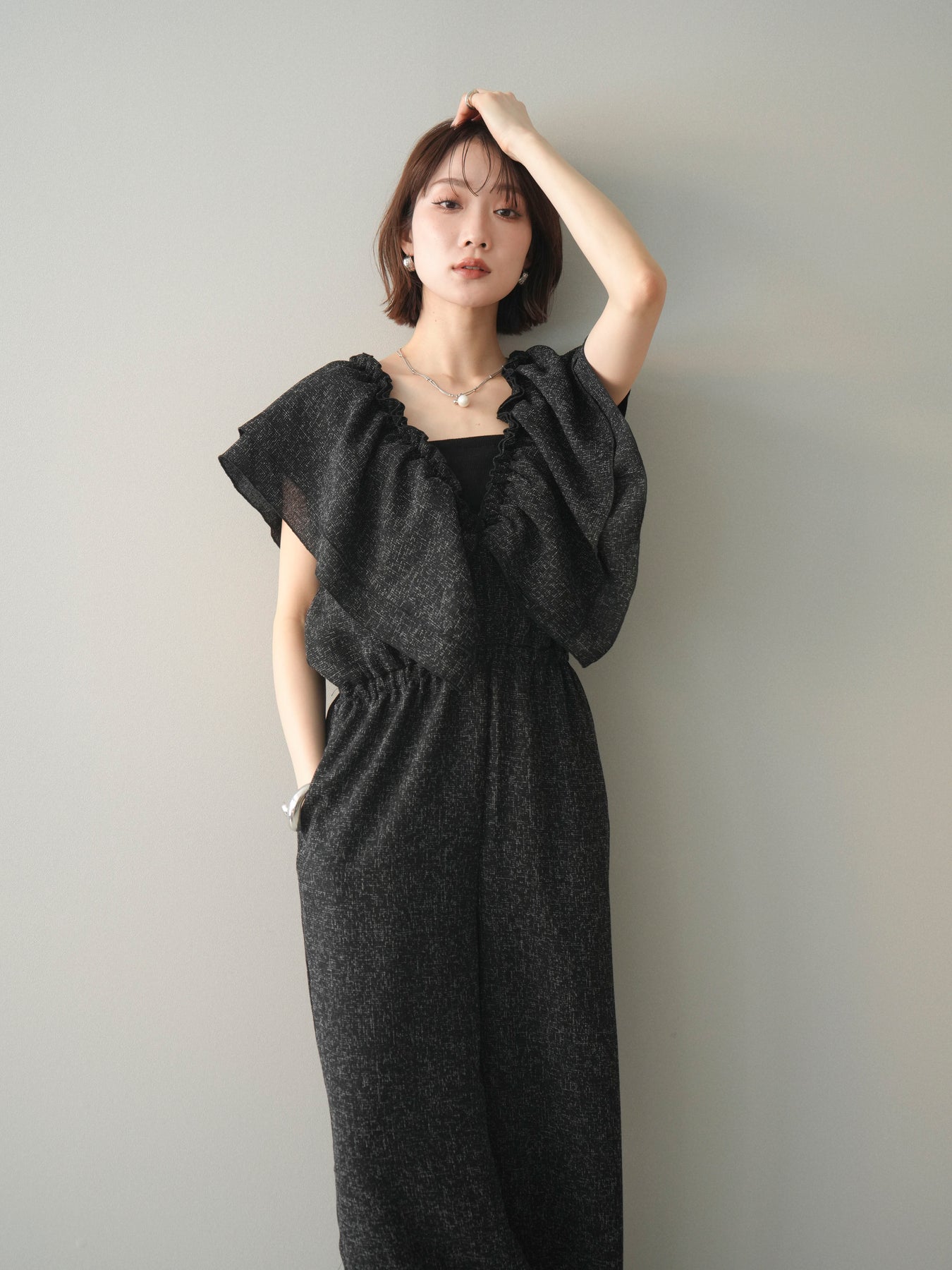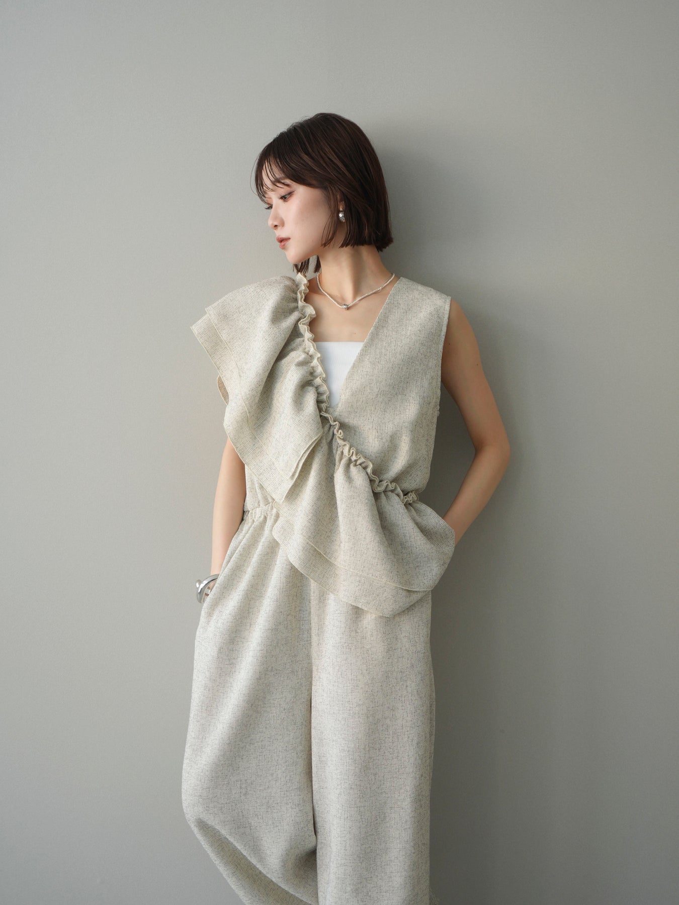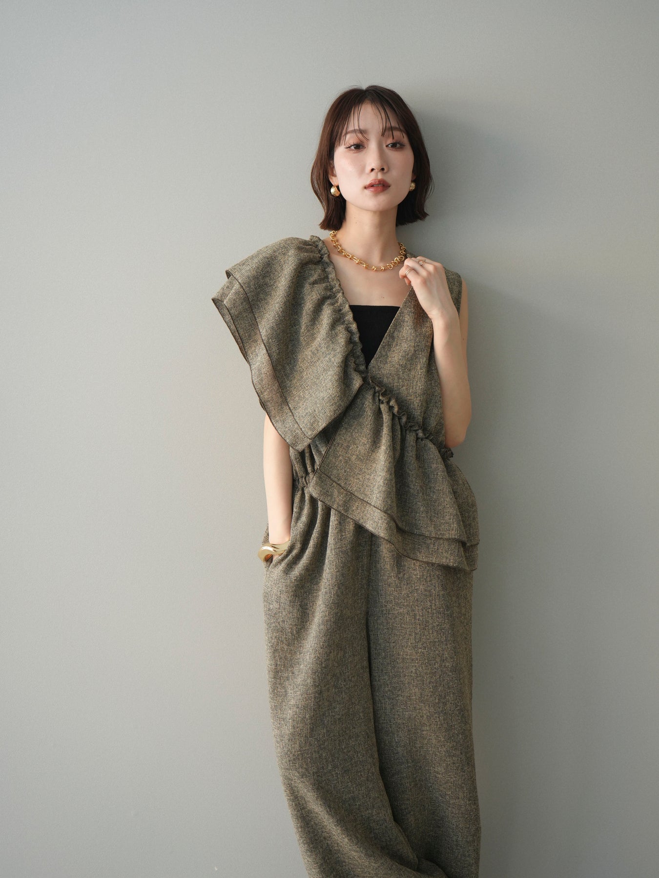 ミックス感のあるツイード素材を使用し、奥行きのある表情と上品さを兼ね備えたオールインワン。ウエスト部分に施したギャザーデザインが自然なメリハリを生み、スタイルアップを叶えながらもリラックスした着心地を実現します。前後で印象を変えられる3WAY仕様で、着こなし次第で雰囲気を自在にアレンジできるのも魅力。インナー合わせでシーズンレスに活躍し、きれいめからカジュアルまで幅広いスタイリングに対応する、存在感のある一着です。