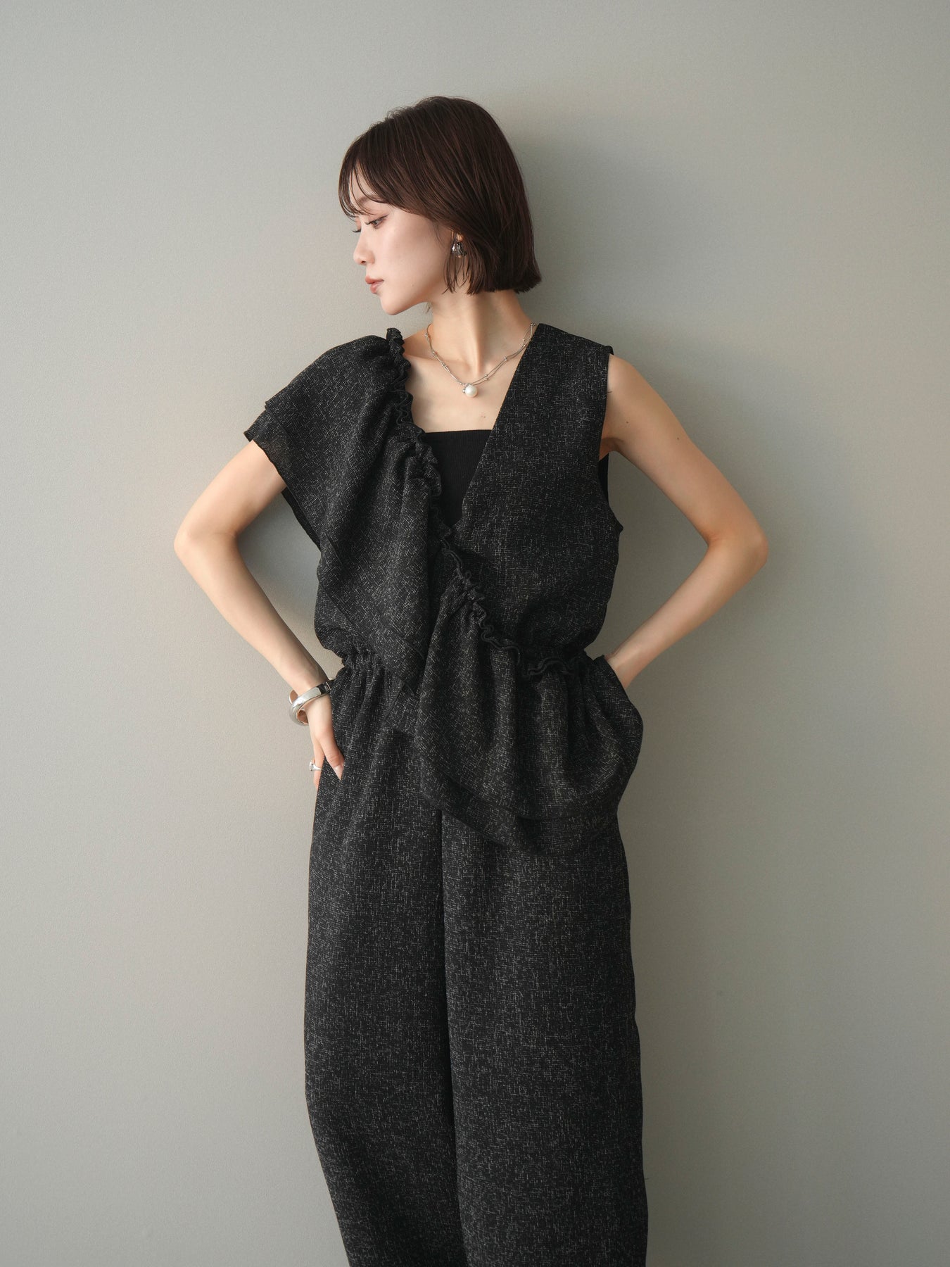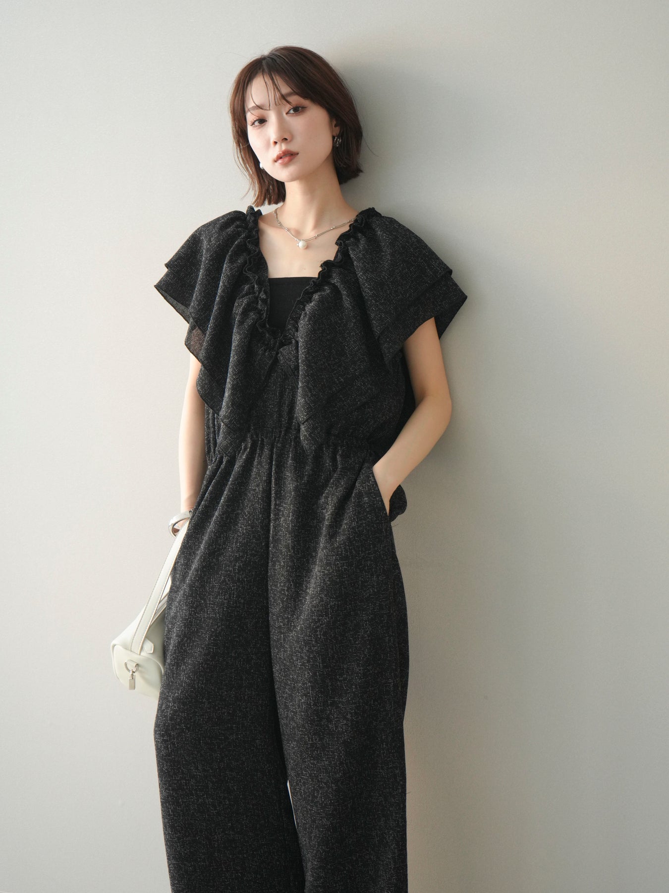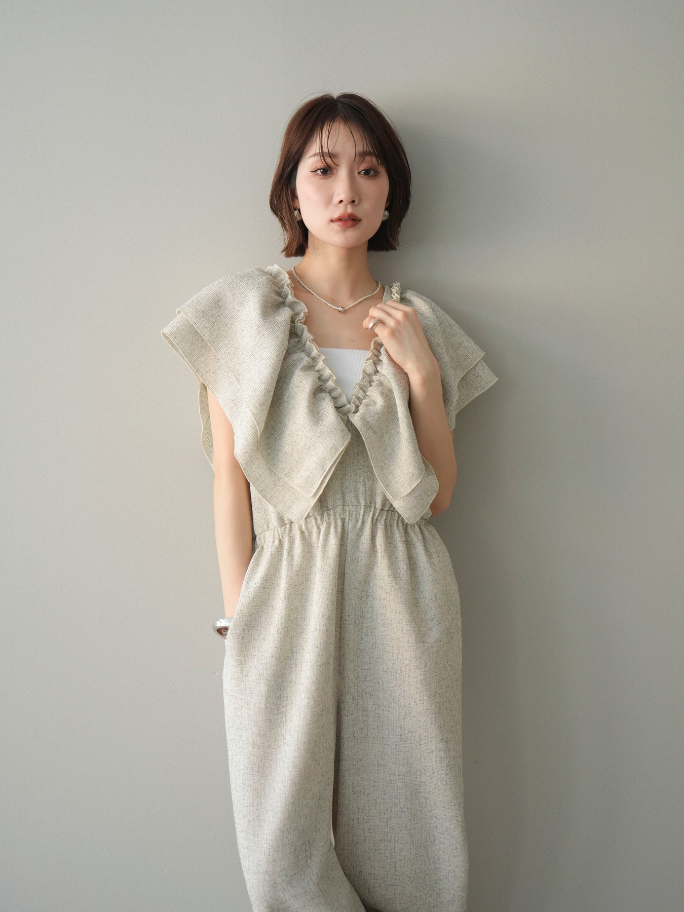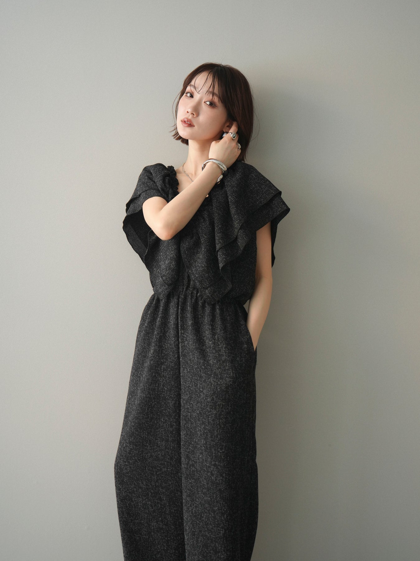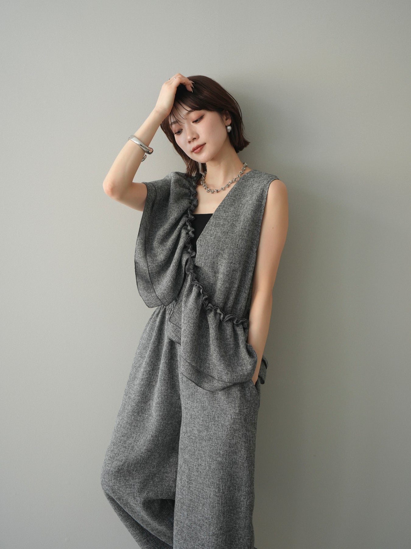 ミックス感のあるツイード素材を使用し、奥行きのある表情と上品さを兼ね備えたオールインワン。ウエスト部分に施したギャザーデザインが自然なメリハリを生み、スタイルアップを叶えながらもリラックスした着心地を実現します。前後で印象を変えられる3WAY仕様で、着こなし次第で雰囲気を自在にアレンジできるのも魅力。インナー合わせでシーズンレスに活躍し、きれいめからカジュアルまで幅広いスタイリングに対応する、存在感のある一着です。