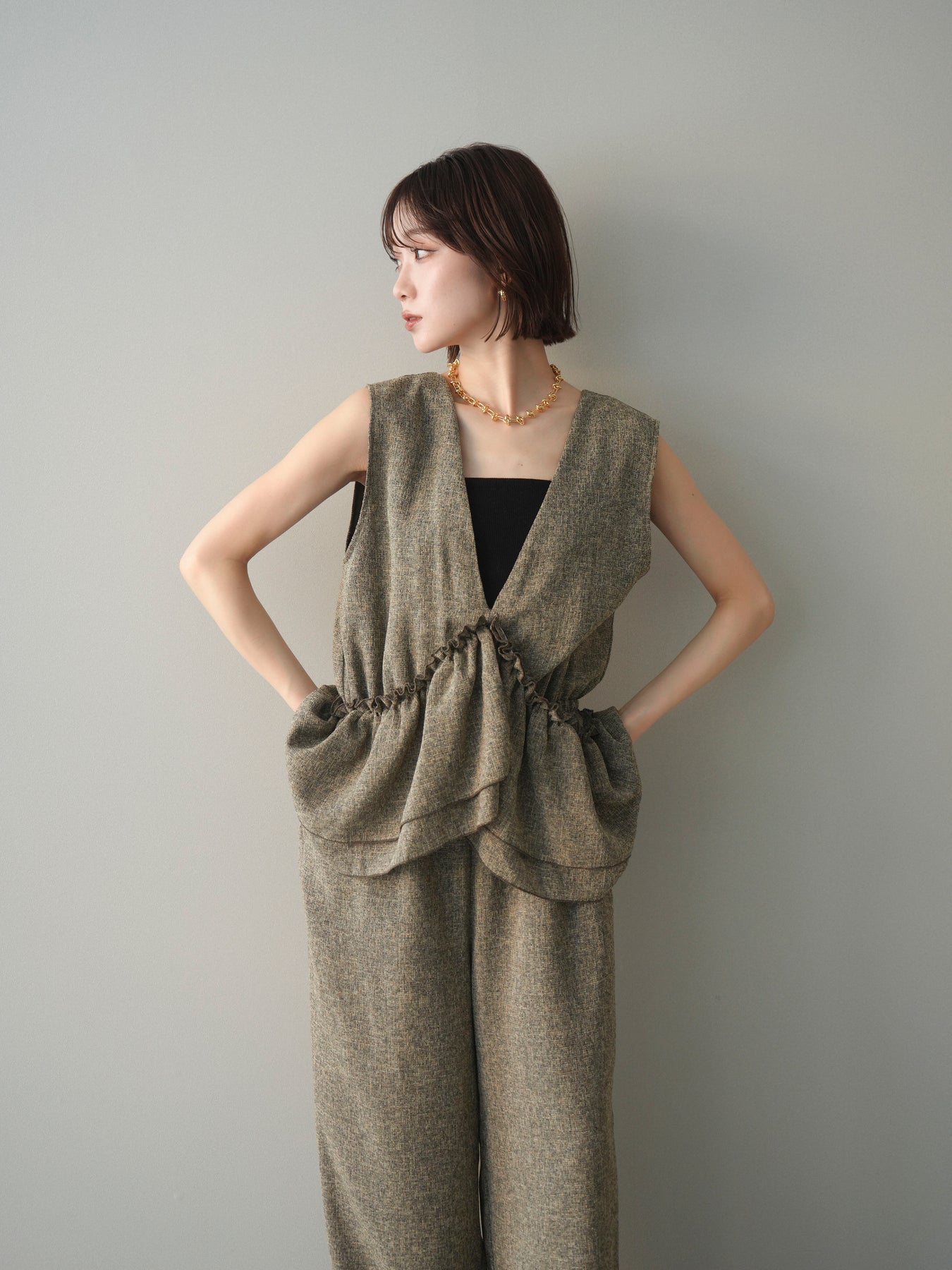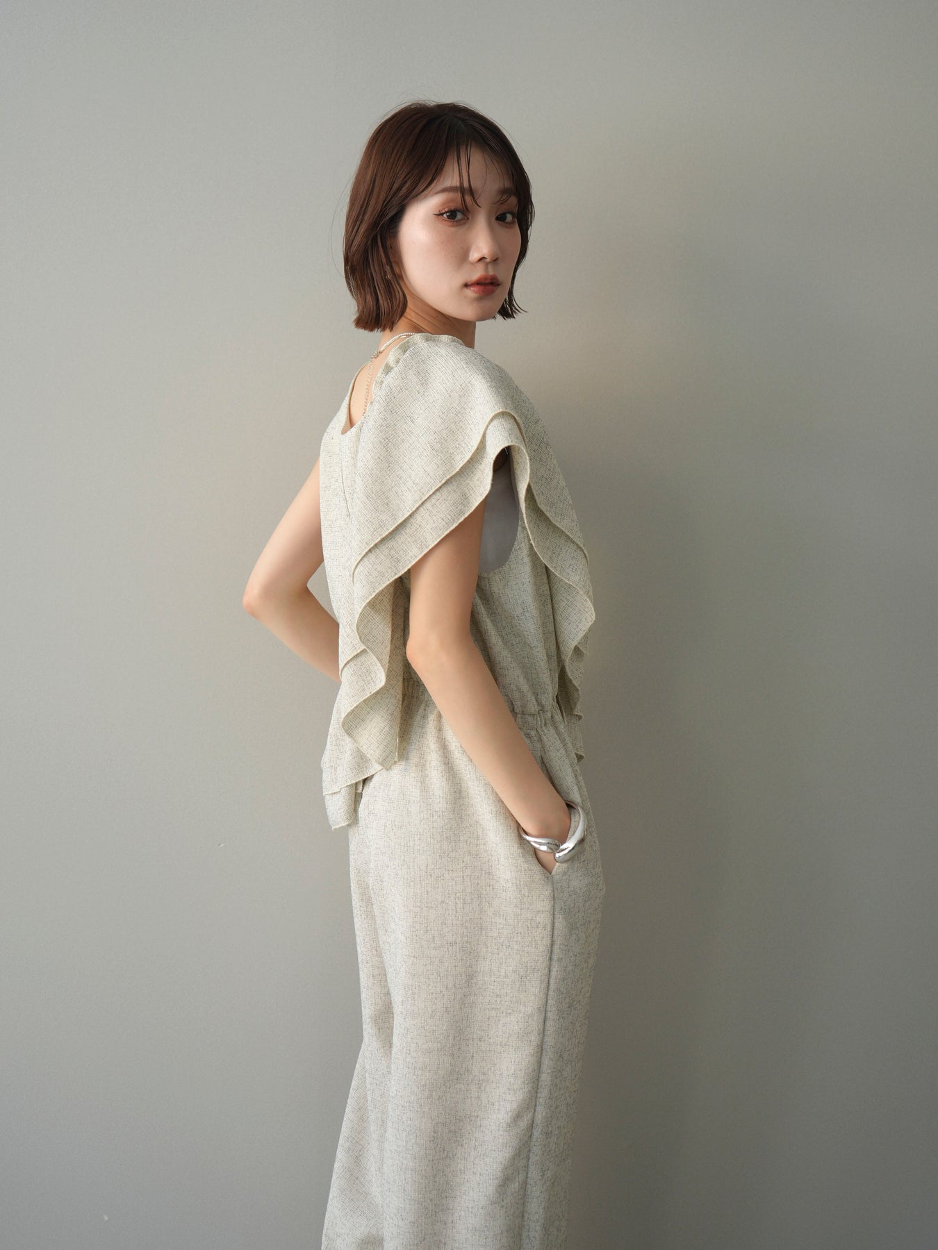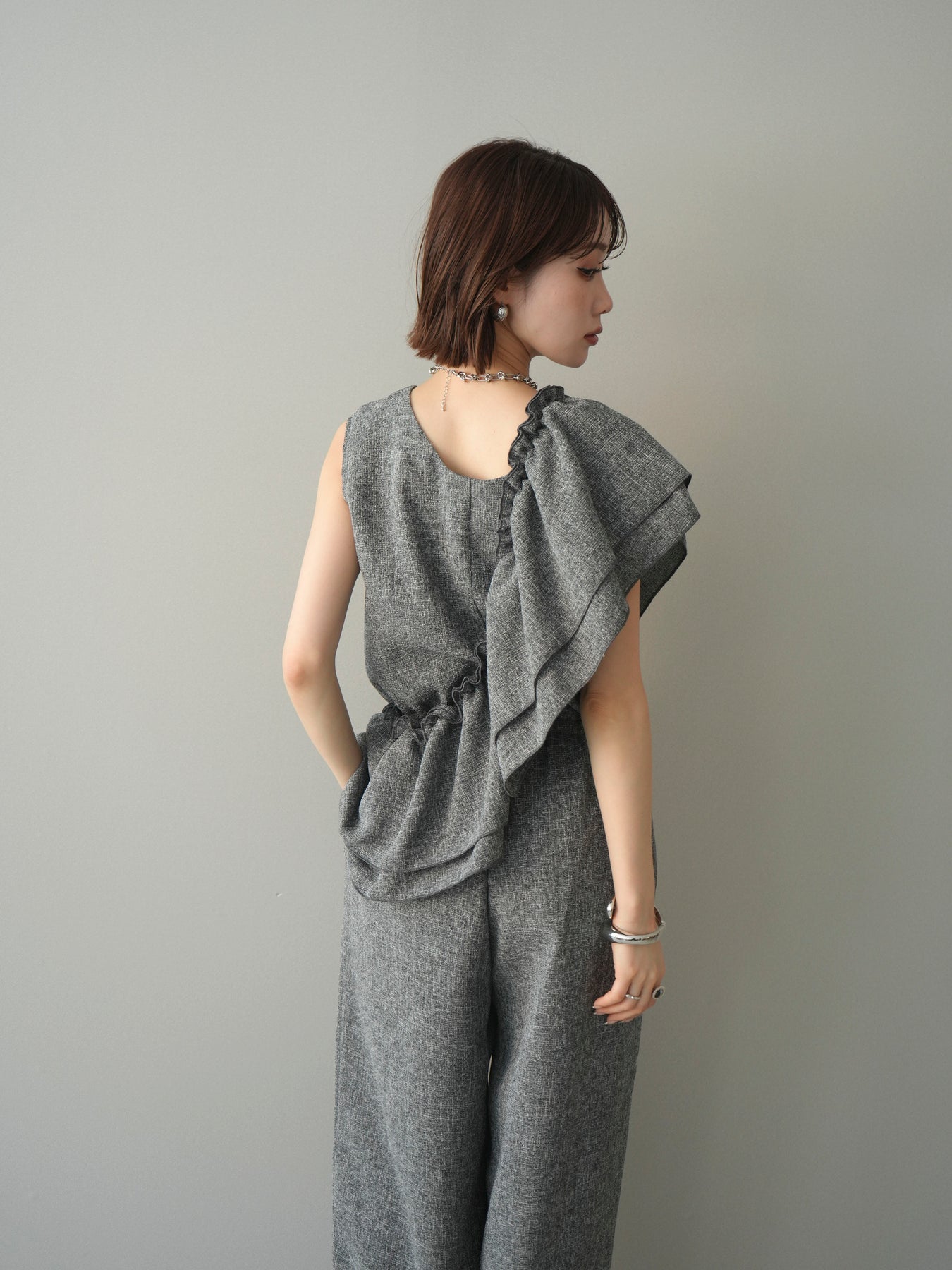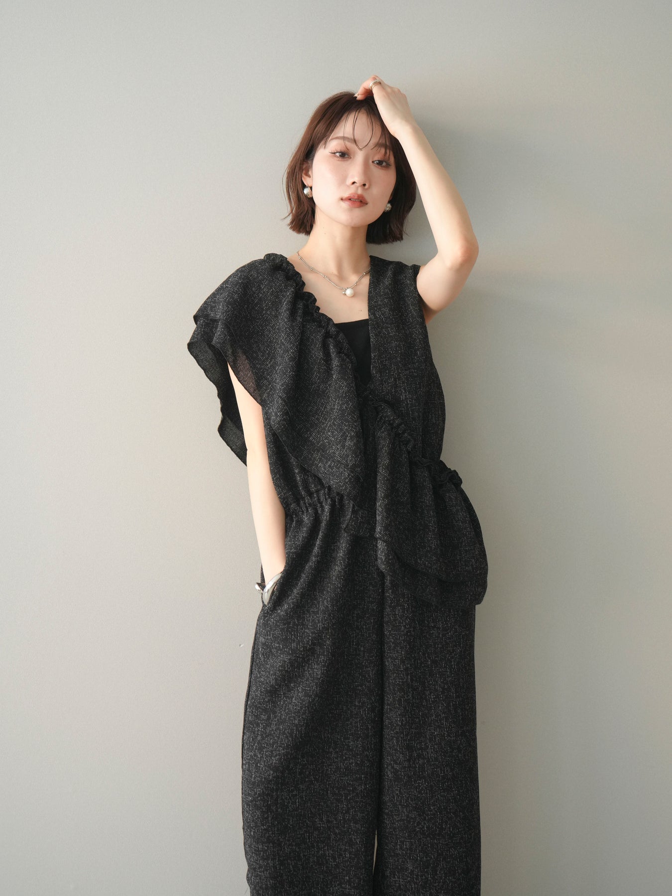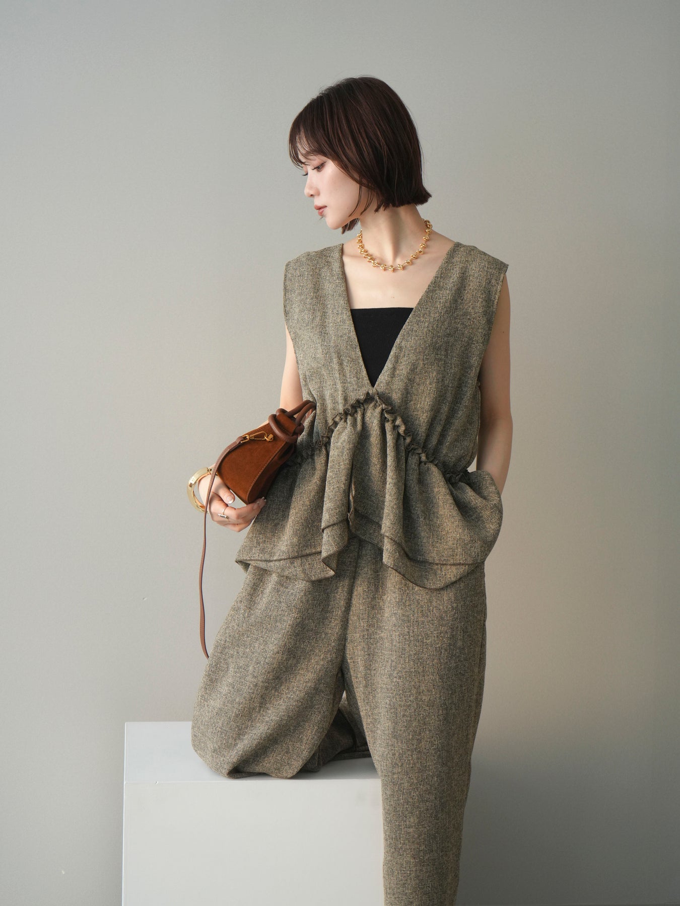 ミックス感のあるツイード素材を使用し、奥行きのある表情と上品さを兼ね備えたオールインワン。ウエスト部分に施したギャザーデザインが自然なメリハリを生み、スタイルアップを叶えながらもリラックスした着心地を実現します。前後で印象を変えられる3WAY仕様で、着こなし次第で雰囲気を自在にアレンジできるのも魅力。インナー合わせでシーズンレスに活躍し、きれいめからカジュアルまで幅広いスタイリングに対応する、存在感のある一着です。
