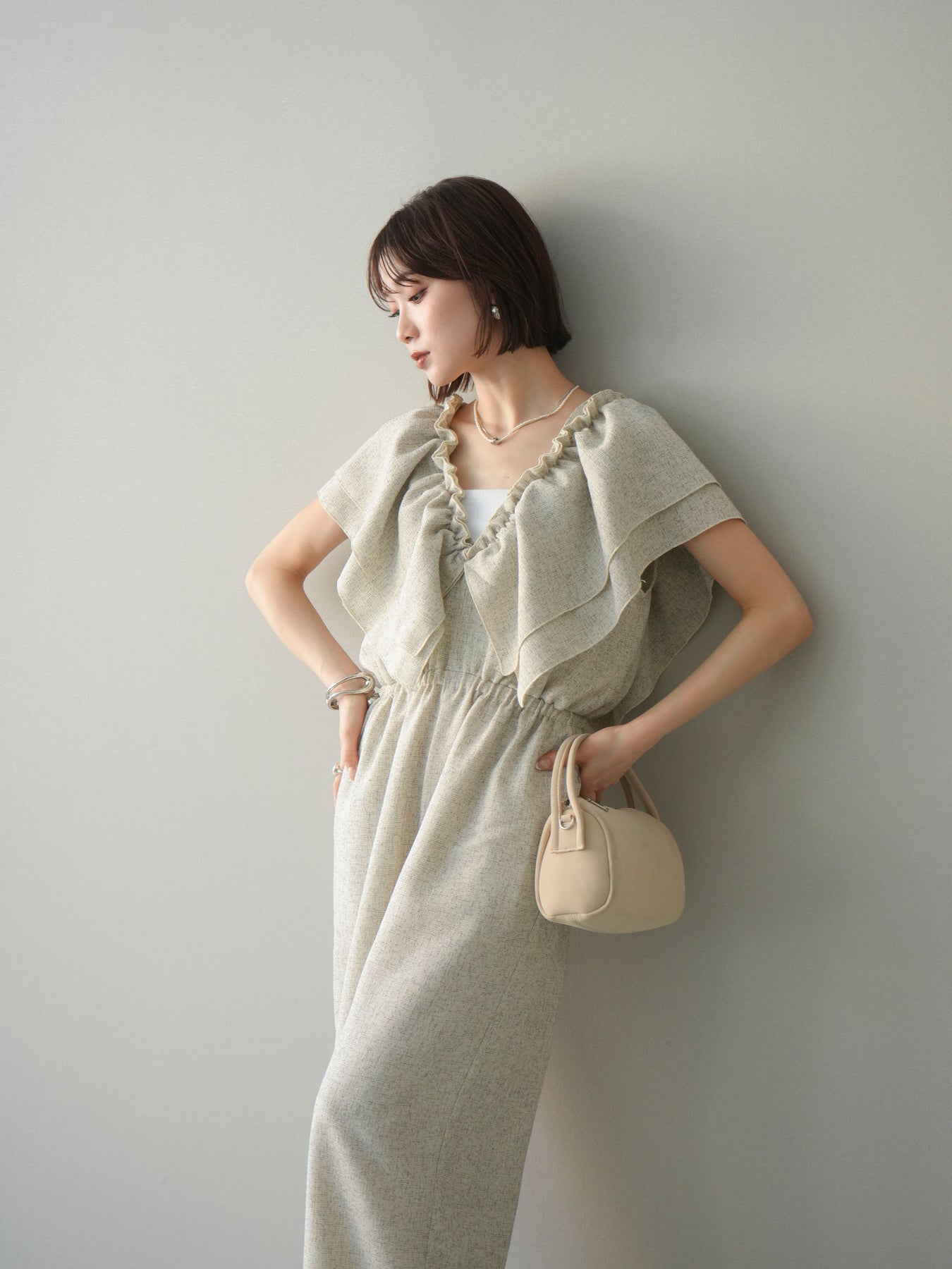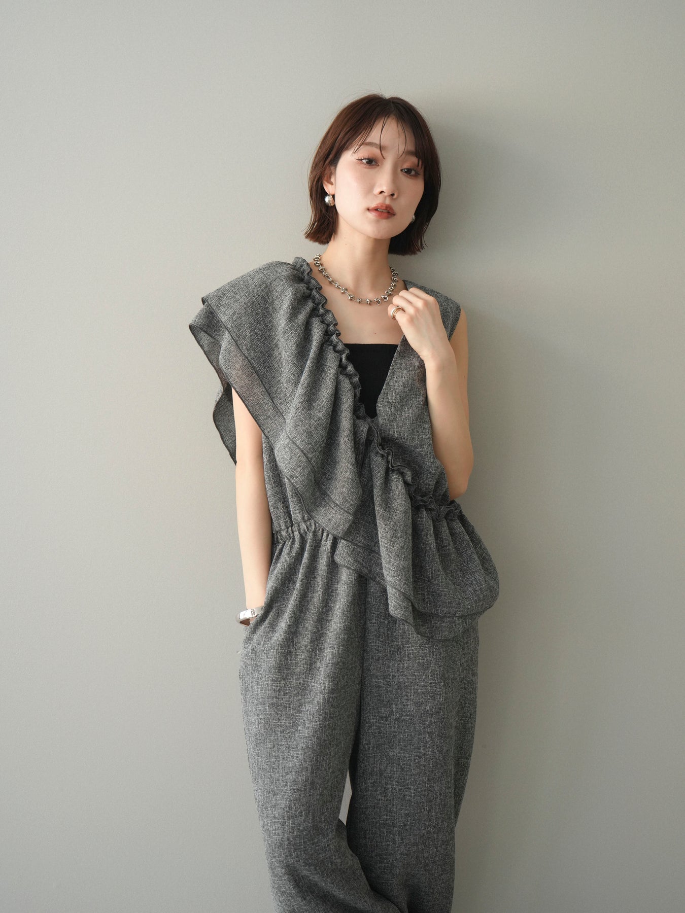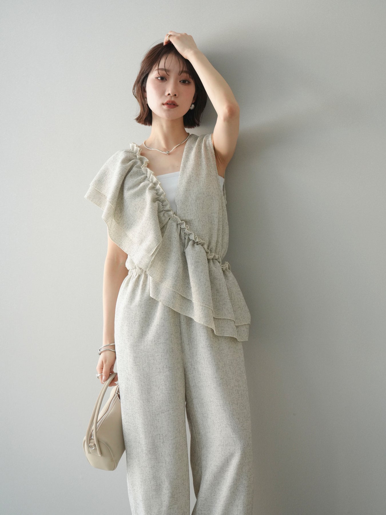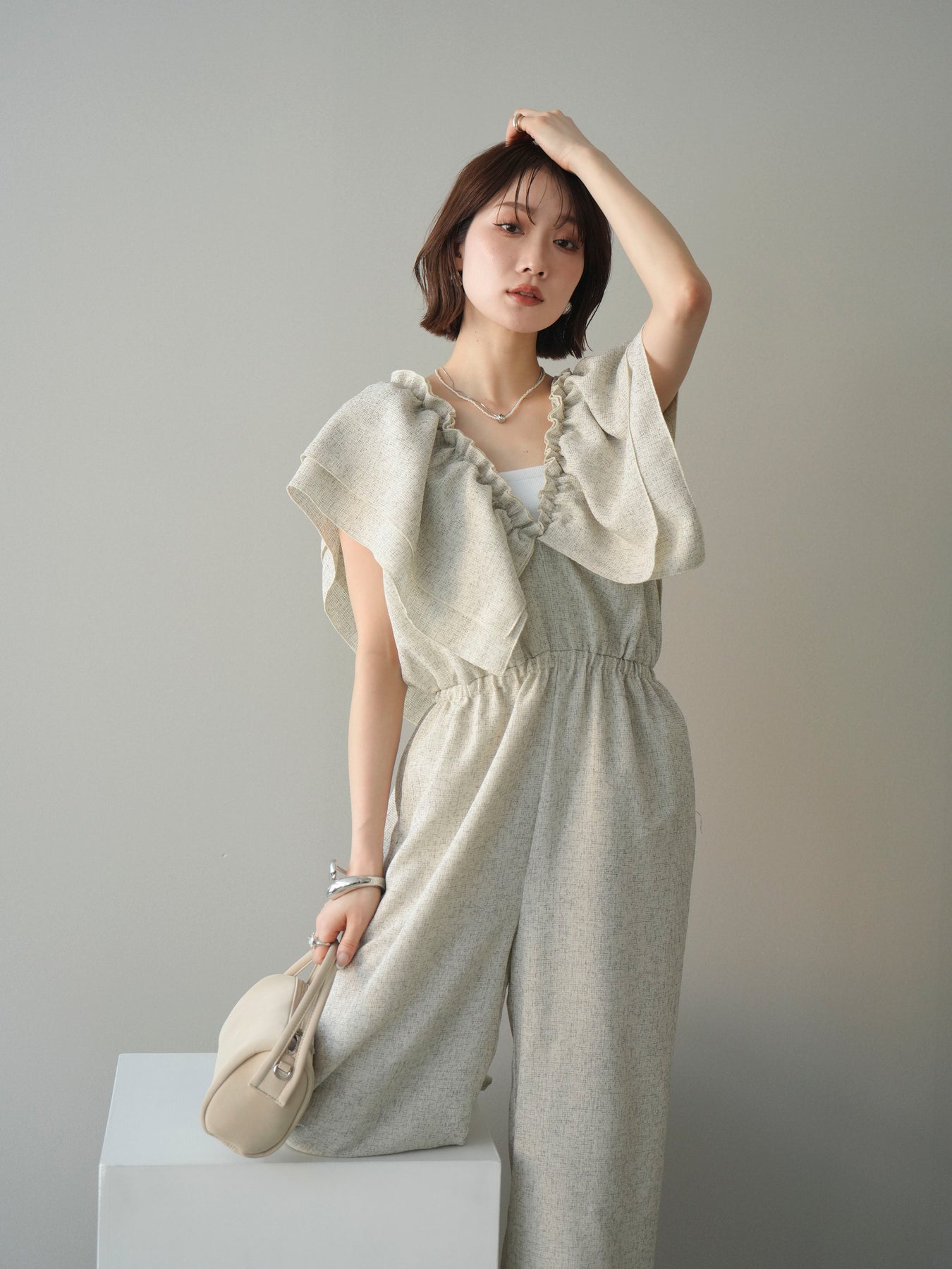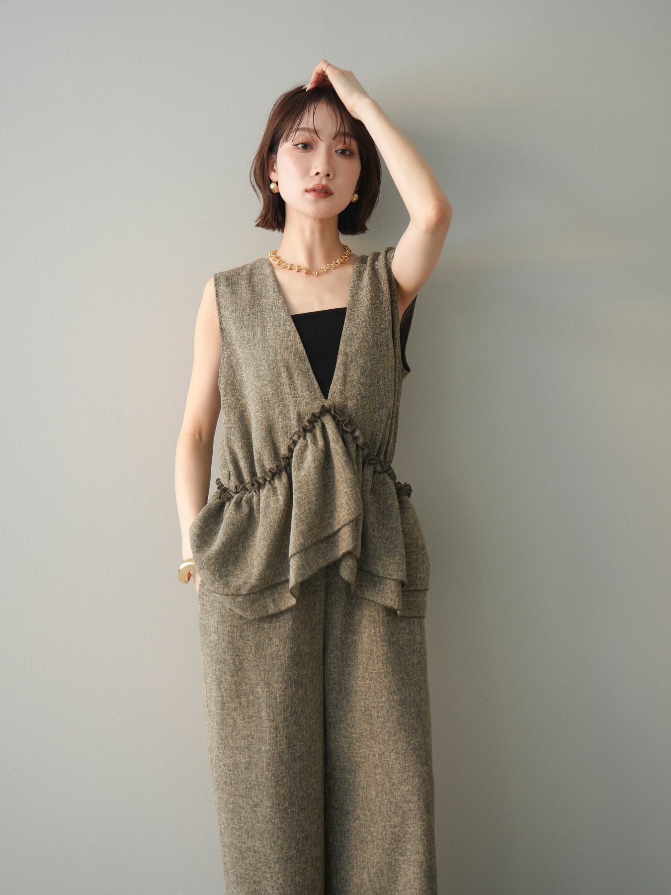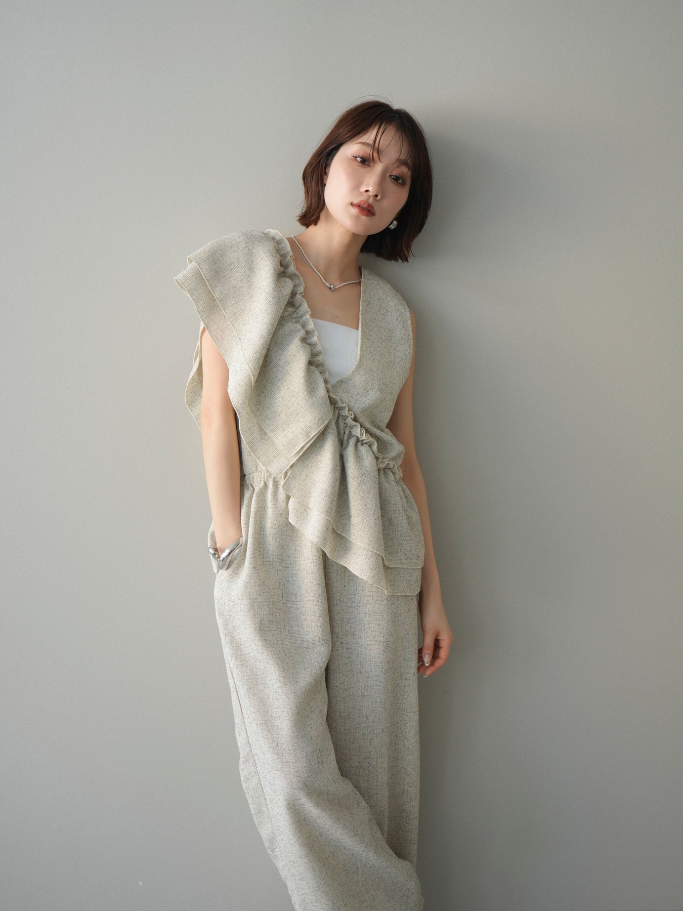 ミックス感のあるツイード素材を使用し、奥行きのある表情と上品さを兼ね備えたオールインワン。ウエスト部分に施したギャザーデザインが自然なメリハリを生み、スタイルアップを叶えながらもリラックスした着心地を実現します。前後で印象を変えられる3WAY仕様で、着こなし次第で雰囲気を自在にアレンジできるのも魅力。インナー合わせでシーズンレスに活躍し、きれいめからカジュアルまで幅広いスタイリングに対応する、存在感のある一着です。