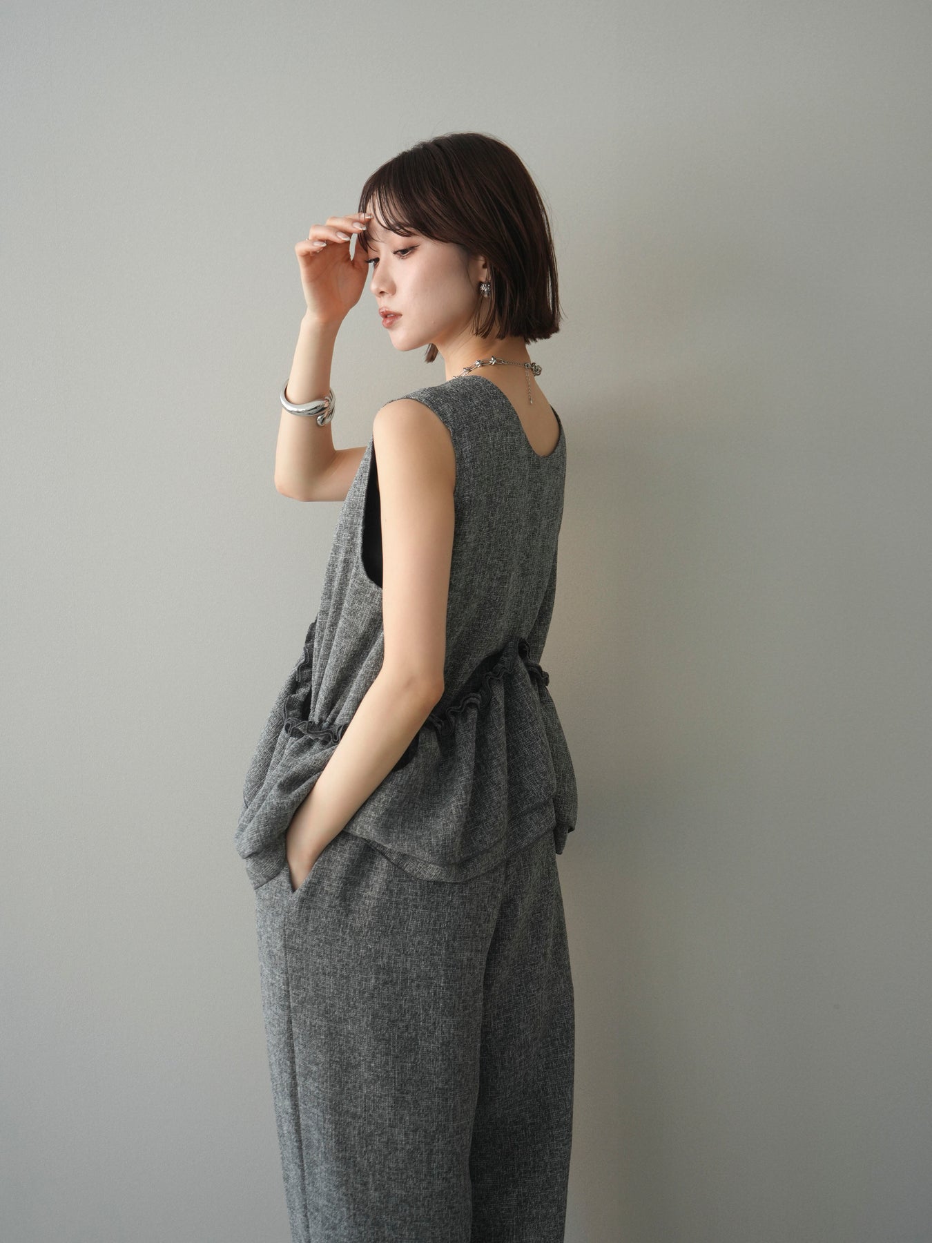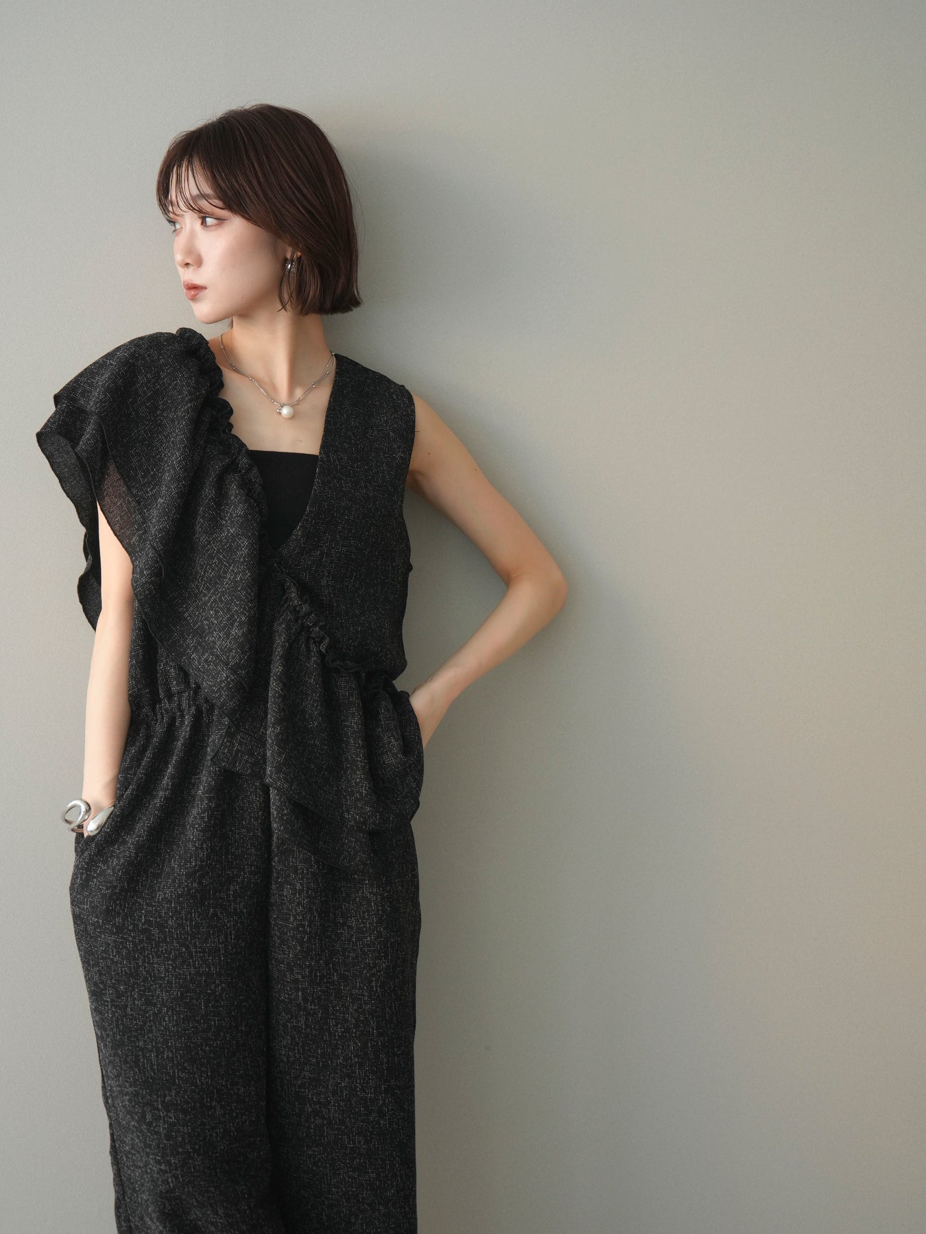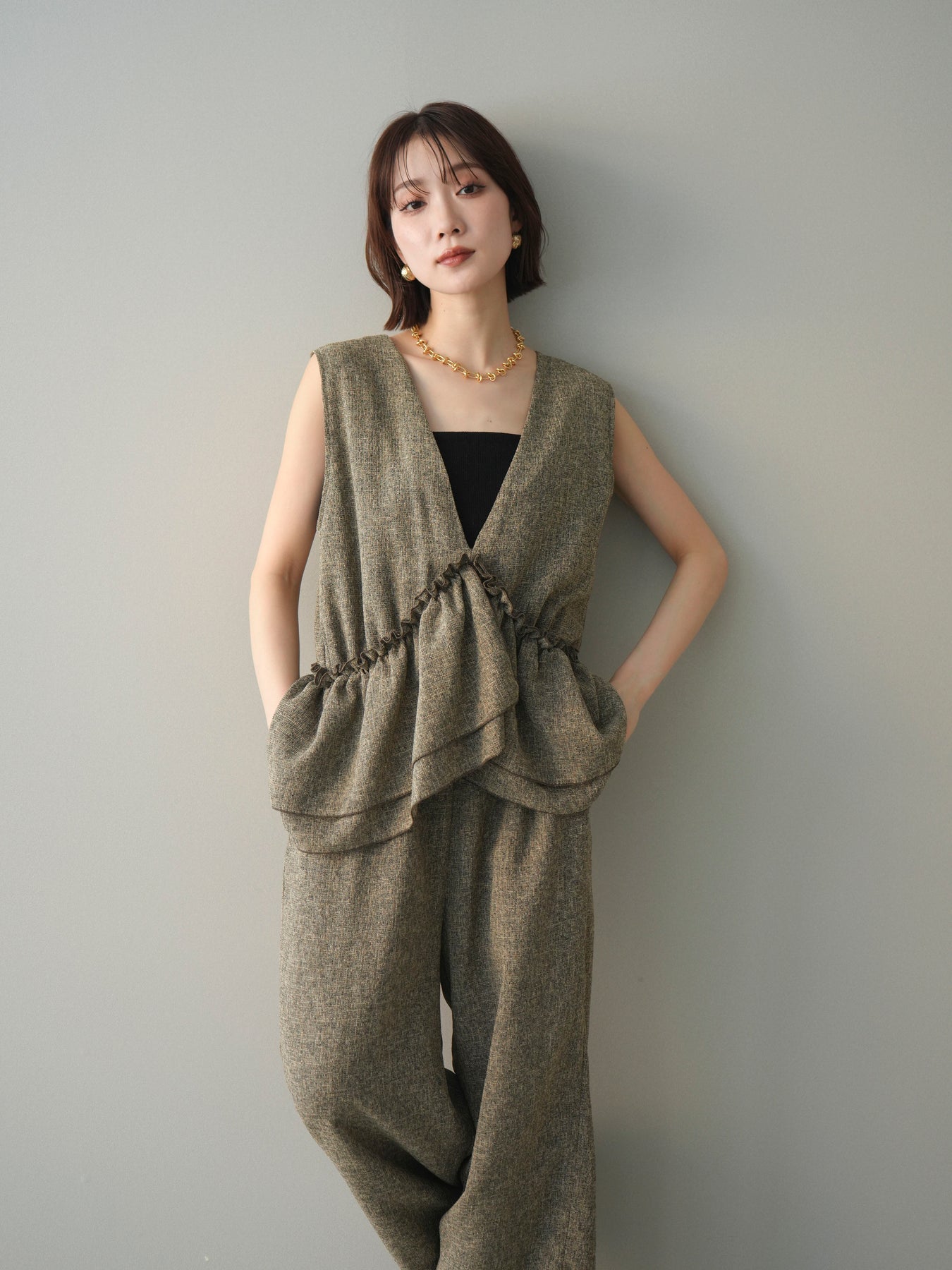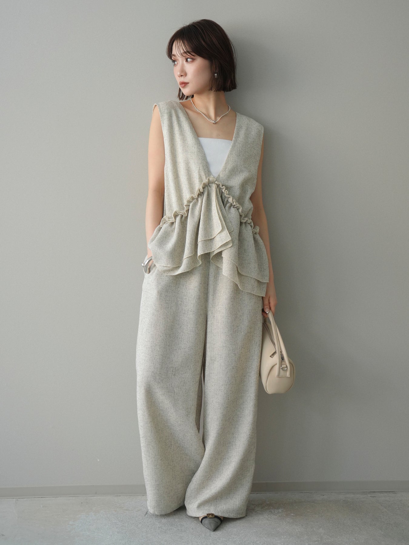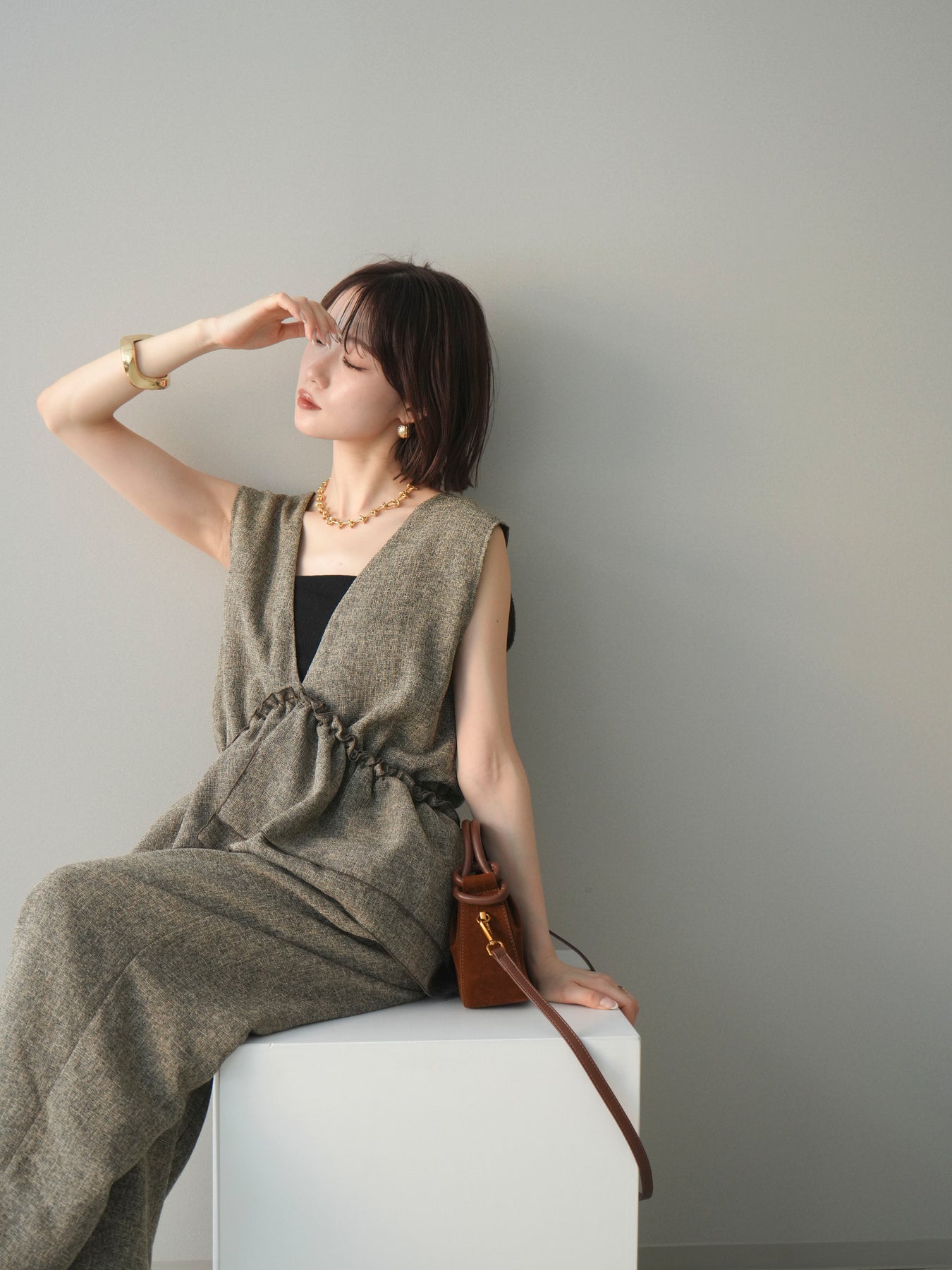 ミックス感のあるツイード素材を使用し、奥行きのある表情と上品さを兼ね備えたオールインワン。ウエスト部分に施したギャザーデザインが自然なメリハリを生み、スタイルアップを叶えながらもリラックスした着心地を実現します。前後で印象を変えられる3WAY仕様で、着こなし次第で雰囲気を自在にアレンジできるのも魅力。インナー合わせでシーズンレスに活躍し、きれいめからカジュアルまで幅広いスタイリングに対応する、存在感のある一着です。