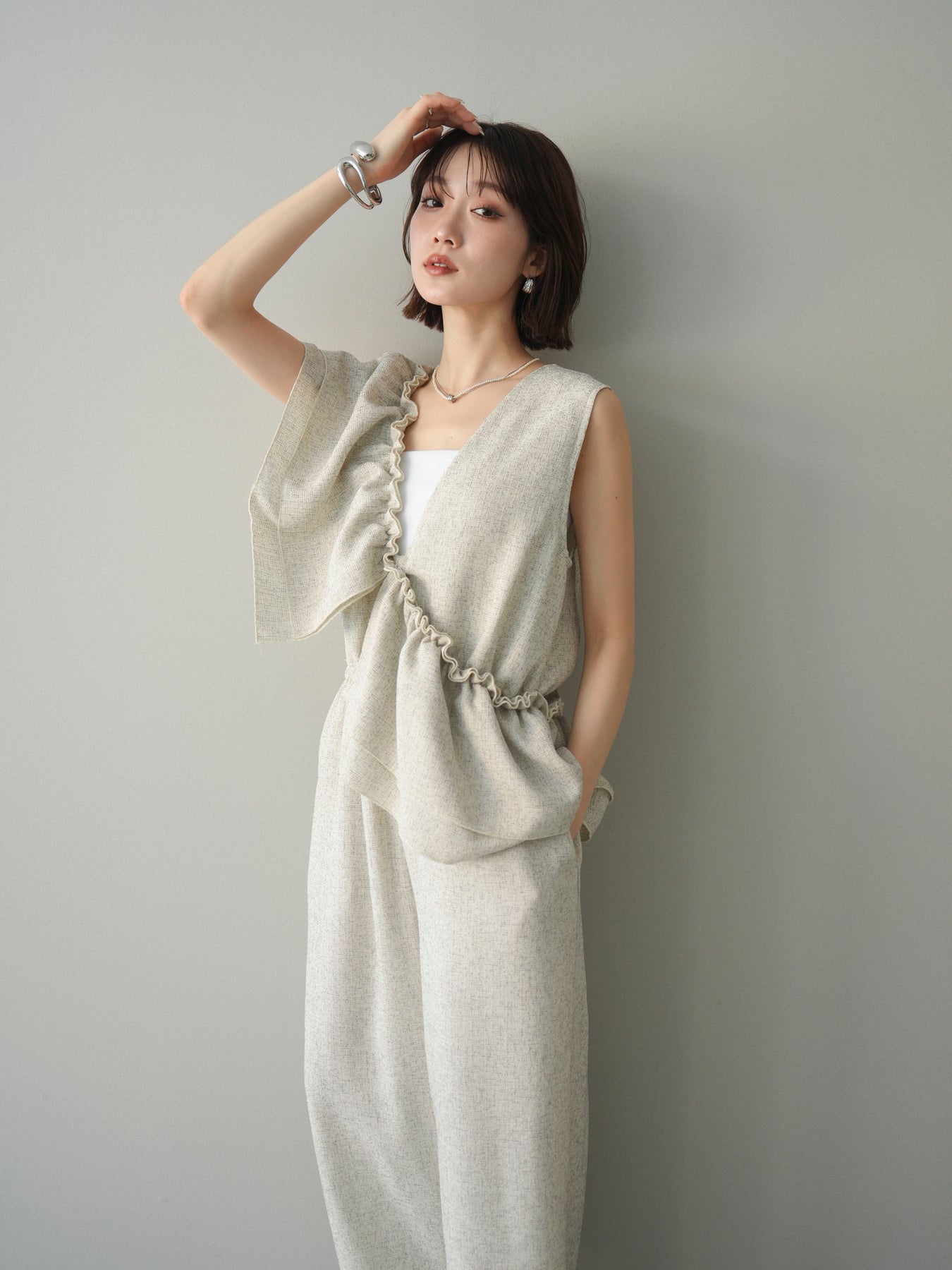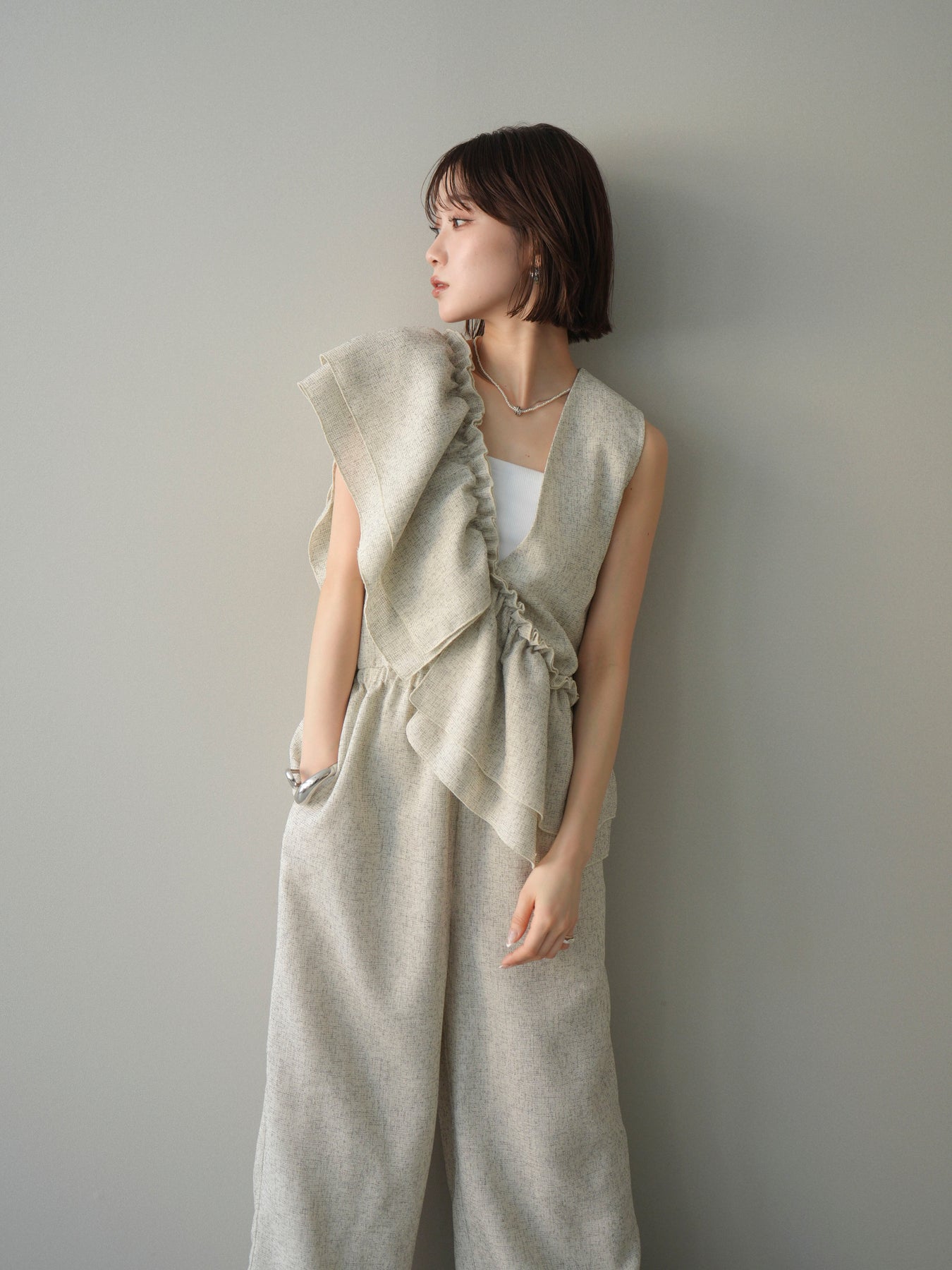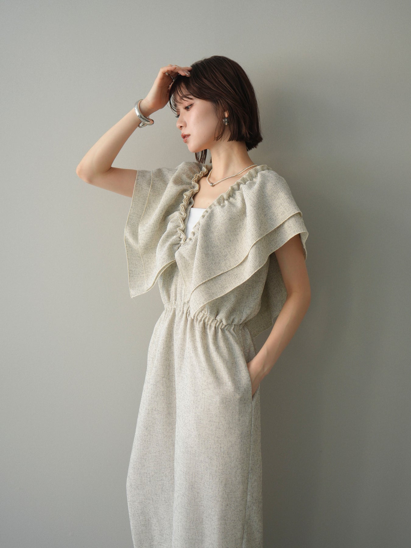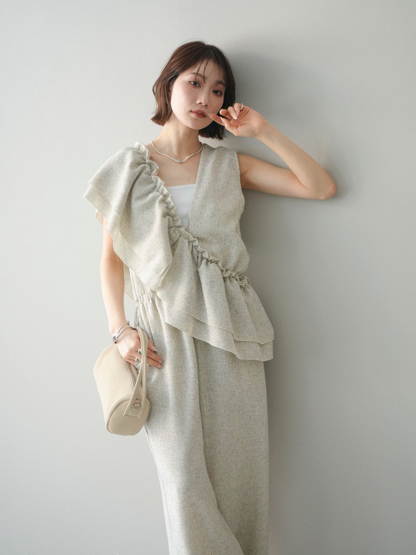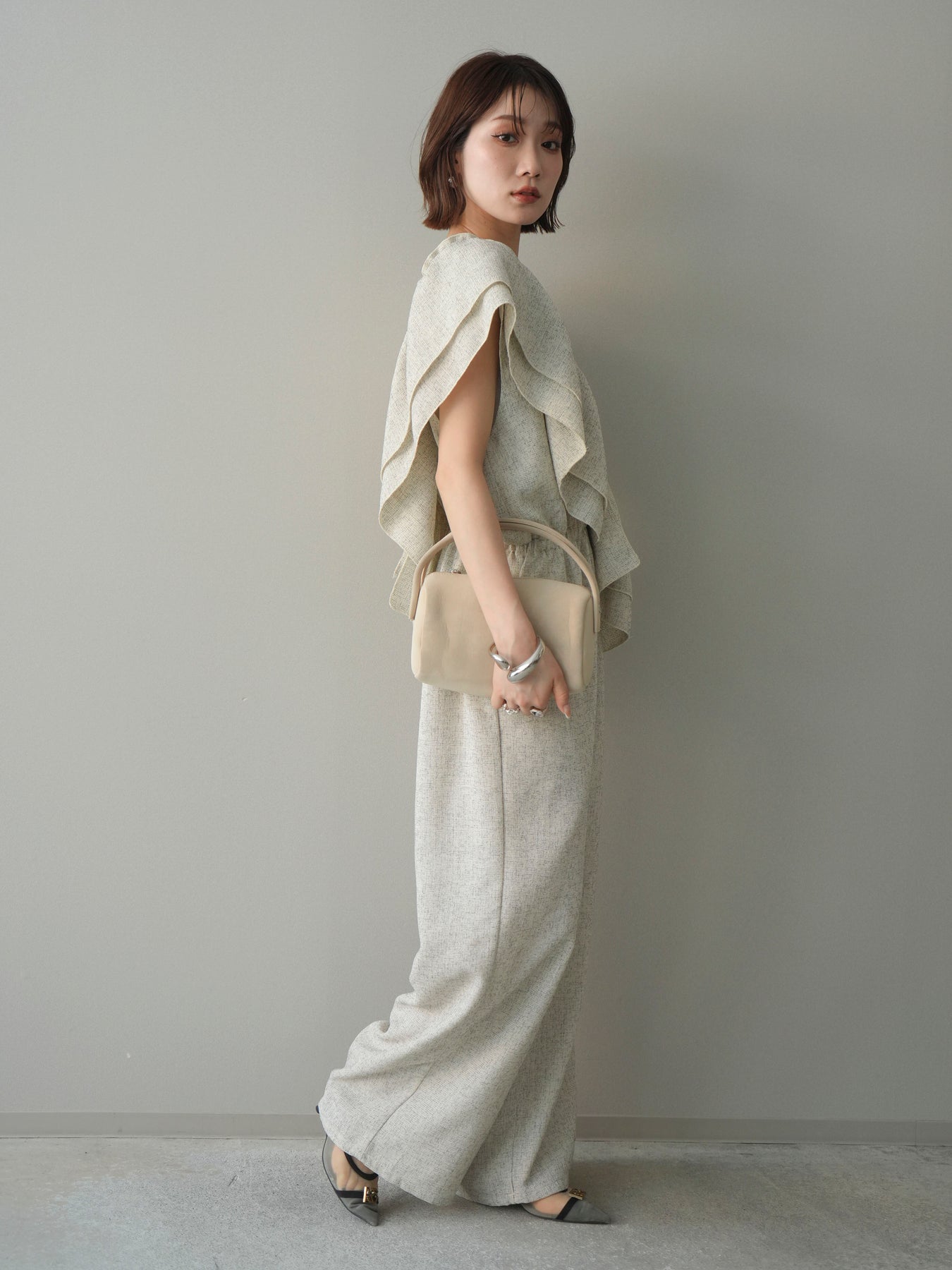 ミックス感のあるツイード素材を使用し、奥行きのある表情と上品さを兼ね備えたオールインワン。ウエスト部分に施したギャザーデザインが自然なメリハリを生み、スタイルアップを叶えながらもリラックスした着心地を実現します。前後で印象を変えられる3WAY仕様で、着こなし次第で雰囲気を自在にアレンジできるのも魅力。インナー合わせでシーズンレスに活躍し、きれいめからカジュアルまで幅広いスタイリングに対応する、存在感のある一着です。