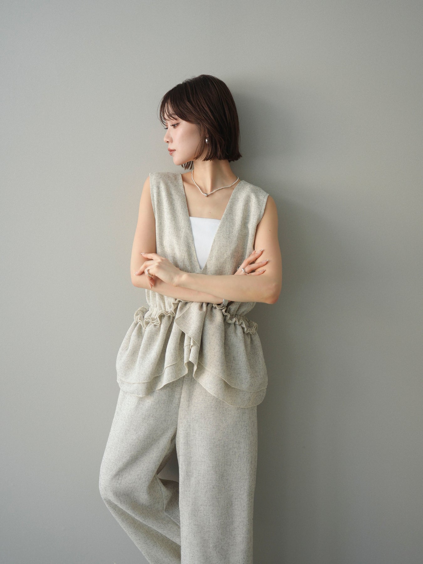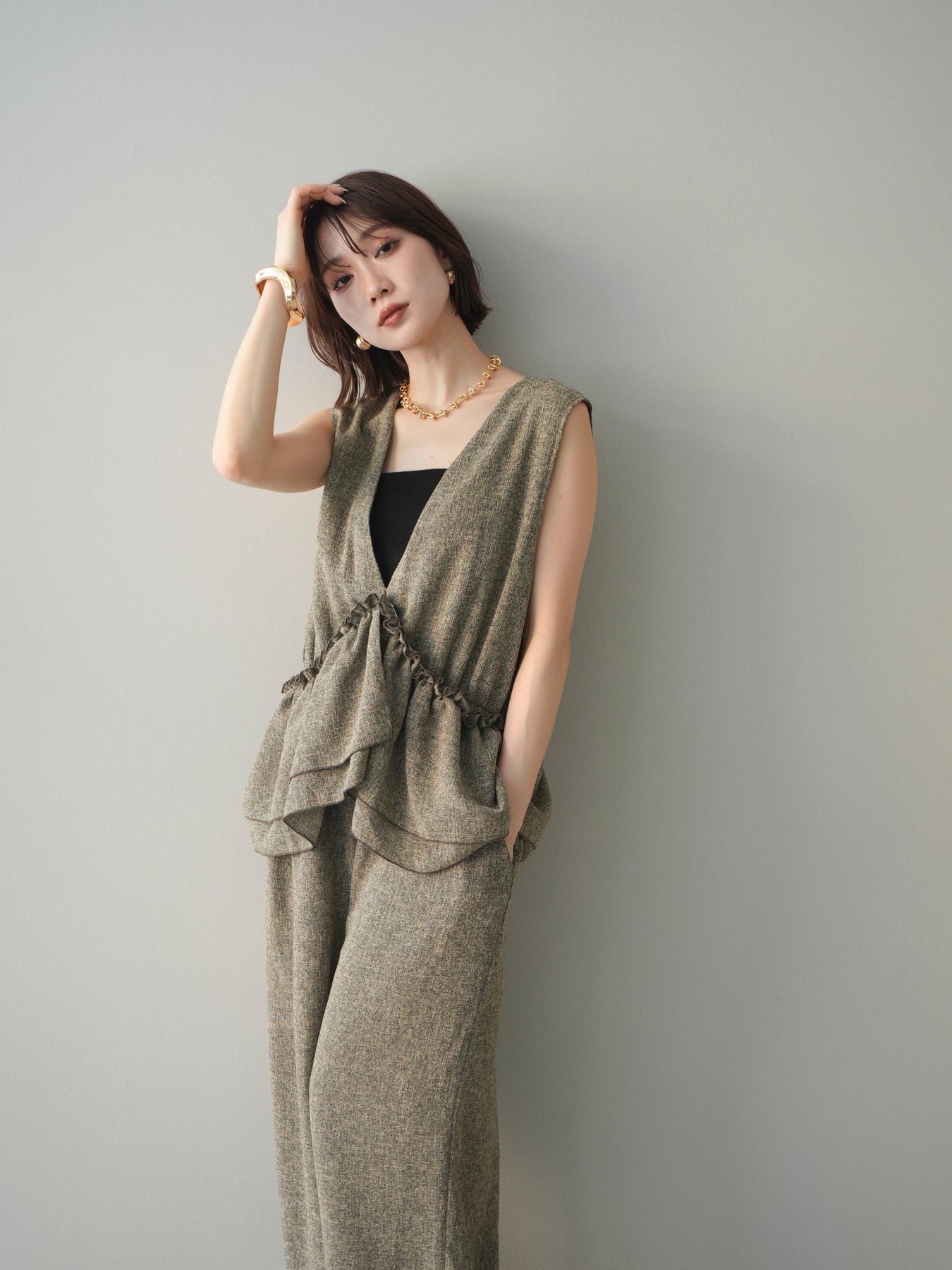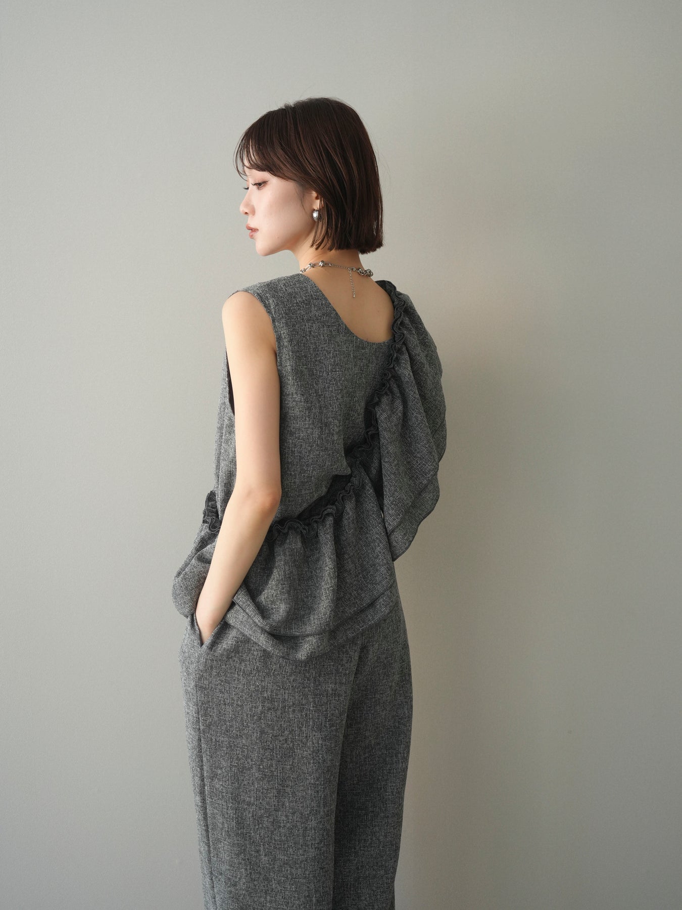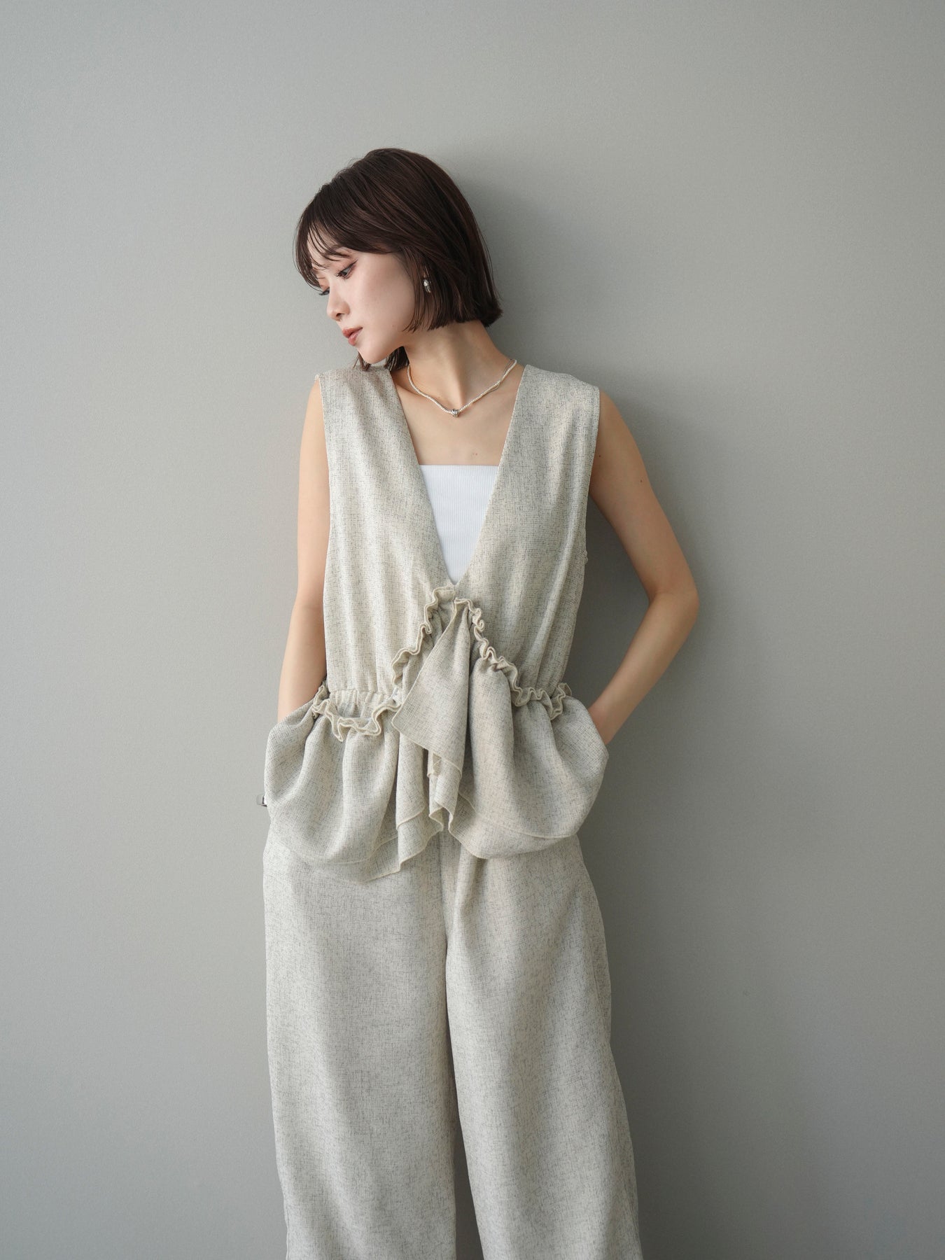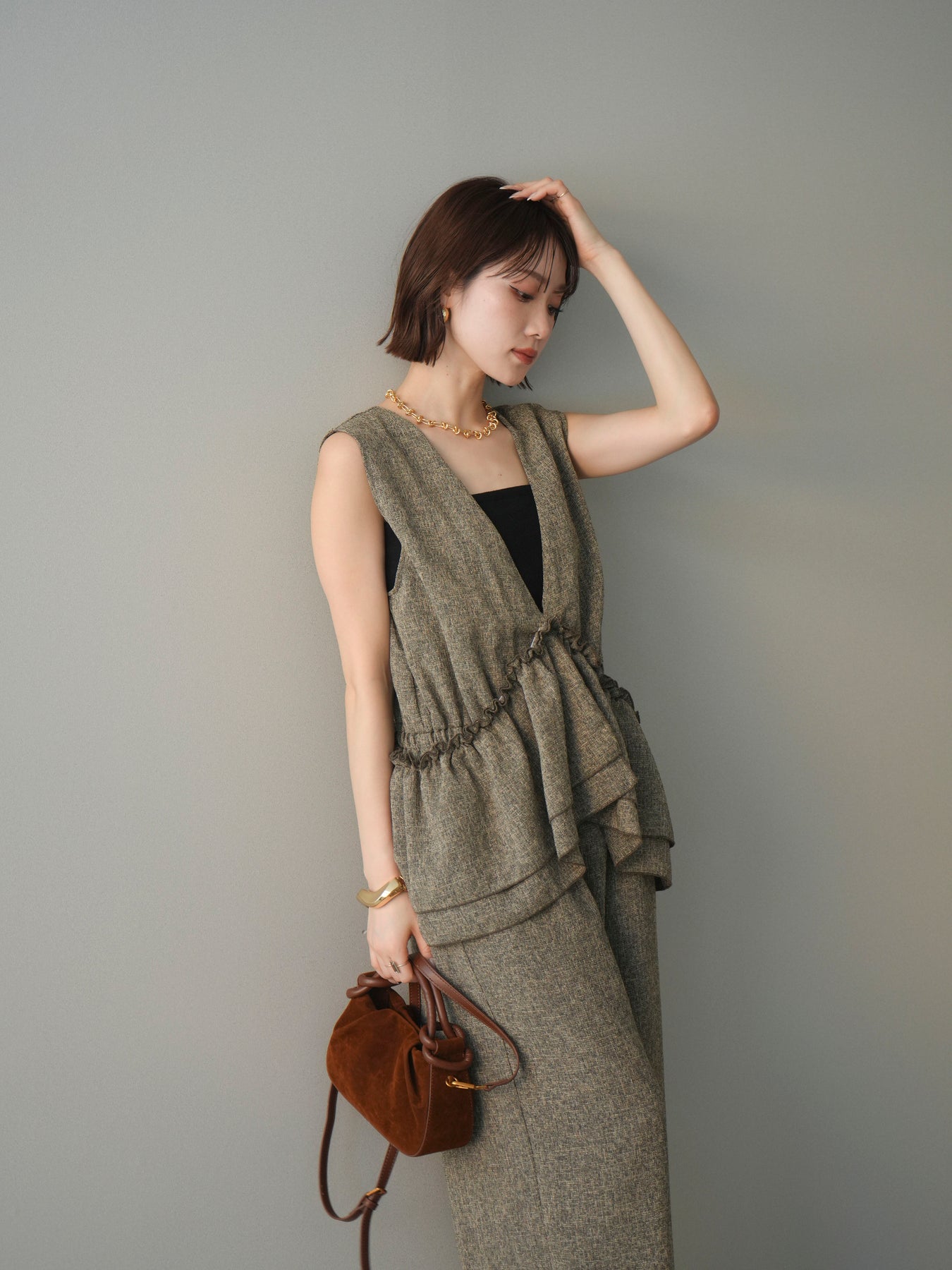 ミックス感のあるツイード素材を使用し、奥行きのある表情と上品さを兼ね備えたオールインワン。ウエスト部分に施したギャザーデザインが自然なメリハリを生み、スタイルアップを叶えながらもリラックスした着心地を実現します。前後で印象を変えられる3WAY仕様で、着こなし次第で雰囲気を自在にアレンジできるのも魅力。インナー合わせでシーズンレスに活躍し、きれいめからカジュアルまで幅広いスタイリングに対応する、存在感のある一着です。
