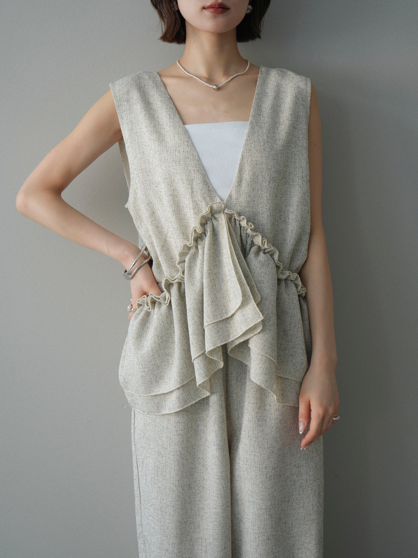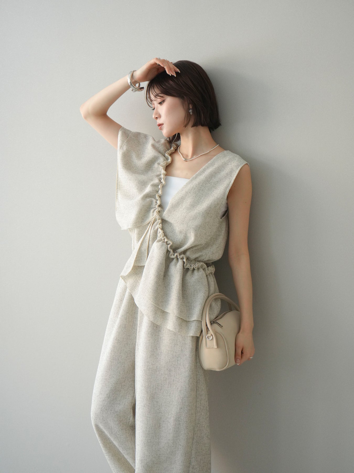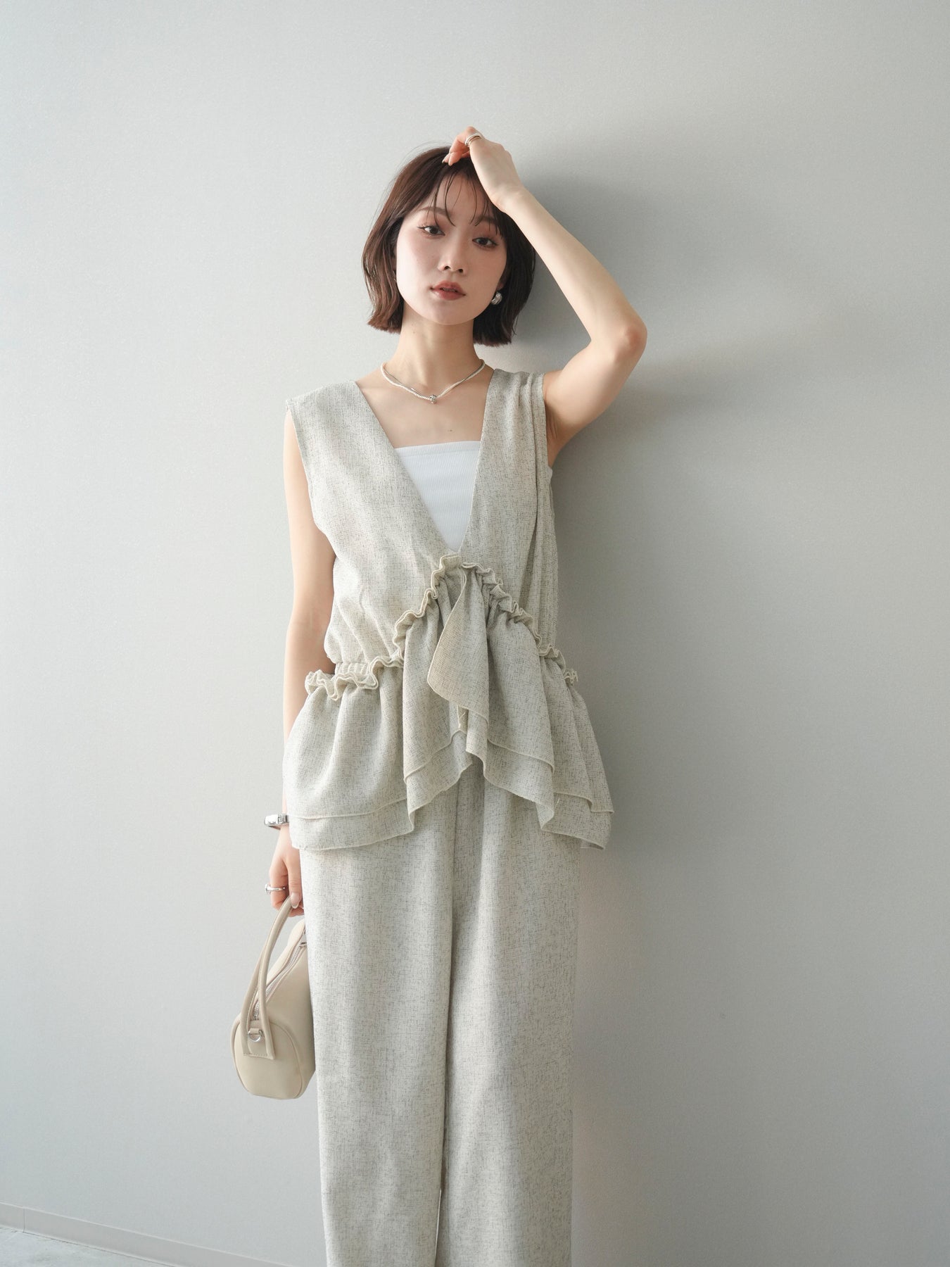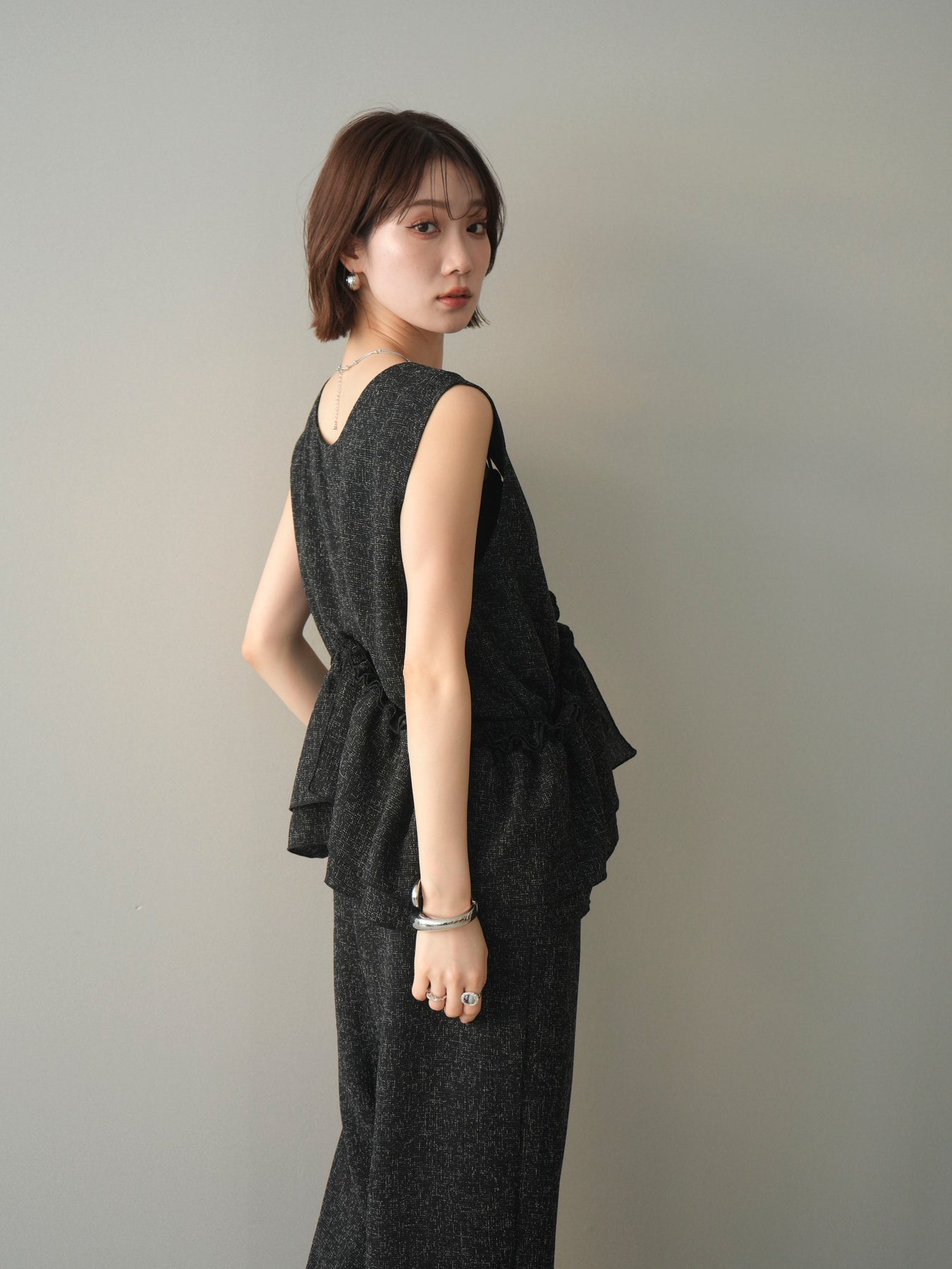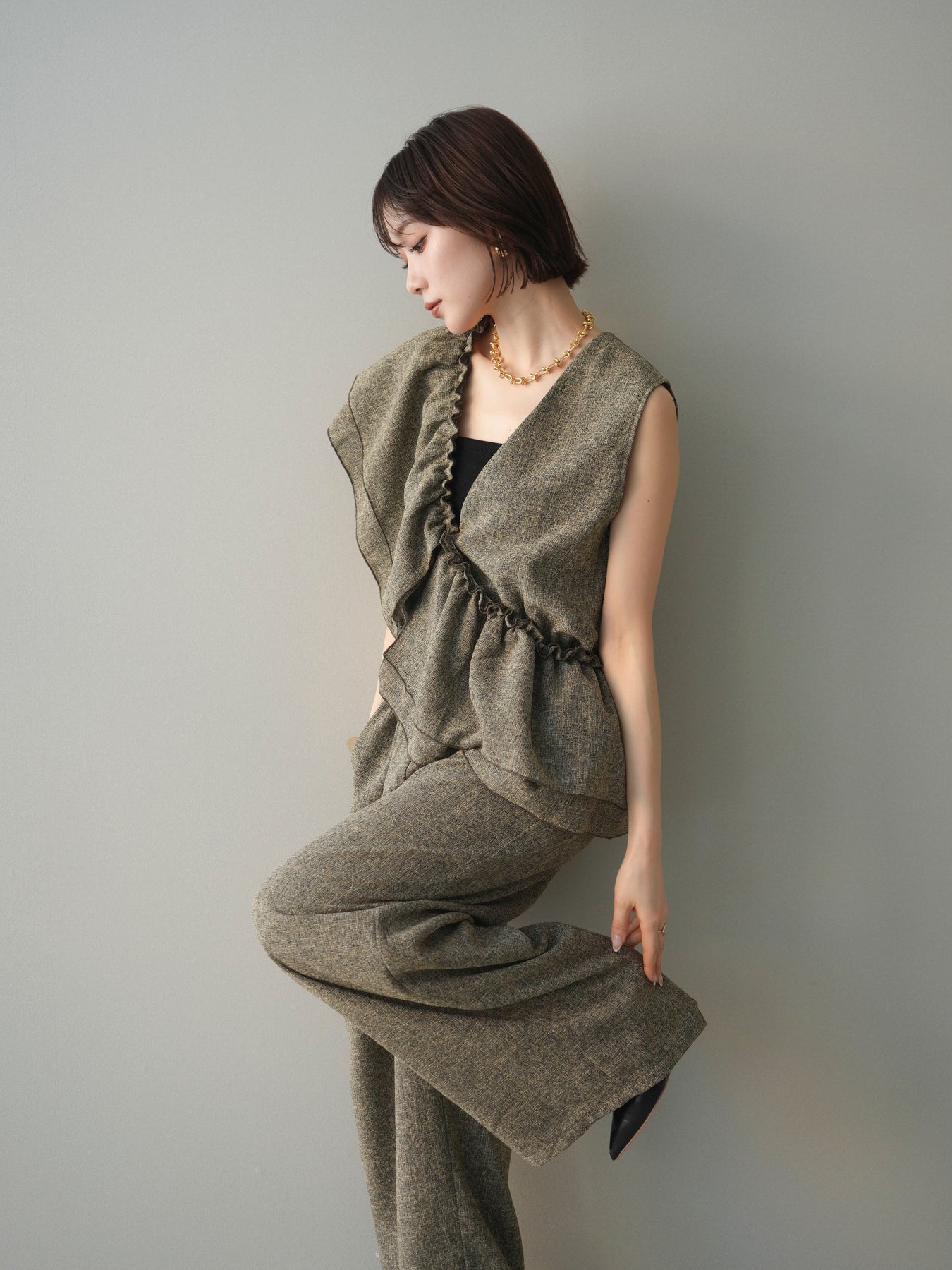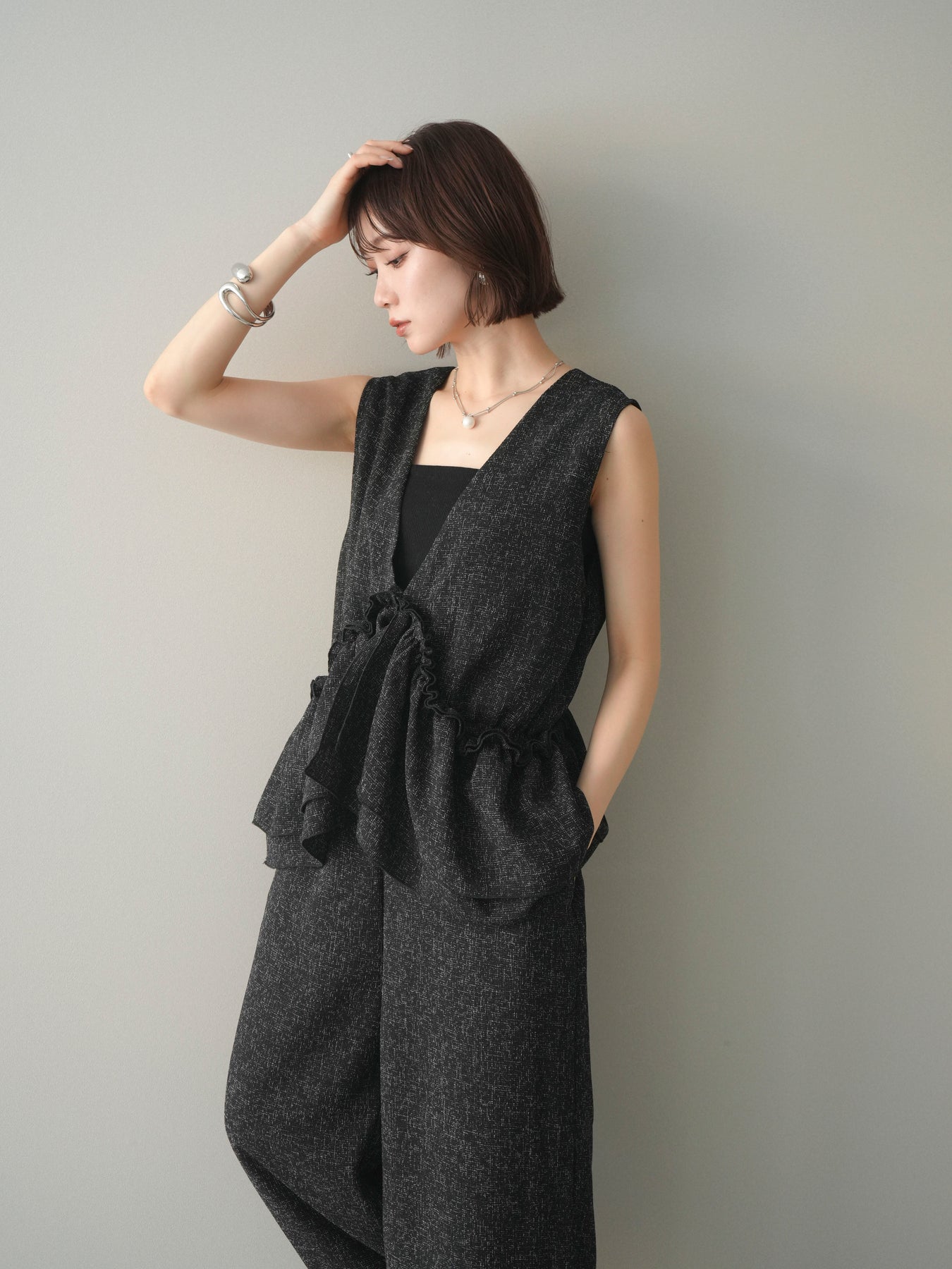 ミックス感のあるツイード素材を使用し、奥行きのある表情と上品さを兼ね備えたオールインワン。ウエスト部分に施したギャザーデザインが自然なメリハリを生み、スタイルアップを叶えながらもリラックスした着心地を実現します。前後で印象を変えられる3WAY仕様で、着こなし次第で雰囲気を自在にアレンジできるのも魅力。インナー合わせでシーズンレスに活躍し、きれいめからカジュアルまで幅広いスタイリングに対応する、存在感のある一着です。