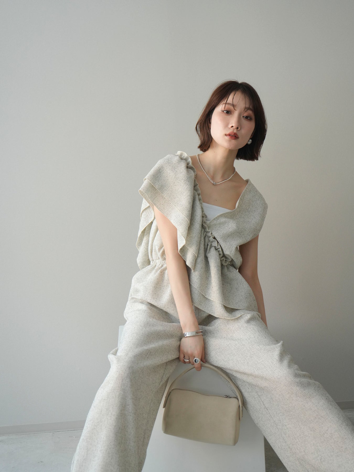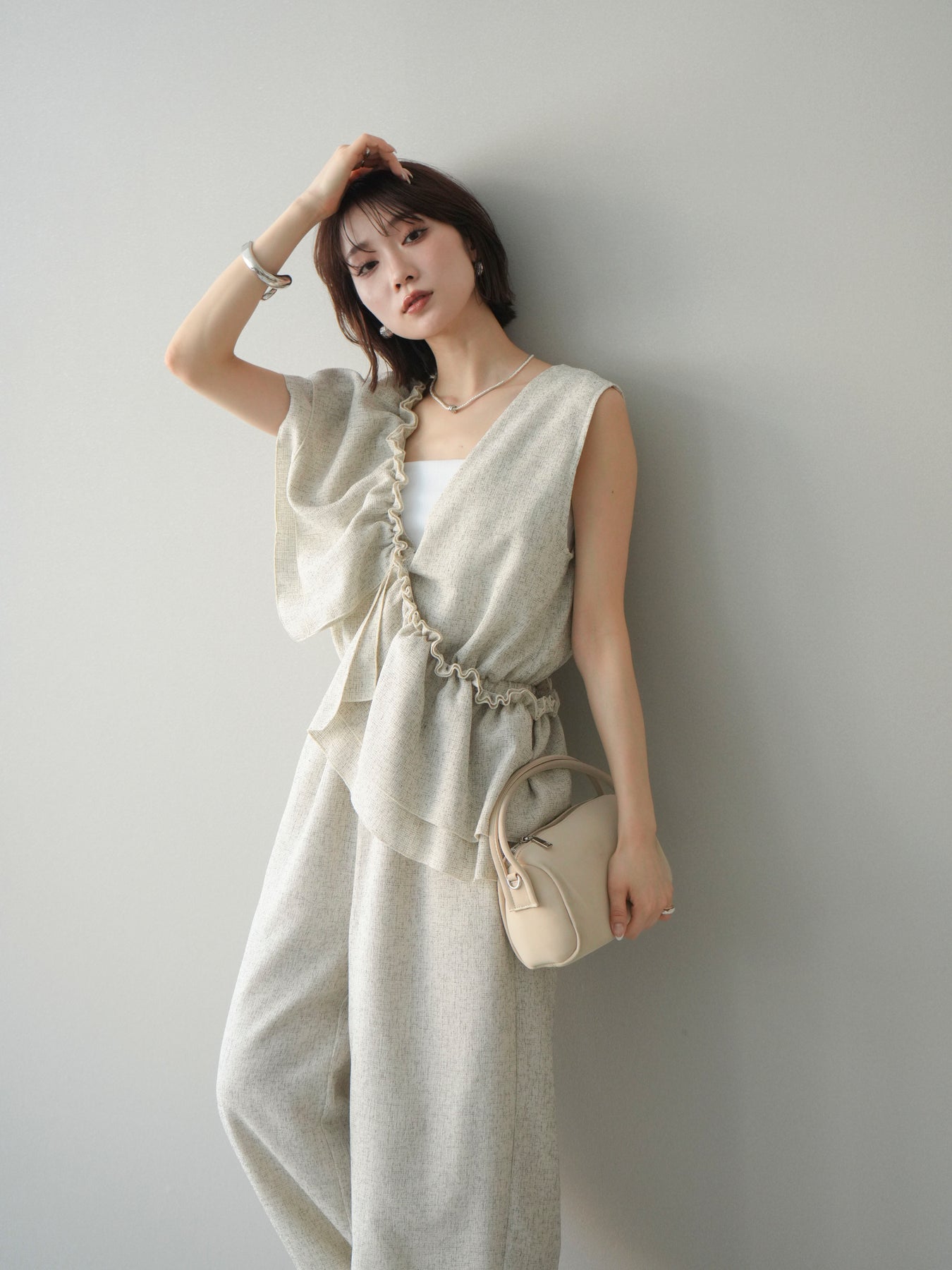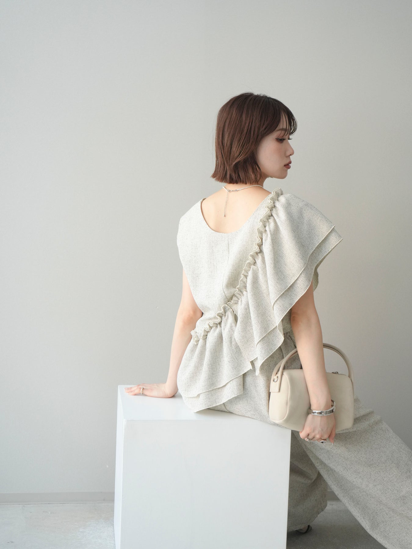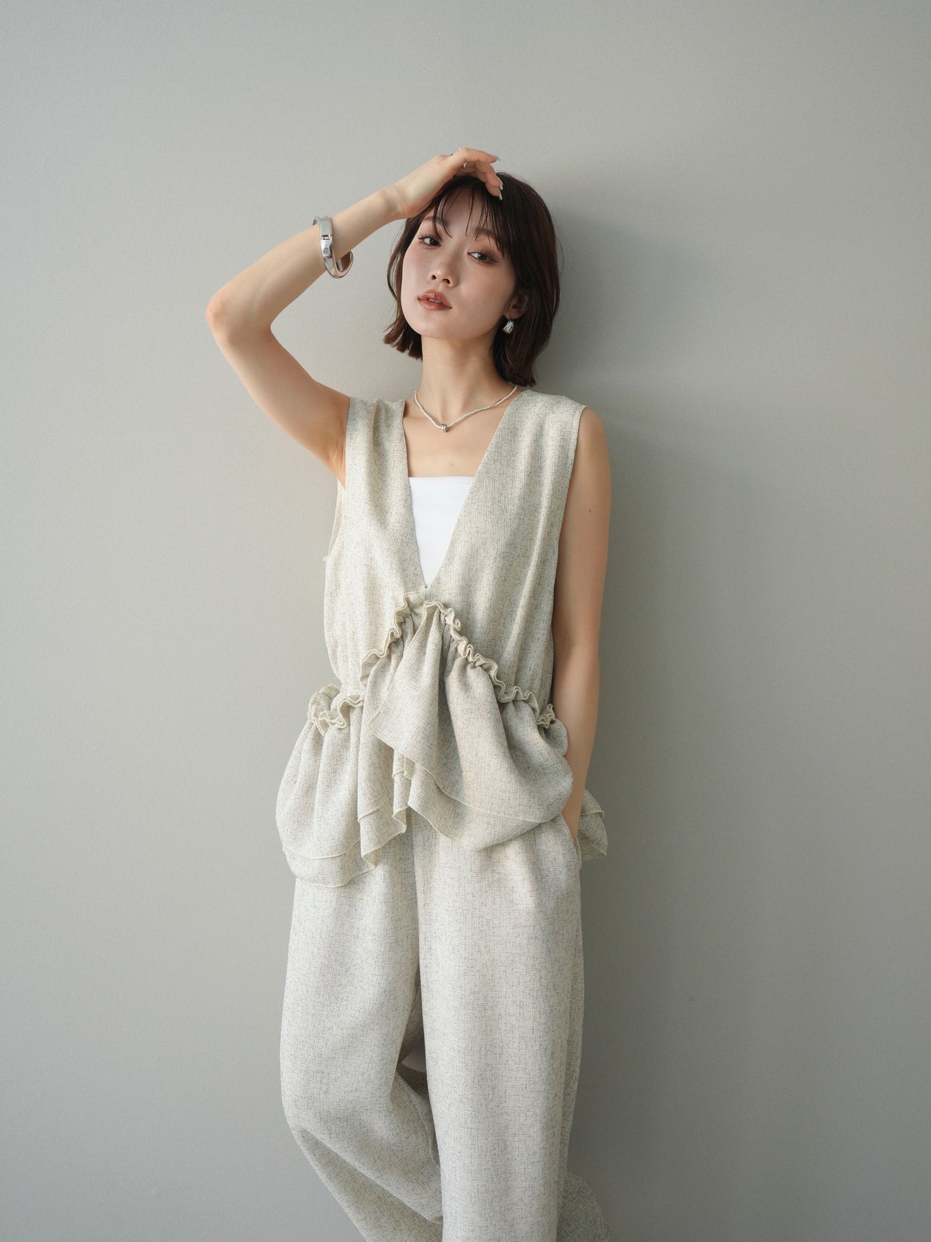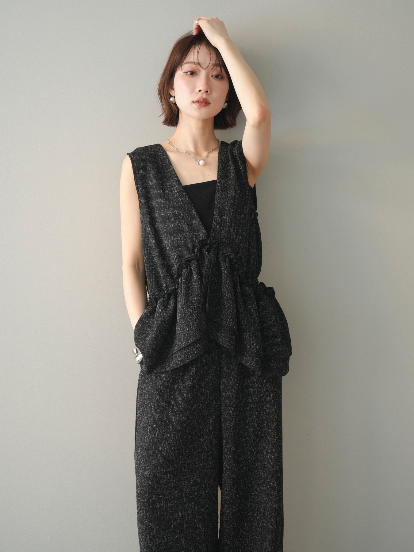 ミックス感のあるツイード素材を使用し、奥行きのある表情と上品さを兼ね備えたオールインワン。ウエスト部分に施したギャザーデザインが自然なメリハリを生み、スタイルアップを叶えながらもリラックスした着心地を実現します。前後で印象を変えられる3WAY仕様で、着こなし次第で雰囲気を自在にアレンジできるのも魅力。インナー合わせでシーズンレスに活躍し、きれいめからカジュアルまで幅広いスタイリングに対応する、存在感のある一着です。