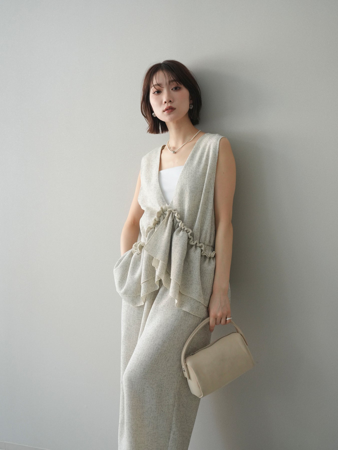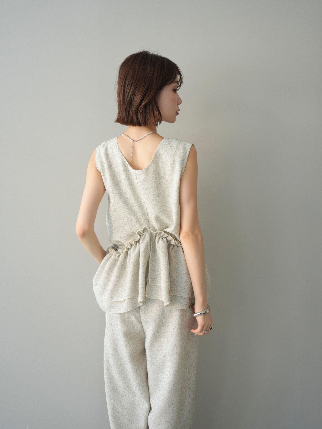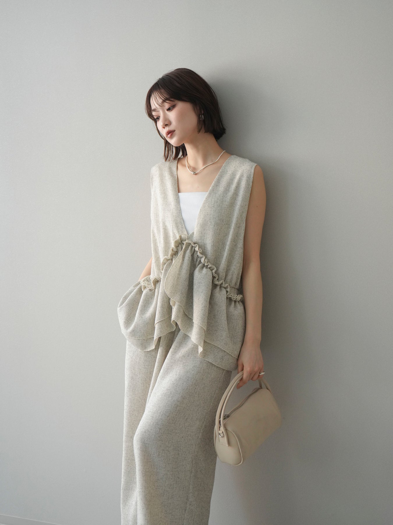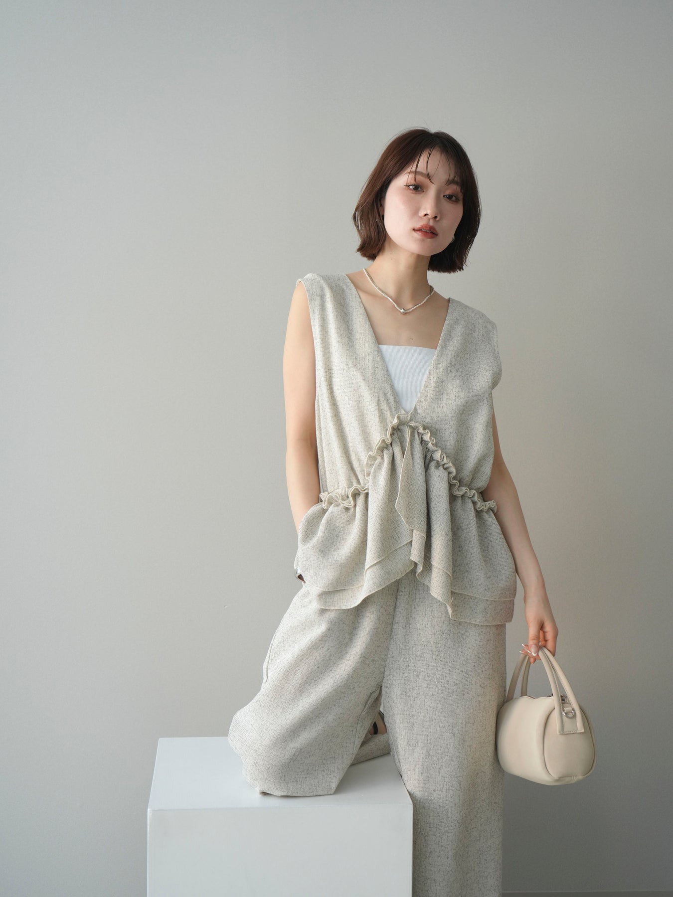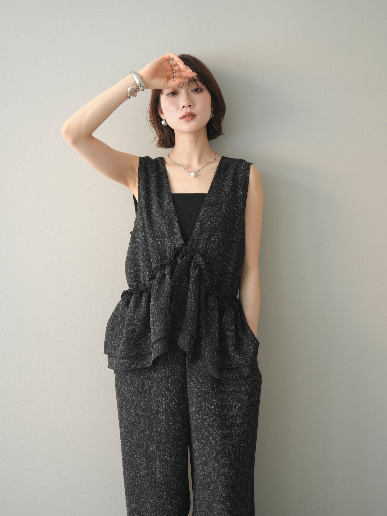 ミックス感のあるツイード素材を使用し、奥行きのある表情と上品さを兼ね備えたオールインワン。ウエスト部分に施したギャザーデザインが自然なメリハリを生み、スタイルアップを叶えながらもリラックスした着心地を実現します。前後で印象を変えられる3WAY仕様で、着こなし次第で雰囲気を自在にアレンジできるのも魅力。インナー合わせでシーズンレスに活躍し、きれいめからカジュアルまで幅広いスタイリングに対応する、存在感のある一着です。