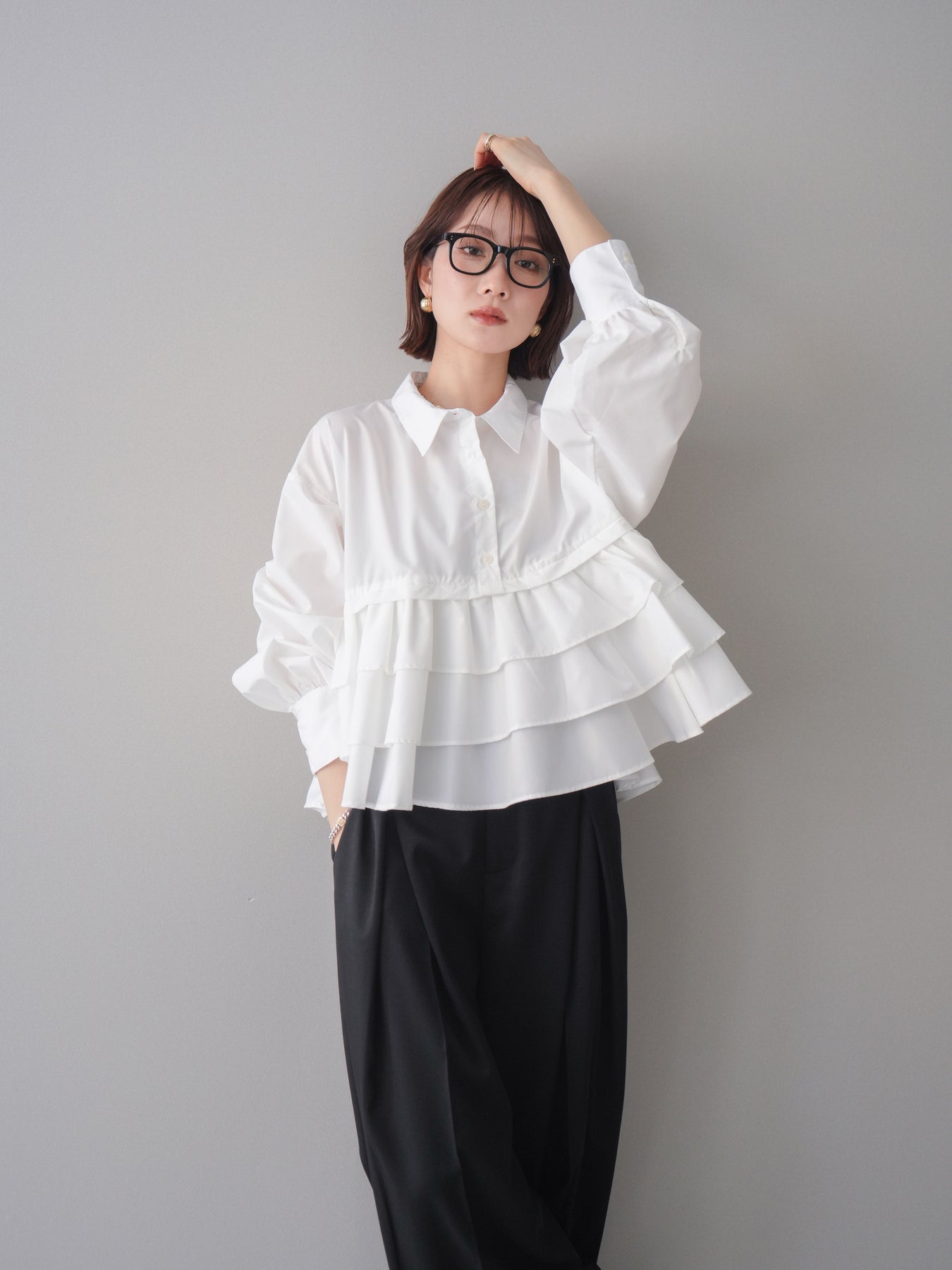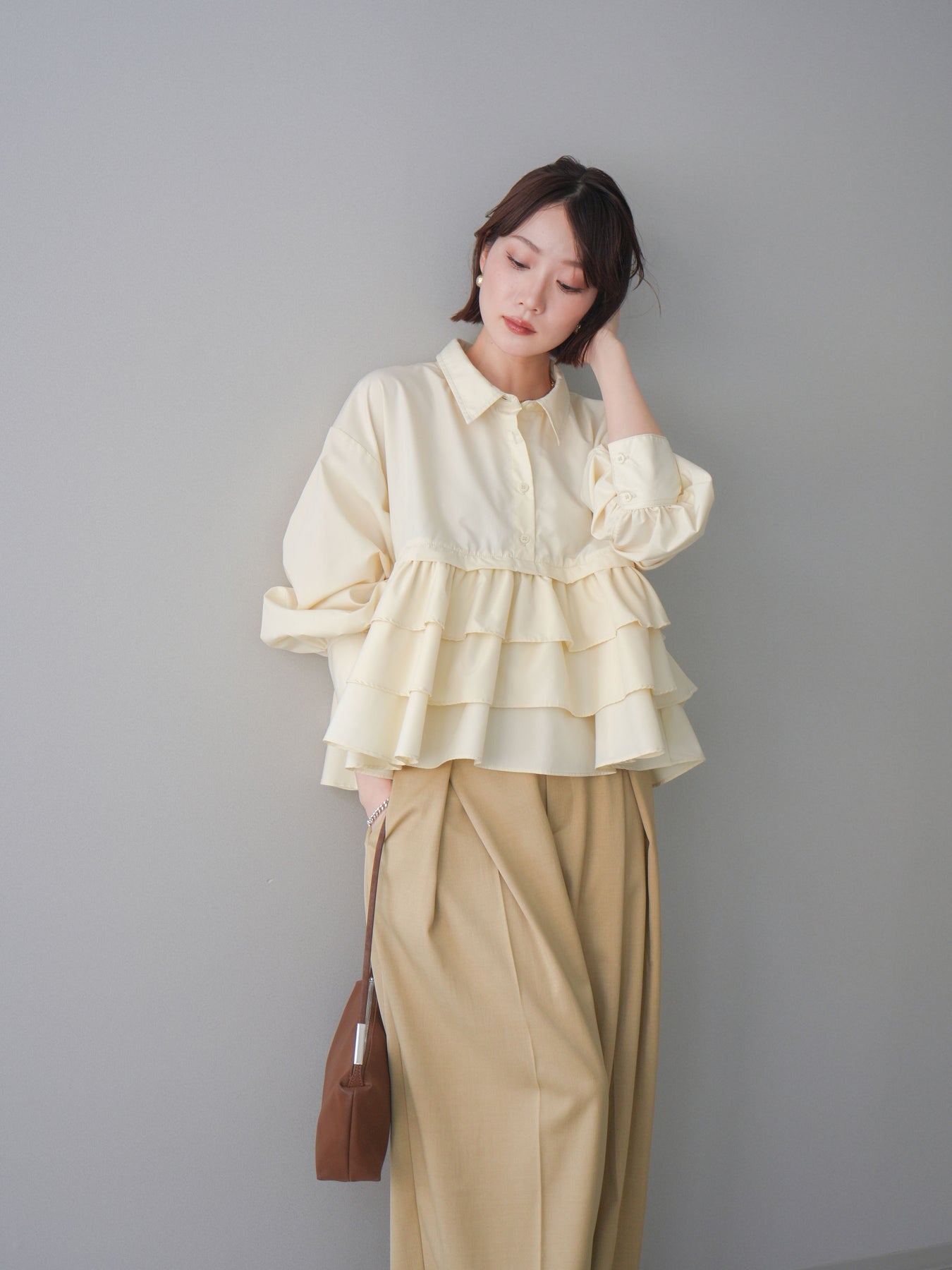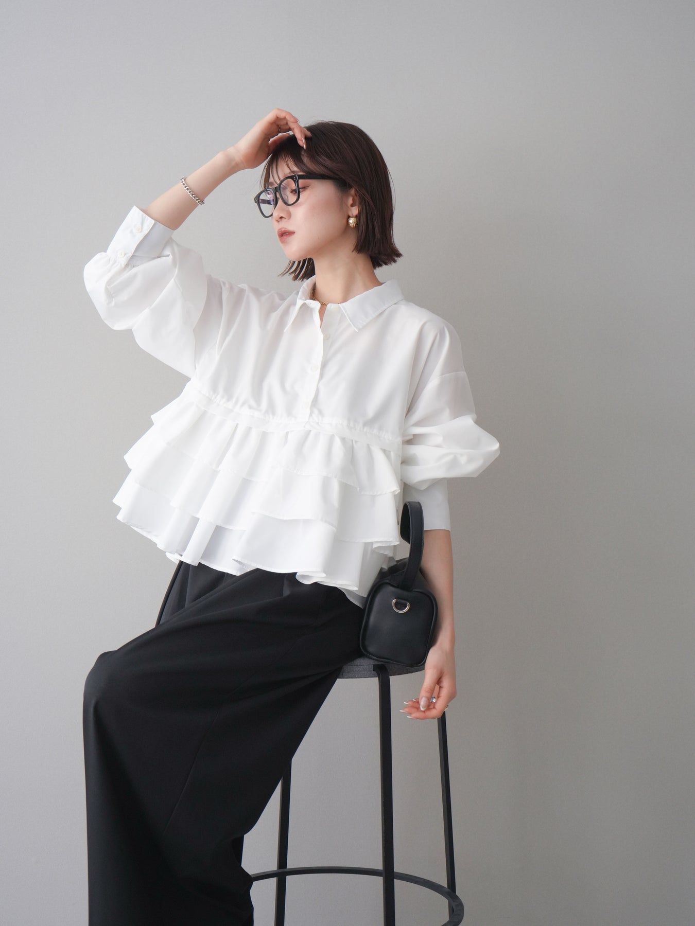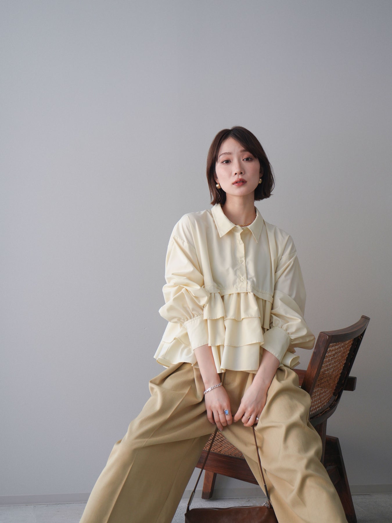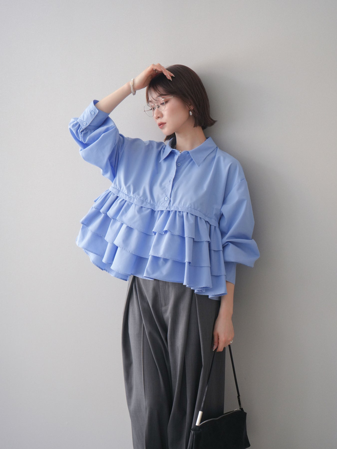 ハリのあるブロード素材を使用し、立体的なティアードデザインが印象的なショートシャツ。切り替えから広がるフレアシルエットが軽やかな動きを演出し、スタイリングに自然な華やかさをプラスします。程よいショート丈でバランスが取りやすく、ワイドパンツやスカートとも好相性。きちんと感のある襟元と甘さを抑えたデザインで、デイリーからきれいめまで幅広く活躍する一着です。 ※ボトムス、キャミソール(インナー)以外の商品は一律でインナーは付属していません。