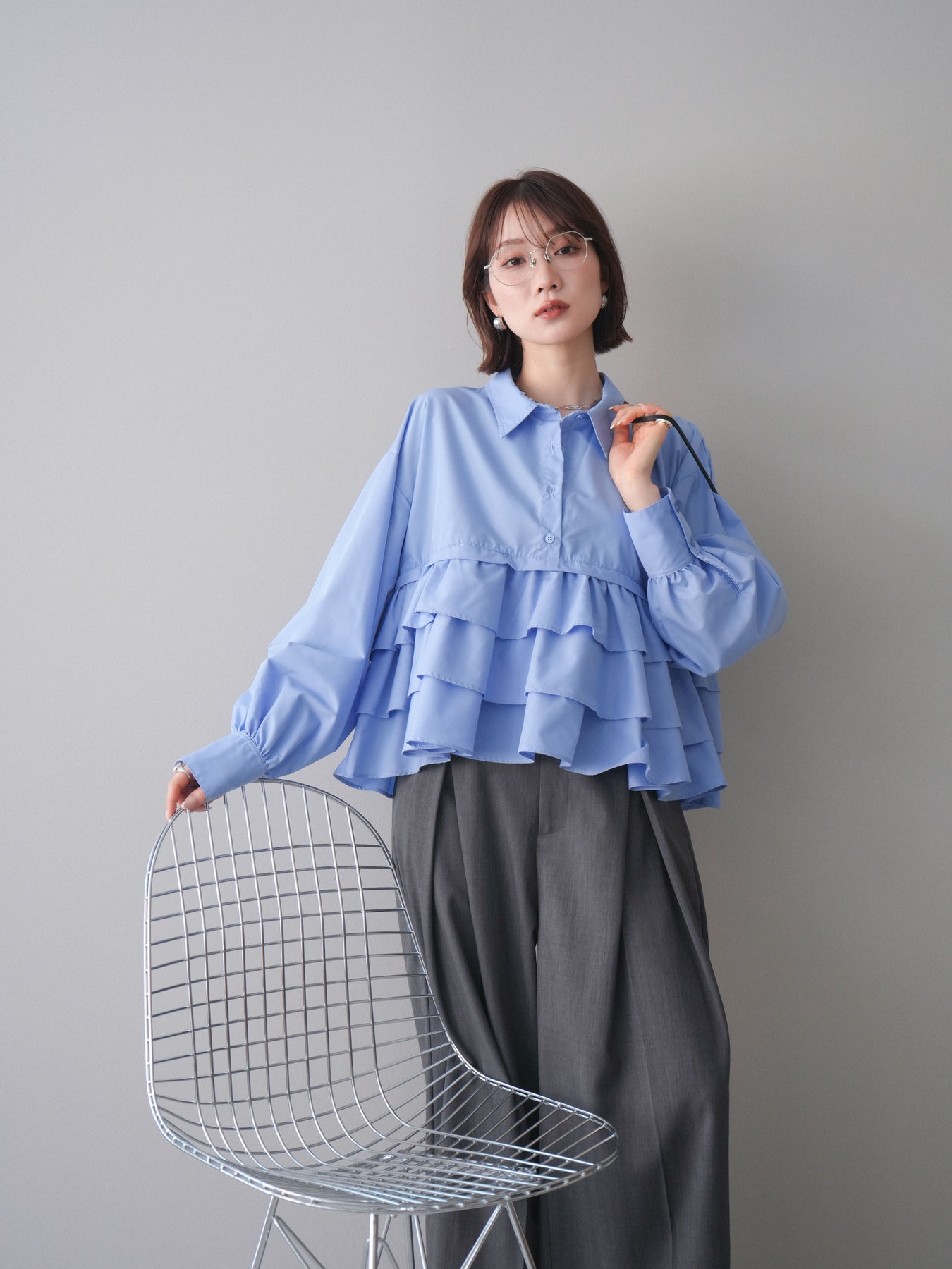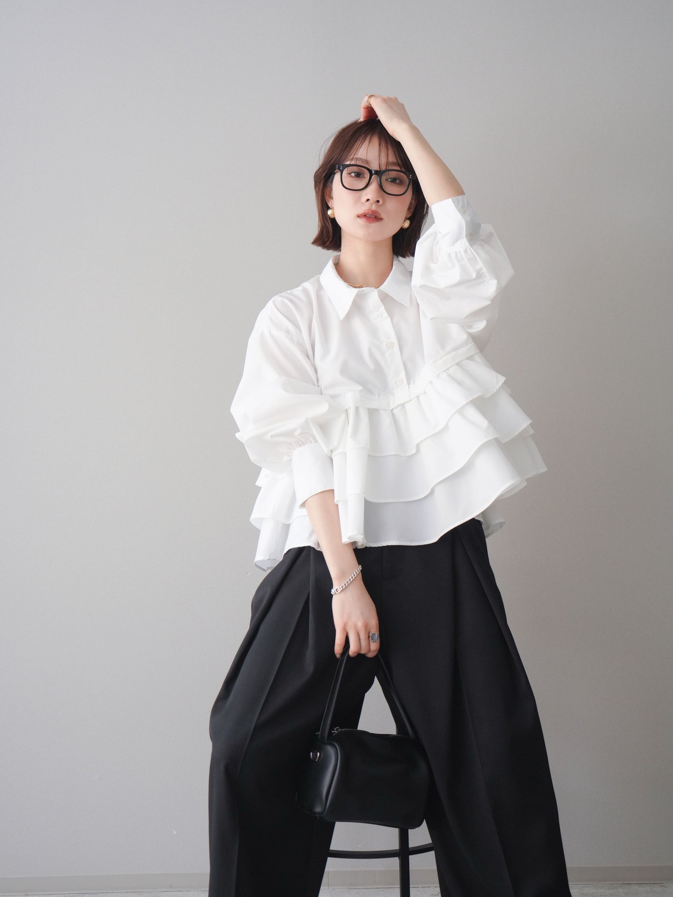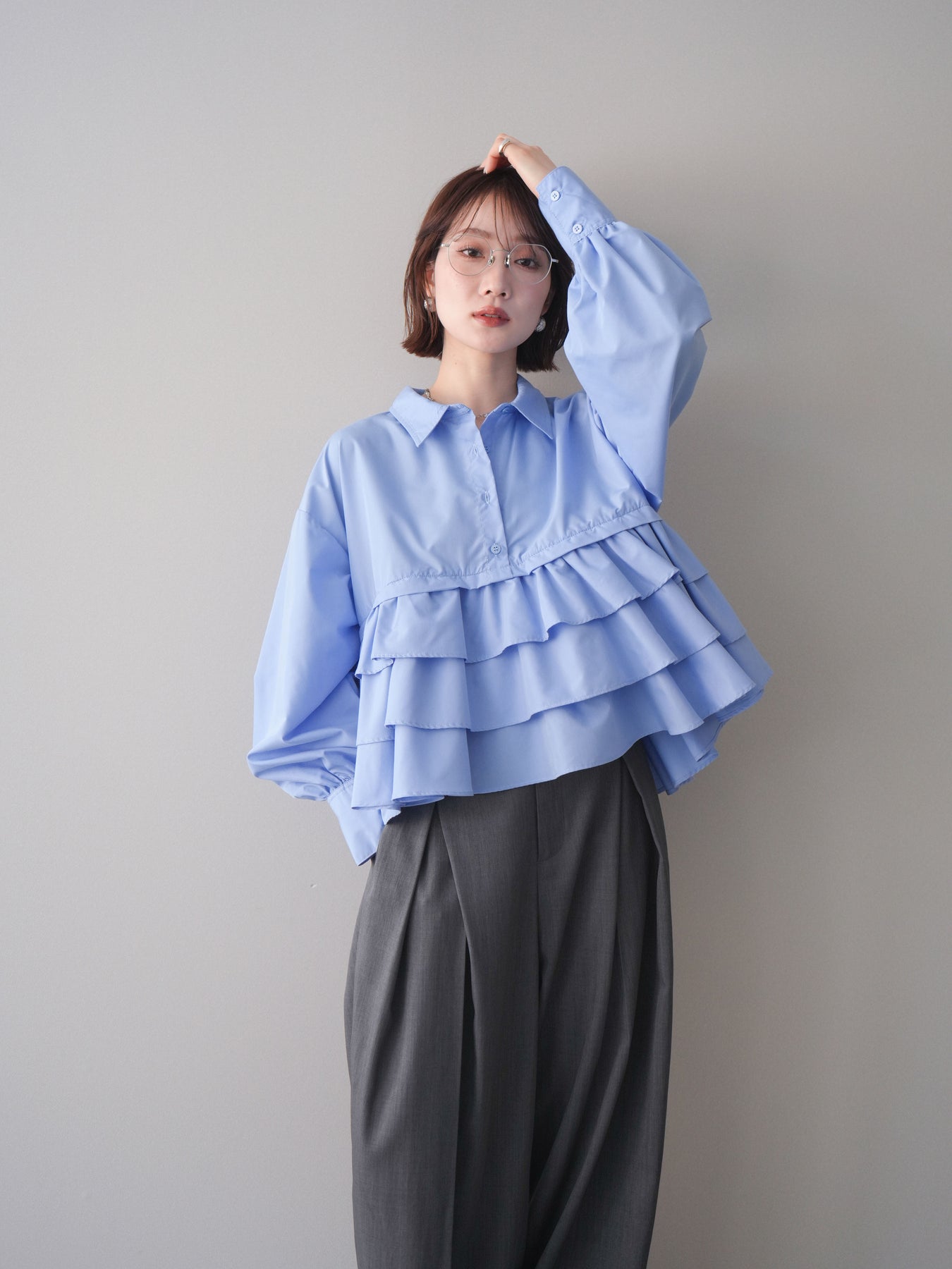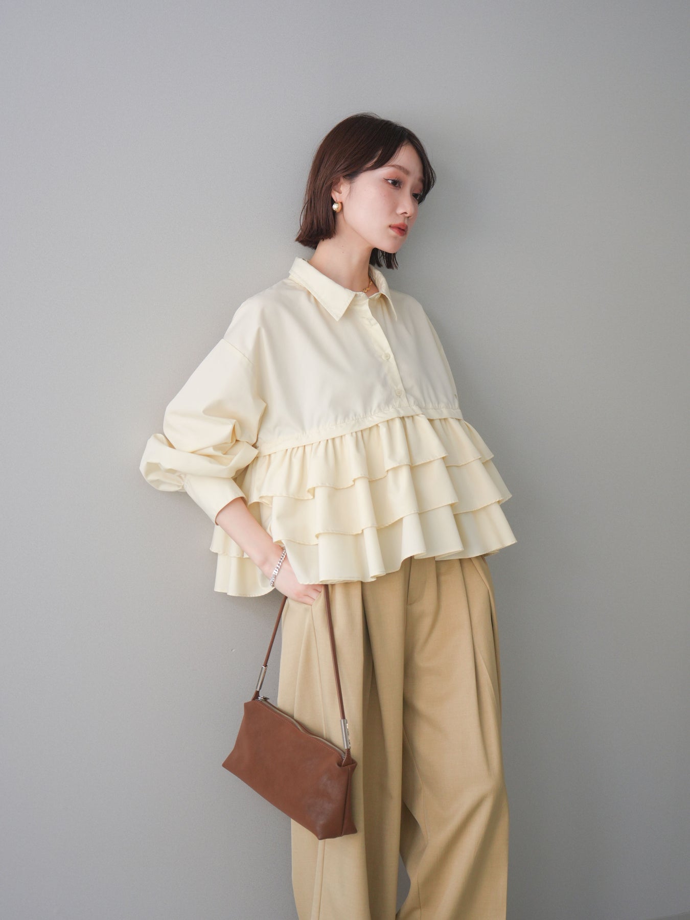 ハリのあるブロード素材を使用し、立体的なティアードデザインが印象的なショートシャツ。切り替えから広がるフレアシルエットが軽やかな動きを演出し、スタイリングに自然な華やかさをプラスします。程よいショート丈でバランスが取りやすく、ワイドパンツやスカートとも好相性。きちんと感のある襟元と甘さを抑えたデザインで、デイリーからきれいめまで幅広く活躍する一着です。 ※ボトムス、キャミソール(インナー)以外の商品は一律でインナーは付属していません。