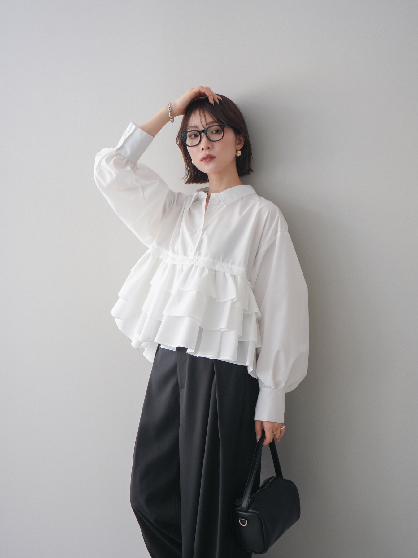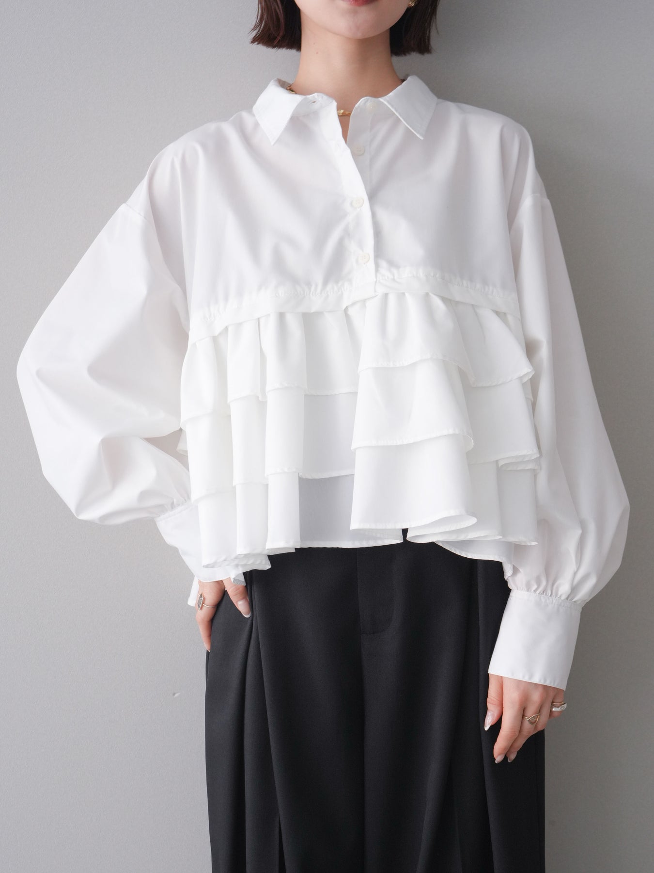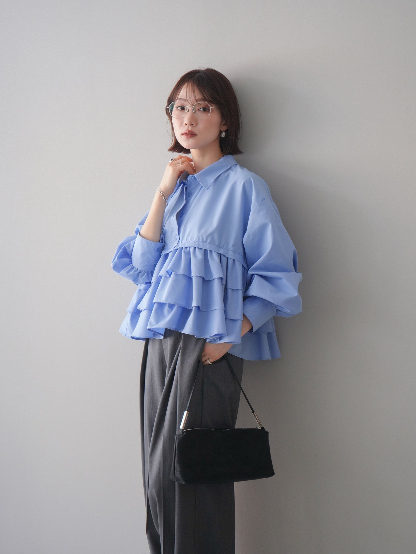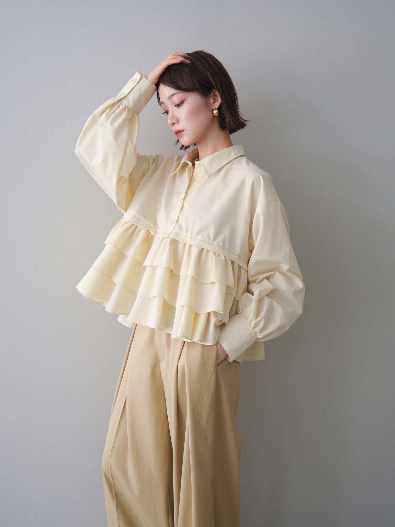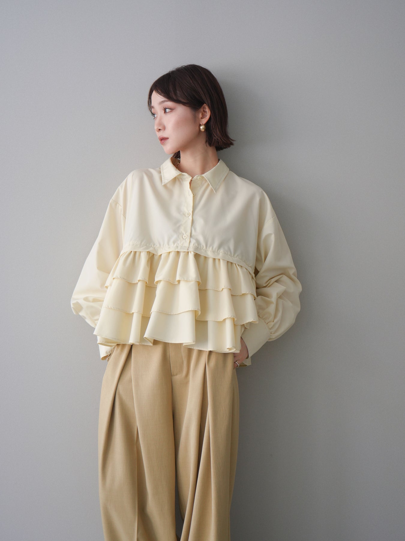 ハリのあるブロード素材を使用し、立体的なティアードデザインが印象的なショートシャツ。切り替えから広がるフレアシルエットが軽やかな動きを演出し、スタイリングに自然な華やかさをプラスします。程よいショート丈でバランスが取りやすく、ワイドパンツやスカートとも好相性。きちんと感のある襟元と甘さを抑えたデザインで、デイリーからきれいめまで幅広く活躍する一着です。 ※ボトムス、キャミソール(インナー)以外の商品は一律でインナーは付属していません。