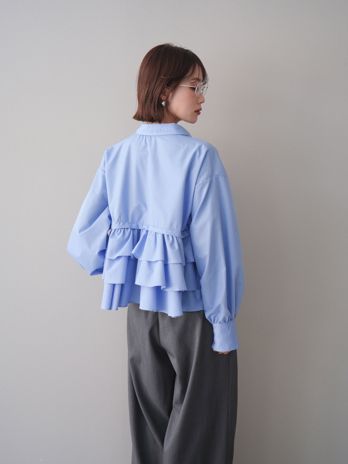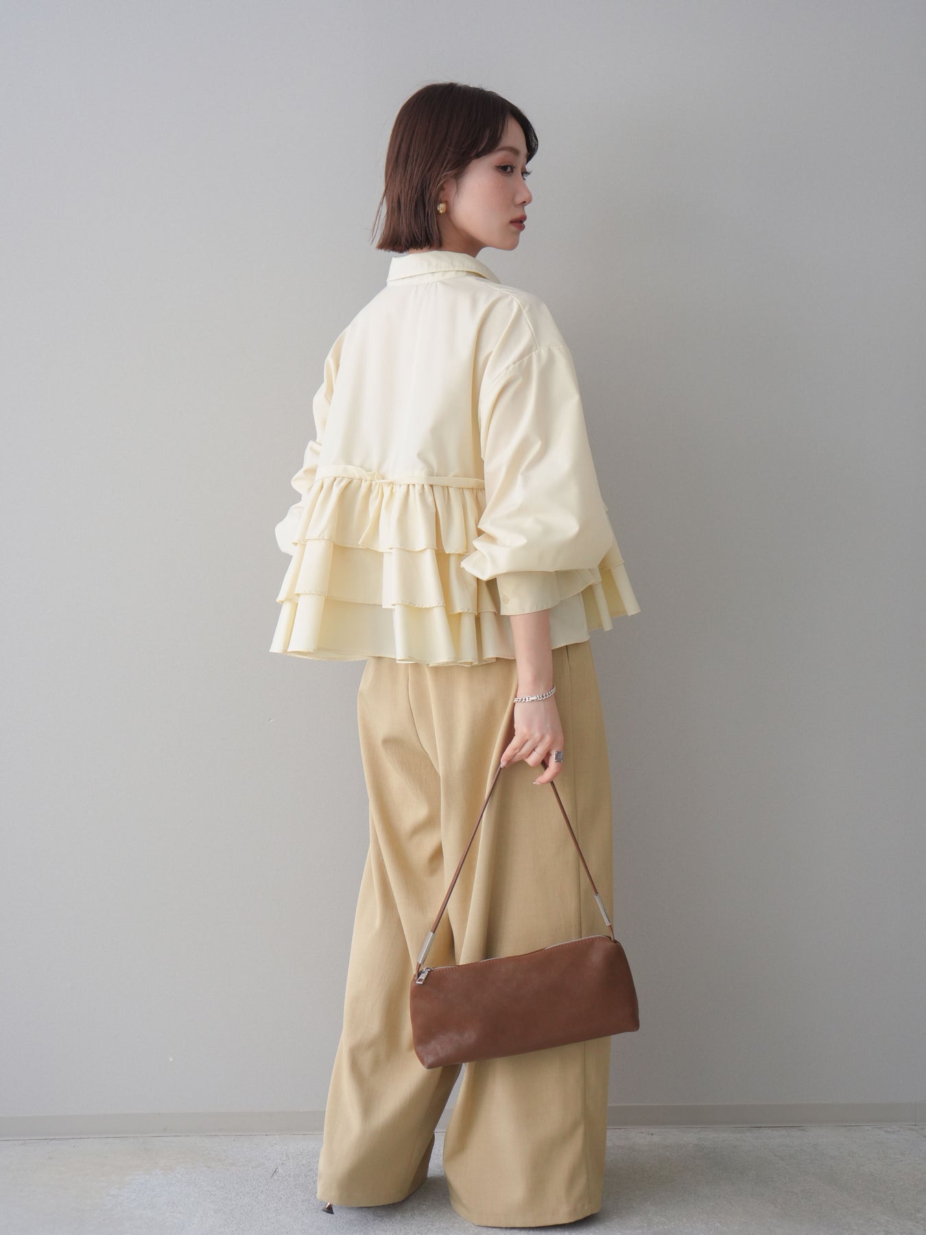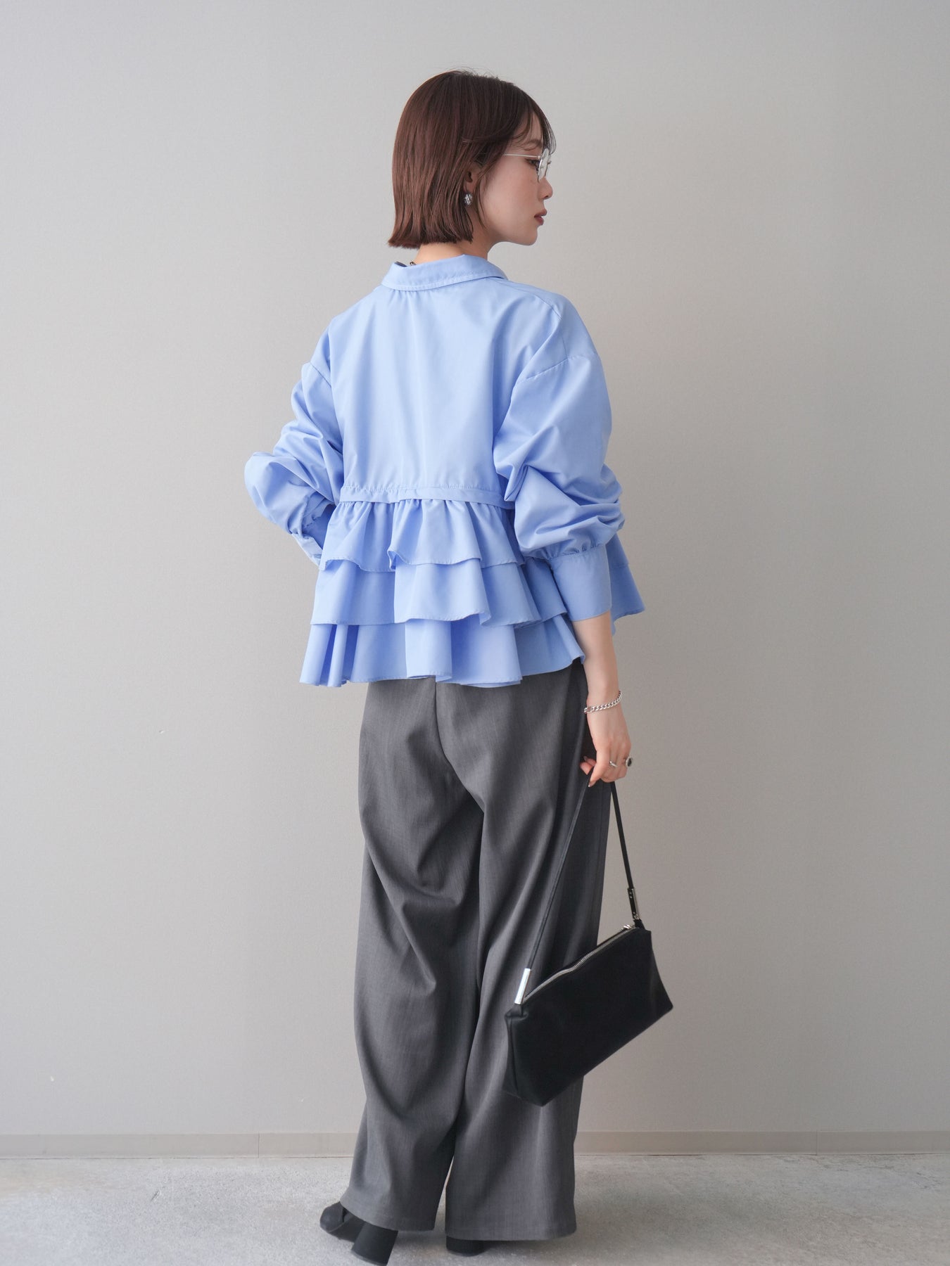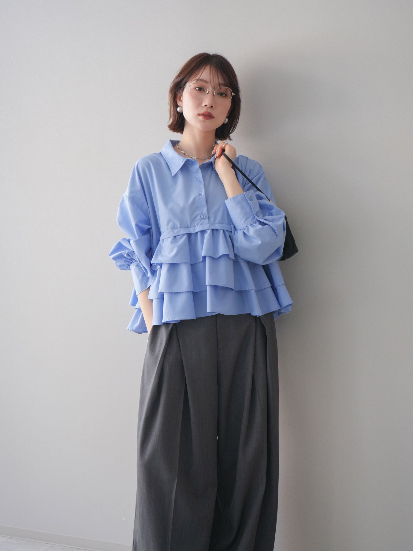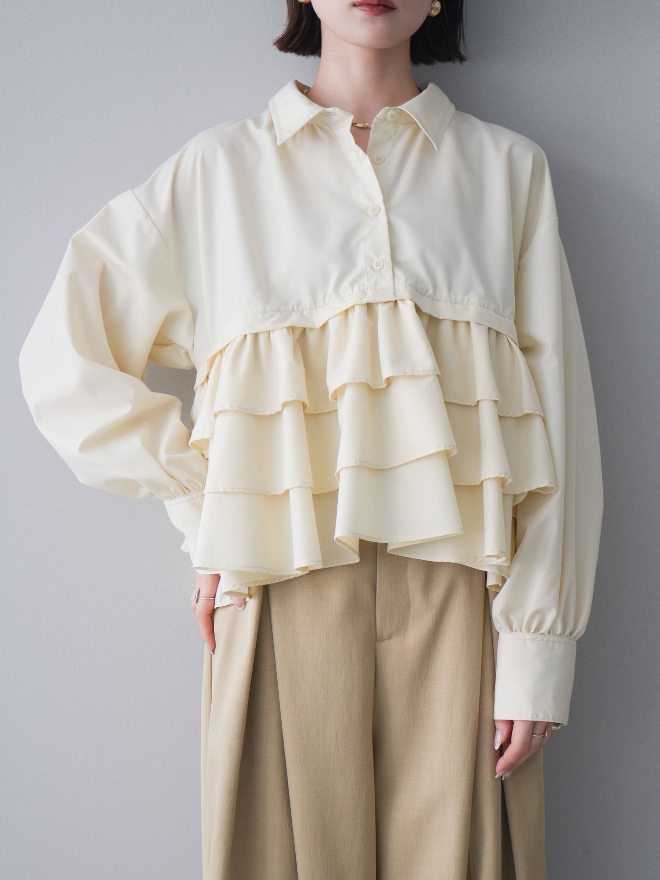ハリのあるブロード素材を使用し、立体的なティアードデザインが印象的なショートシャツ。切り替えから広がるフレアシルエットが軽やかな動きを演出し、スタイリングに自然な華やかさをプラスします。程よいショート丈でバランスが取りやすく、ワイドパンツやスカートとも好相性。きちんと感のある襟元と甘さを抑えたデザインで、デイリーからきれいめまで幅広く活躍する一着です。 ※ボトムス、キャミソール(インナー)以外の商品は一律でインナーは付属していません。