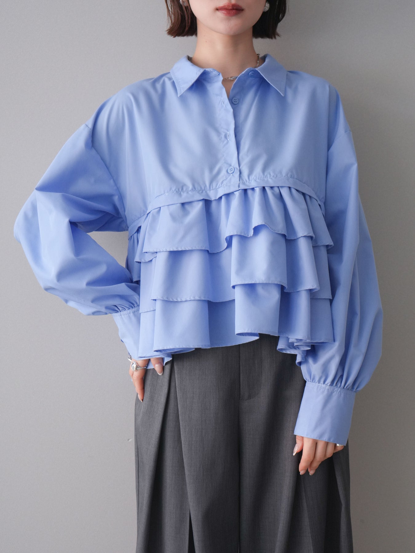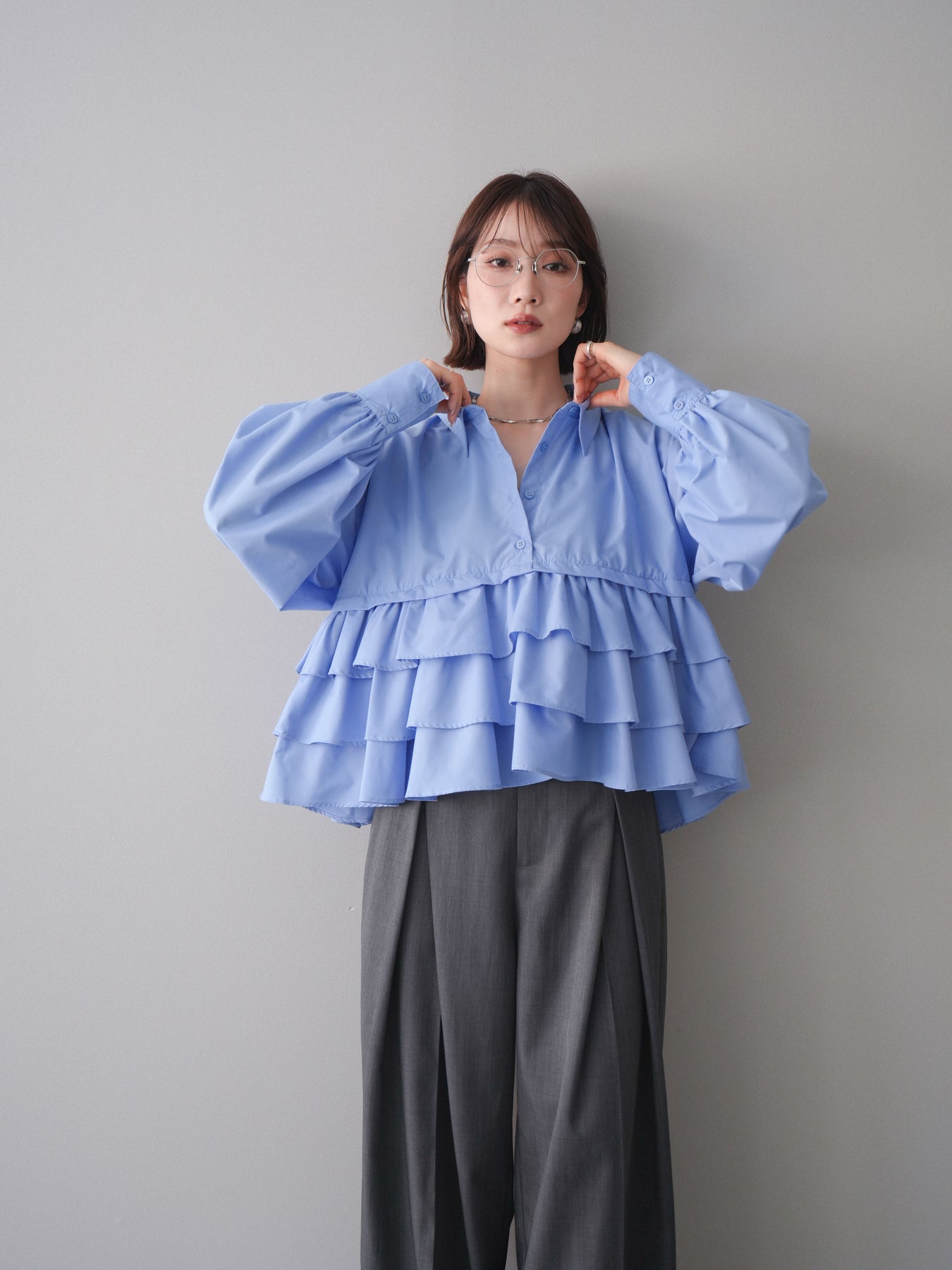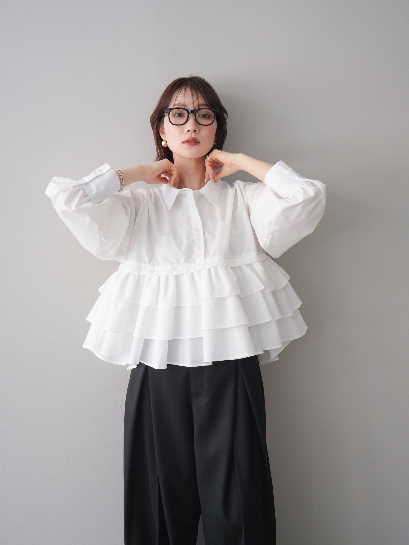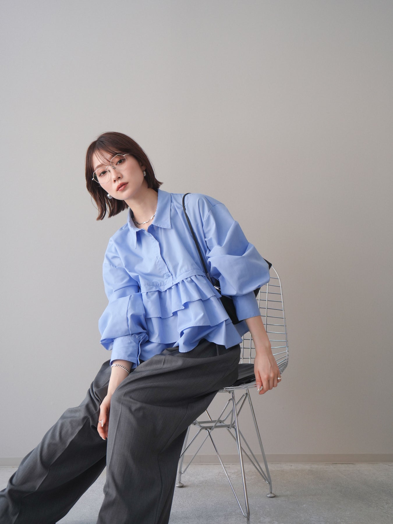 ハリのあるブロード素材を使用し、立体的なティアードデザインが印象的なショートシャツ。切り替えから広がるフレアシルエットが軽やかな動きを演出し、スタイリングに自然な華やかさをプラスします。程よいショート丈でバランスが取りやすく、ワイドパンツやスカートとも好相性。きちんと感のある襟元と甘さを抑えたデザインで、デイリーからきれいめまで幅広く活躍する一着です。 ※ボトムス、キャミソール(インナー)以外の商品は一律でインナーは付属していません。