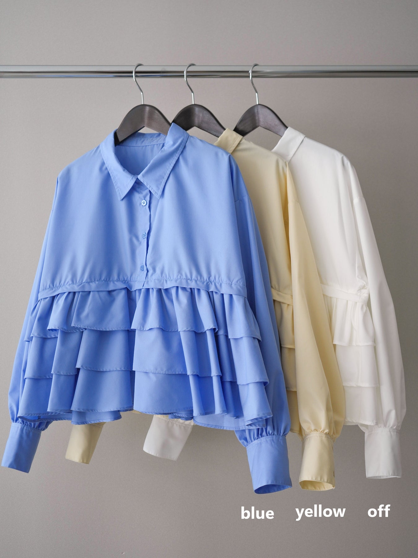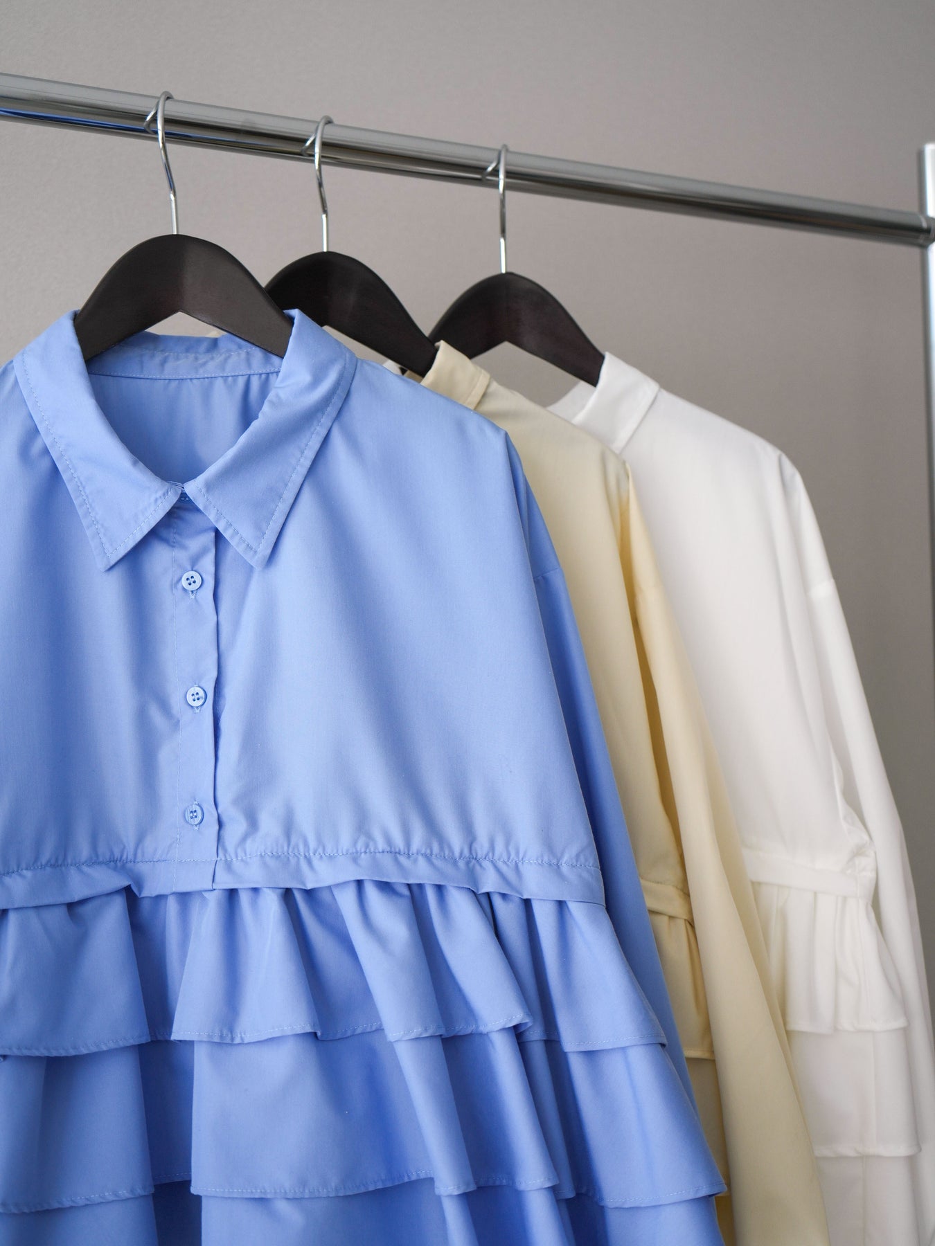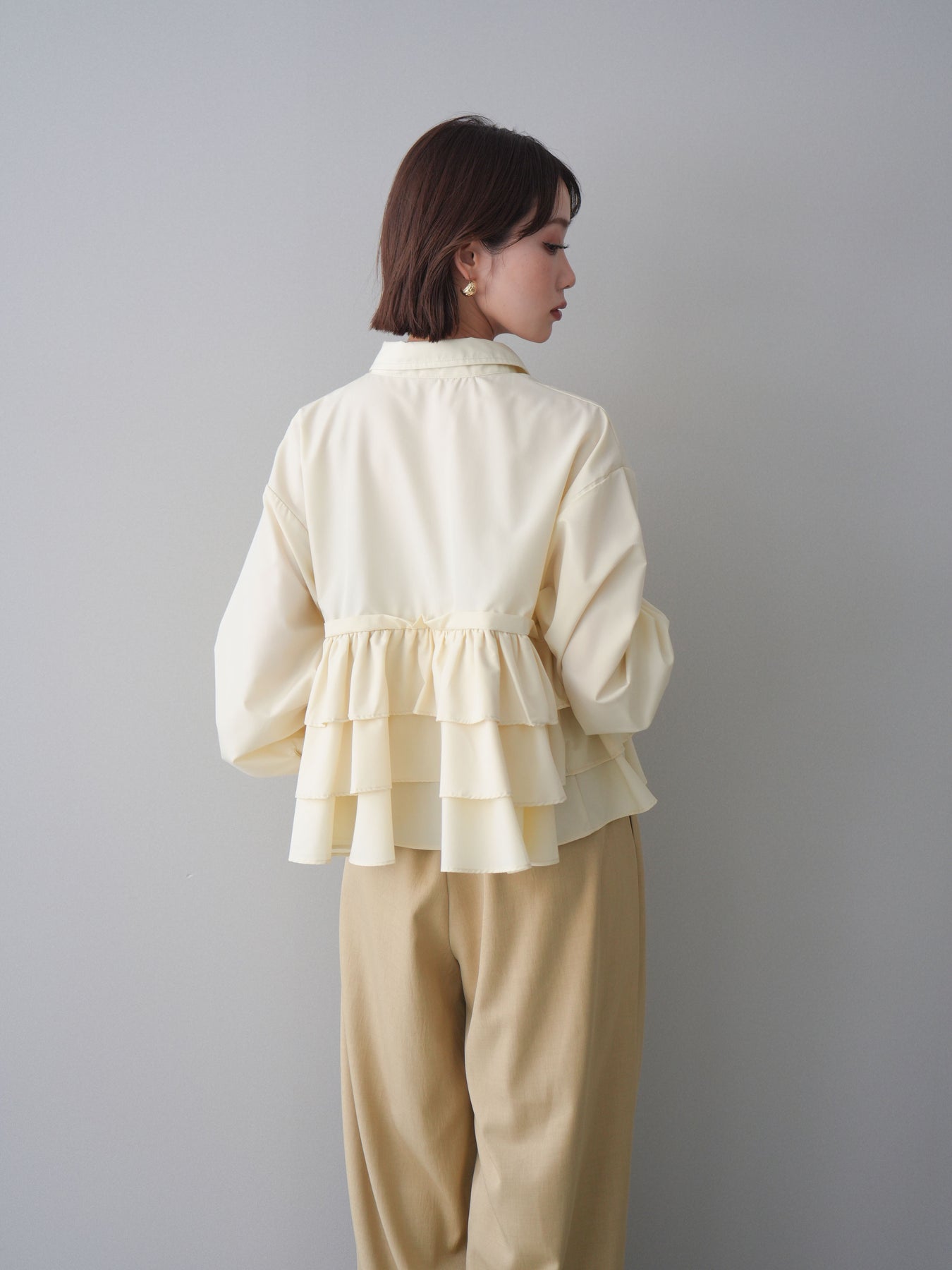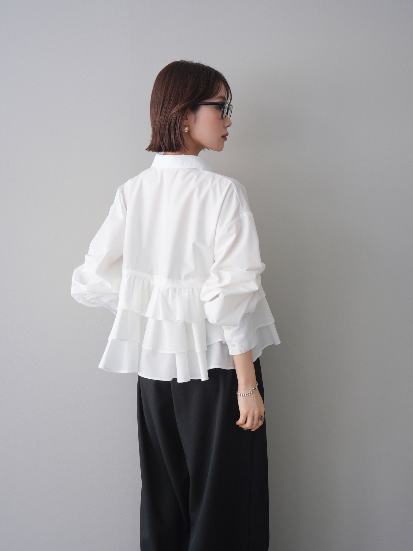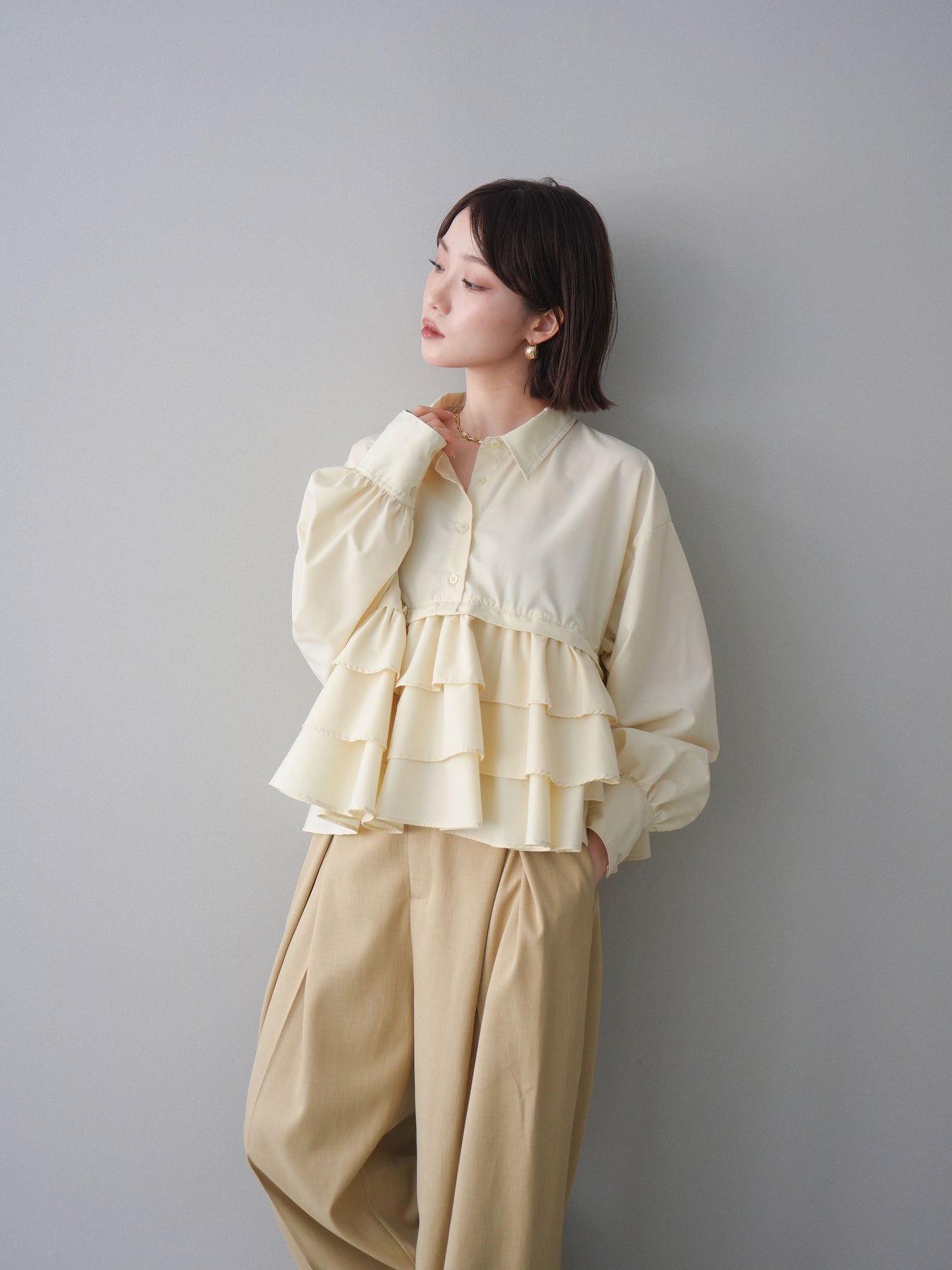 ハリのあるブロード素材を使用し、立体的なティアードデザインが印象的なショートシャツ。切り替えから広がるフレアシルエットが軽やかな動きを演出し、スタイリングに自然な華やかさをプラスします。程よいショート丈でバランスが取りやすく、ワイドパンツやスカートとも好相性。きちんと感のある襟元と甘さを抑えたデザインで、デイリーからきれいめまで幅広く活躍する一着です。 ※ボトムス、キャミソール(インナー)以外の商品は一律でインナーは付属していません。