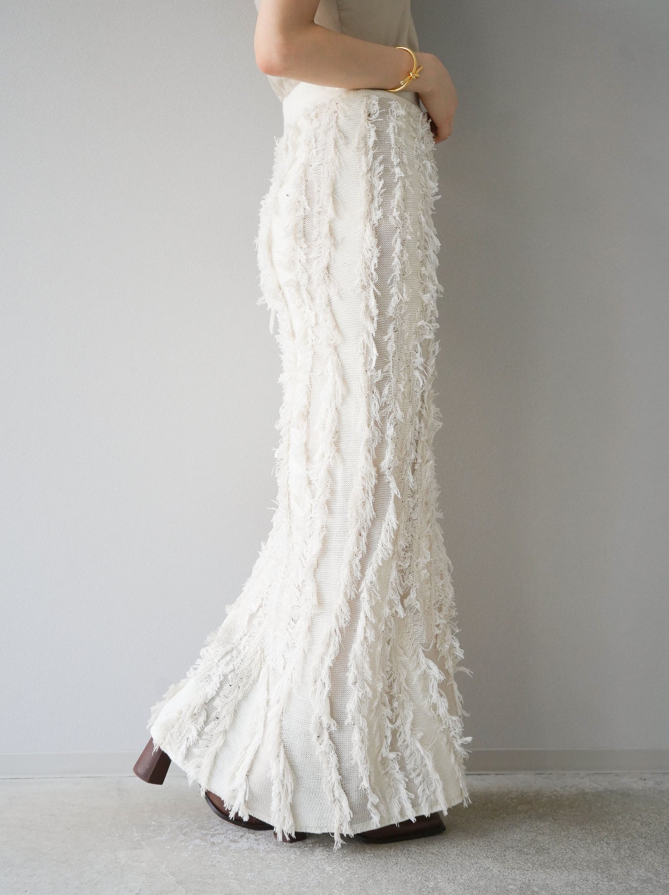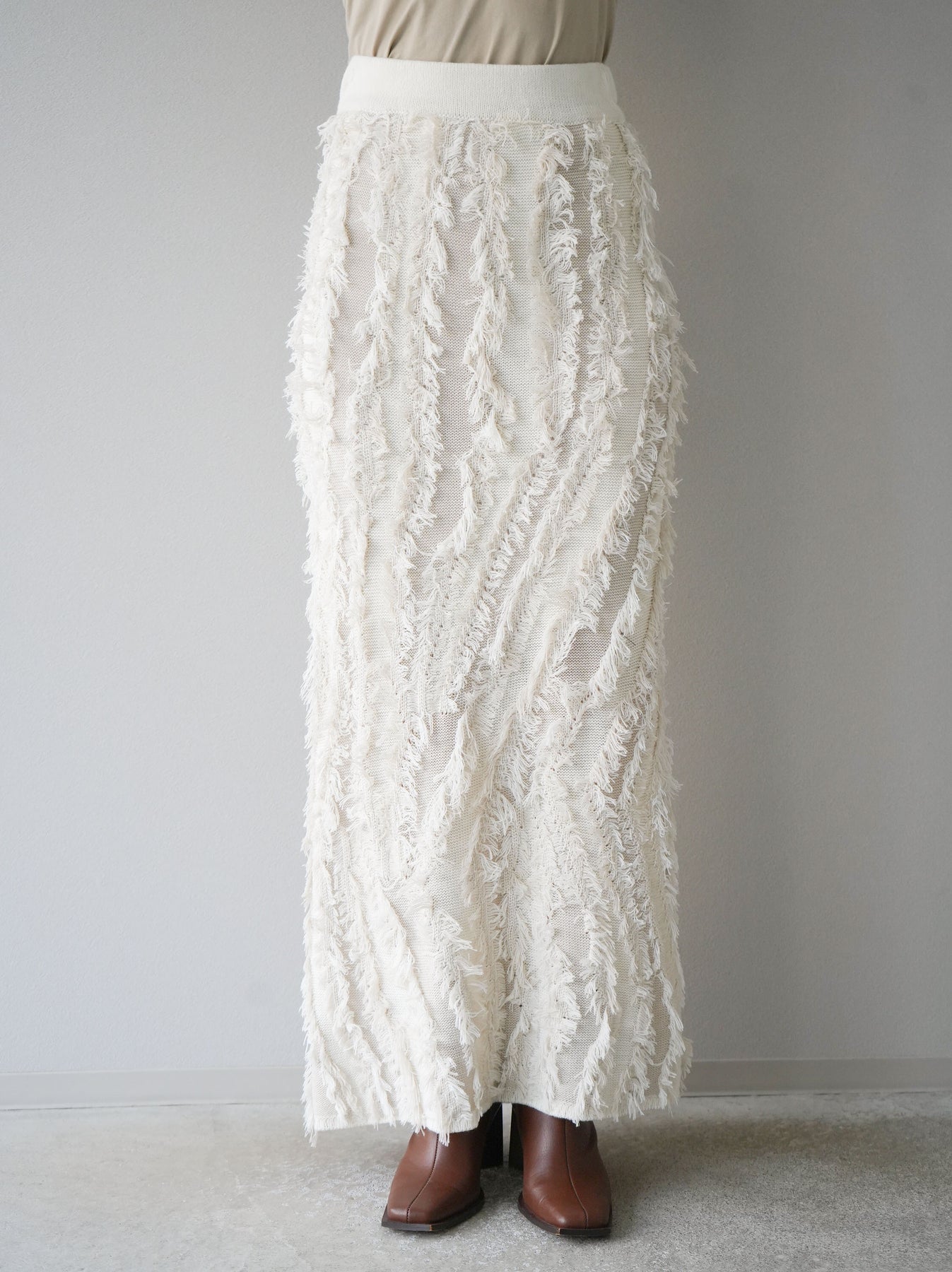 立体感のあるフリンジデザインが魅力のニットスカート。動きに合わせて揺れるフリンジが、エフォートレスながら印象的なシルエットを演出します。ウエストはゴム仕様でストレスフリーな着心地を提供。シンプルなトップスと合わせるだけで、コーディネートにトレンド感をプラスします。 ※ボトムス、キャミソール(インナー)以外の商品は一律でインナーは付属していません。
