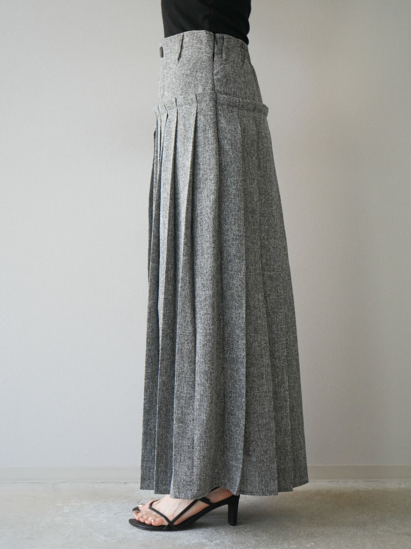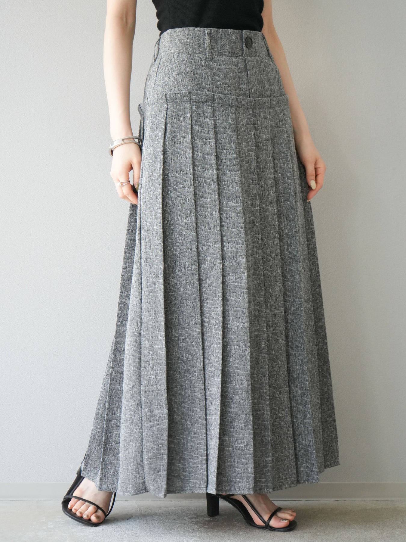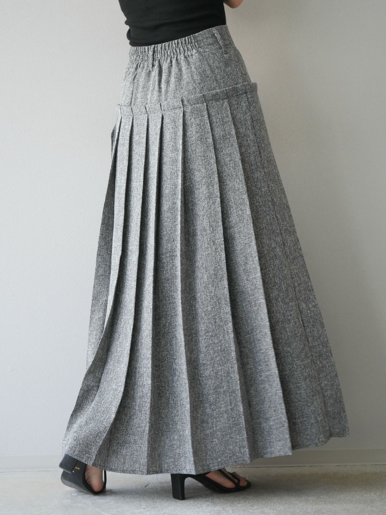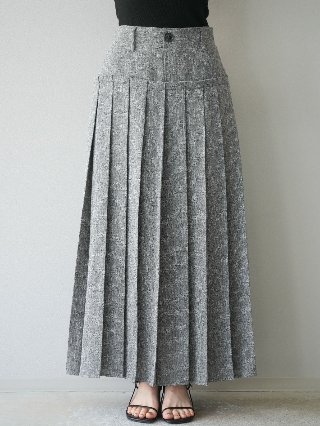 上品なツイード素材と存在感のあるプリーツデザインが魅力のロングスカート。落ち感のあるしなやかなミックスツイード素材を使用し、動くたびに揺れるプリーツがフェミニンな印象をプラス。ウエスト部分はすっきりと仕上げており、トップスインのスタイルもきれいに決まります。長めの丈感が大人っぽく、シーズンレスで活躍する一枚です。カジュアルなTシャツ合わせで抜け感を出したり、ブラウスやジャケットできちんと感を出すなど、幅広い着こなしに対応します。オン・オフ問わず重宝するアイテムです。