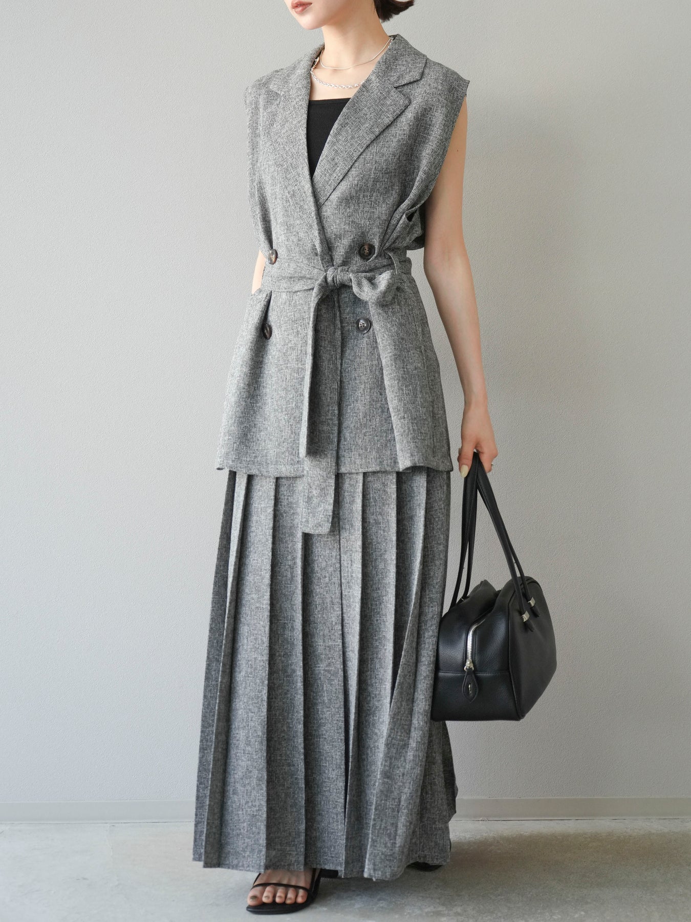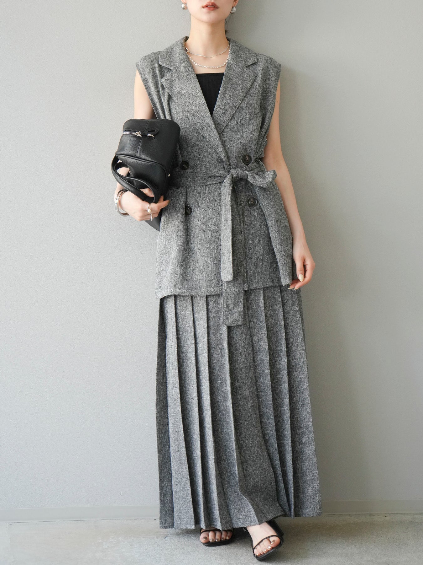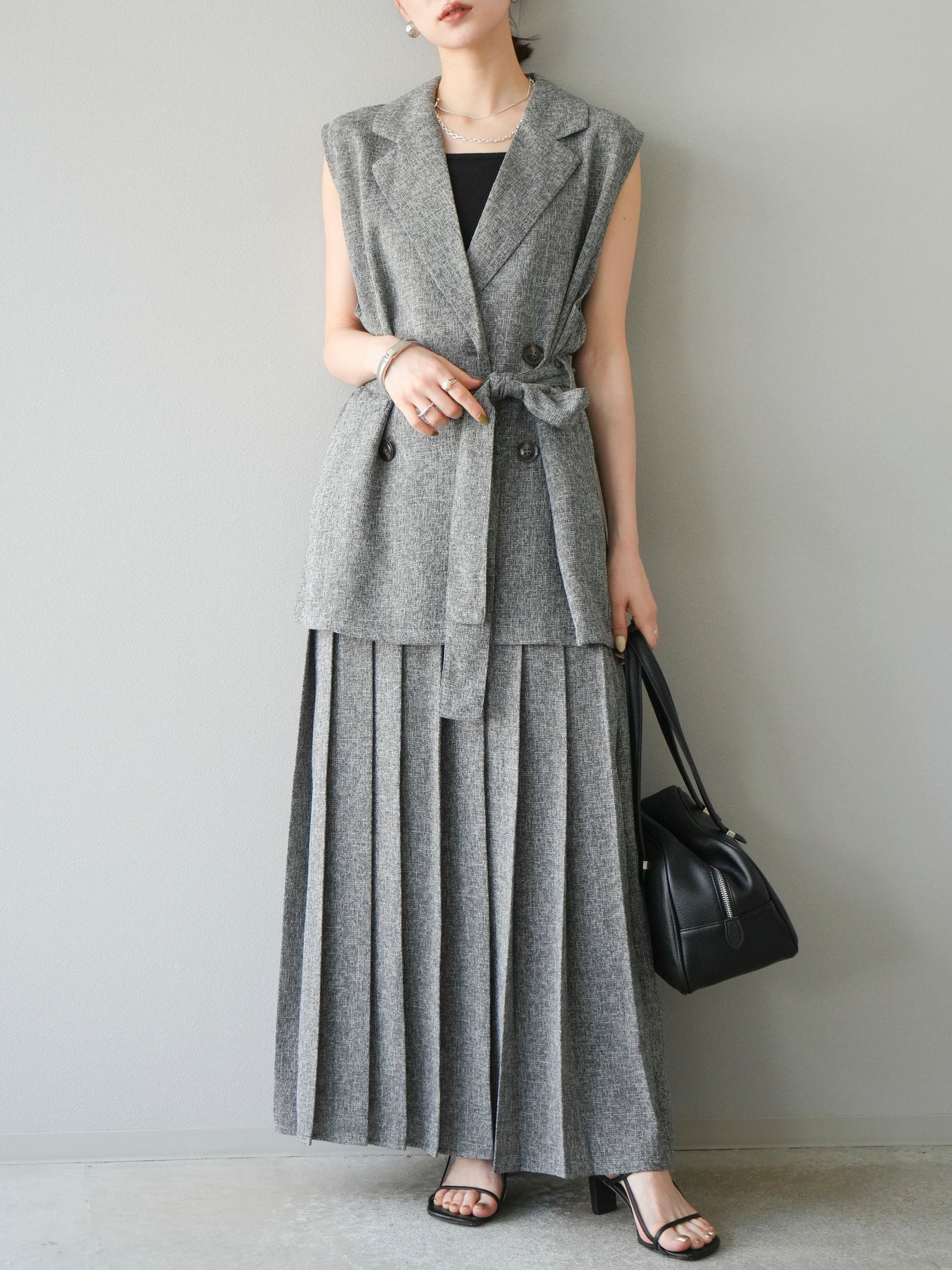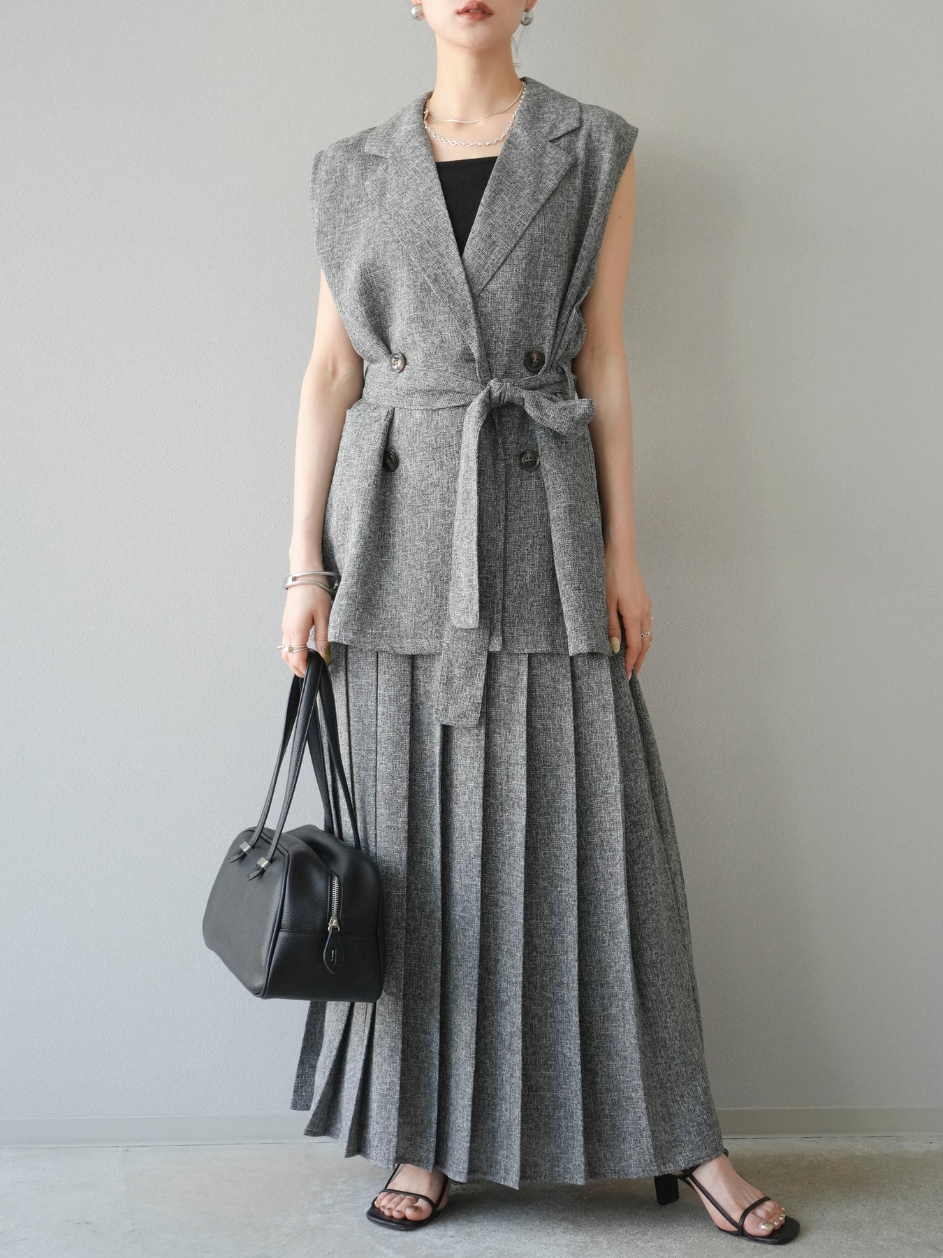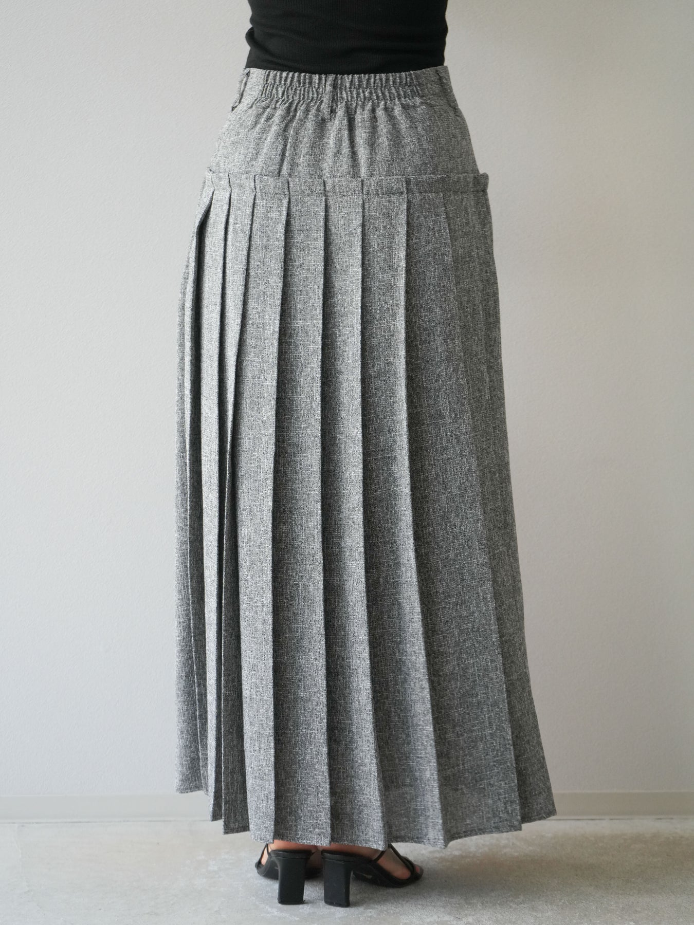 上品なツイード素材と存在感のあるプリーツデザインが魅力のロングスカート。落ち感のあるしなやかなミックスツイード素材を使用し、動くたびに揺れるプリーツがフェミニンな印象をプラス。ウエスト部分はすっきりと仕上げており、トップスインのスタイルもきれいに決まります。長めの丈感が大人っぽく、シーズンレスで活躍する一枚です。カジュアルなTシャツ合わせで抜け感を出したり、ブラウスやジャケットできちんと感を出すなど、幅広い着こなしに対応します。オン・オフ問わず重宝するアイテムです。