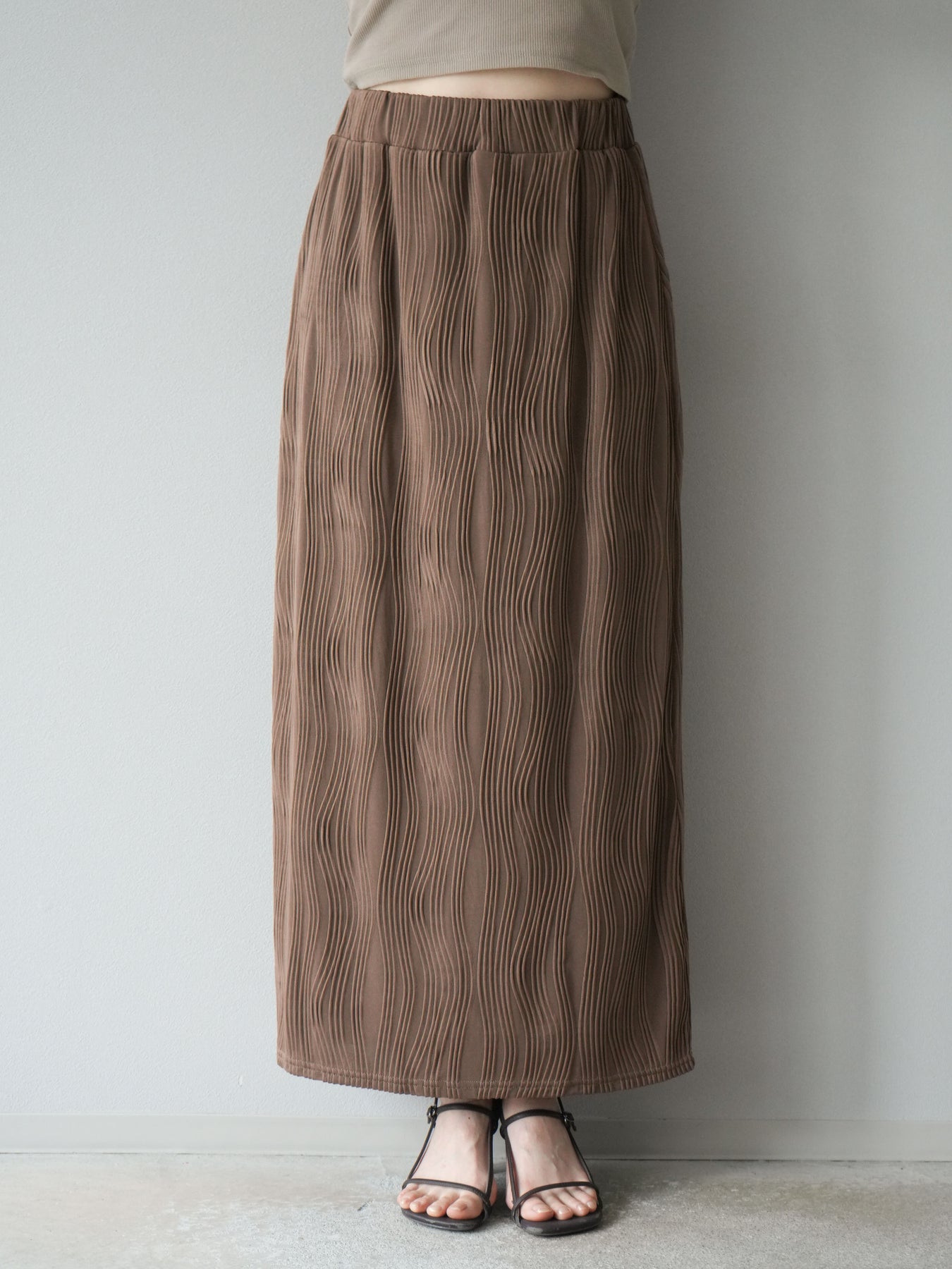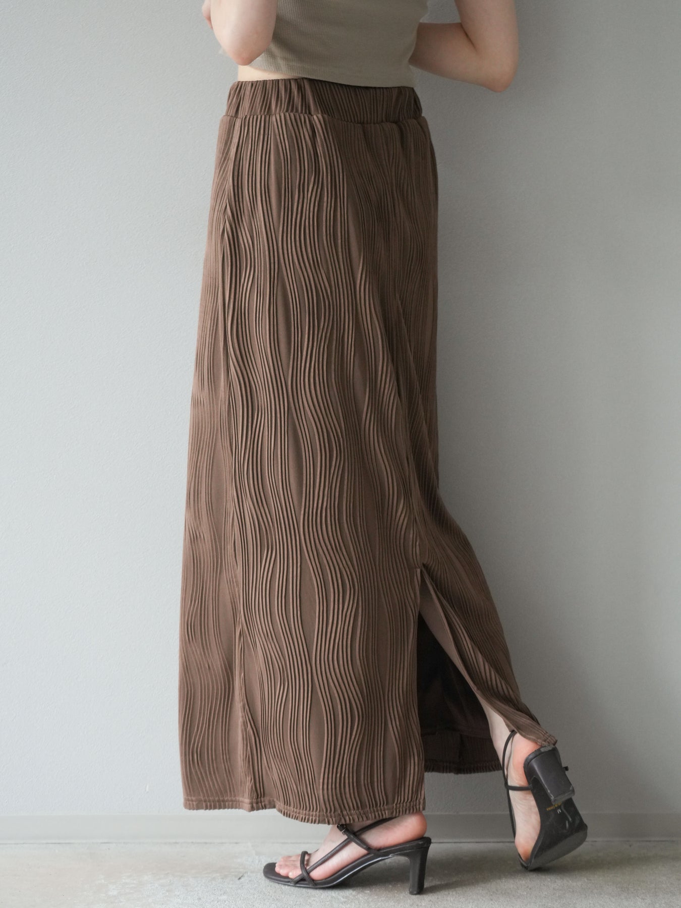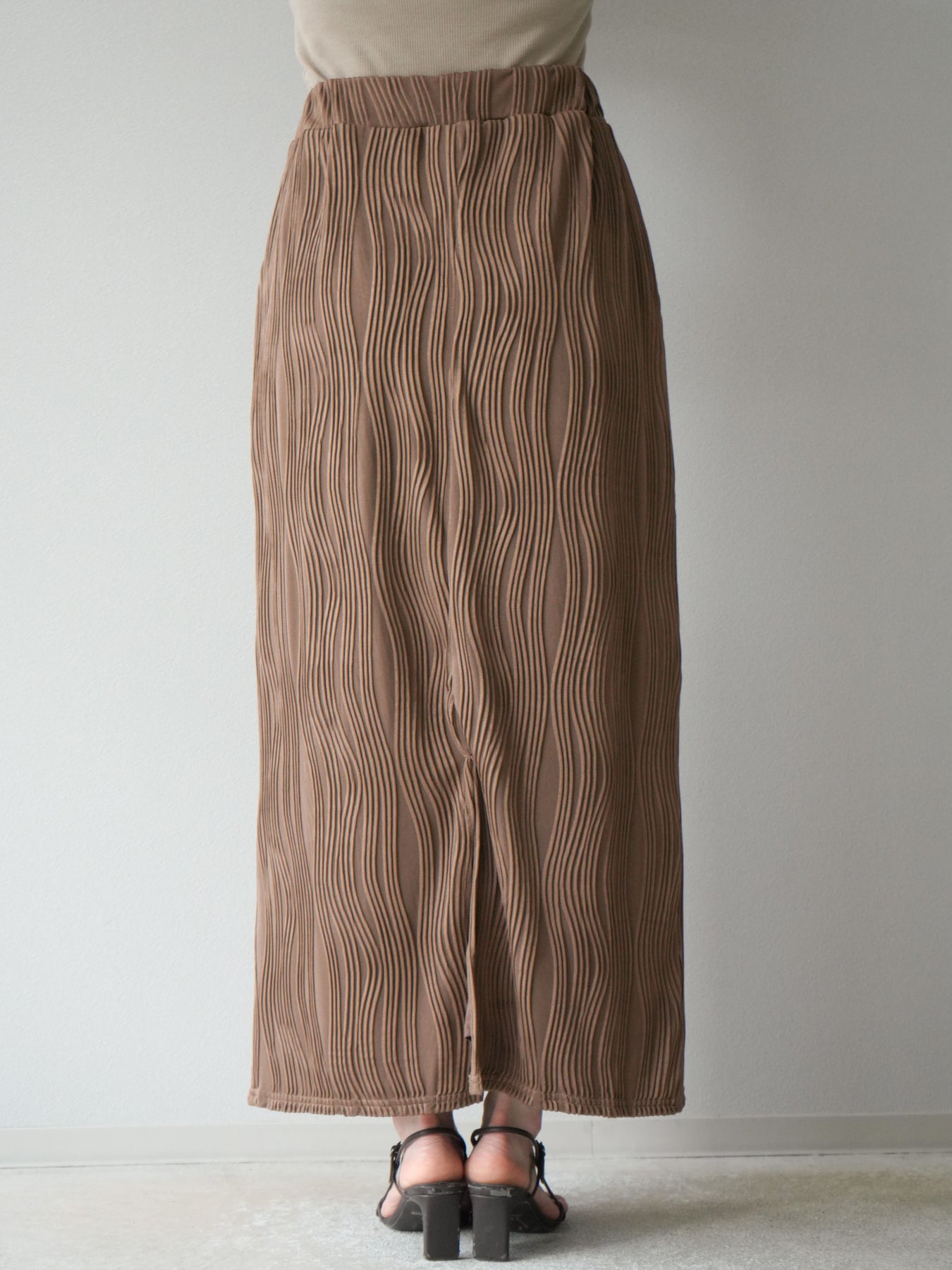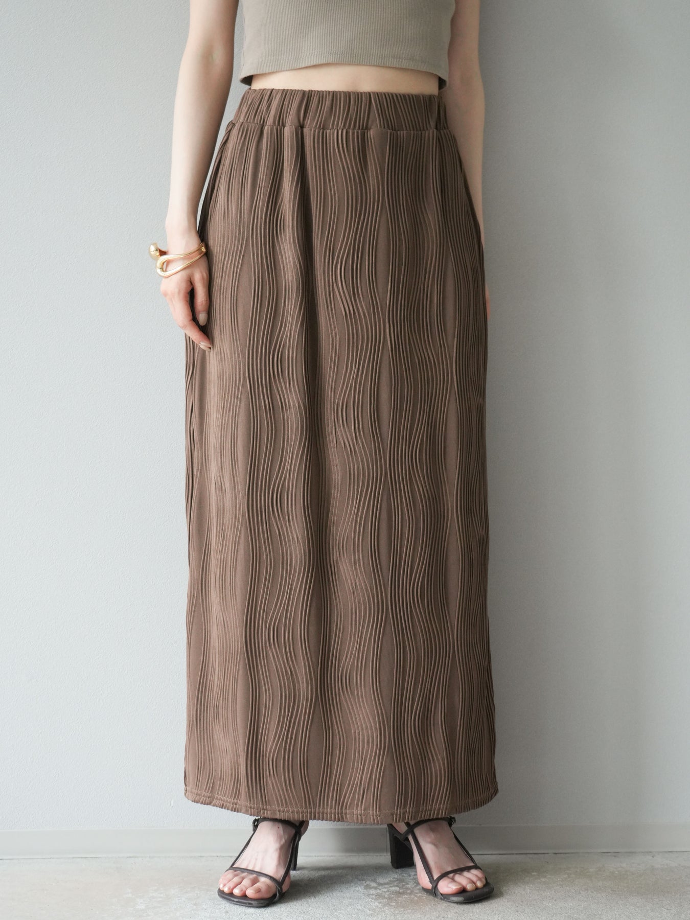 立体的なウェーブ状パイピング素材が特徴のタイトスカート。細かい凹凸のある生地感が動きに表情を加え、シンプルながらも存在感のある1枚に仕上がっています。ウエストはゴム仕様でストレスフリーな穿き心地を実現しながら、すっきりとしたIラインシルエットで美脚効果も◎。カジュアルにもモードにも着回し可能なアイテムで、同素材のトップスとセットアップで着用すればより洗練されたスタイリングに。 ※ボトムス、キャミソール(インナー)以外の商品は一律でインナーは付属していません。