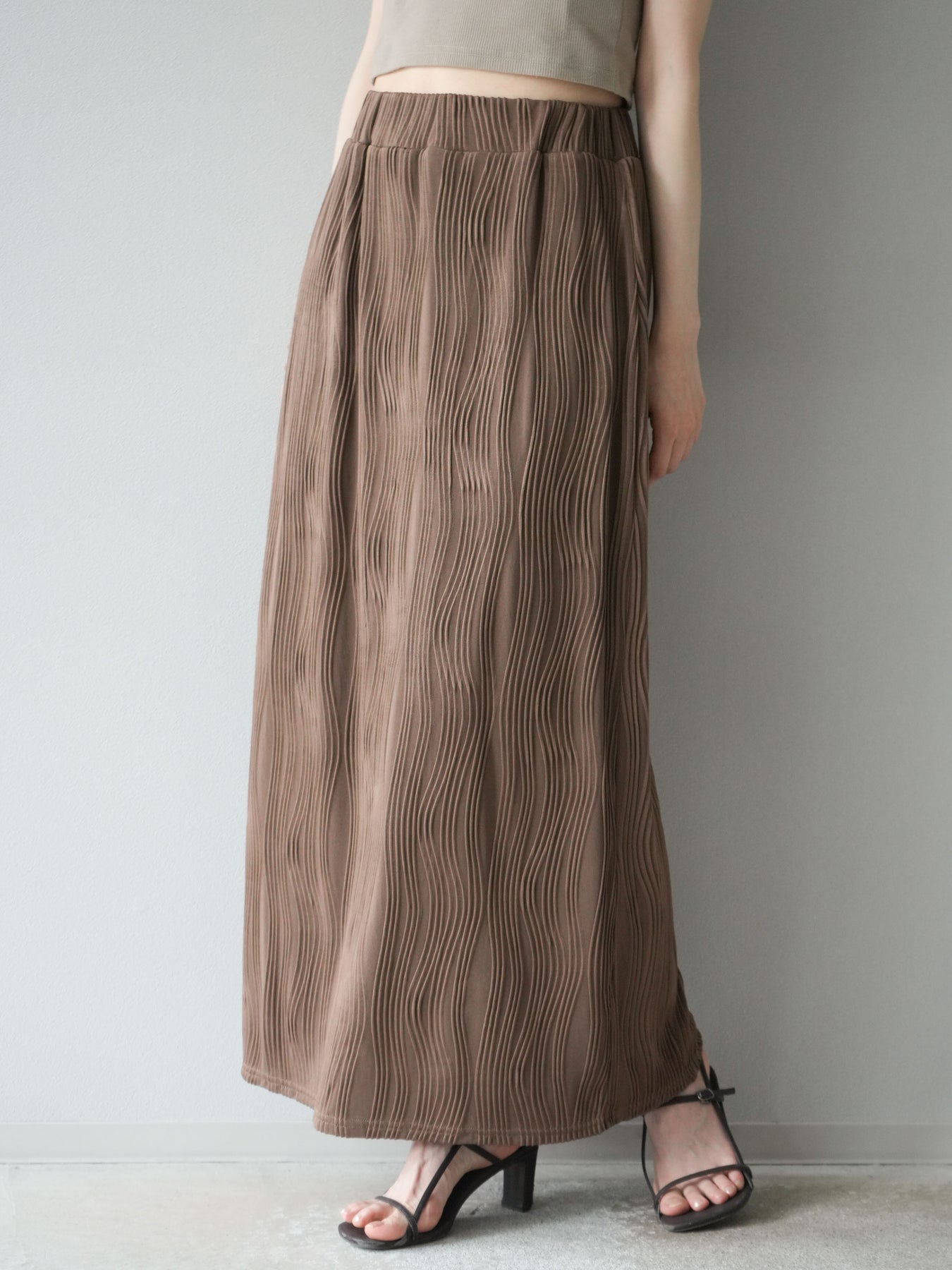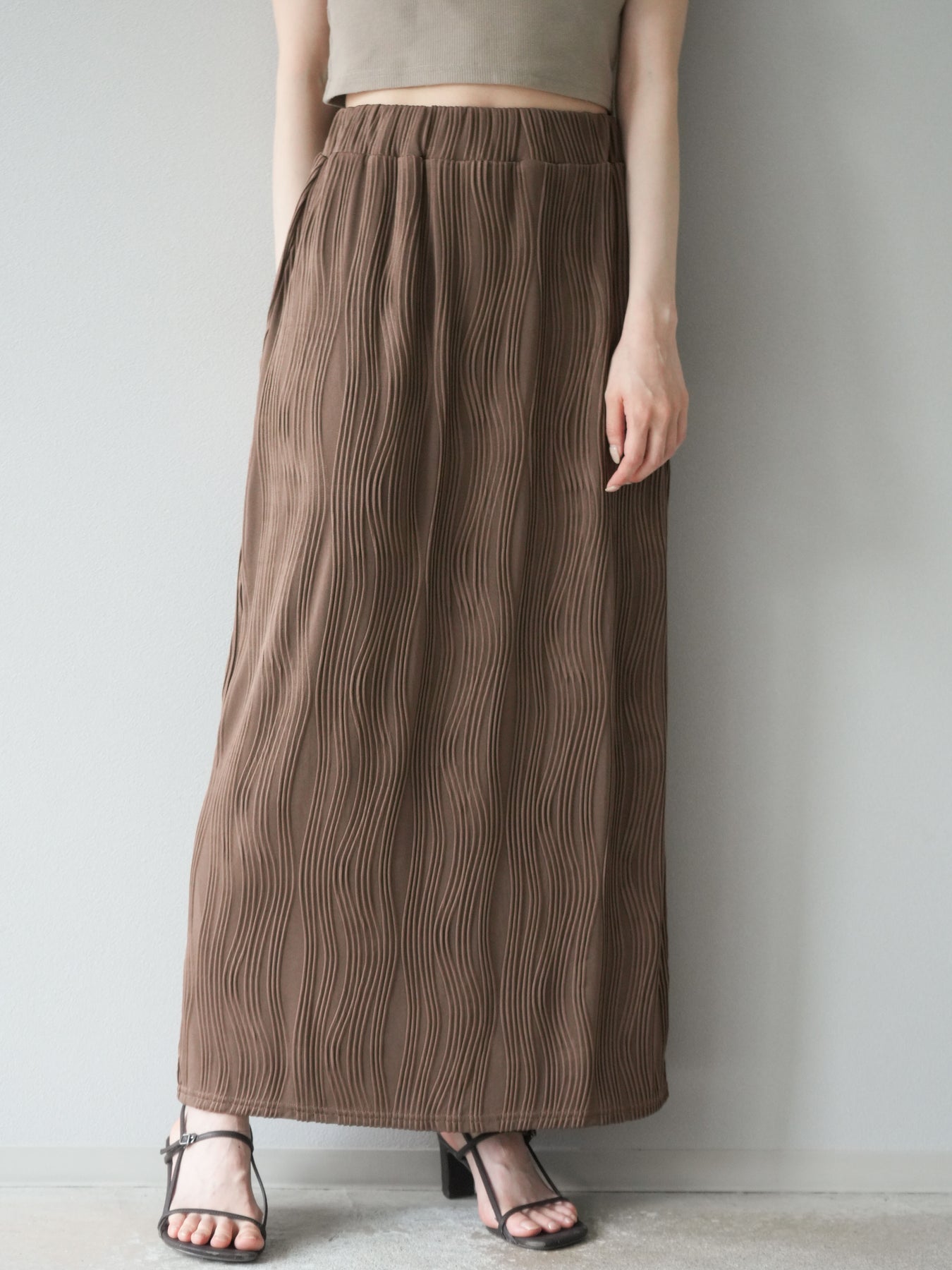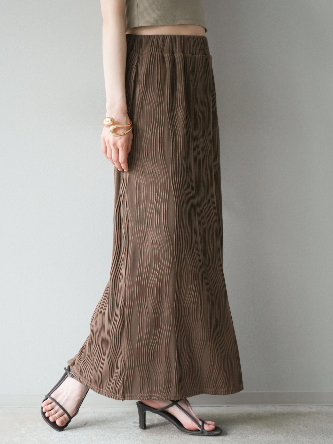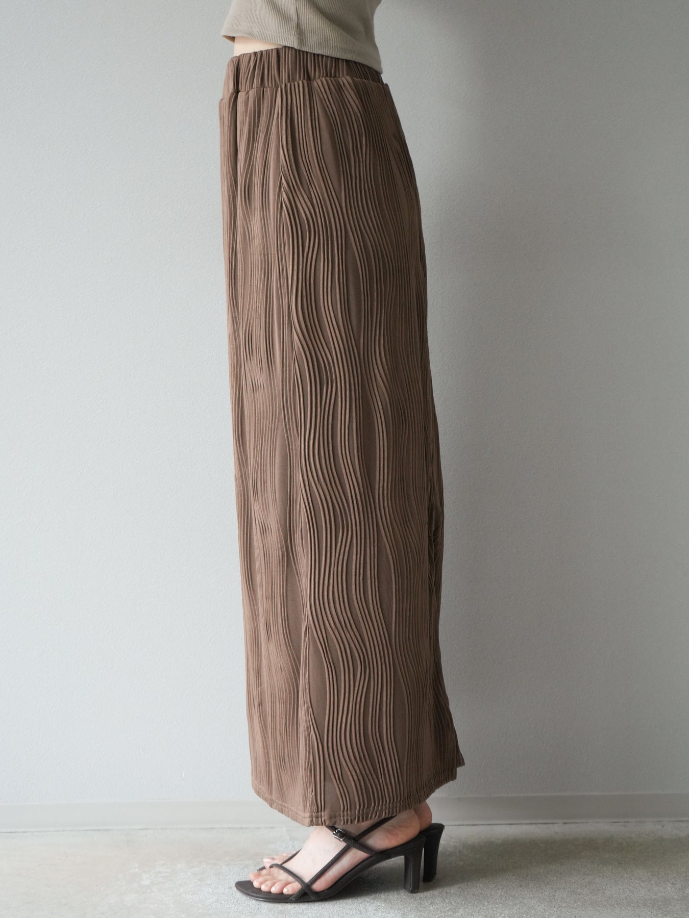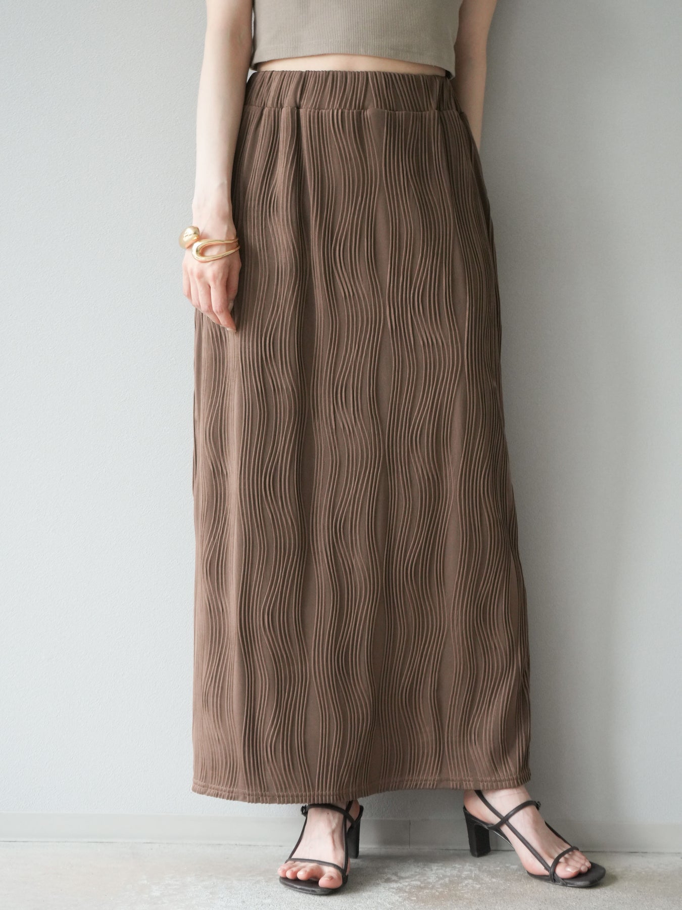 立体的なウェーブ状パイピング素材が特徴のタイトスカート。細かい凹凸のある生地感が動きに表情を加え、シンプルながらも存在感のある1枚に仕上がっています。ウエストはゴム仕様でストレスフリーな穿き心地を実現しながら、すっきりとしたIラインシルエットで美脚効果も◎。カジュアルにもモードにも着回し可能なアイテムで、同素材のトップスとセットアップで着用すればより洗練されたスタイリングに。 ※ボトムス、キャミソール(インナー)以外の商品は一律でインナーは付属していません。