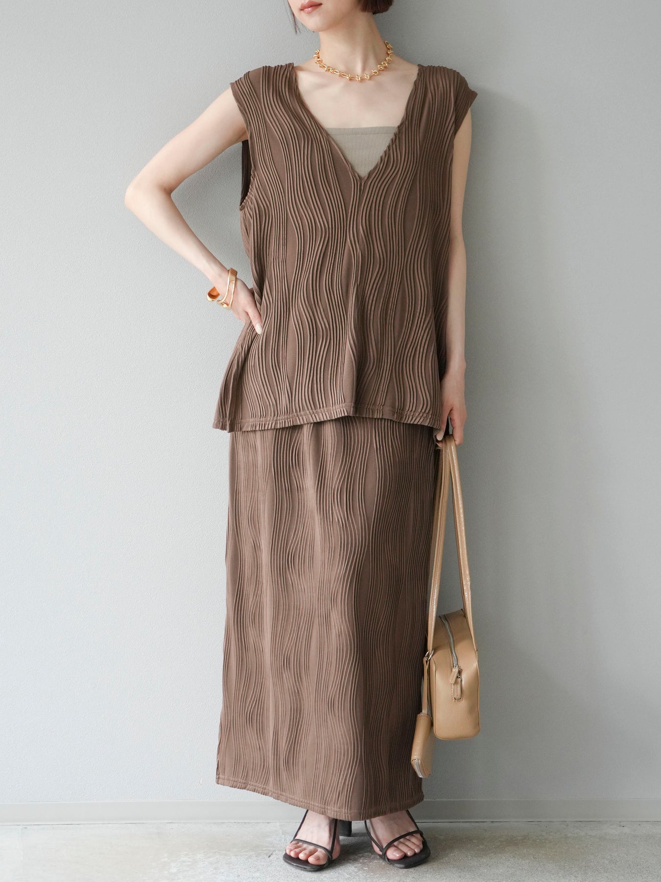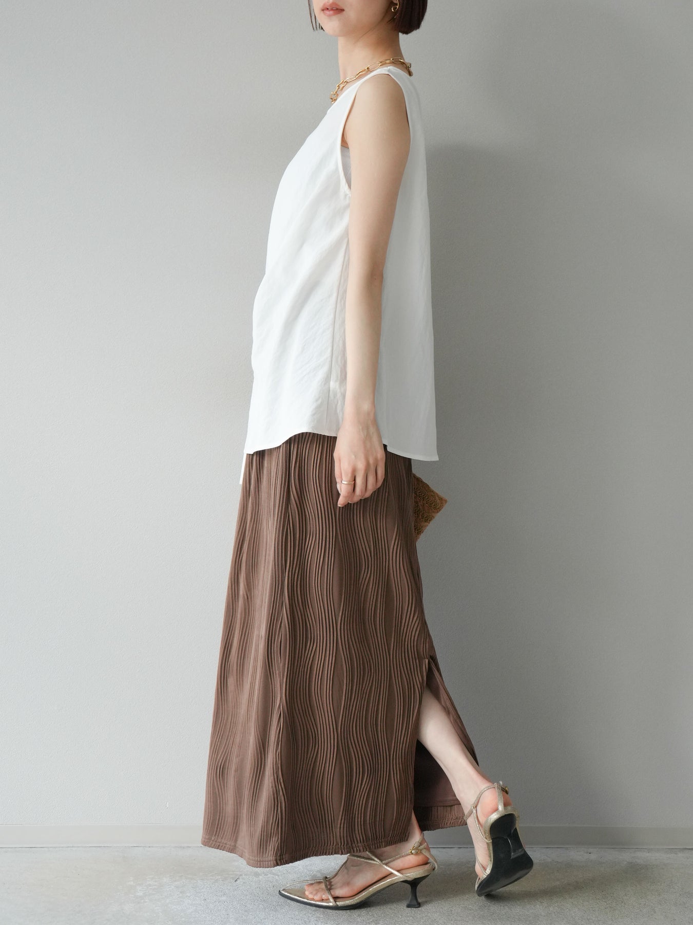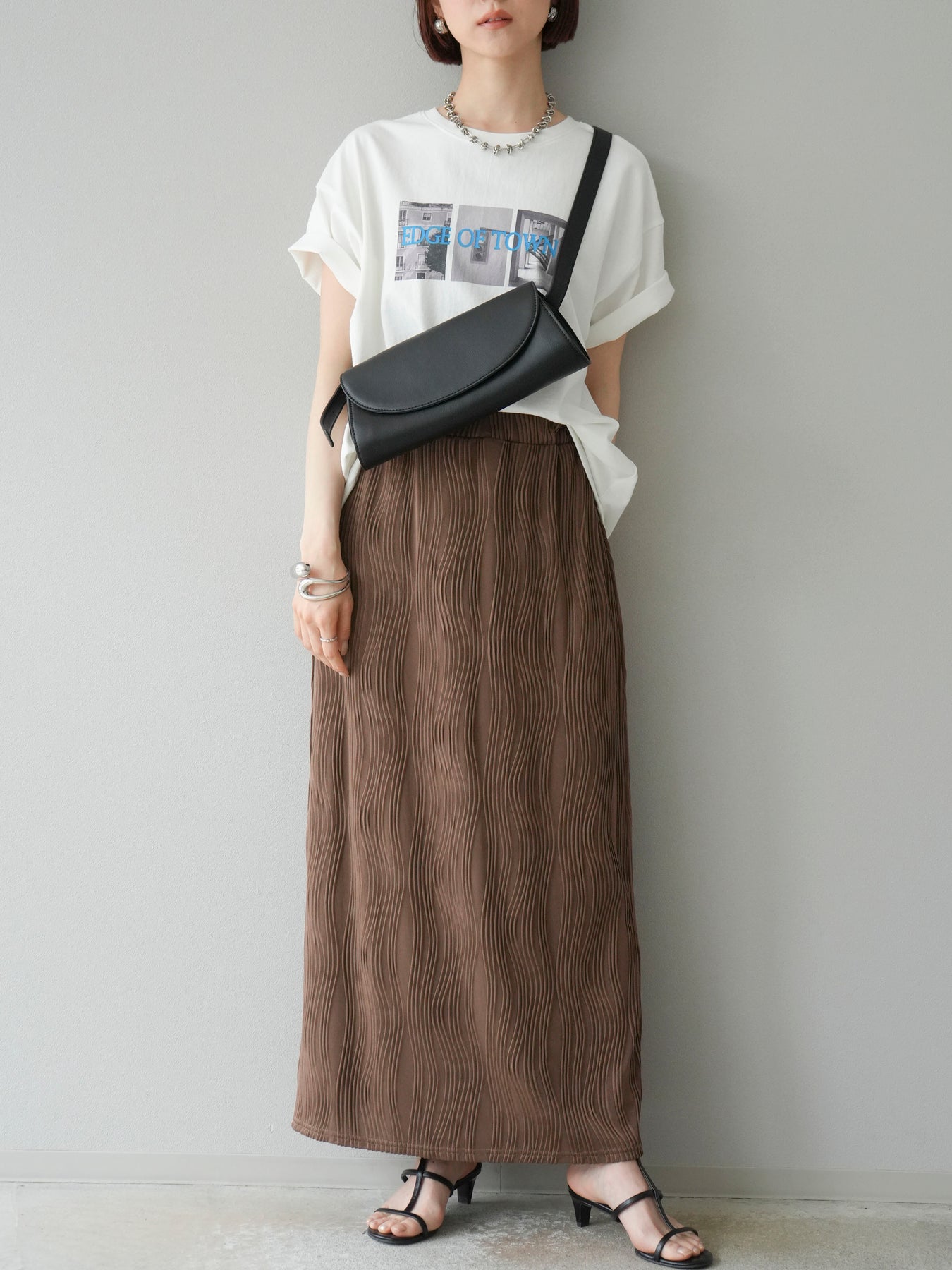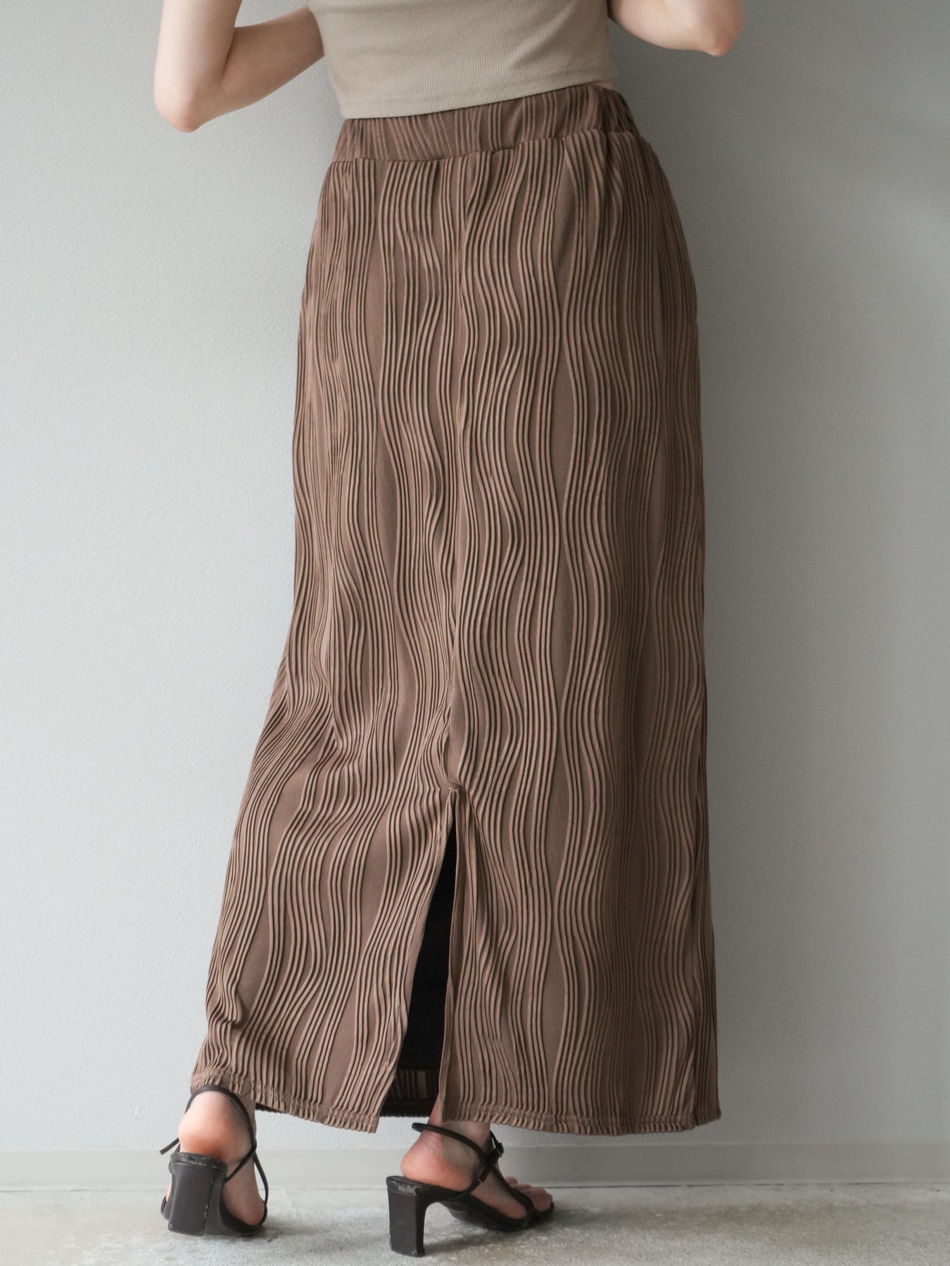 立体的なウェーブ状パイピング素材が特徴のタイトスカート。細かい凹凸のある生地感が動きに表情を加え、シンプルながらも存在感のある1枚に仕上がっています。ウエストはゴム仕様でストレスフリーな穿き心地を実現しながら、すっきりとしたIラインシルエットで美脚効果も◎。カジュアルにもモードにも着回し可能なアイテムで、同素材のトップスとセットアップで着用すればより洗練されたスタイリングに。 ※ボトムス、キャミソール(インナー)以外の商品は一律でインナーは付属していません。