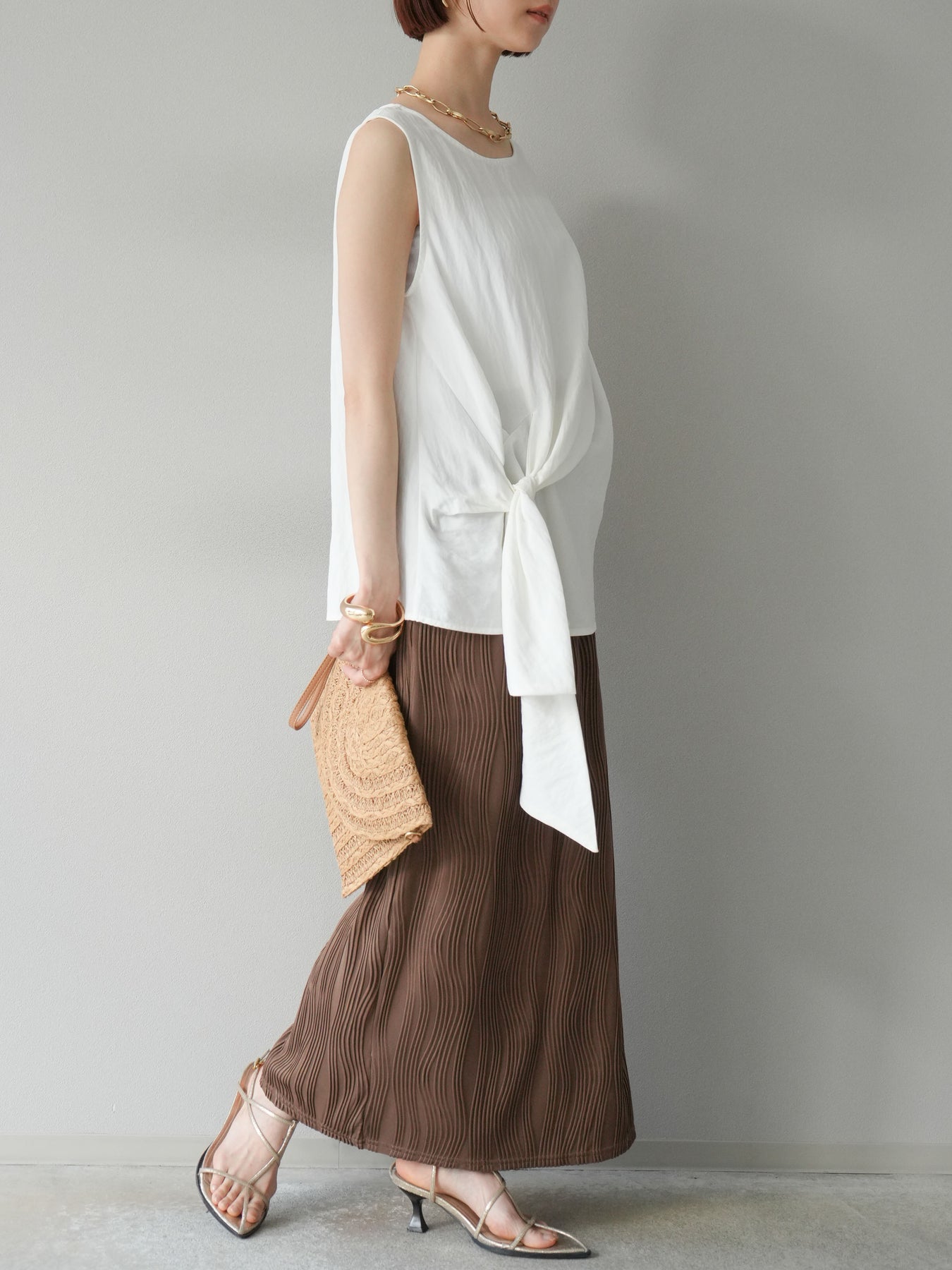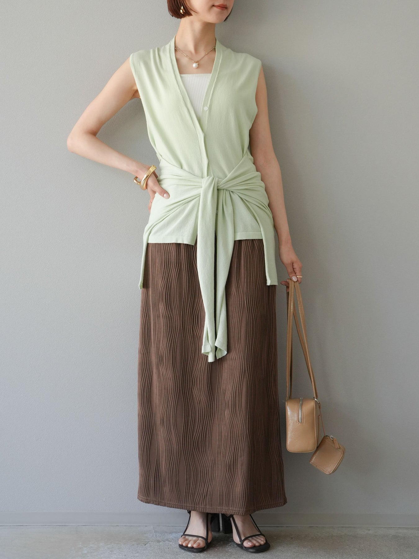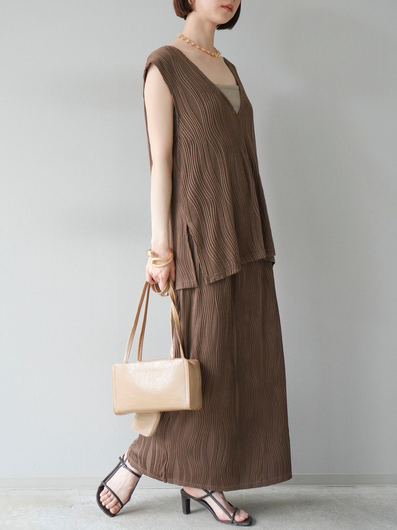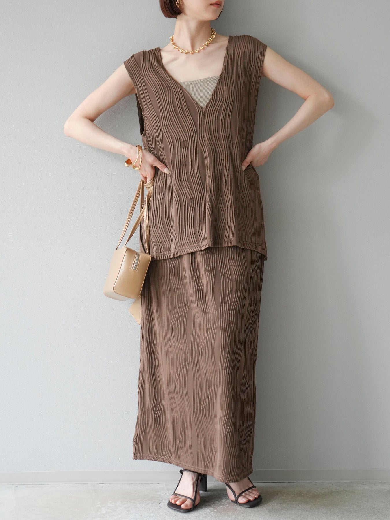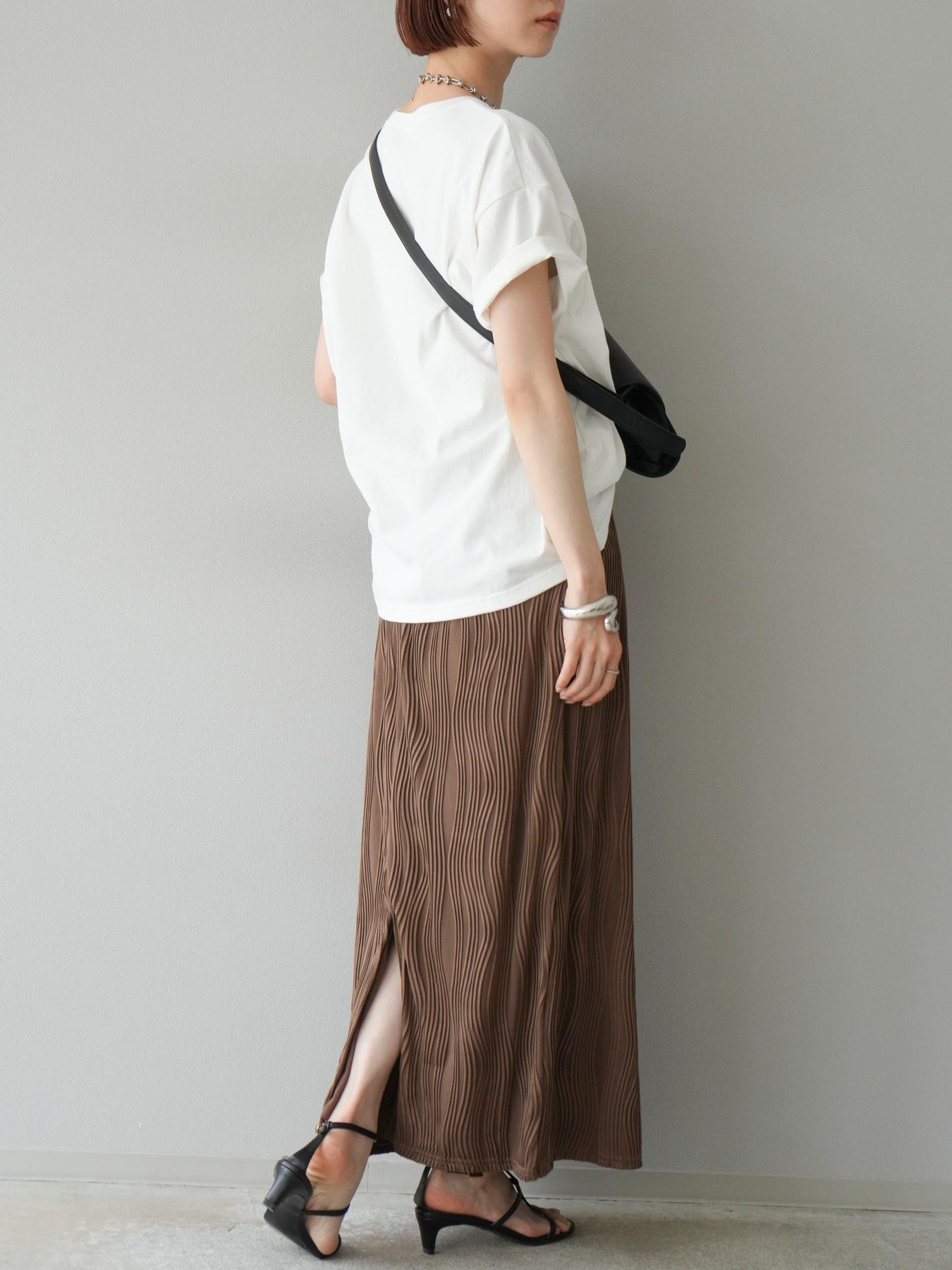 立体的なウェーブ状パイピング素材が特徴のタイトスカート。細かい凹凸のある生地感が動きに表情を加え、シンプルながらも存在感のある1枚に仕上がっています。ウエストはゴム仕様でストレスフリーな穿き心地を実現しながら、すっきりとしたIラインシルエットで美脚効果も◎。カジュアルにもモードにも着回し可能なアイテムで、同素材のトップスとセットアップで着用すればより洗練されたスタイリングに。 ※ボトムス、キャミソール(インナー)以外の商品は一律でインナーは付属していません。