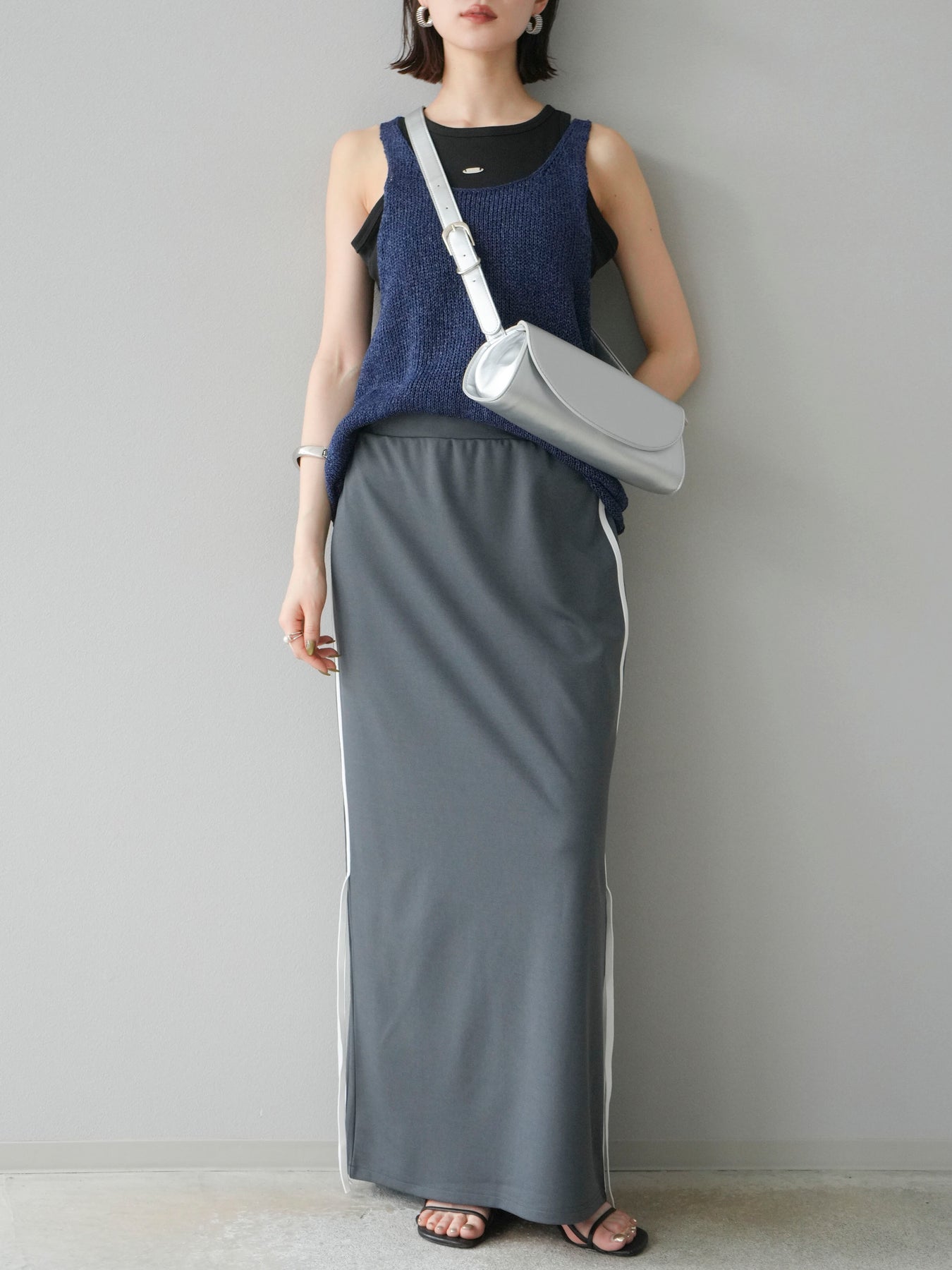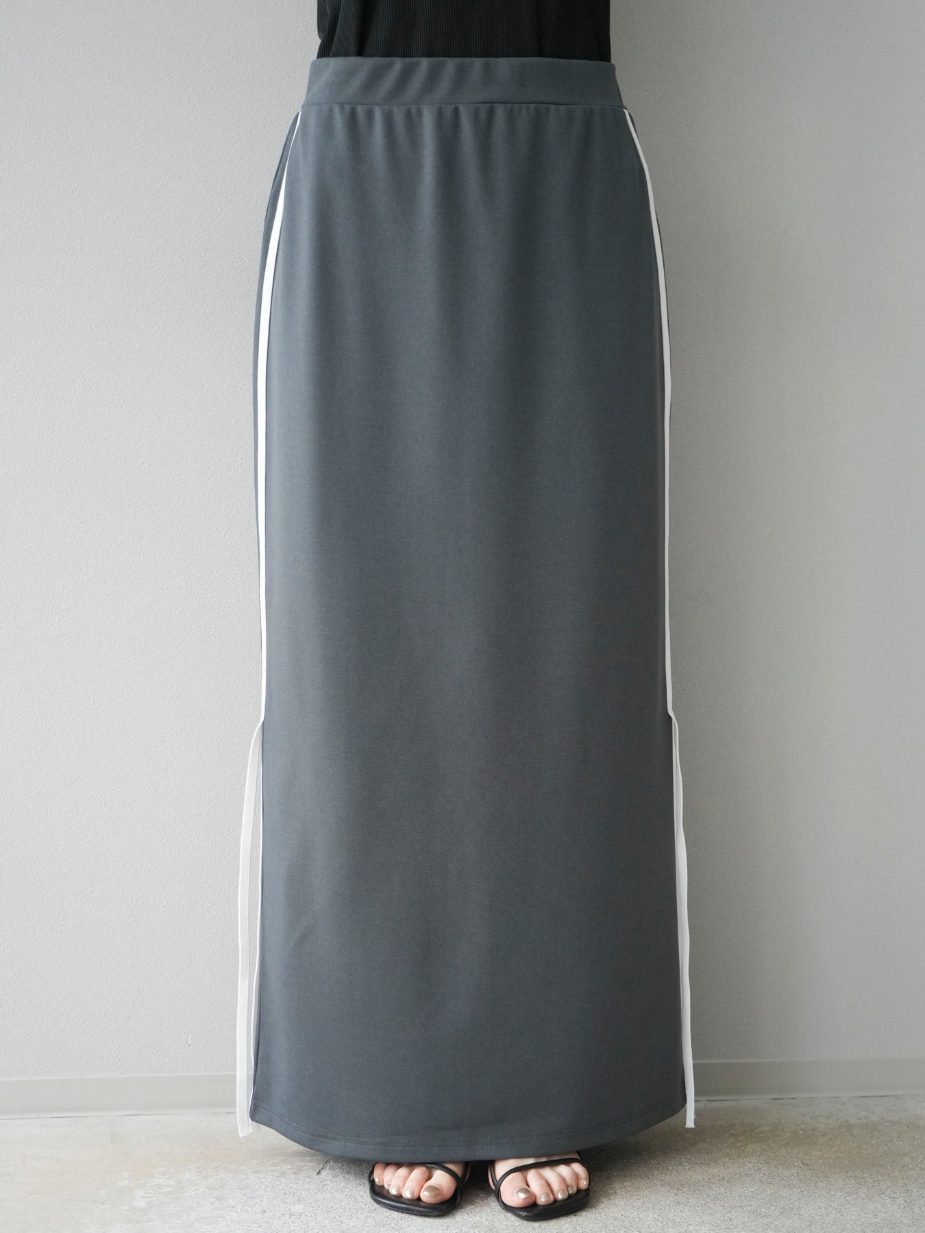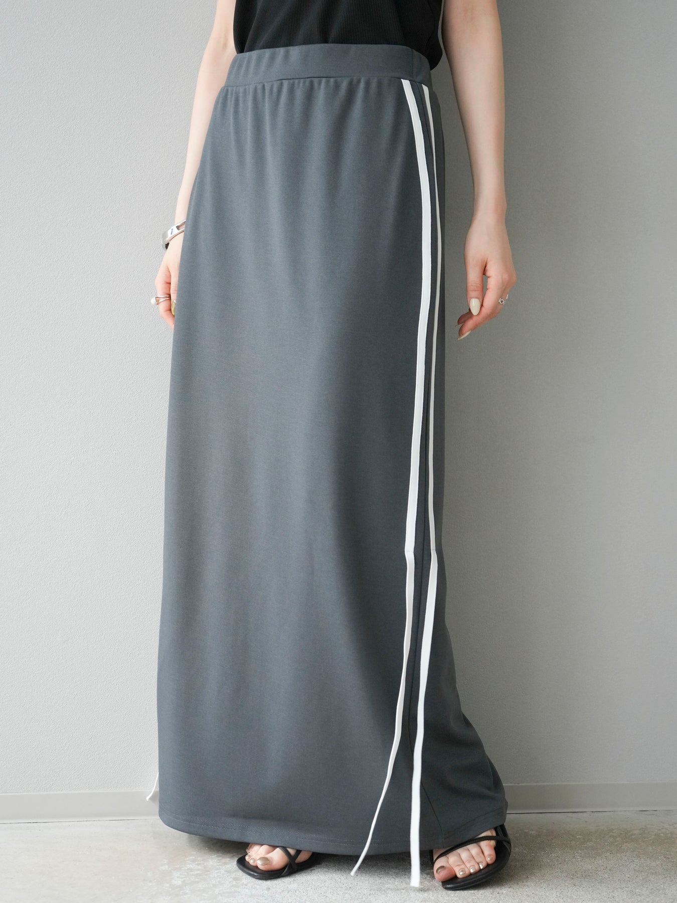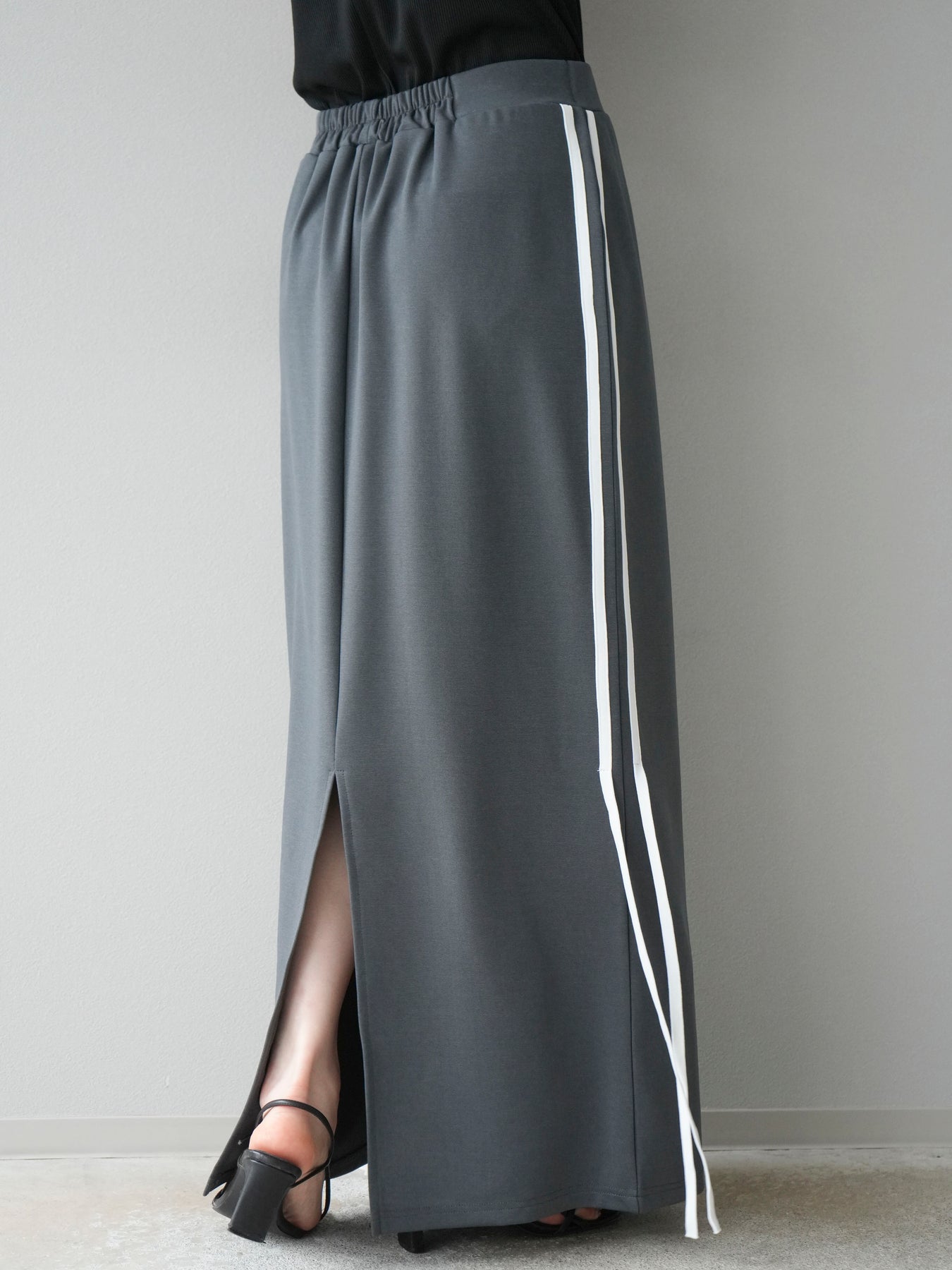 スポーティな要素をミックスした、モードな雰囲気のジャージナロースカート。 両サイドに施されたラインデザインが縦のラインを強調し、スタイルアップ効果も◎。 程よくフィットしつつも伸縮性のあるジャージ素材で、タイトながら快適な穿き心地を実現。 スリット入りで足さばきも良く、ヒールやスニーカーなど幅広いシューズと好相性です。 Tシャツやスウェットでカジュアルに、ブラウスやシャツでキレイめミックスもおすすめ。 トレンド感と実用性を兼ね備えた、1枚で決まる主役スカートです。