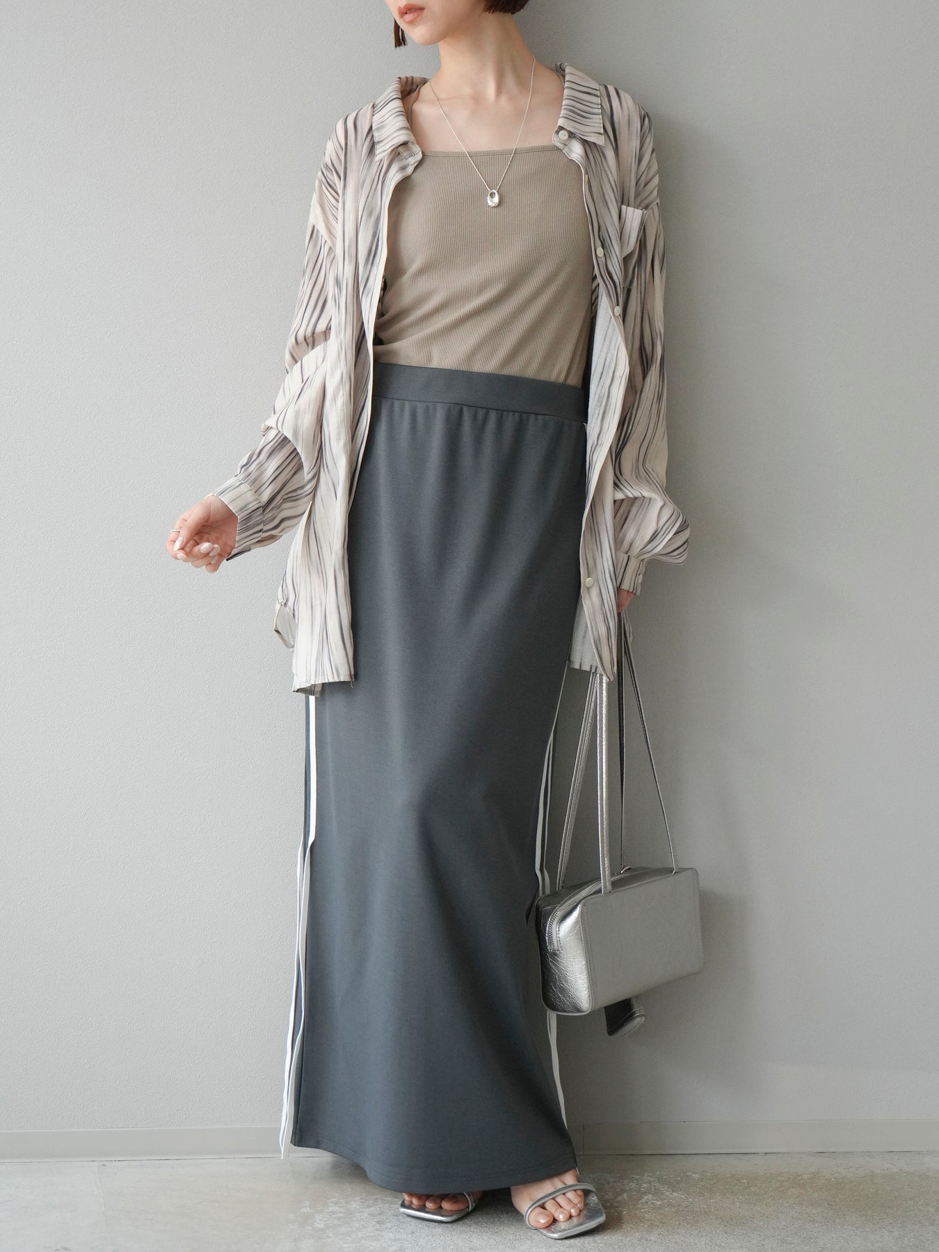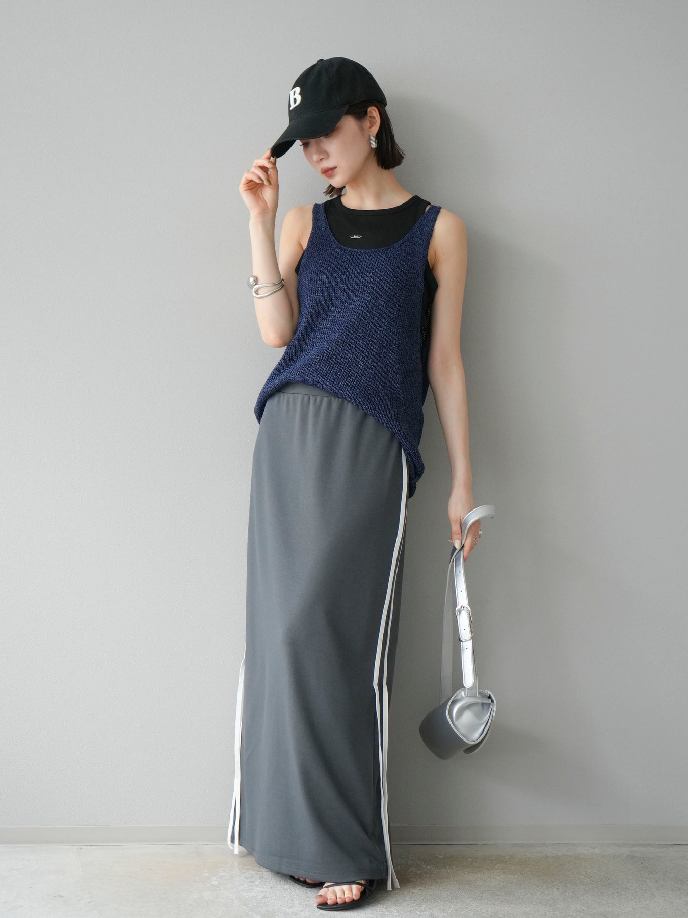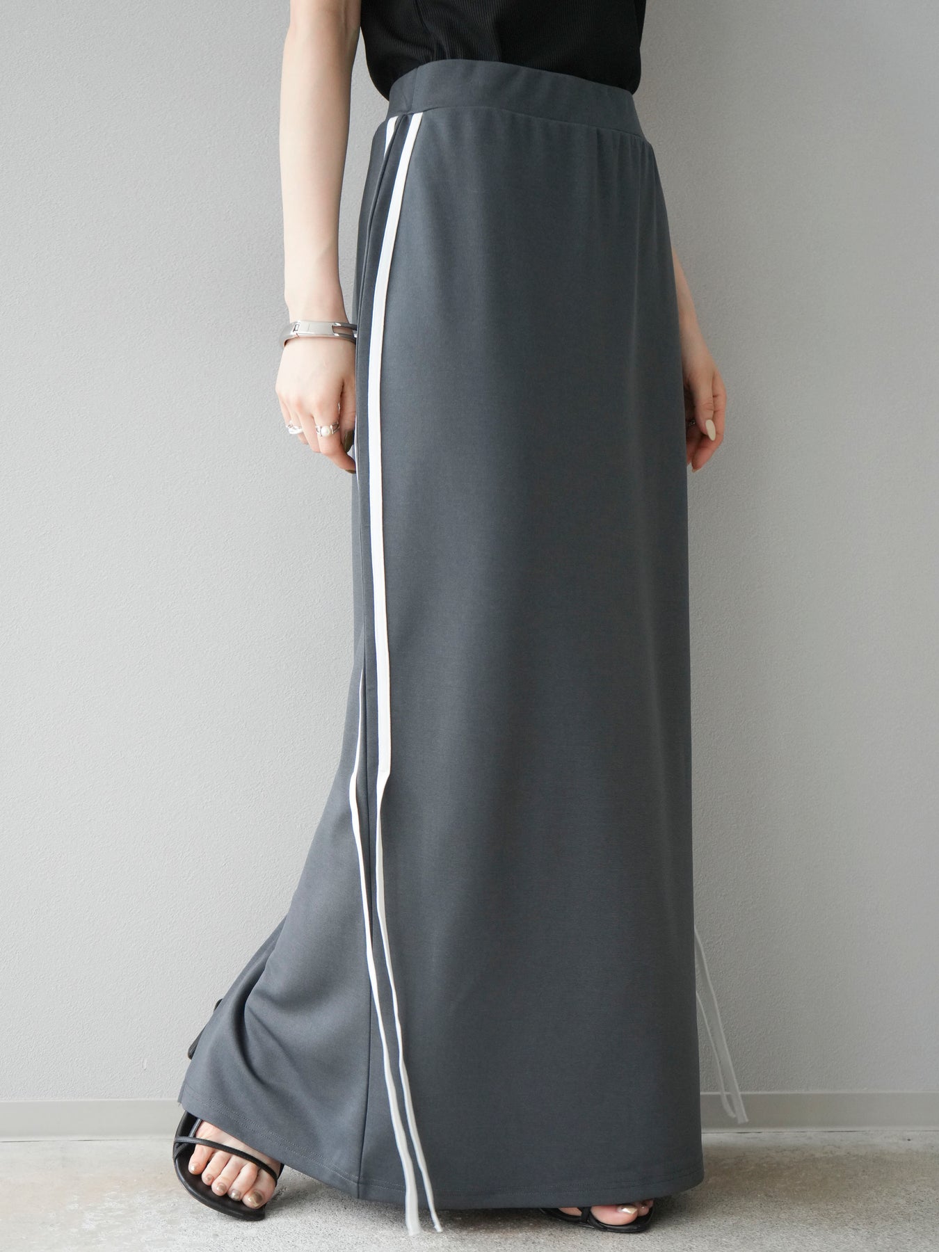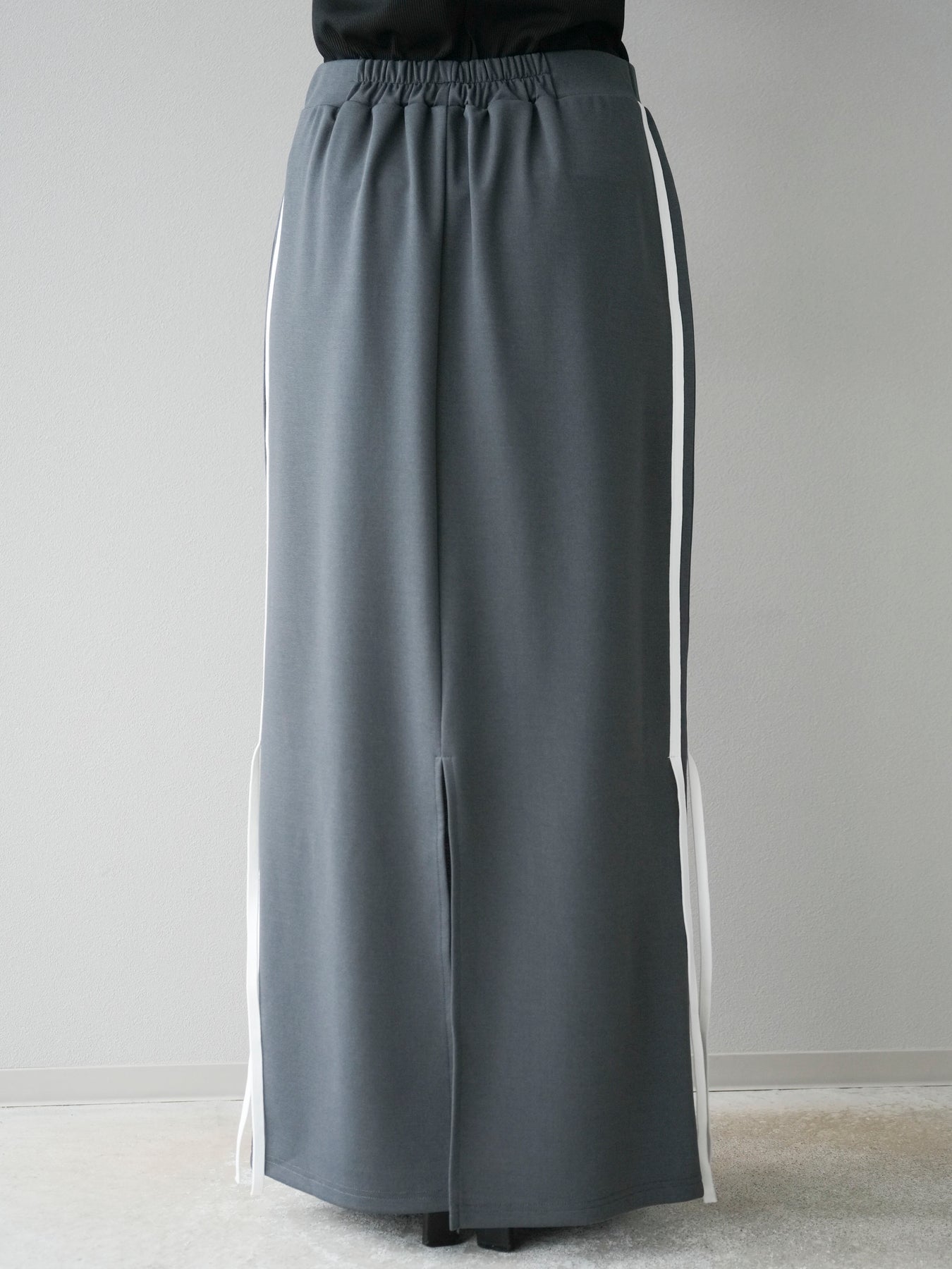 スポーティな要素をミックスした、モードな雰囲気のジャージナロースカート。 両サイドに施されたラインデザインが縦のラインを強調し、スタイルアップ効果も◎。 程よくフィットしつつも伸縮性のあるジャージ素材で、タイトながら快適な穿き心地を実現。 スリット入りで足さばきも良く、ヒールやスニーカーなど幅広いシューズと好相性です。 Tシャツやスウェットでカジュアルに、ブラウスやシャツでキレイめミックスもおすすめ。 トレンド感と実用性を兼ね備えた、1枚で決まる主役スカートです。