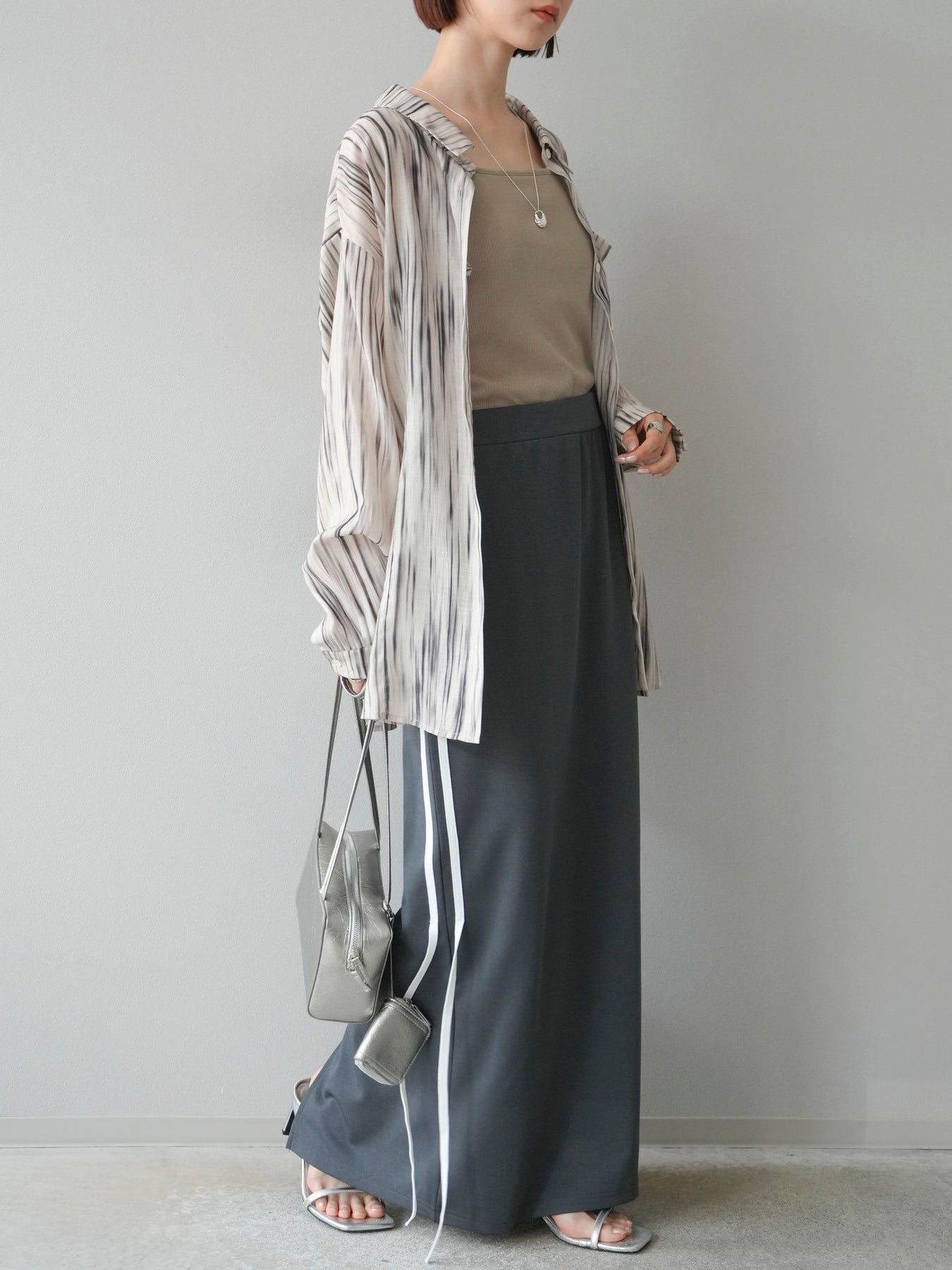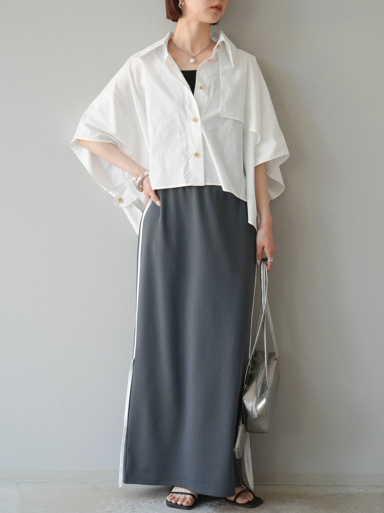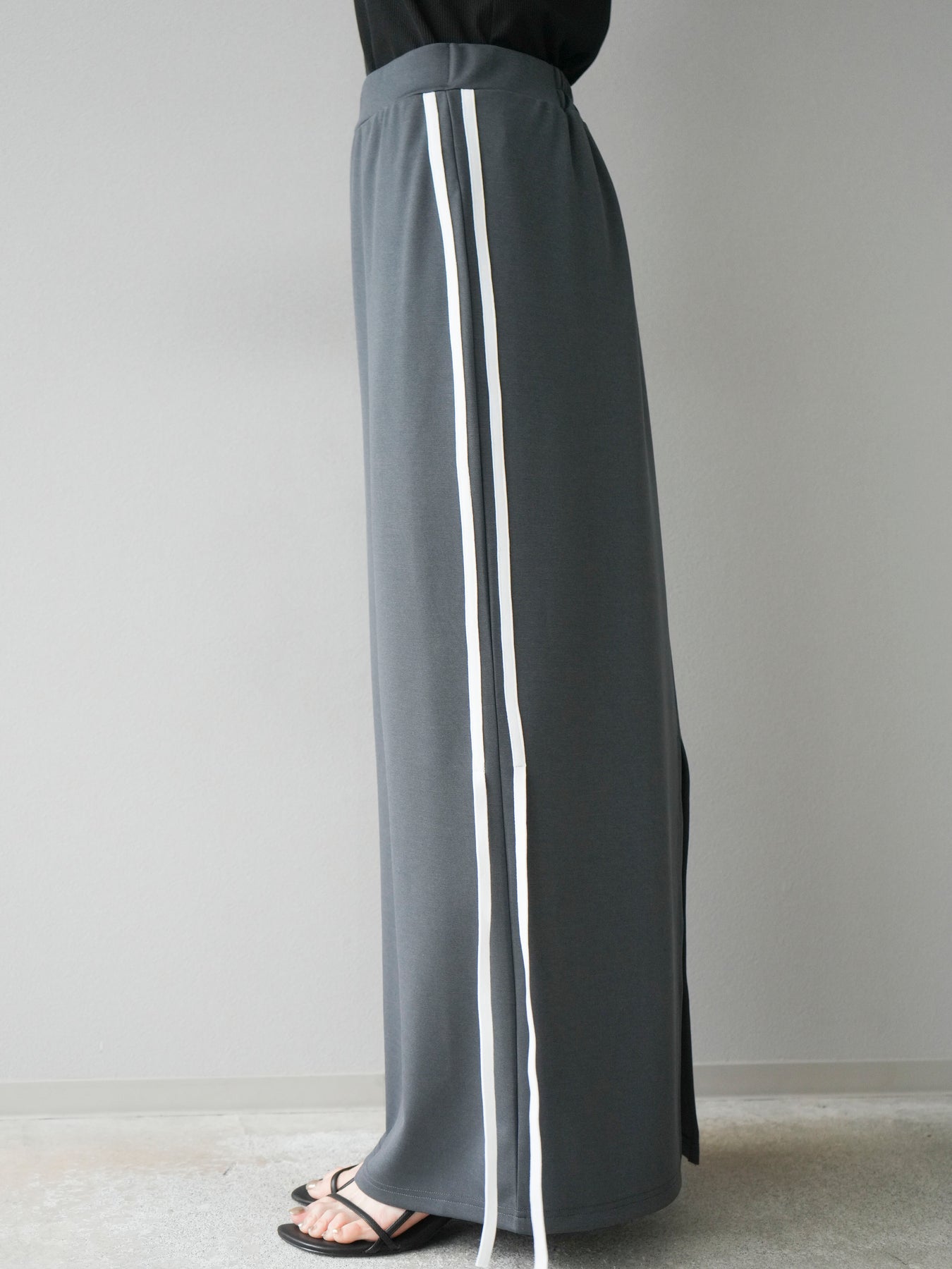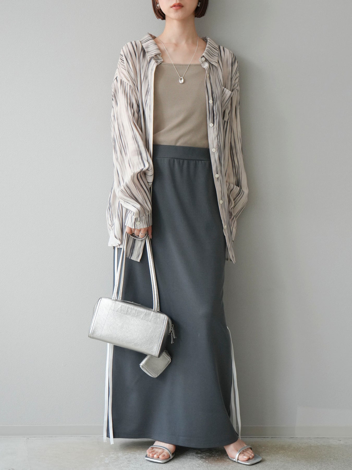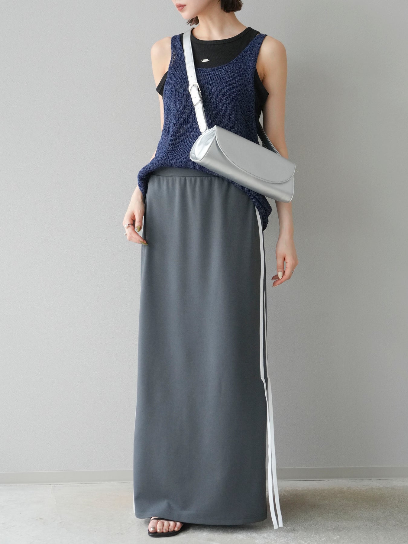スポーティな要素をミックスした、モードな雰囲気のジャージナロースカート。 両サイドに施されたラインデザインが縦のラインを強調し、スタイルアップ効果も◎。 程よくフィットしつつも伸縮性のあるジャージ素材で、タイトながら快適な穿き心地を実現。 スリット入りで足さばきも良く、ヒールやスニーカーなど幅広いシューズと好相性です。 Tシャツやスウェットでカジュアルに、ブラウスやシャツでキレイめミックスもおすすめ。 トレンド感と実用性を兼ね備えた、1枚で決まる主役スカートです。