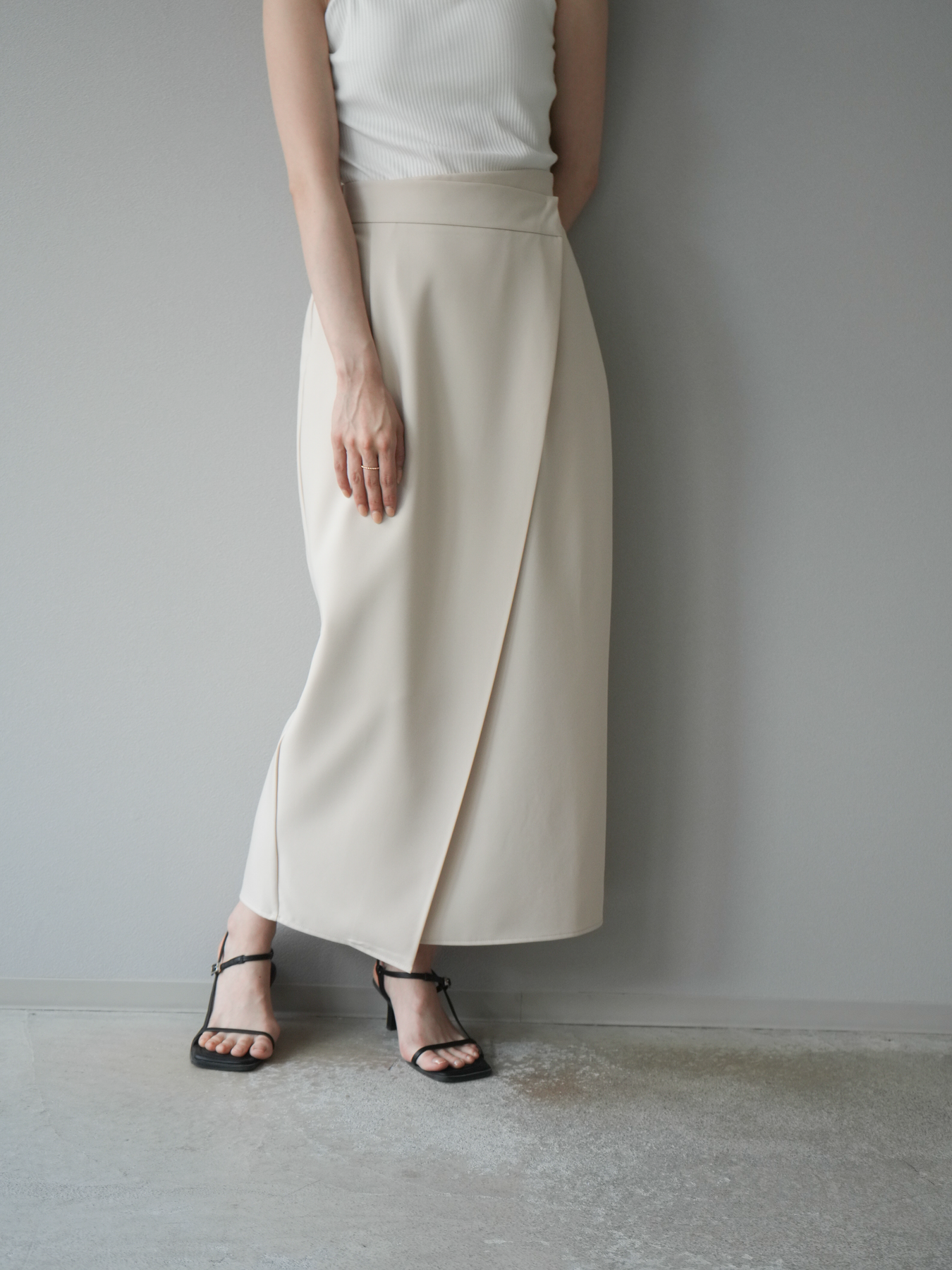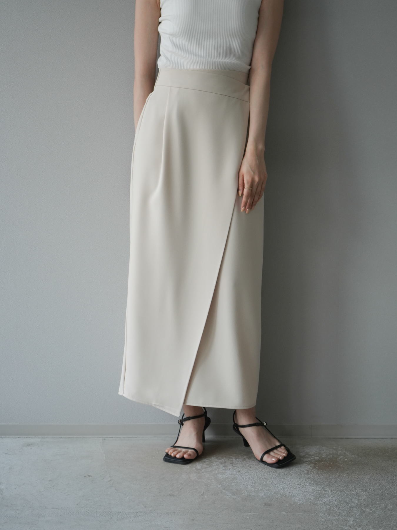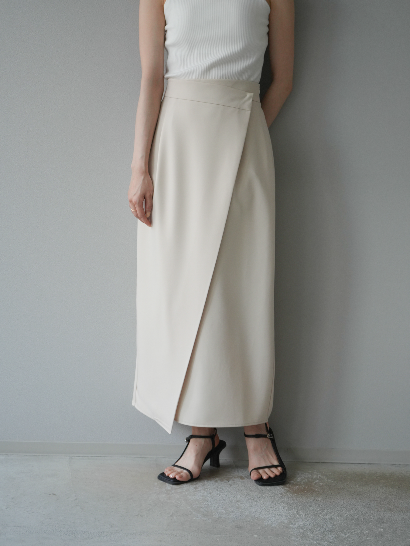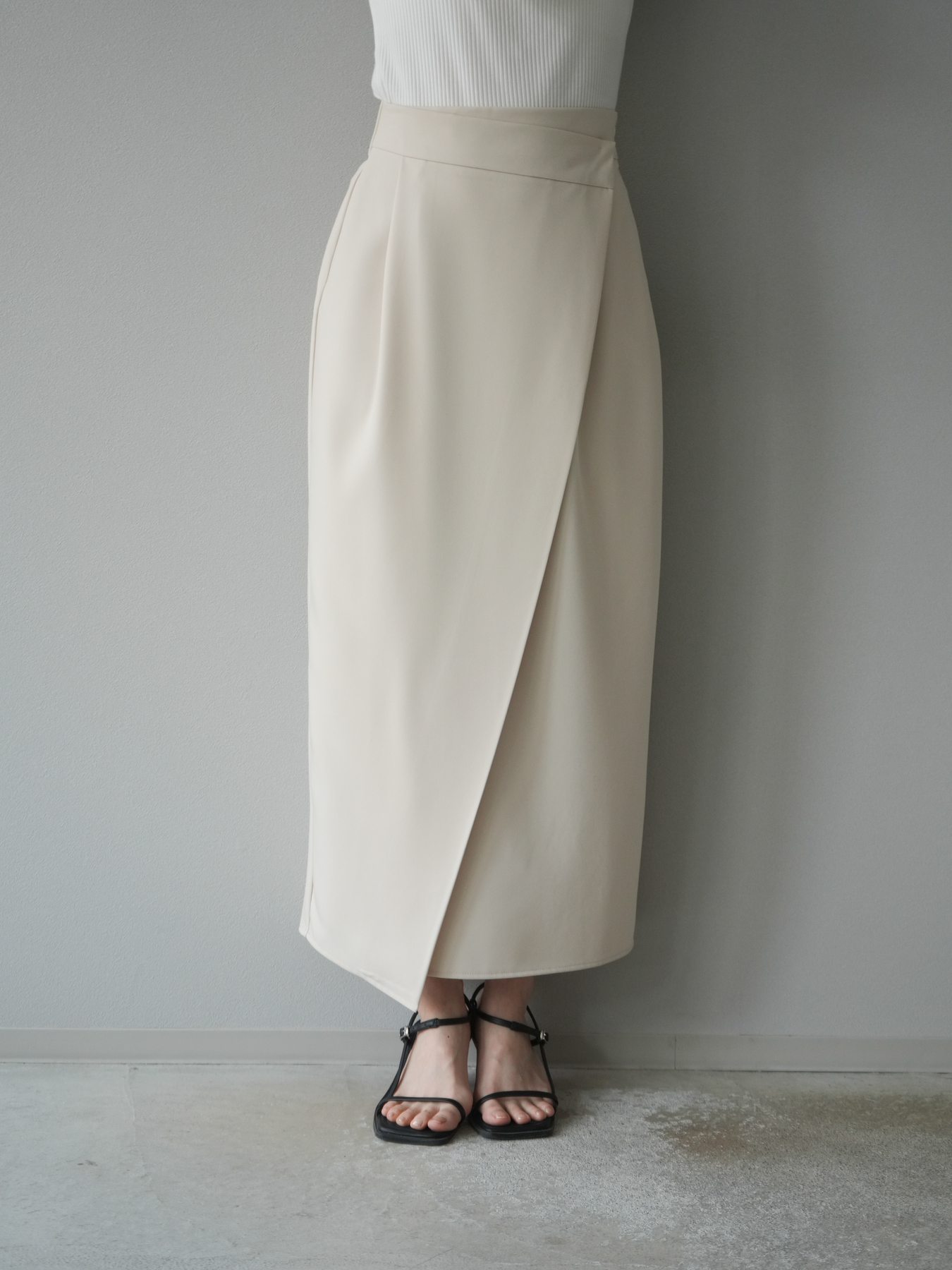 軽やかなツイル素材で仕立てたラップ風デザインが印象的なナロースカート。ほどよくストレッチを効かせた生地が、身体のラインにフィットしつつも動きやすさをキープ。フロントの重なりが縦のラインを強調し、すっきりとした印象を演出します。カジュアルなTシャツからきれいめトップスまで幅広く合わせられる一枚です。