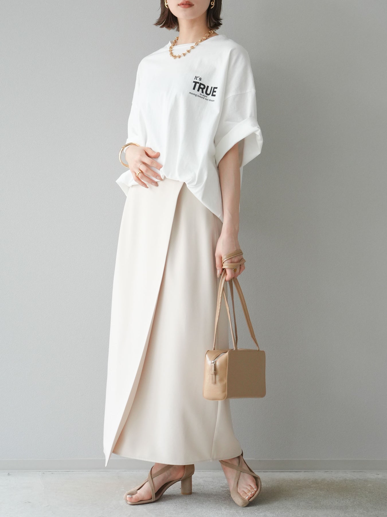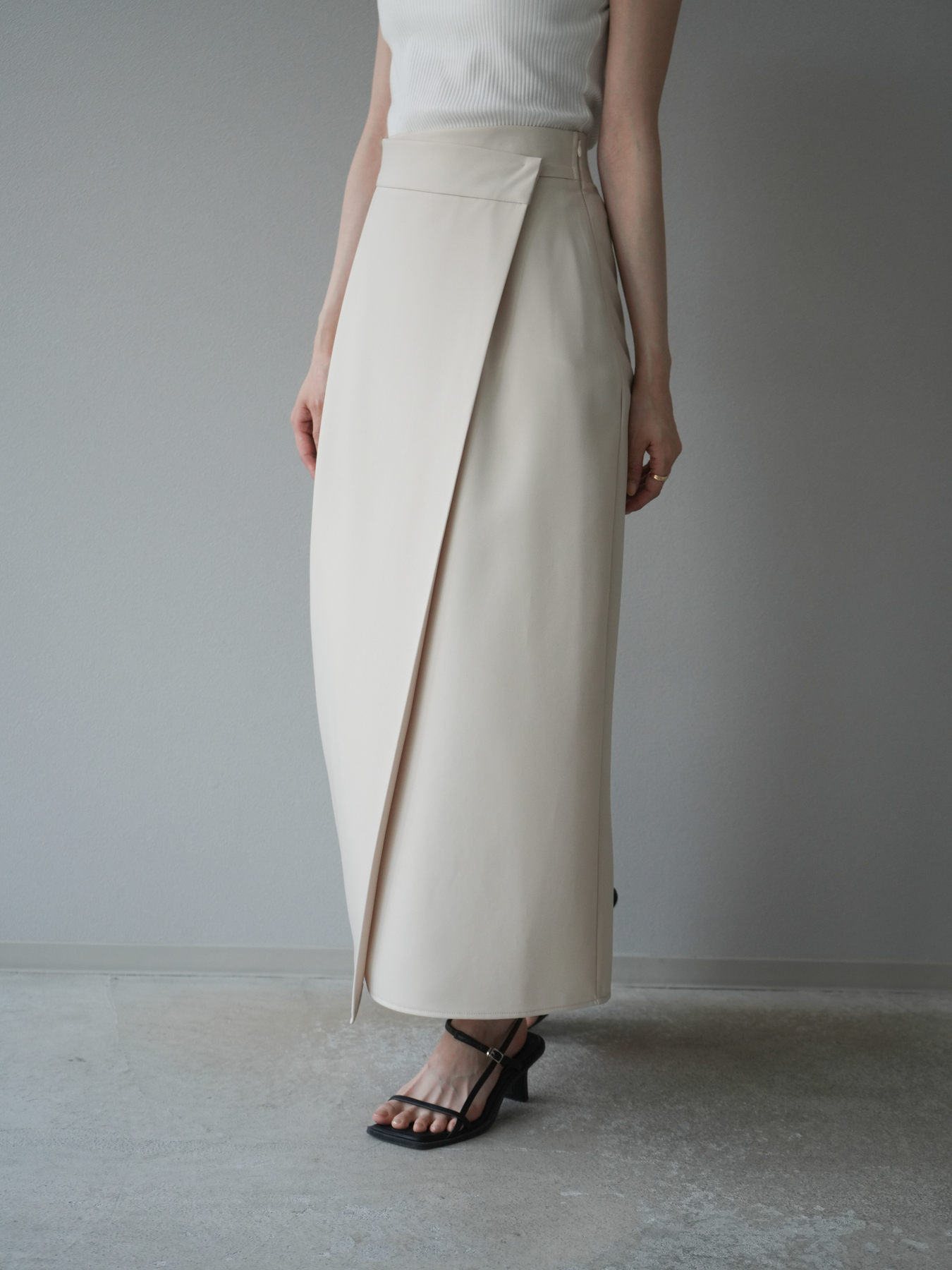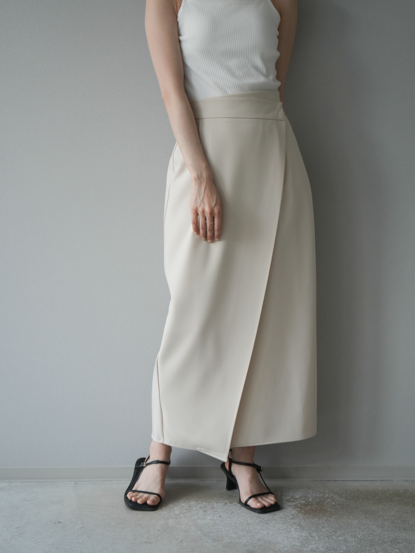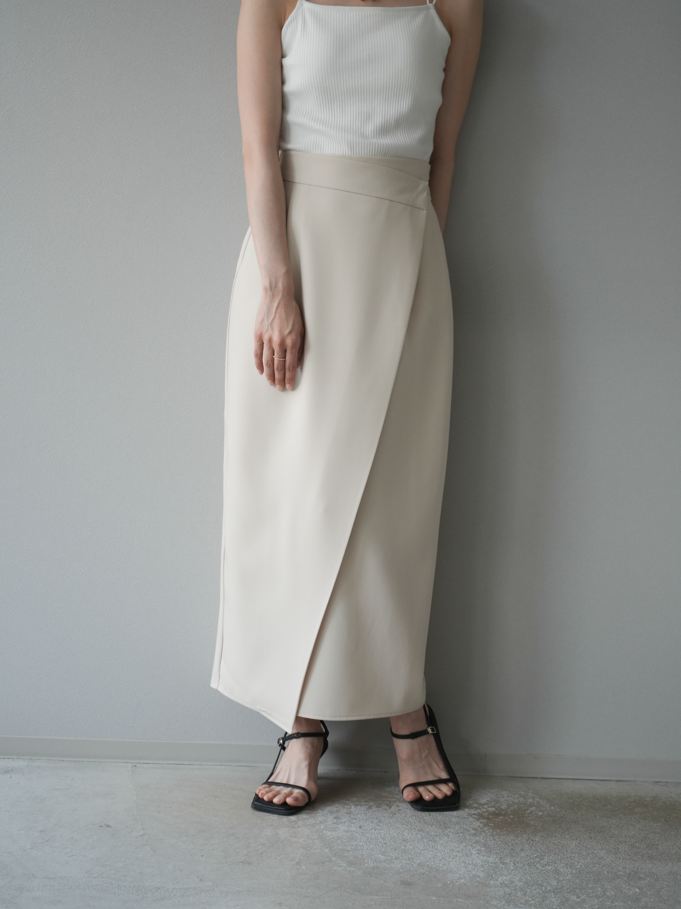 軽やかなツイル素材で仕立てたラップ風デザインが印象的なナロースカート。ほどよくストレッチを効かせた生地が、身体のラインにフィットしつつも動きやすさをキープ。フロントの重なりが縦のラインを強調し、すっきりとした印象を演出します。カジュアルなTシャツからきれいめトップスまで幅広く合わせられる一枚です。
