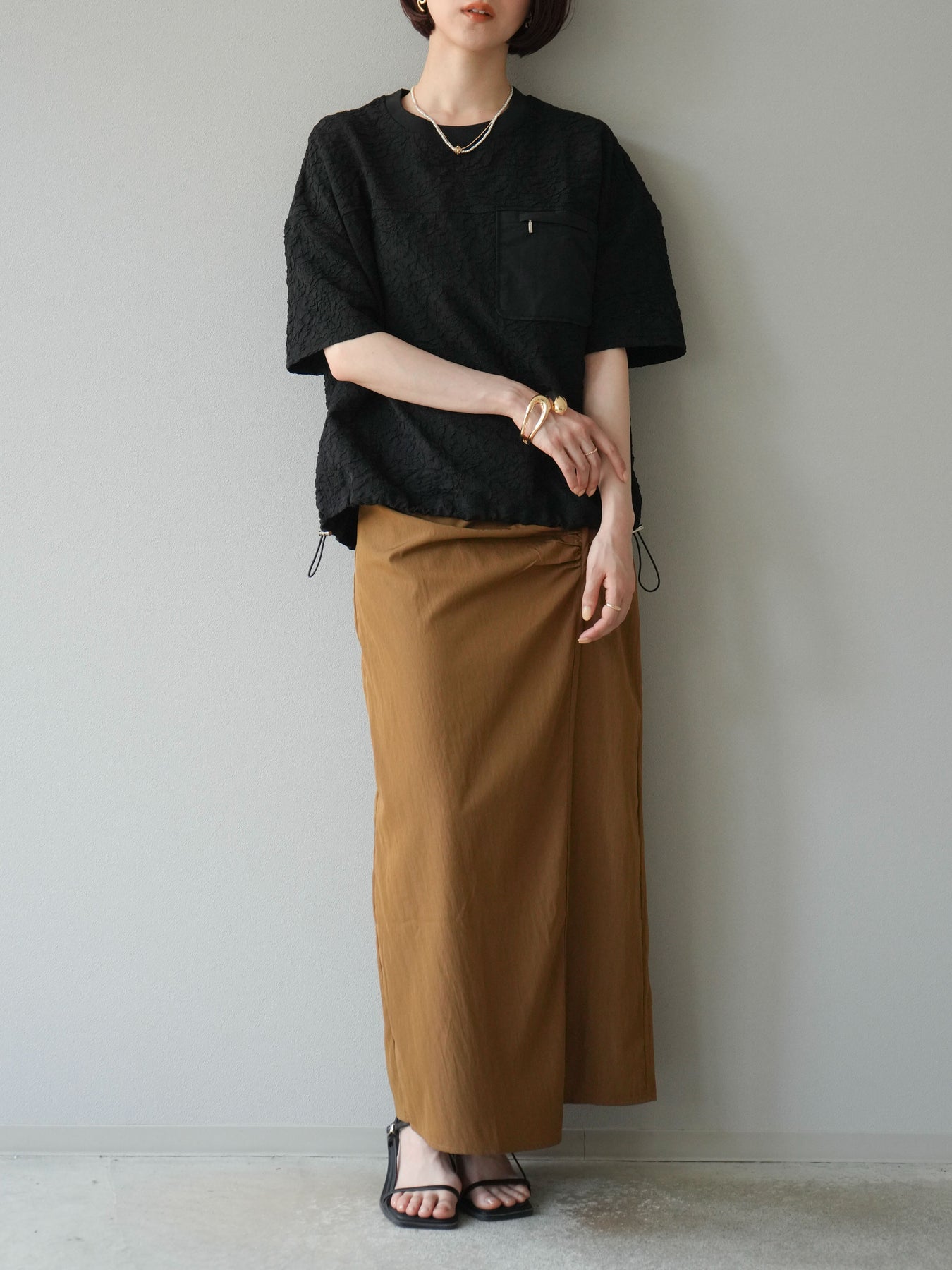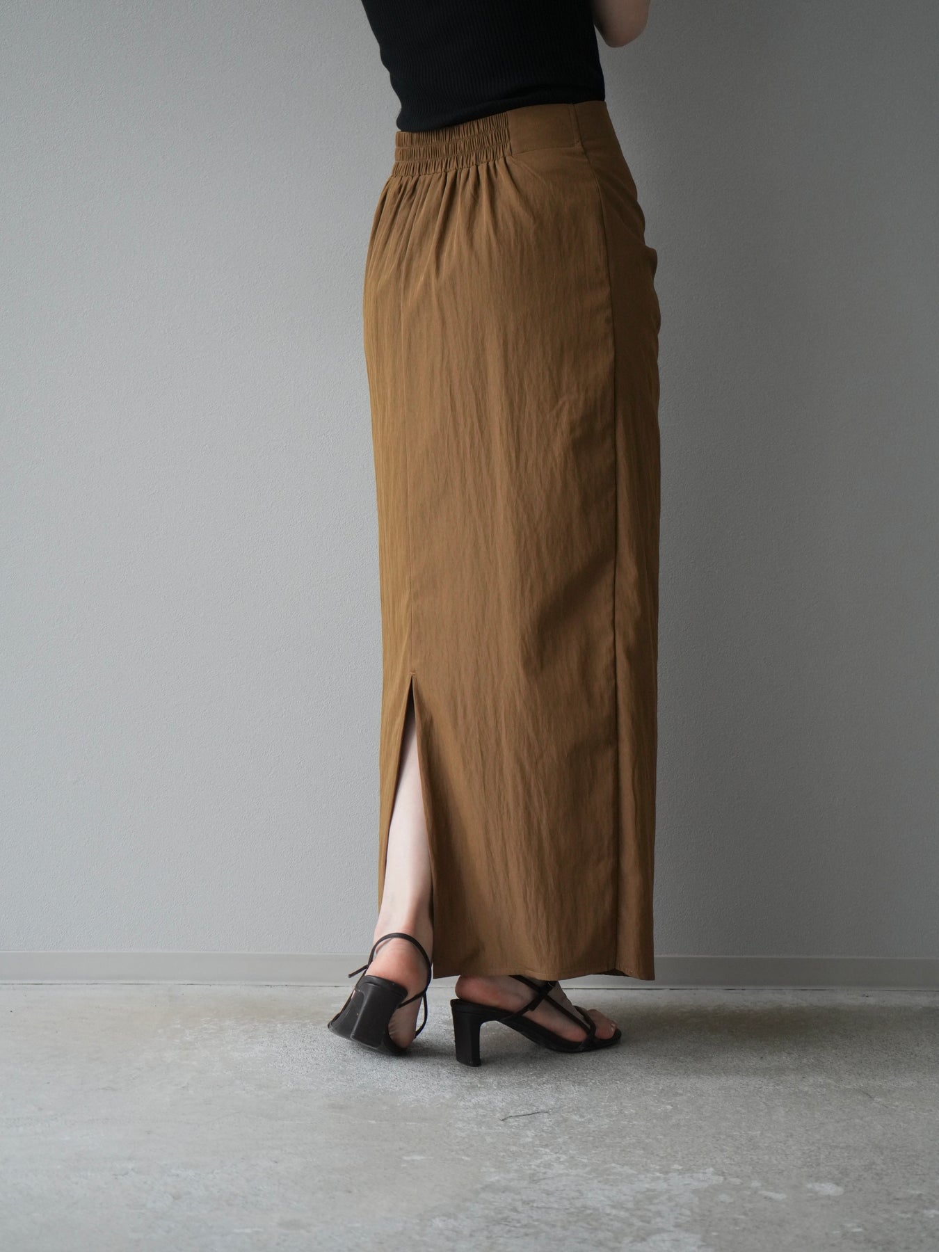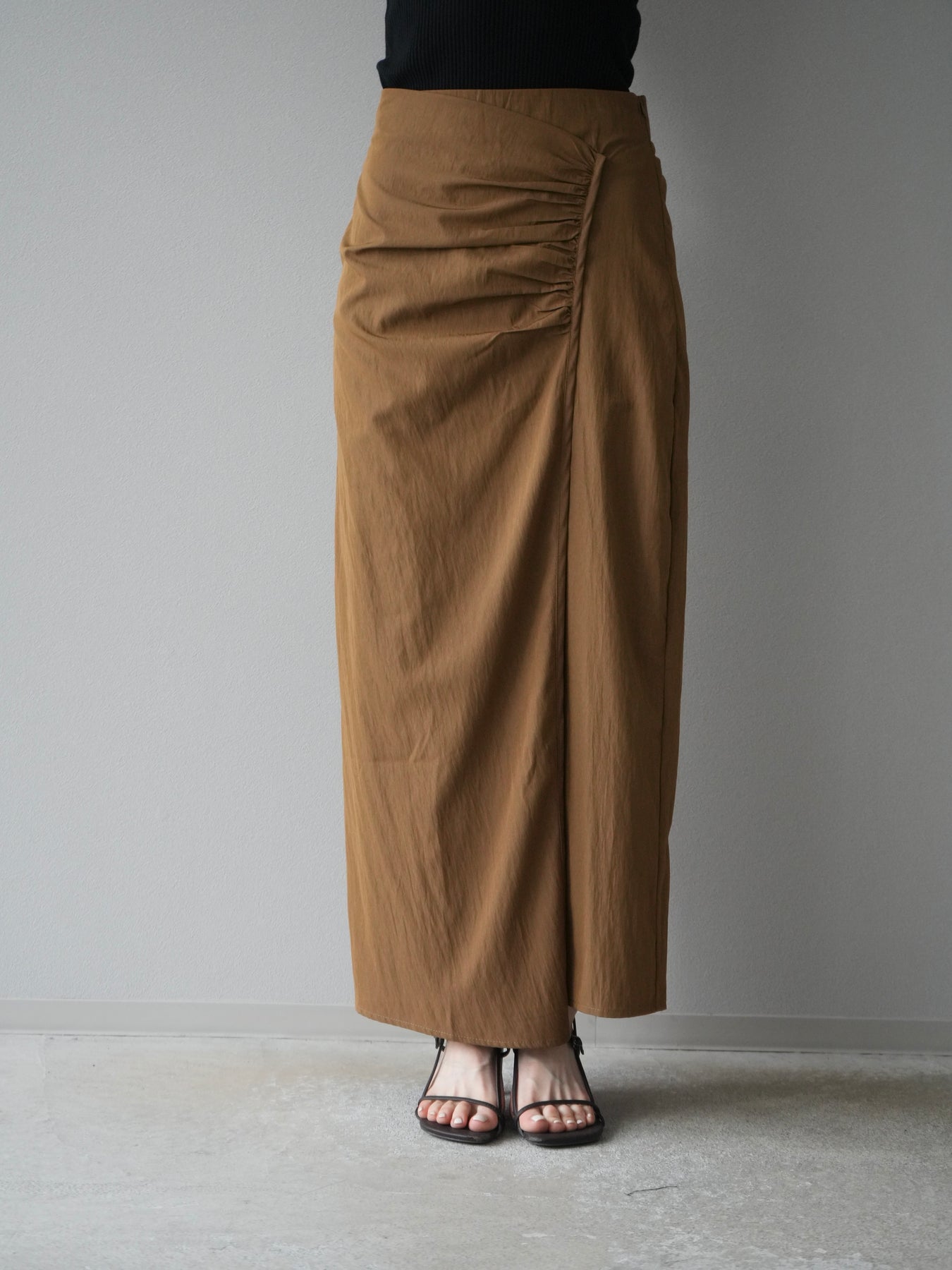 軽やかなナイロン素材にシャーリングディテールを施した、ラップ風デザインのスカート。程よい光沢感とドライな風合いが特徴で、こなれ感のあるトレンドライクな印象に。ラップ見えのシルエットが、縦のラインを強調してスタイルアップ効果も◎。カジュアルにもモードにも合わせやすく、デイリーに活躍する一枚です。 ※ボトムス、キャミソール(インナー)以外の商品は一律でインナーは付属していません