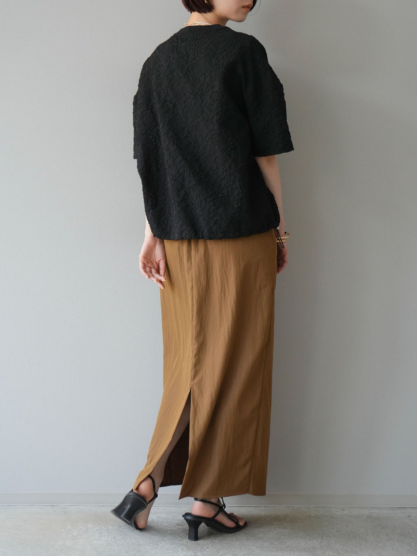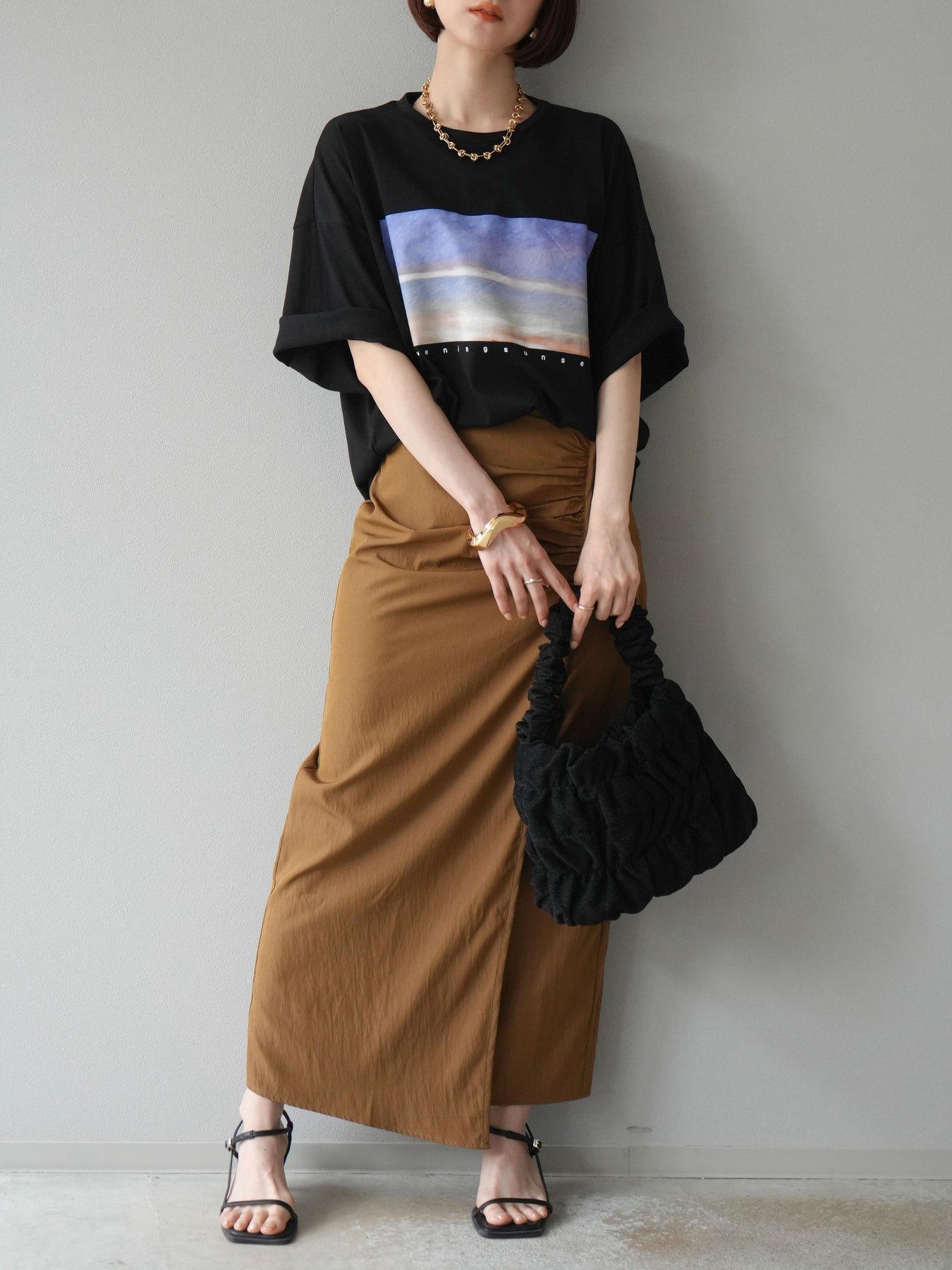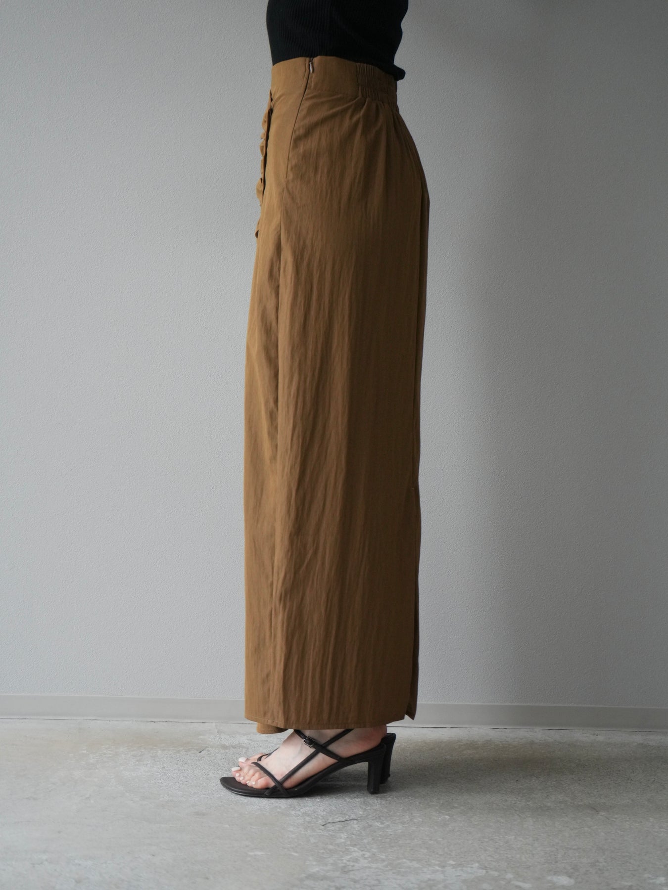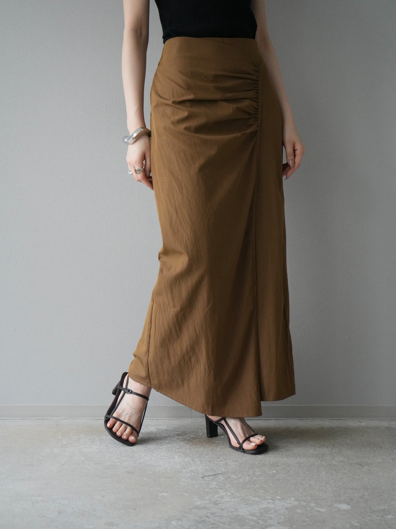 軽やかなナイロン素材にシャーリングディテールを施した、ラップ風デザインのスカート。程よい光沢感とドライな風合いが特徴で、こなれ感のあるトレンドライクな印象に。ラップ見えのシルエットが、縦のラインを強調してスタイルアップ効果も◎。カジュアルにもモードにも合わせやすく、デイリーに活躍する一枚です。 ※ボトムス、キャミソール(インナー)以外の商品は一律でインナーは付属していません