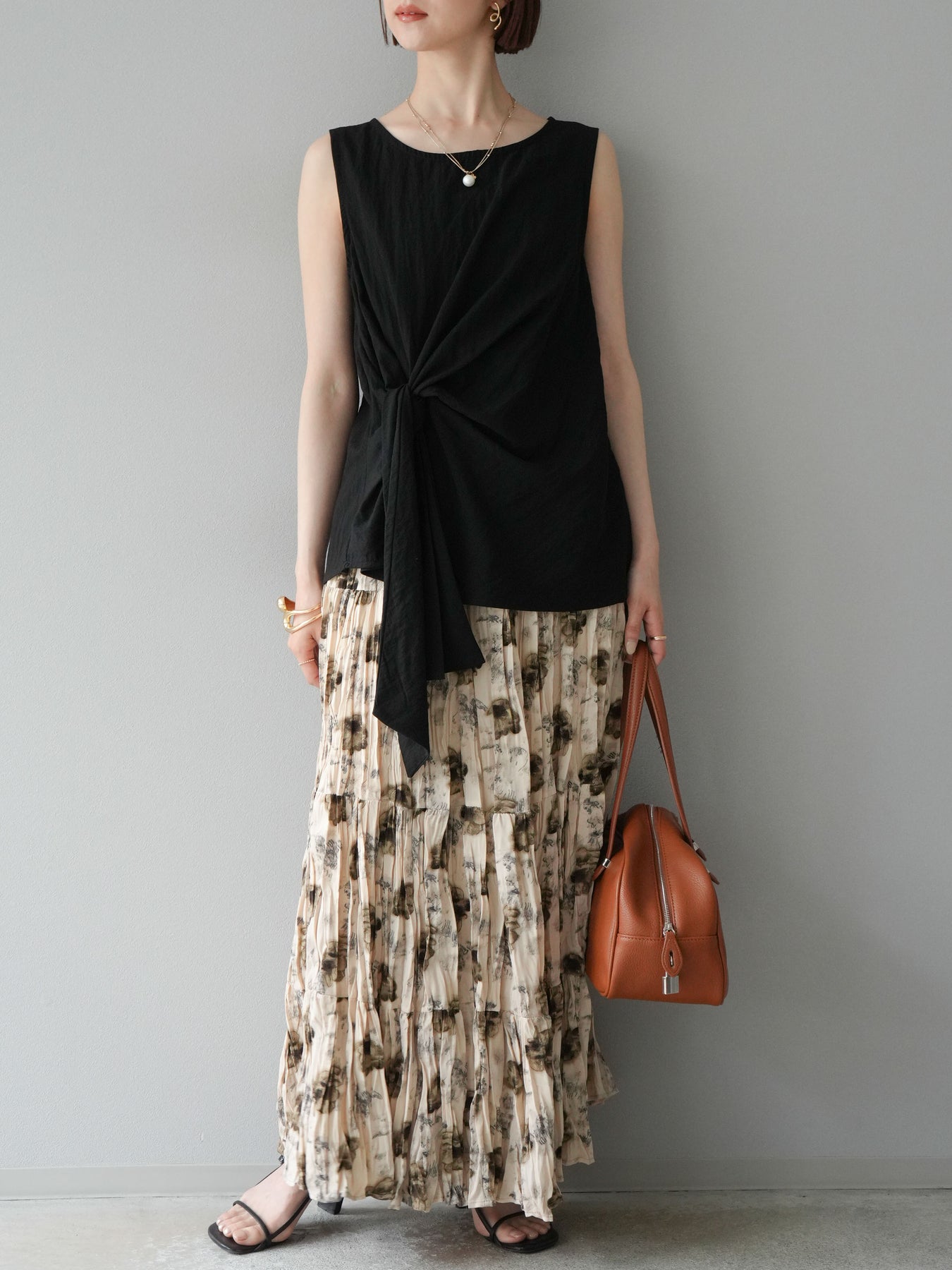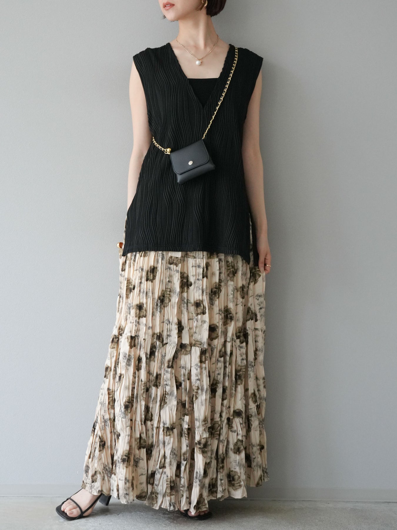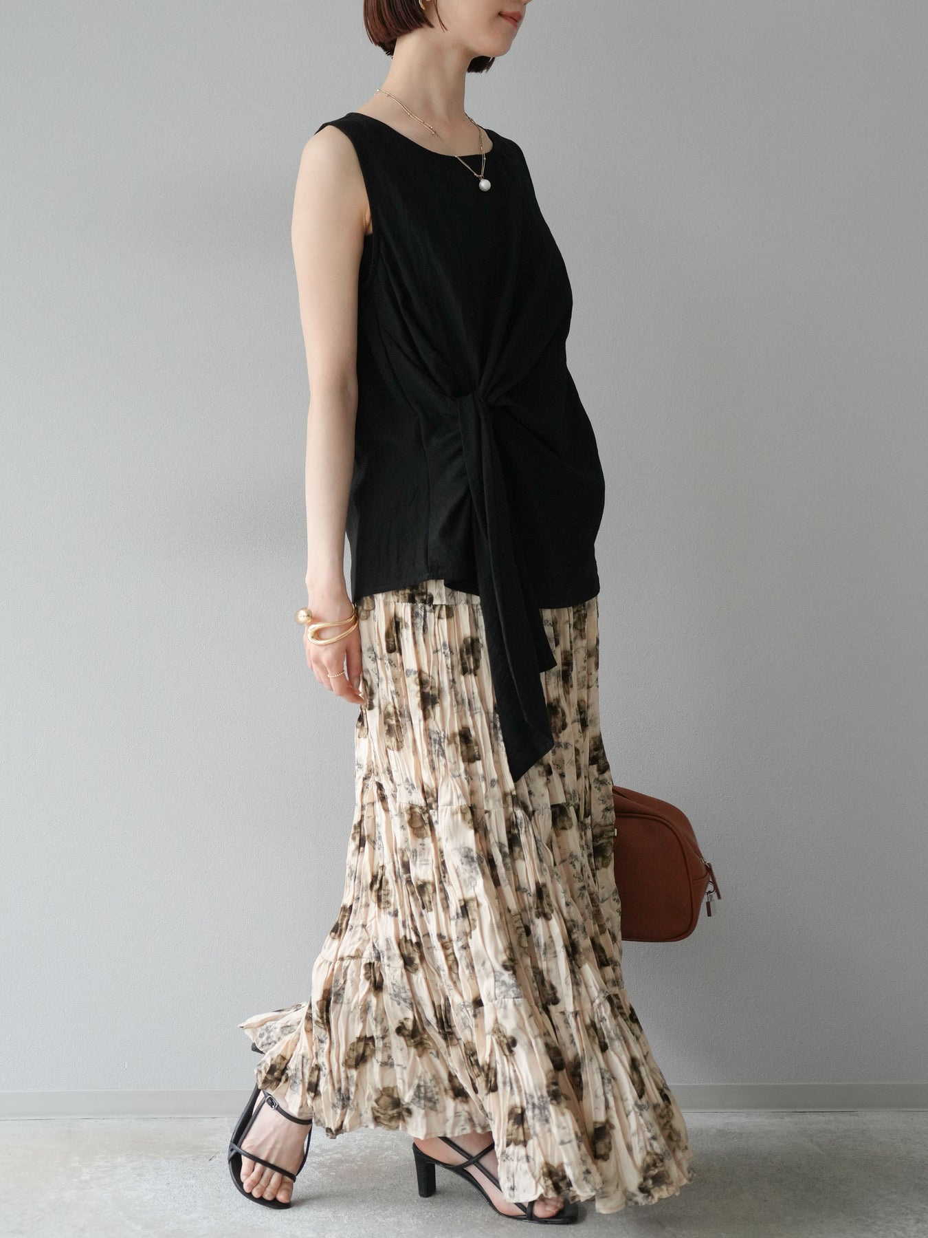 立体感のあるワッシャー加工が施された軽やかな素材に、華やかで印象的なフラワープリントをのせたロングスカート。動くたびにふんわり揺れるシルエットと繊細なプリーツが、女性らしさを引き立ててくれる1枚です。ウエストはゴム仕様でストレスフリーな穿き心地ながら、しっかりと腰位置で決まる設計になっており、トップスインも美しく決まります。Tシャツやタンクトップと合わせてカジュアルにも、ブラウスと合わせてフェミニンにも活躍する万能スカートです。 ※ボトムス、キャミソール(インナー)以外の商品は一律でインナーは付属していません。